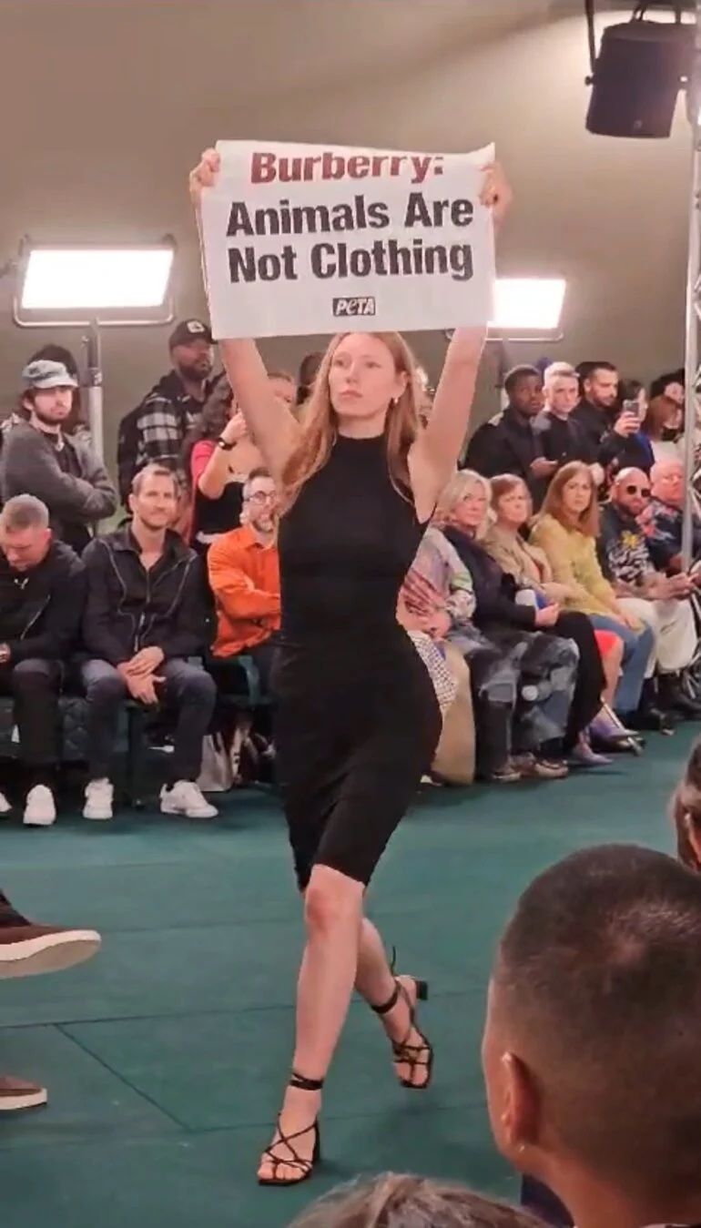 « Senza azioni coraggiose, l'estrema crudeltà verso gli animali, come il bastonamento dei coccodrilli per le borse e lo smembramento di mucche per le scarpe, verrebbe ignorata. Le interruzioni delle sfilate di moda di PETA hanno cercato di scuotere designer e consumatori dalla loro ignoranza riguardo alla crudeltà che stanno sostenendo, forse inconsapevolmente, in modo da aprire gli occhi e innescare discussioni, dibattiti e domande sullo status quo - e, naturalmente, ispirare compassione e cambiamento. Queste azioni provocatorie funzionano! In seguito alle campagne delle entità PETA, praticamente tutti i designer di fascia alta hanno denunciato pubblicamente la pelliccia. Altri materiali rubati agli animali come pelle e lana presto faranno la stessa fine.»