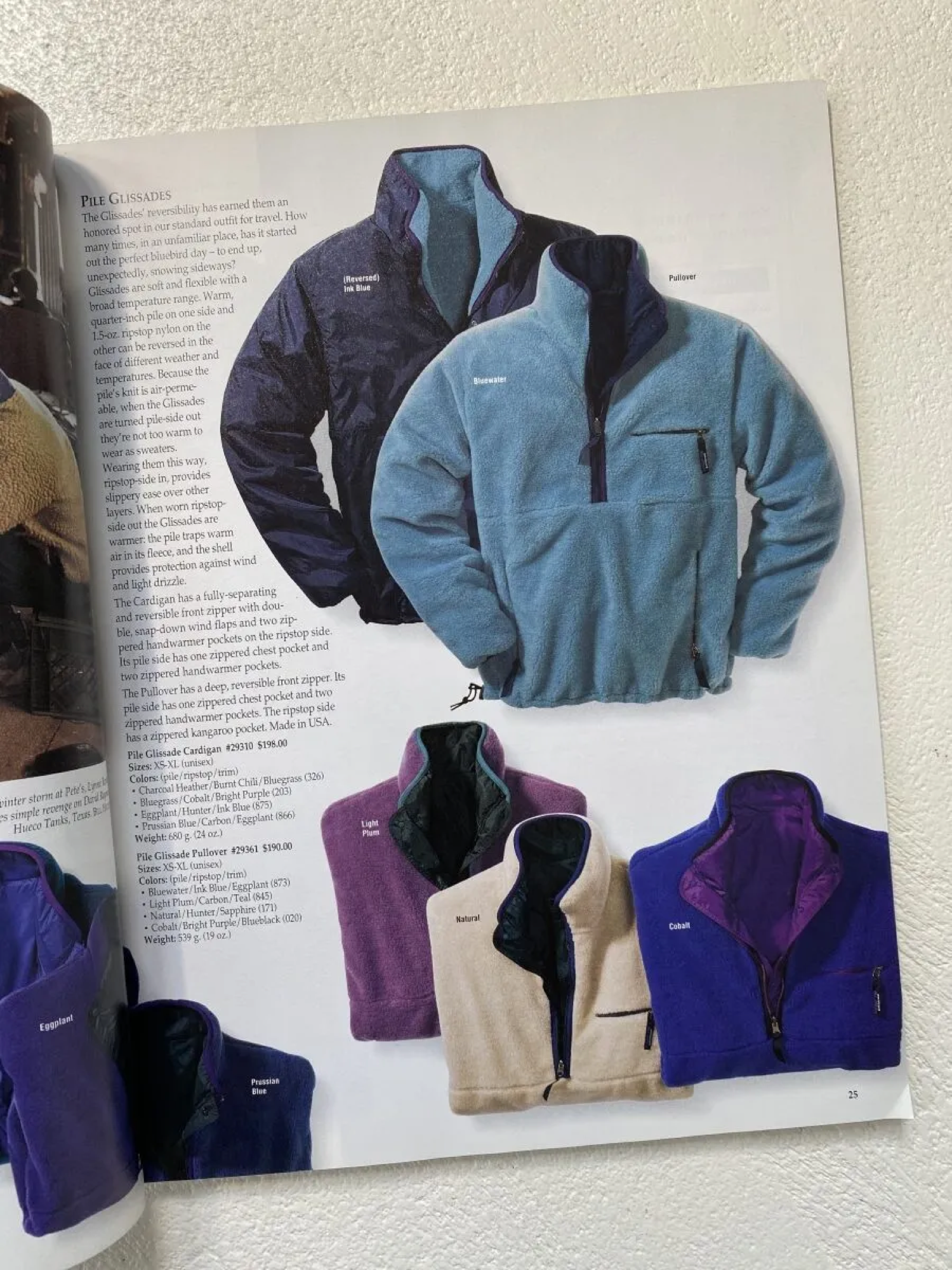 Fu così che ebbe inizio la ricerca di un degno sostituto: l'obiettivo era realizzare un capo dotato di un materiale in grado di mantenere ugualmente calore ma meno spesso. Nei primi sample realizzati da Patagonia, infatti, venne utilizzato un pile di qualità molto bassa: l'ispirazione proveniva da un materiale trovato casualmente tra le mura di un outlet di tessuti in Canada. Da lì, le ricerche per il tessuto perfetto continuarono e la scelta ricadde su un materiale fortuitamente trovato in un magazzino di Los Angeles, utilizzato per realizzare copri tavolette, umile ma con una texture interessante. Per dar vita al capo, Patagonia nei mesi successivi iniziò a collaborare con la Malden Mills, azienda tessile che molti, oggi, conosceranno con l'appellativo di Polartec. Nacque così il Patagonia Fleece, che in poco tempo si tramutò in un must-have per la protezione outdoor, perfetto per il layering con giacca e shell anti pioggia. Tuttavia, il capo veniva realizzato con fibre sintetiche provenienti da combustibili fossili, una scelta di produzione che andava totalmente contro l’heritage del brand. Fu così che iniziò una nuova ricerca, questa volta per un materiale che fosse sì funzionale ma soprattutto ecologico. Nel 1993 Patagonia divenne il primo brand a utilizzare plastica riciclata per realizzare fibre sintetiche, spesso presenti nei tessuti nonostante la limitata tecnologia dell’epoca. I primi fleece completamente riciclati erano difatti verdi, risultato del recupero di bottiglie di plastica di quel colore per la creazione del tessuto.