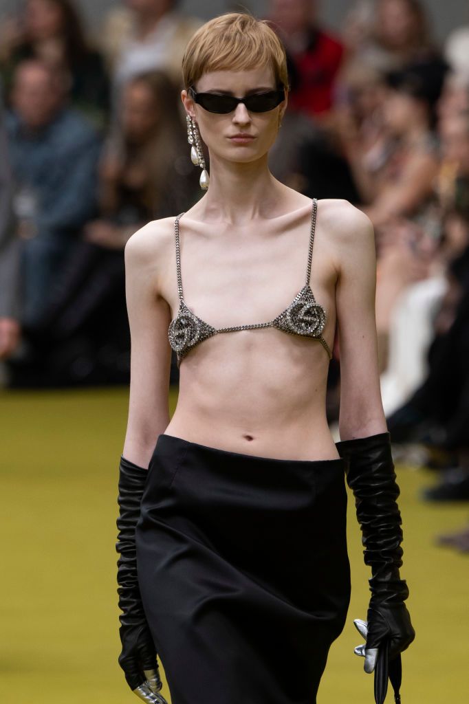 Questo 2023 la direzione creativa di Gucci non è solo stata passata da Alessandro Michele a Sabato de Sarno, ma anche al team di sarti e designer interni allo studio, in occasione dello show FW23. La sfilata ha reso omaggio ai look più eccezionali dell’archivio Gucci, da una riedizione della Horsebit alle nuove interpretazioni del logo, ma il capo che ha lasciato davvero il segno è stato il G Chain Bra, un reggiseno interamente fatto di cristalli indossato da Vittoria Ceretti nella campagna dedicata. Così come ha fatto girare la testa degli invitati alla sfilata, nei mesi a seguire ha continuato a stupire il pubblico grazie alle it girl che hanno deciso di osare con il proprio look, al prezzo di $18mila.