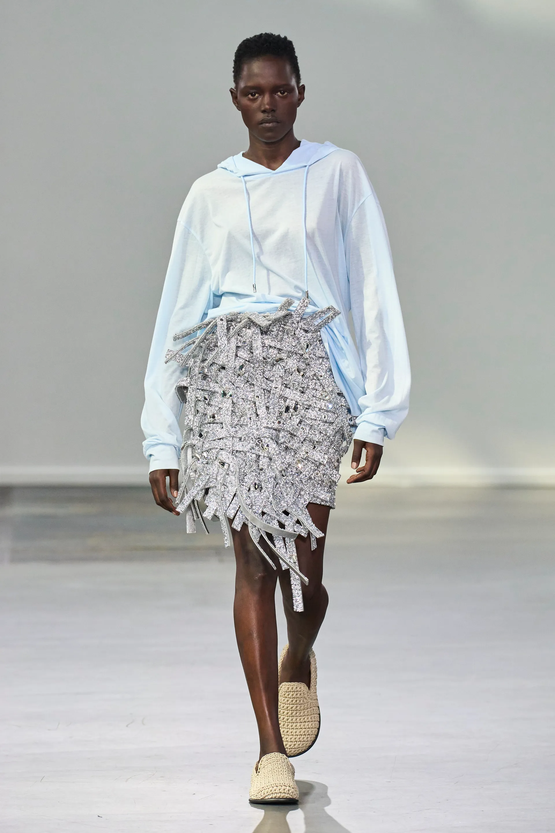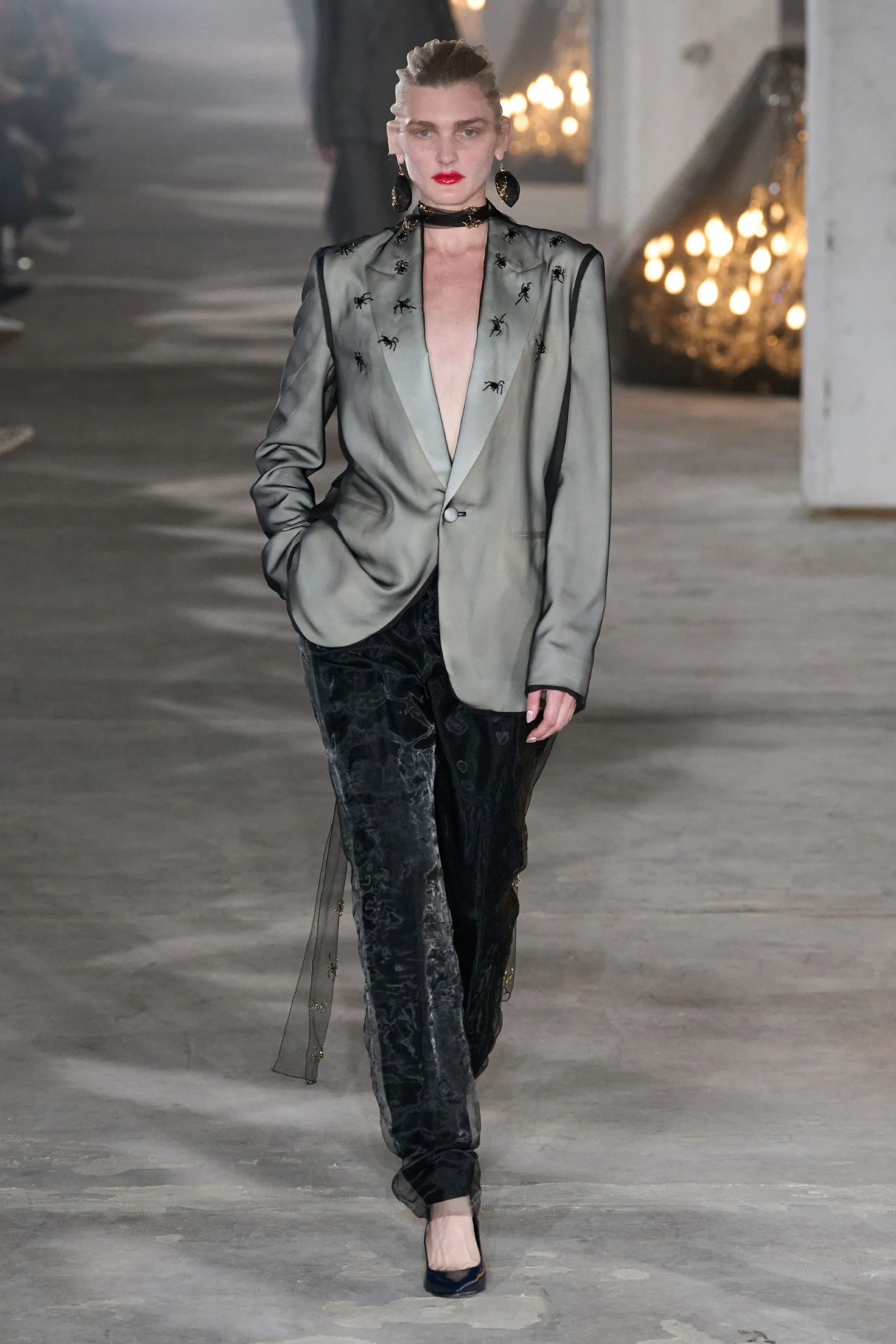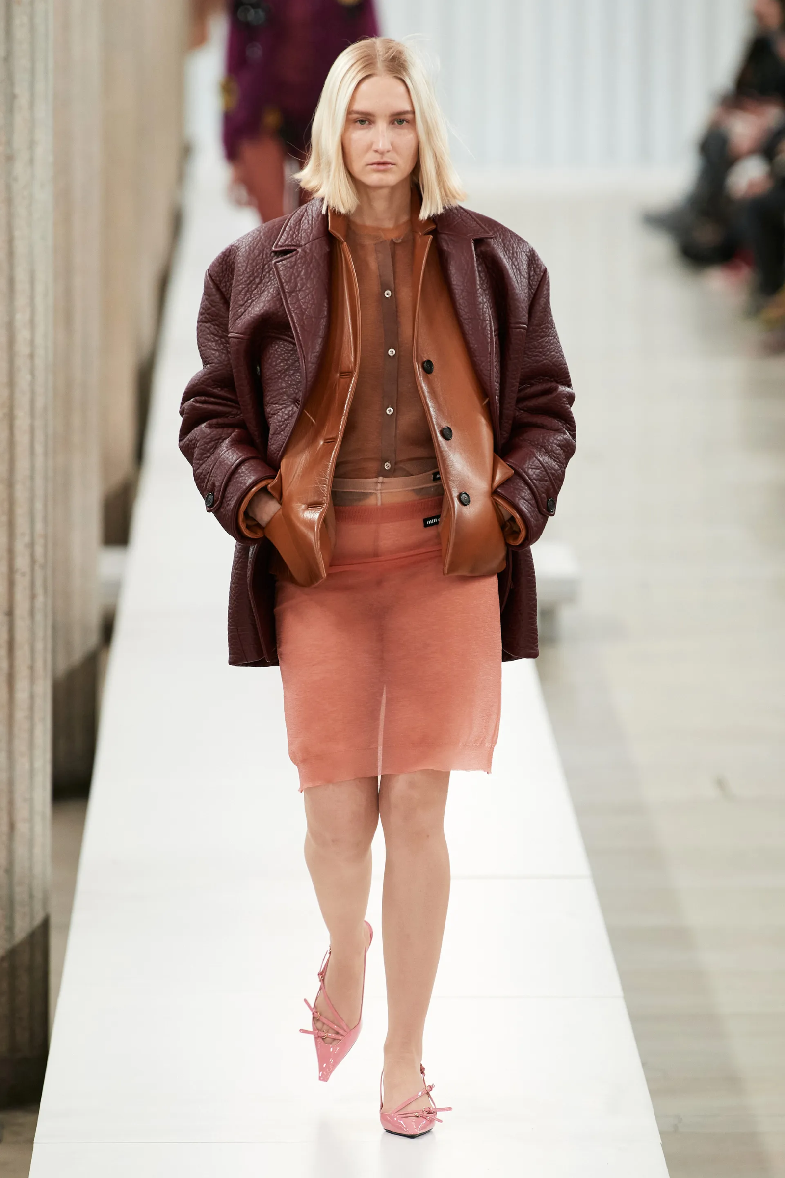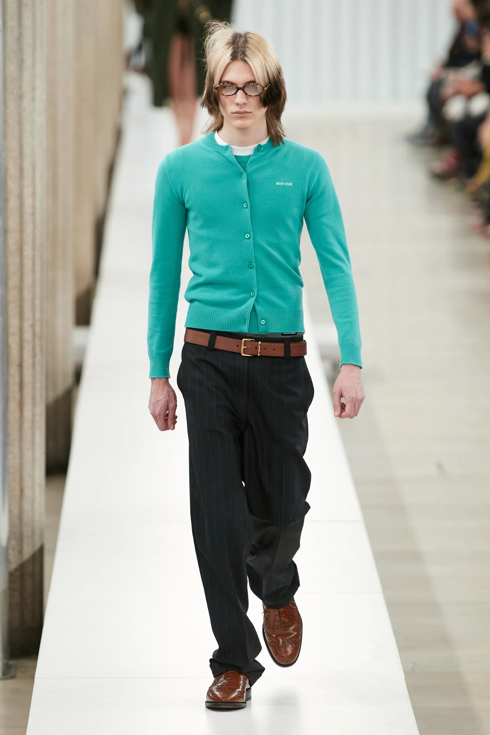 Se il pubblico pensava che Miu Miu avesse avuto il suo nuovo momento di gloria con l’ormai leggendario set tagliato a orlo vivo, nessuno era pronto per questo show. Di base, questa è stata la sfilata che ha portato l’officecore nella conversazione, che ha esemplificato nella maniera più pura quell’apprezzamento per le stereotipate uniformi d’ufficio trasformate in oggetti di trasgressione: twin set indossati senza pantaloni, strati di abiti dal sapore retrò del tutto trasparenti, quella felpa che vive rent free nella testa di così tanti clienti (o aspiranti tali) del brand, la collaborazione con Church’s, gli occhiali da nerd. Non ultimo, il ritorno di Mia Goth sulle passerelle dopo un anno di grazia che l’aveva trasformata nella nuova icona dell’horror indie. No crumbs left.