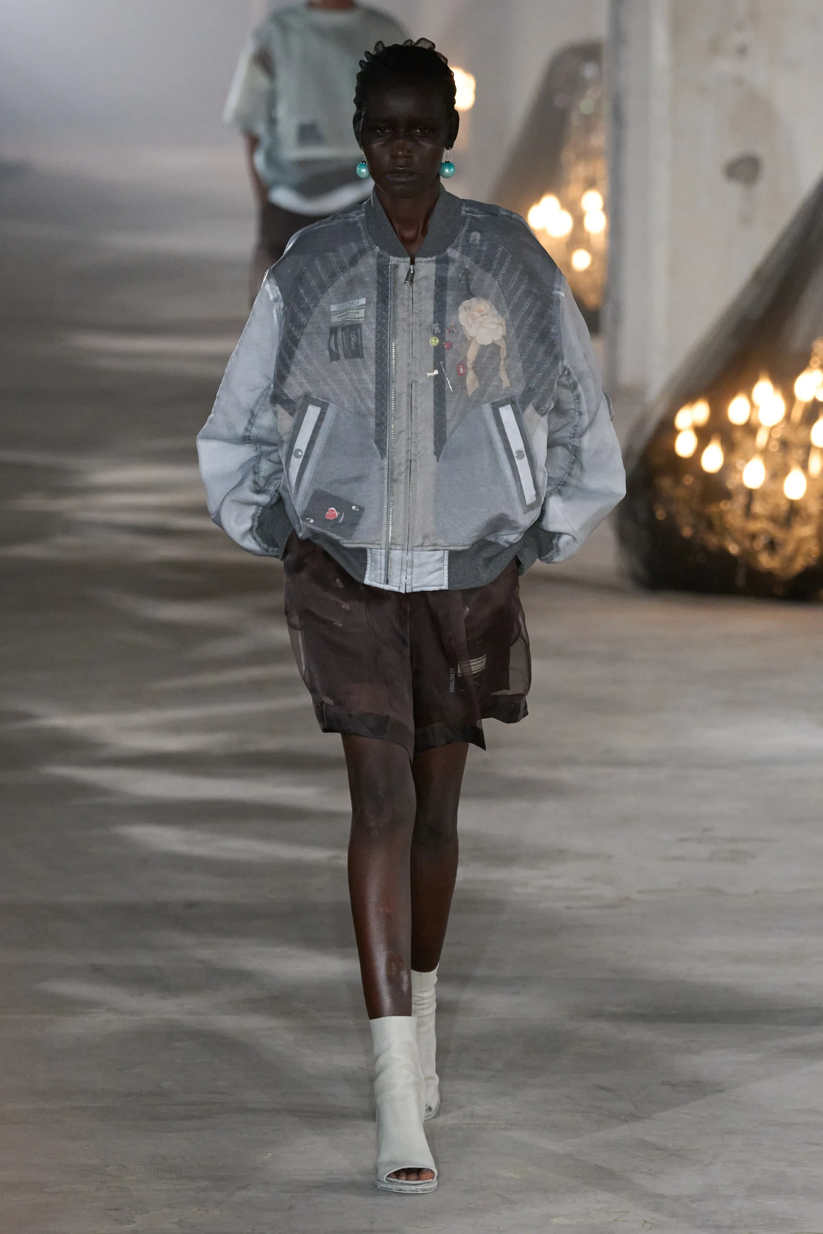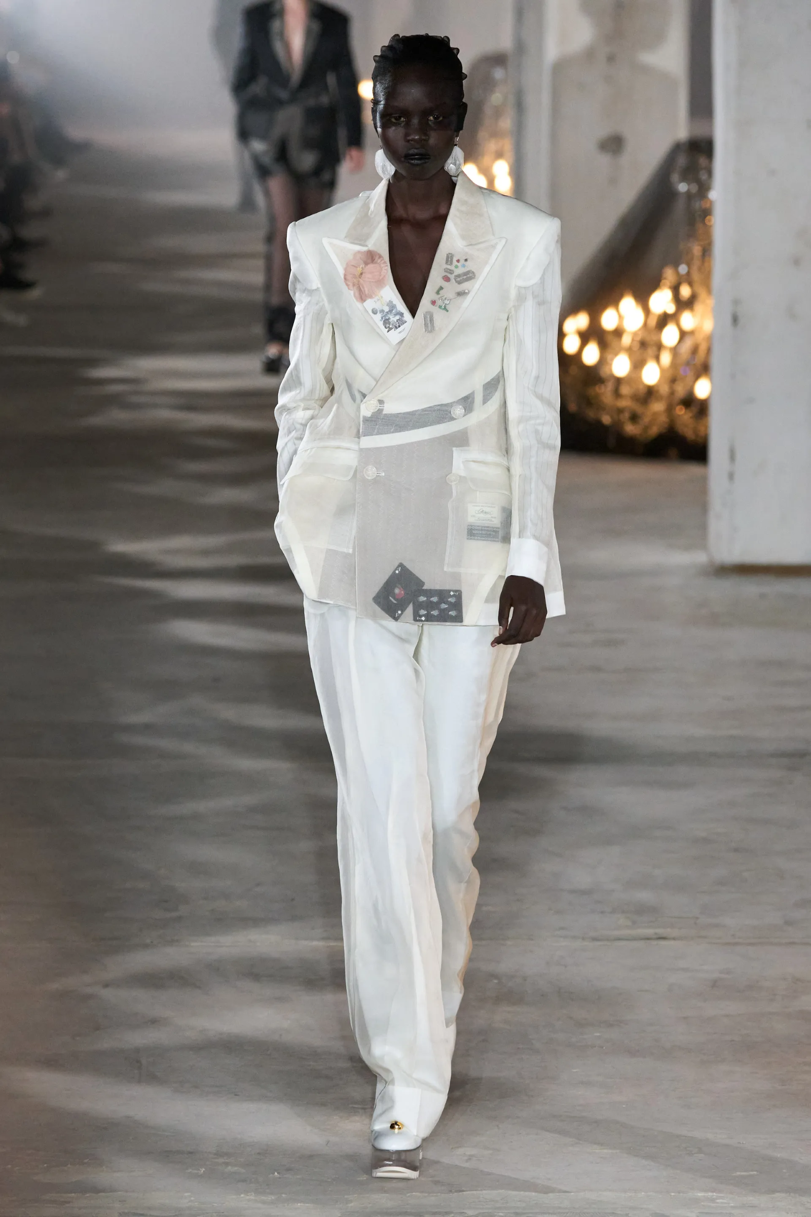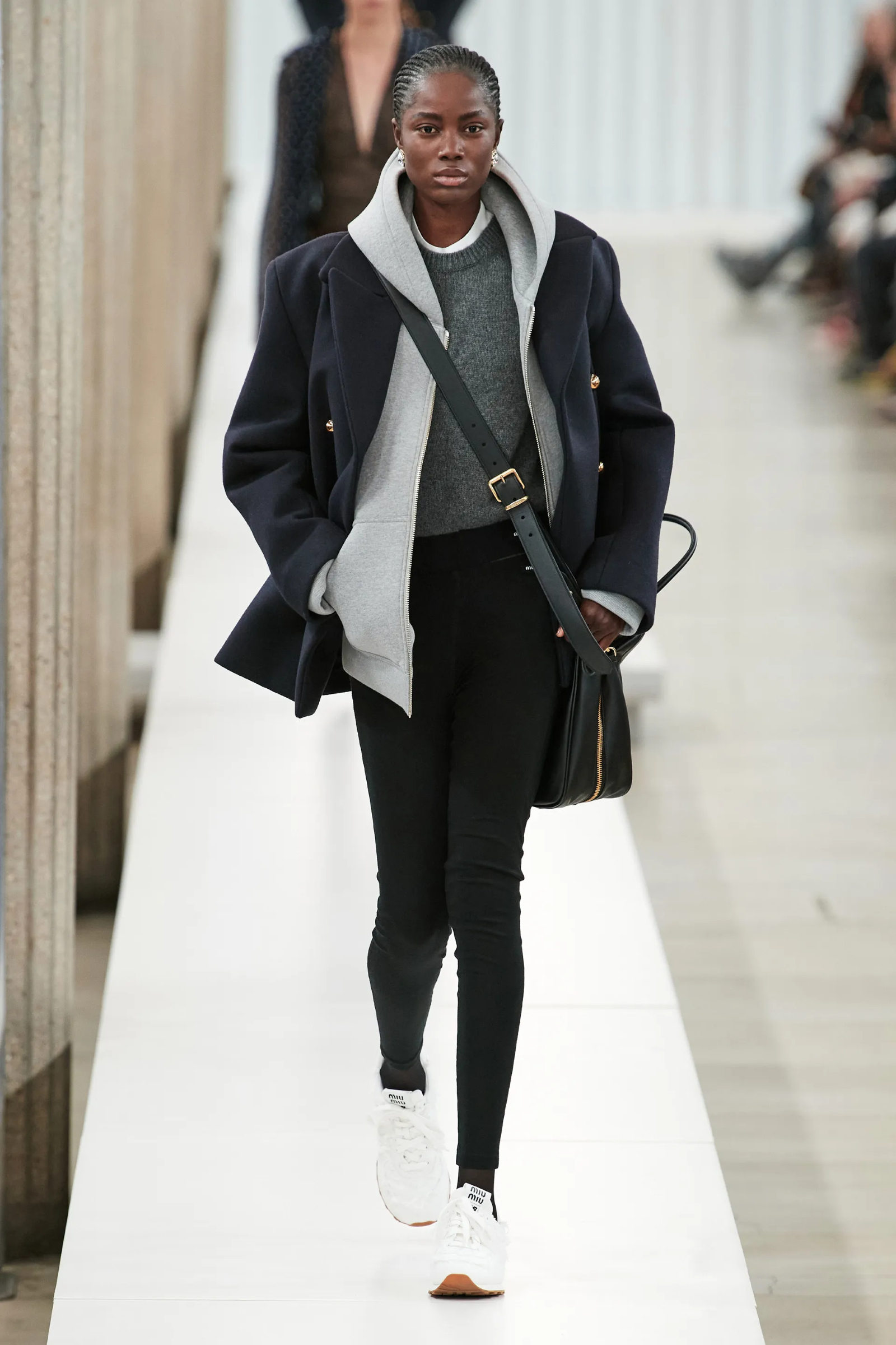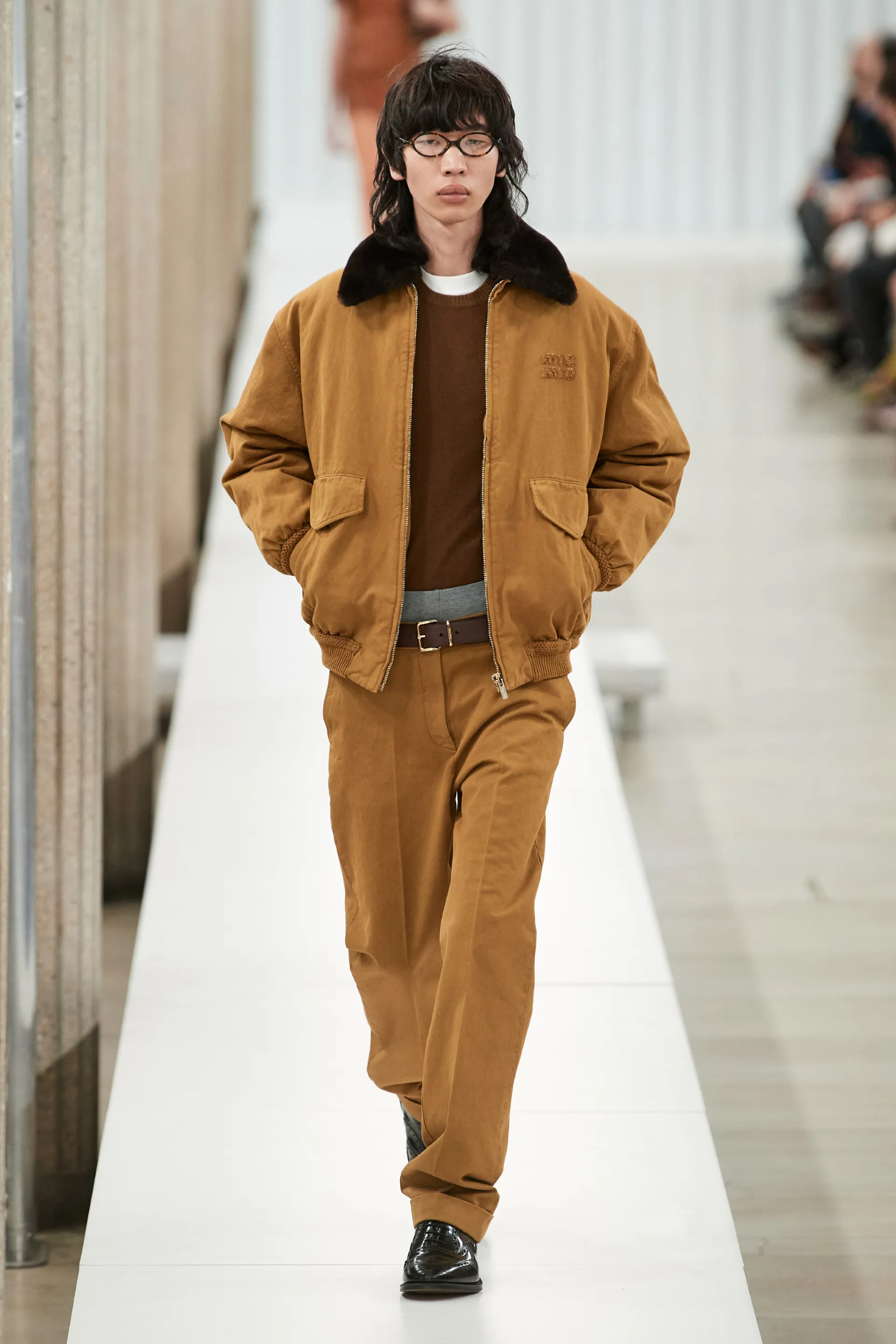 Se il pubblico pensava che Miu Miu avesse avuto il suo nuovo momento di gloria con l’ormai leggendario set tagliato a orlo vivo, nessuno era pronto per questo show. Di base, questa è stata la sfilata che ha portato l’officecore nella conversazione, che ha esemplificato nella maniera più pura quell’apprezzamento per le stereotipate uniformi d’ufficio trasformate in oggetti di trasgressione: twin set indossati senza pantaloni, strati di abiti dal sapore retrò del tutto trasparenti, quella felpa che vive rent free nella testa di così tanti clienti (o aspiranti tali) del brand, la collaborazione con Church’s, gli occhiali da nerd. Non ultimo, il ritorno di Mia Goth sulle passerelle dopo un anno di grazia che l’aveva trasformata nella nuova icona dell’horror indie. No crumbs left.