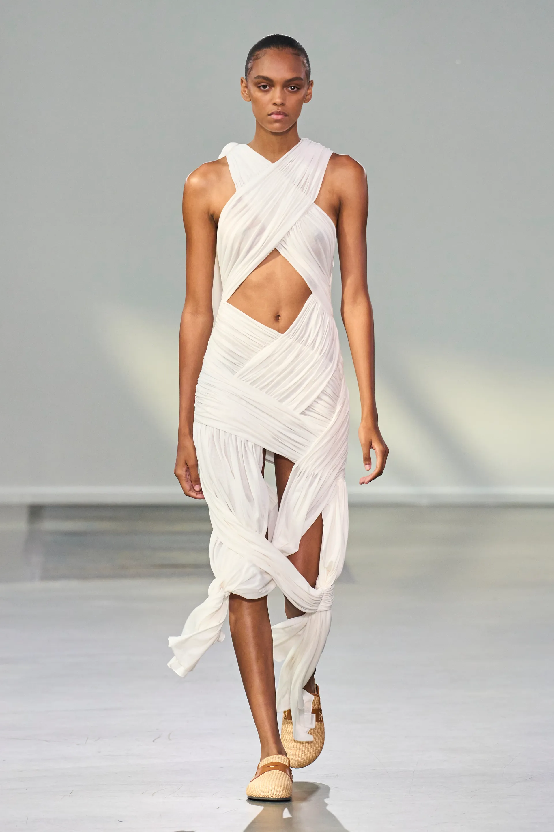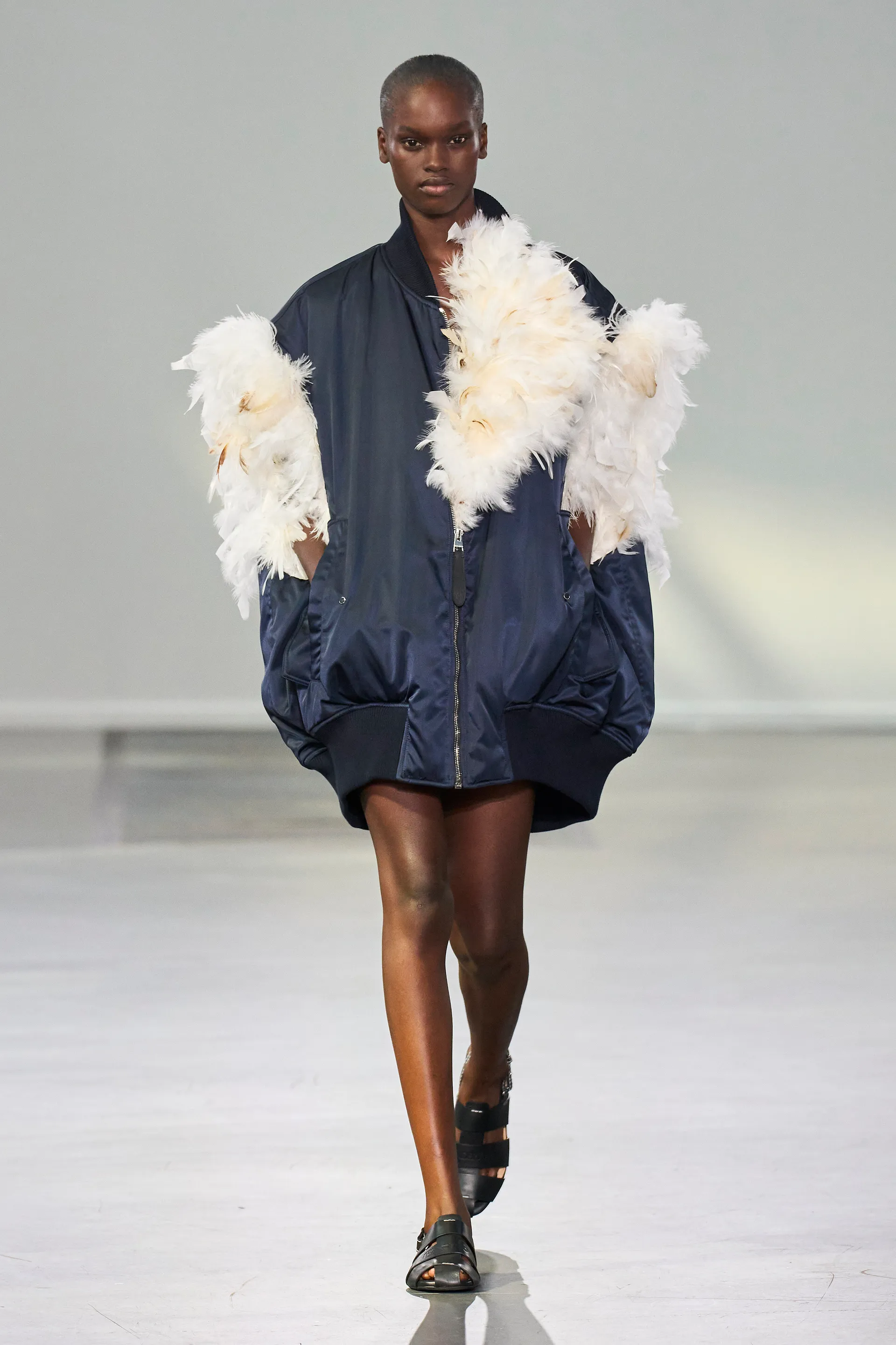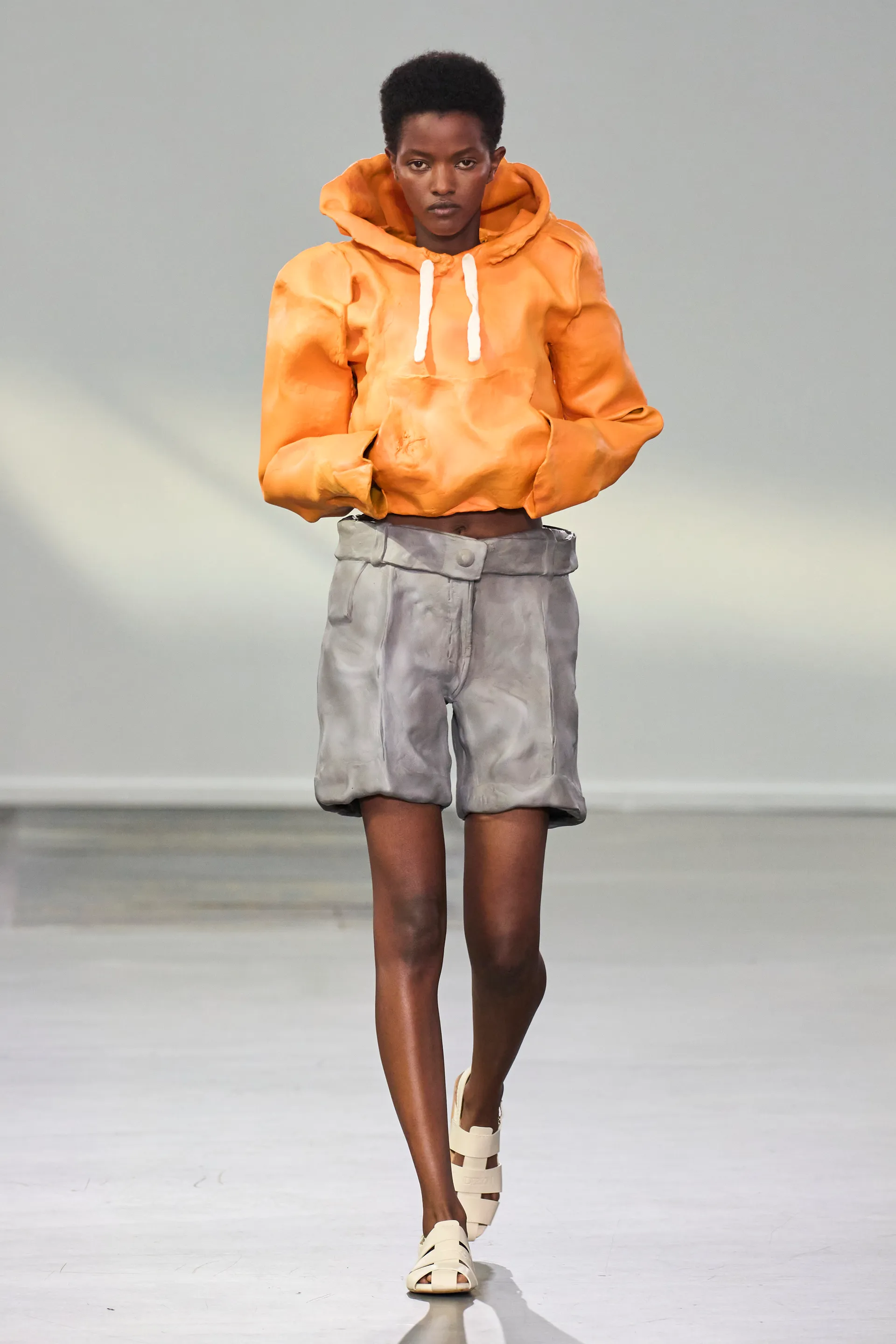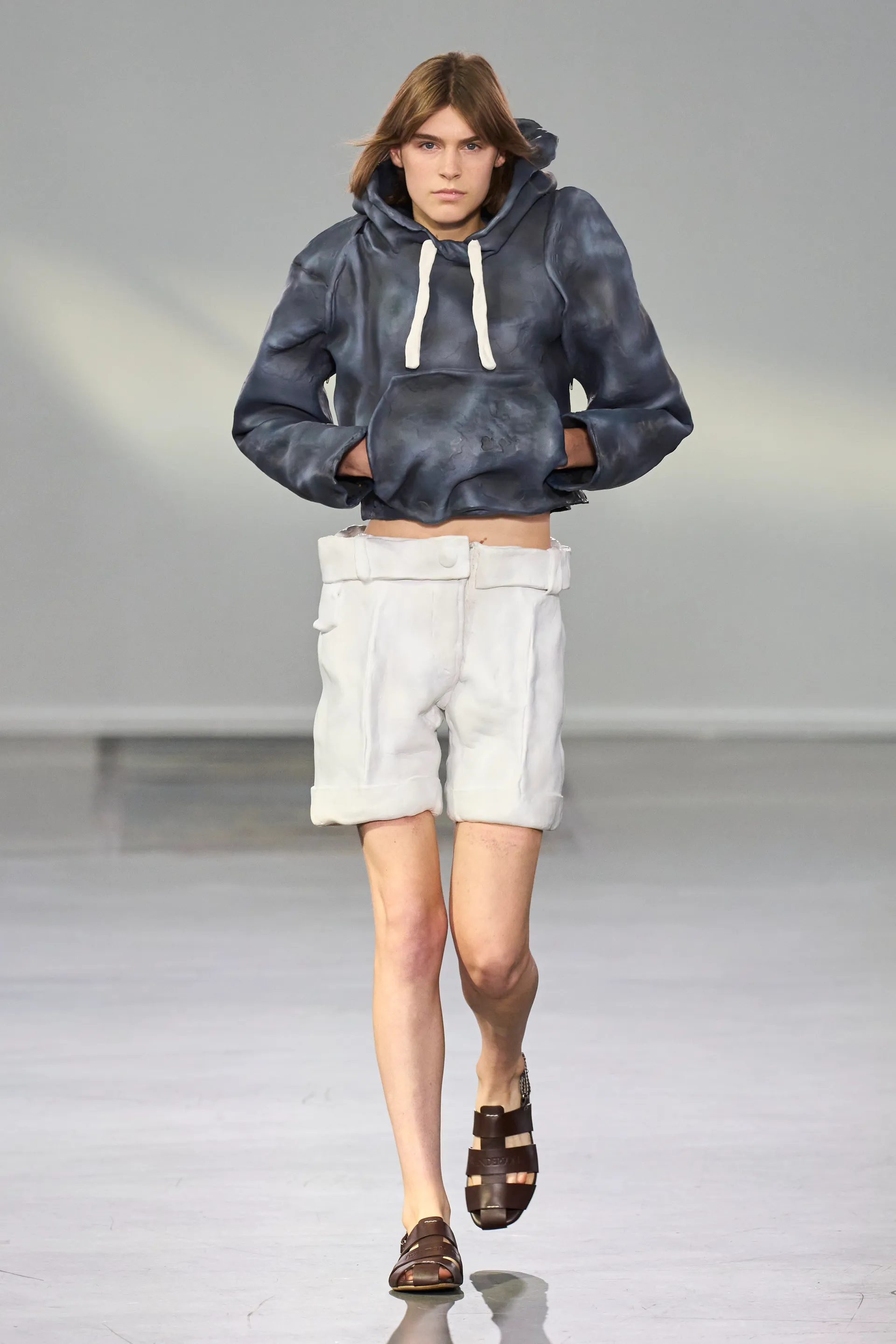 Il lavoro di Jonathan Anderson, dovunque esso si manifesti, è sempre un bel vedere. E questa collezione non è sicuramente stata da meno: texture burrose, cargo trasformati in pantaloni-mongolfiera, abiti drappeggiati, scintillanti come smalto, chiodi di pelle color oliva che paiono commestibili, i bomber piumati. Ma l’idea più assurda, stranamente semplice ma forse dalla complicatissima esecuzione è stata l’outfit di plastilina che ha aperto la collezione – un flash dall’infanzia che si trasforma in un’affascinante metafora del metodo e dell’estetica di Anderson che anche al culmine della difficoltà tecnica rimane sempre giocosa e auto-ironica.