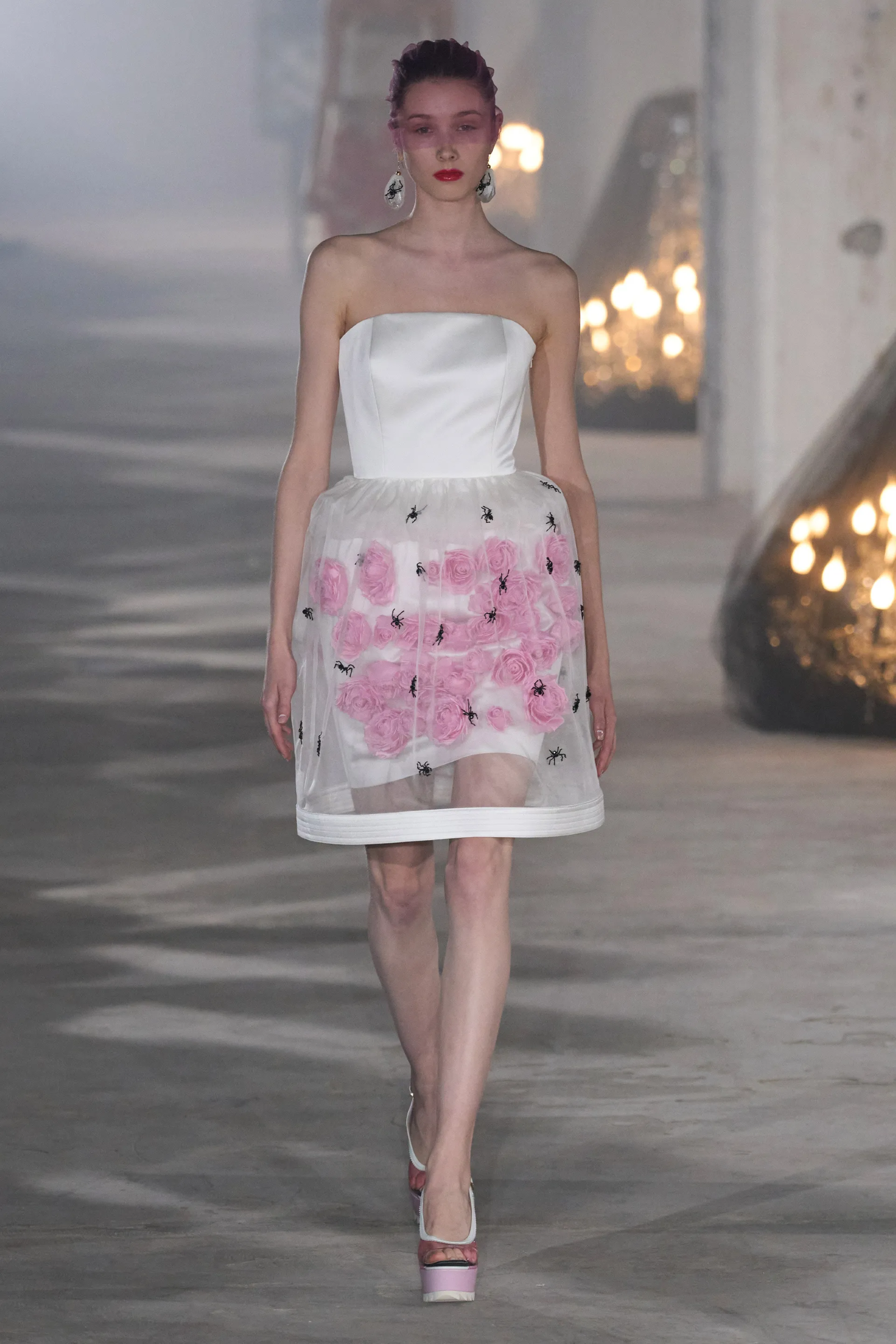 In un mese della moda in cui ci sono state molte cose belle ma pochi sussulti, l’idea di Jun Takahashi di chiudere il suo show con gonne-lanterna che contenevano piccoli ecosistemi e al cui interno volavano farfalle vive. Dopo lo show è nata una bagarre sull’etica di utilizzare vere farfalle nello show, anche se il brand aveva preso tutte le misure necessarie affinché il trattamento degli animali fosse il più etico e meno dannoso possibile. Non di meno, dopo una successione di capi ingegnosamente costruiti per sembrare capovolti, velati di tessuti trasparenti sui quali minuscoli insetti ricamati parevano arrampicarsi, e ali d’angelo poeticamente ingabbiate nel tulle, la visione surreale di questi abiti fuori dal mondo, così delicati e fantasiosi, è stata un’emozione che molti faticheranno a dimenticare.