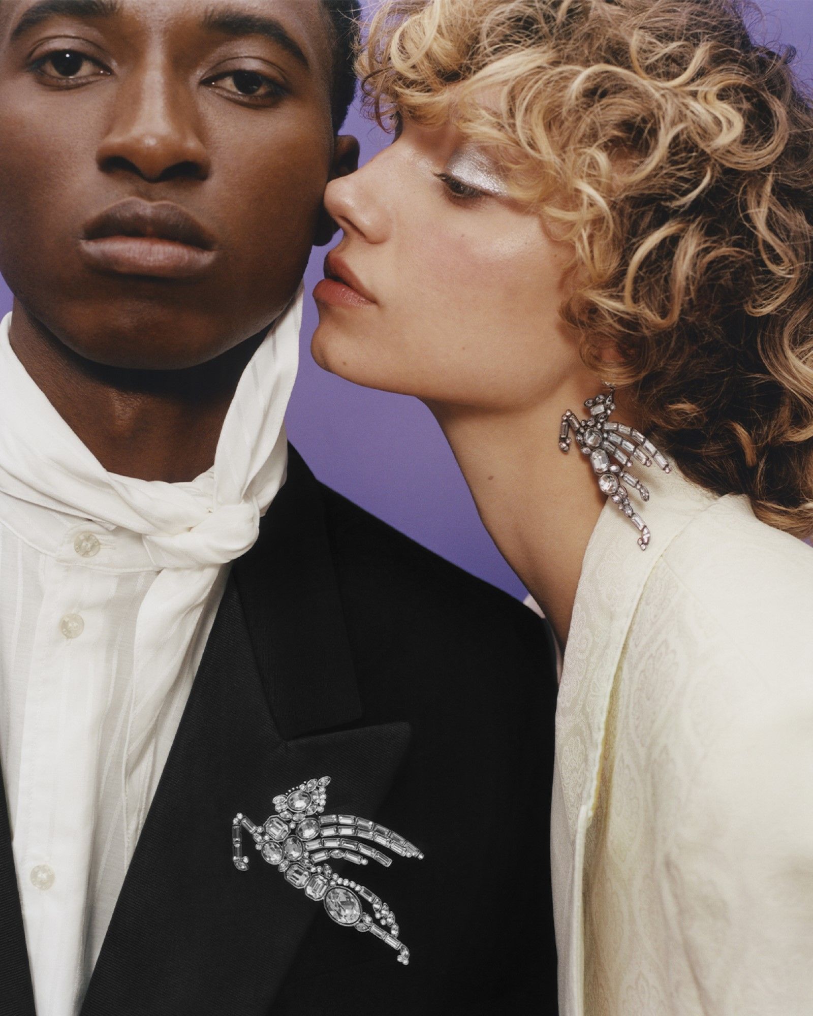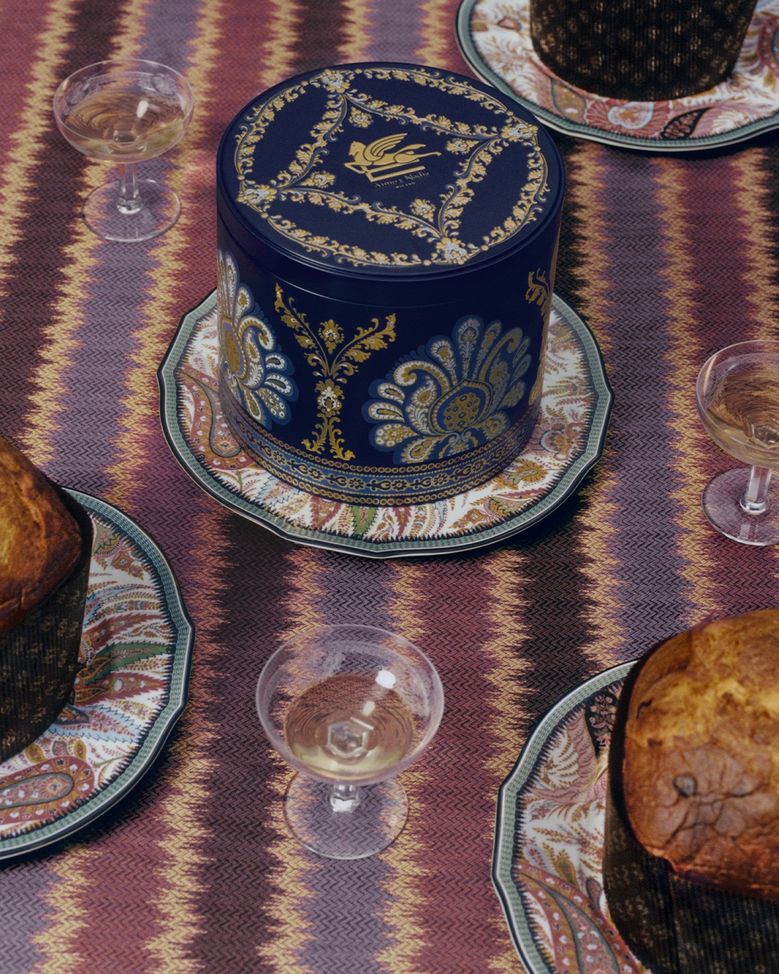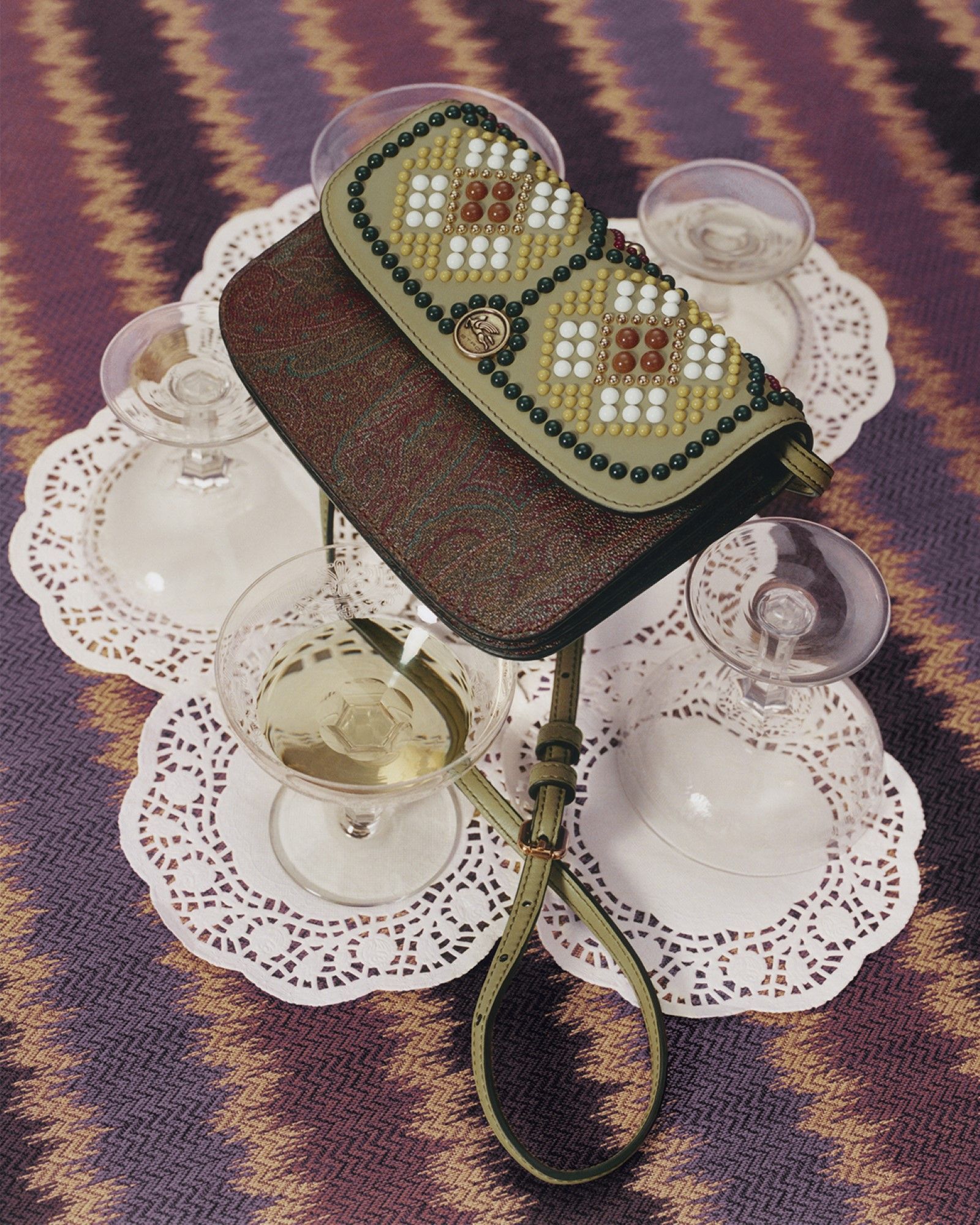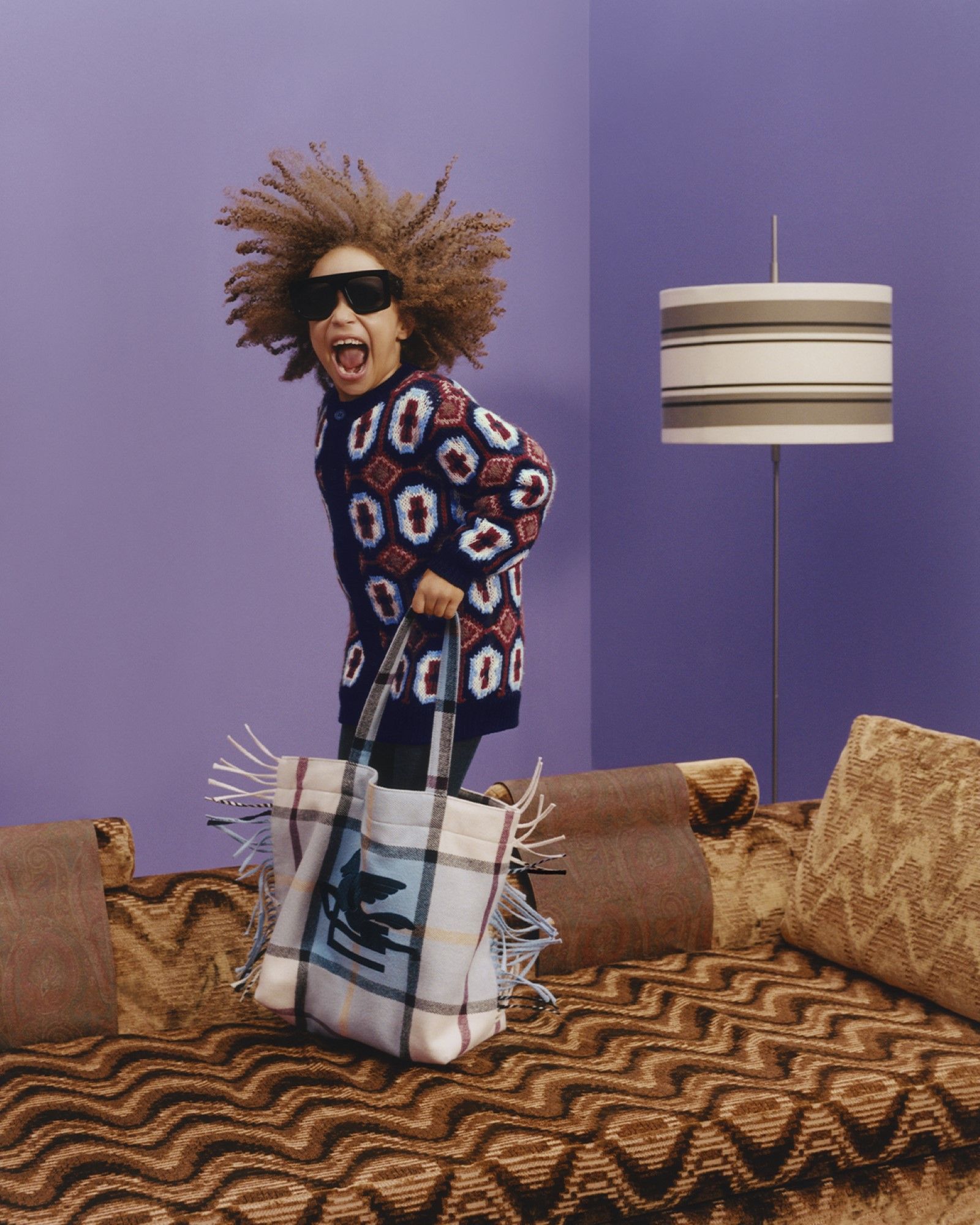 La collezione "Gifts of Joy" di Etro è stata presentata attraverso una campagna dai forti vibes anni '70, che mescola pattern estrosi e un'estetica massimalista che richiama l’estetica colorata e cosmopolita del brand. Gli accessori in pelle sono il fulcro della collezione, decorati dal tradizionale paisley e dal logo con Pegaso. Ci sono le nuove borse Saturno ed Essential Folder decorate da borchie multicolore. La capsule ready-to-wear gioca con l'eleganza del nuovo tuxedo, le sete eteree, i motivi tartan e i volumi delle maglie indossate sugli abiti da sera – il tutto ornato da disegni di medaglioni e jacquard con scomposizioni geometriche. Inoltre, questa campagna ha segnatp il debutto della nuova collezione di eyewear del brand, già vista in sfilata, e della collezione per bambini. Essendo Etro un brand che si occupa anche della casa, nel range sono inclusi anche diffusori di fragranze per la casa Oud e Vetiver e il panettone Etro creato in collaborazione con Aimo e Nadia del ristorante due stelle Michelin Il Luogo Aimo e Nadia, presentato in una speciale scatola in metallo decorata con il disegno Etro nei toni del blu e oro. Insomma, un pacchetto completo.