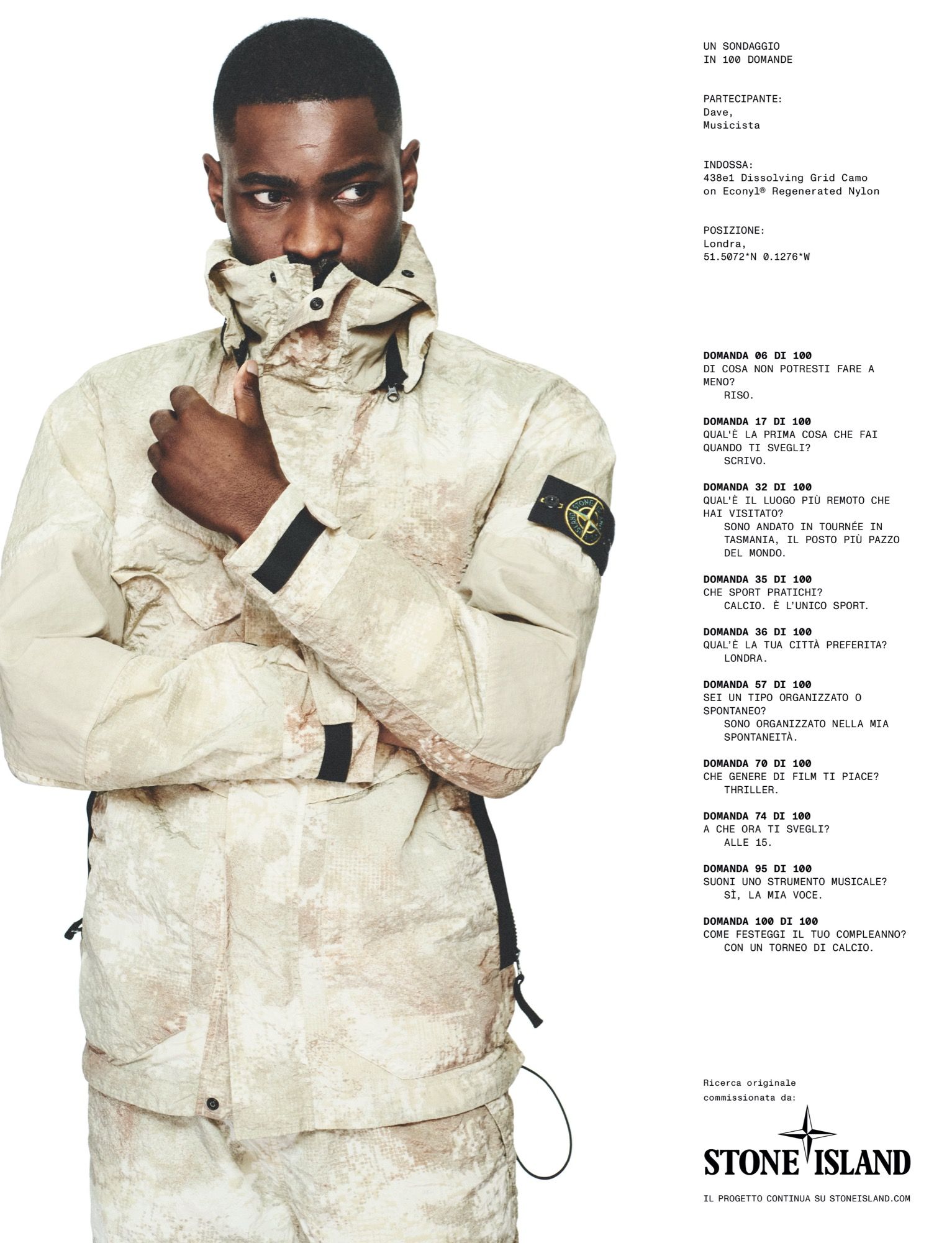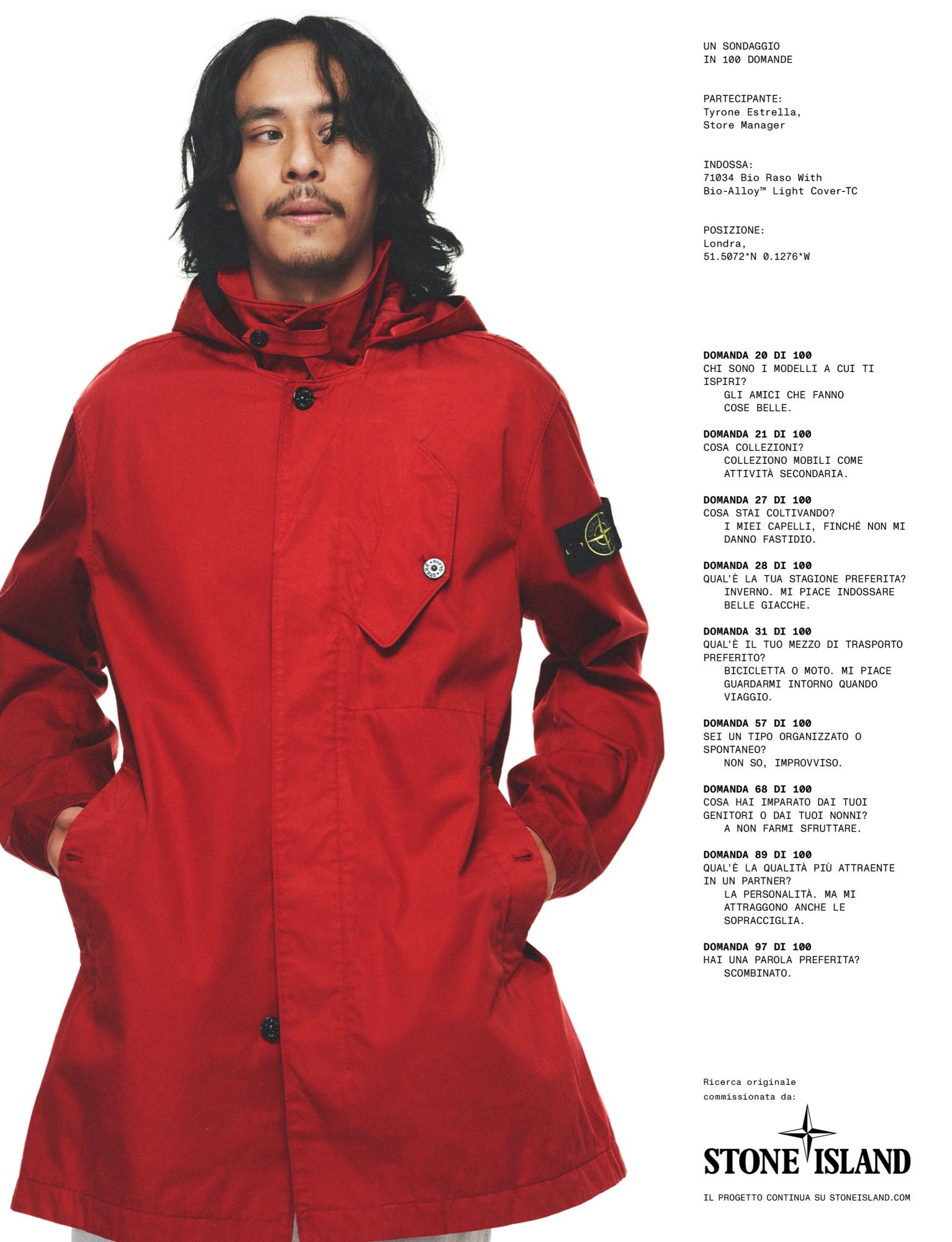 La fotografia di David Sims immortala i soggetti sull’iconico sfondo bianco di Stone Island, unitamente alla direzione creativa di Ferdinando Verderi e allo styling di Max Pearmain. Arricchiscono la narrazione dieci domande pensate appositamente per ciascun soggetto dal curatore e critico culturale Hans Ulrich Obrist, direttore artistico della Serpentine Gallery di Londra; le risposte appaiono nella campagna accanto ai ritratti. Robert Triefus, CEO di Stone Island, ha commentato: «La nostra vision per Stone Island è espressa in The Compass Inside, che stabilisce i nostri valori fondamentali in modo tangibile. L'innovazione costante, la fiducia nelle nostre capacità, la solidarietà e l'ossessione per i materiali formano i punti cardinali della nostra bussola. Progettiamo per il mondo reale, ed è per questo che la nostra nuova narrazione creativa presenta figure di rilievo della famiglia globale Stone Island».