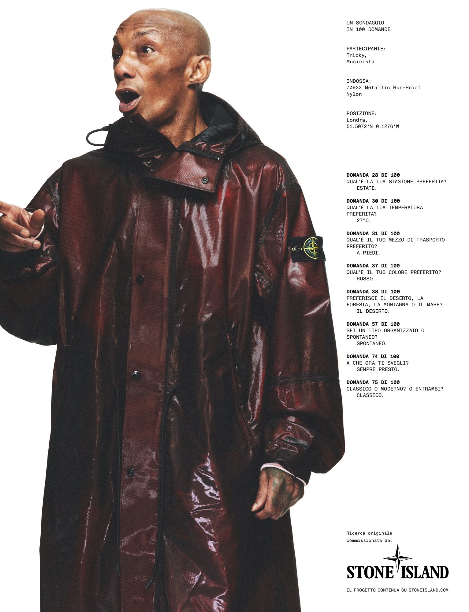 Stone Island inaugura il suo prossimo capitolo svelando il manifesto The Compass Inside (La Stella che è in noi) insieme alla nuova campagna che rende protagonisti i membri della propria community, ritratti nei capi emblema della collezione SS24. The Compass Inside è una dichiarazione dei valori e del credo intrinsechi di Stone Island, marchio fondato nel 1982 con la forte intenzione di porre la ricerca e l'innovazione dei materiali al centro dello studio dei prodotti e delle collezioni. The Compass Inside si rivolge a tutti i membri della community globale del brand, in continua espansione e definita da quello spirito condiviso che conferisce a Stone Island la sua forza unica. In concomitanza della pubblicazione del manifesto avviene il lancio della nuova campagna di Stone Island, che, concepita come una forma di ricerca, ritrae per la prima volta 16 membri della community globale del brand; sono tra questi l'attore Jason Statham, il produttore e musicista Dave, il coreografo Wayne McGregor, il tennista Henry Searle, il musicista Tricky, l'architetto Heidulf Gerngross.
