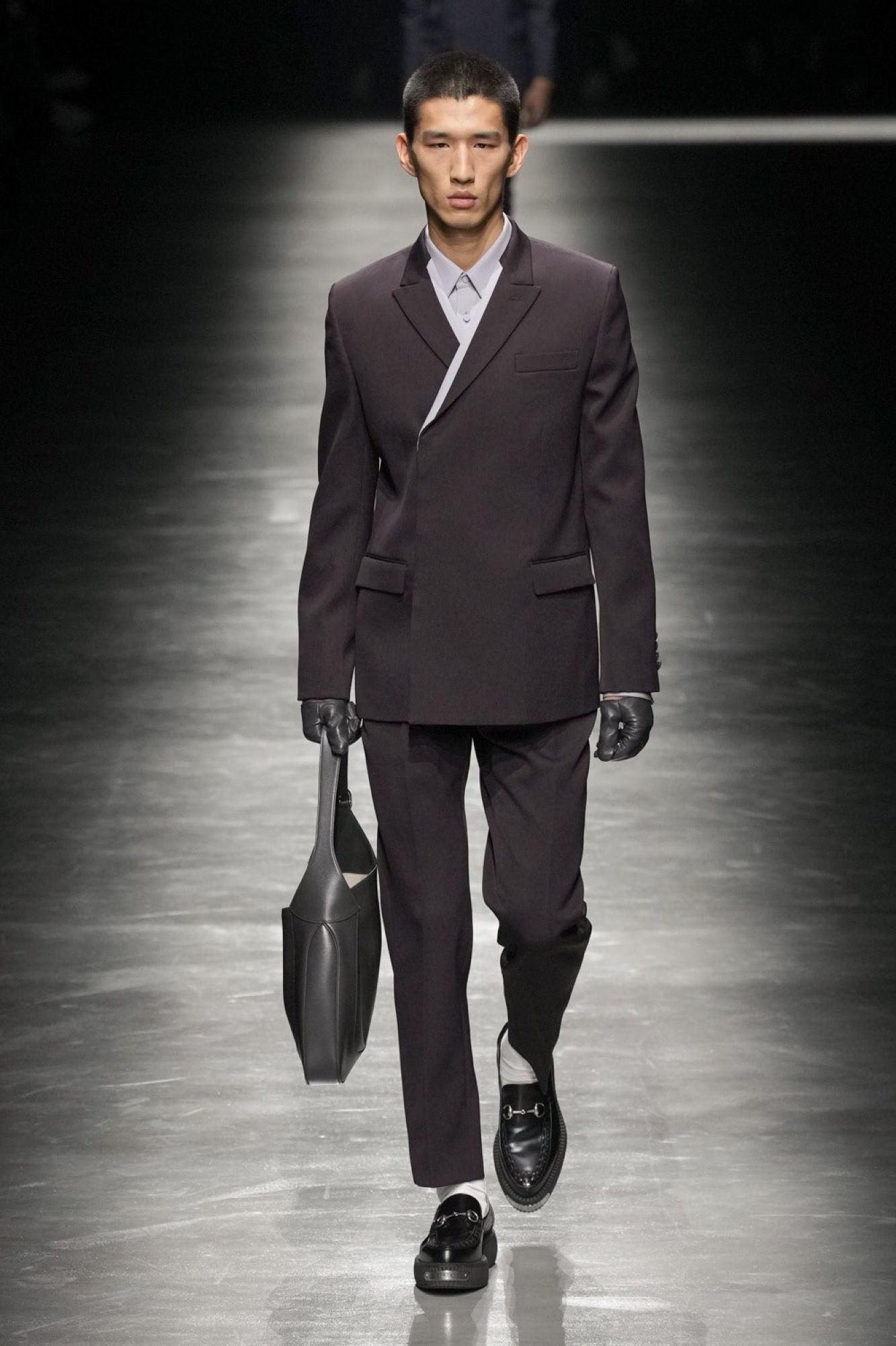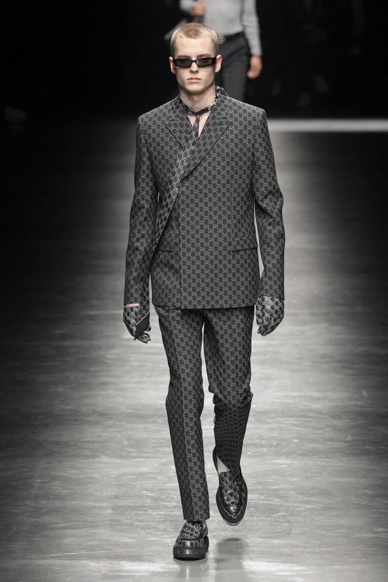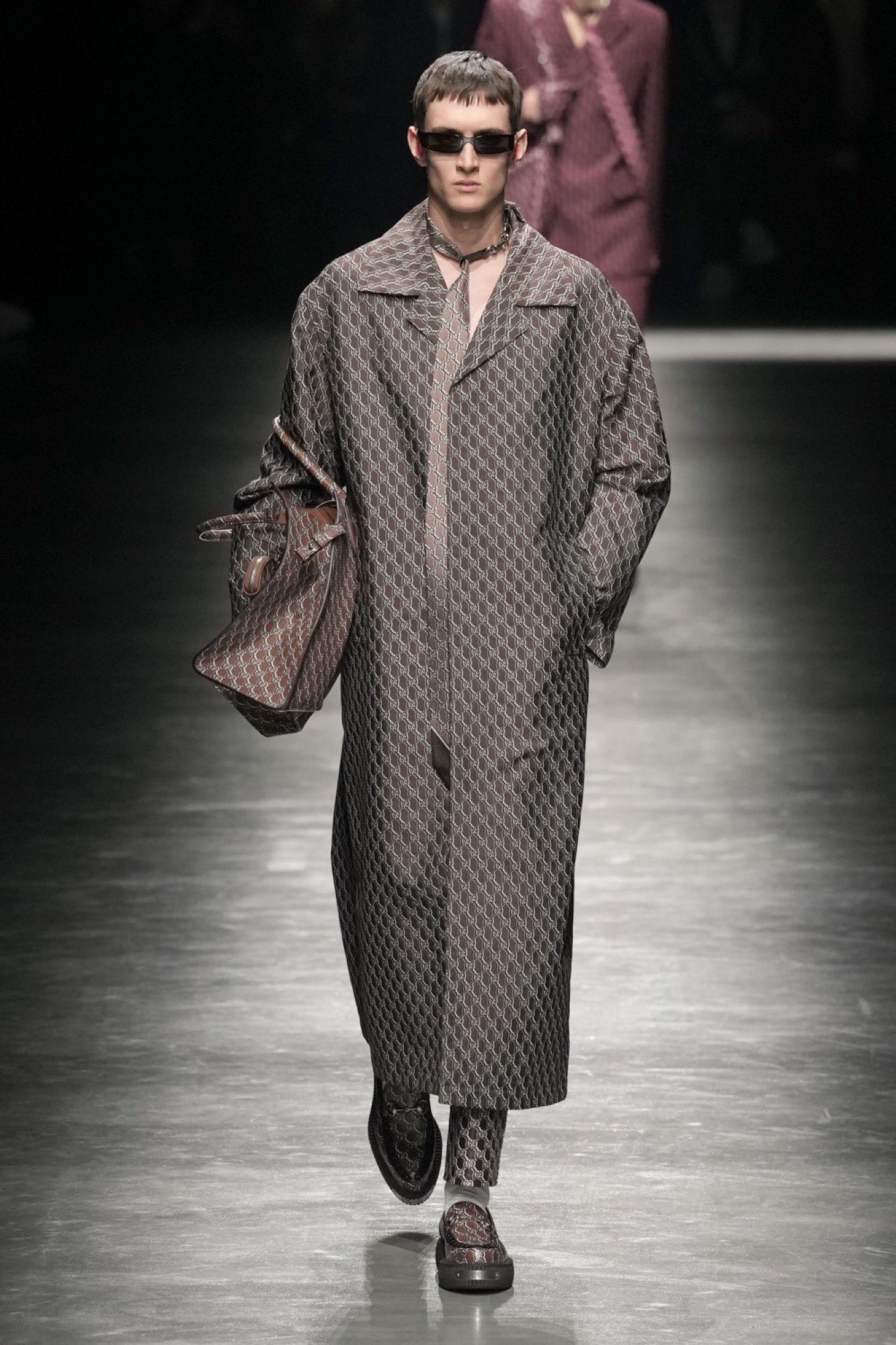 Il classico monogram di Gucci è apparso, su alcuni completi e alcune borse, in una nuova forma: rimpicciolito e reticolare, con un effetto ombra che gli dà profondità, più simile a una texture del tessuto o a un motivo geometrico astratto che al GG monogram classico (e che era comunque presente), questo nuovo e discreto motivo sembra rappresentare il coeso, preciso e misurato linguaggio che De Sarno ha portato al brand. Nello show, abbiamo visto il nuovo monogram tappezzare interamente alcuni look in diversi colori, principalmente in grigio e in Rosso Ancora, il che ci fa pensare che lo vedremo applicato a numerosi item della nuova collezione maschile, quando arriverà nei negozi. È davvero iniziata l’era del nuovo minimalismo.