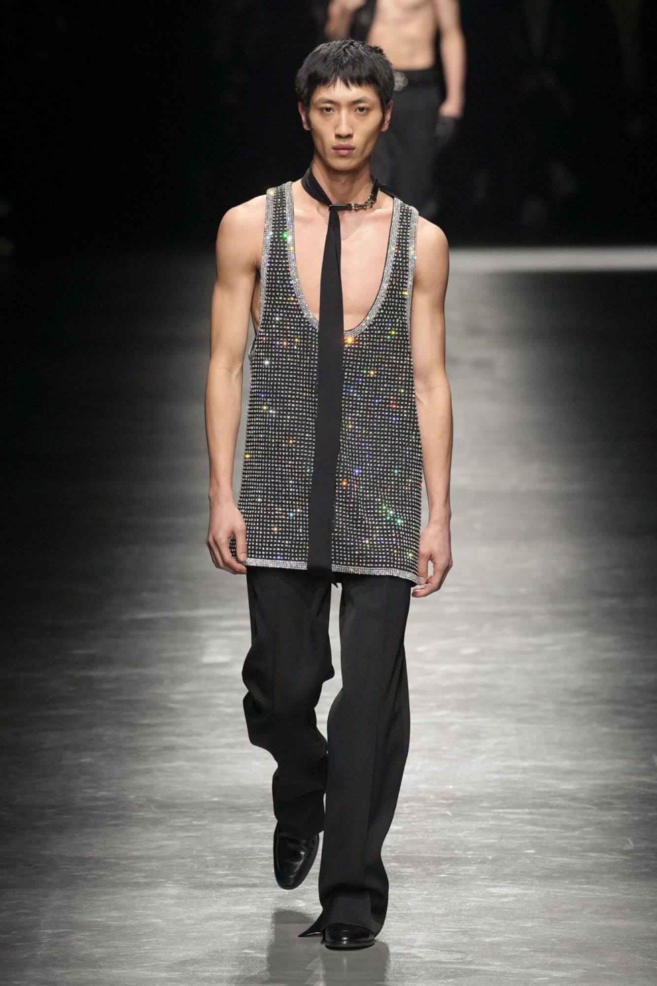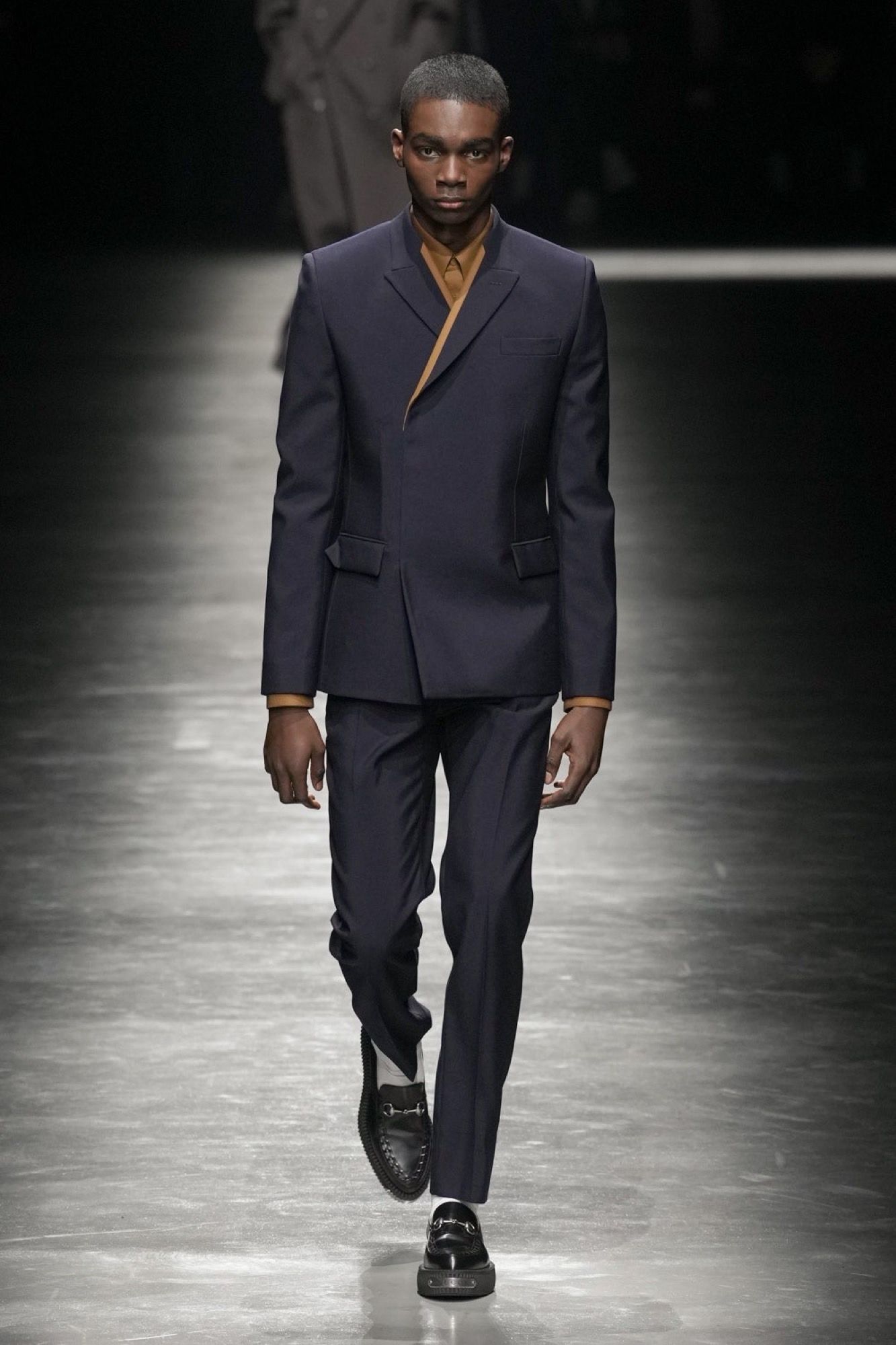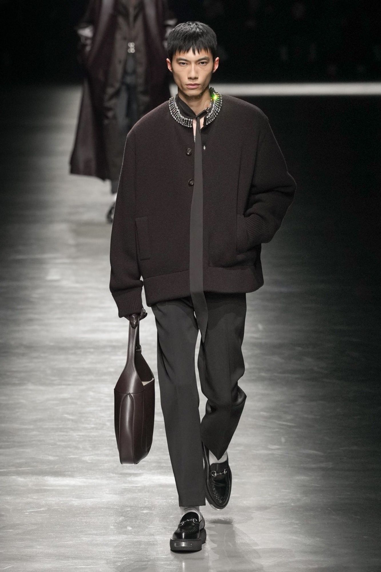 La prima collezione menswear del nuovo Gucci di Sabato De Sarno ha appena sfilato a Milano, portando avanti il linguaggio modernamente classicista sperimentato dal nuovo direttore creativo nel suo show di debutto a settembre. La colonna sonora e la palette cromatica collocavano fermamente questa collezione nello stesso universo narrativo del primo outing femminile, con alcuni dei capi più genderless che sono tornati in passerella. Un’enfasi tutta nuova per una sartorialità riconoscibile ma resa ancora più fluida e lineare con proporzioni sottilmente alterate alle spalle e agli orli, e una sorta di semi-nascosto languore che sbucava nei lunghi nastri che circondavano il collo dei modelli, in alcuni collari luccicanti di cristalli e nei profondi scolli delle maglie che rivelavano, sotto l’onnipresente cappotto statement, una pelle nuda e vulnerabile. In questo mare di elegante e quasi placida sobrietà, abbiamo rintracciato cinque dettagli-chiave che hanno animato la collezione e che ricorderemo molto a lungo.