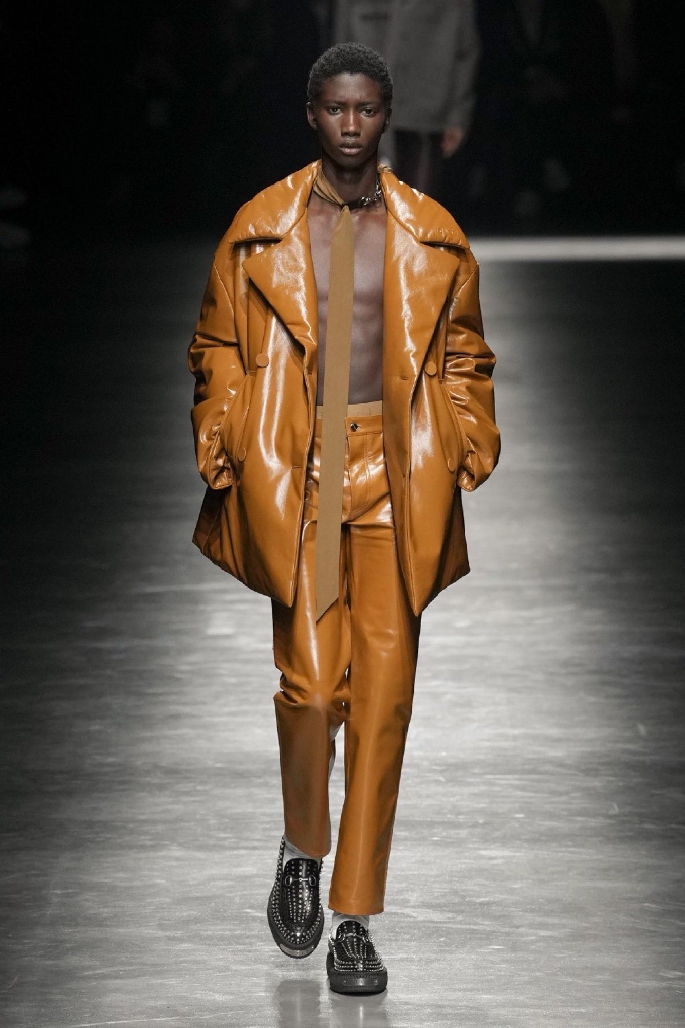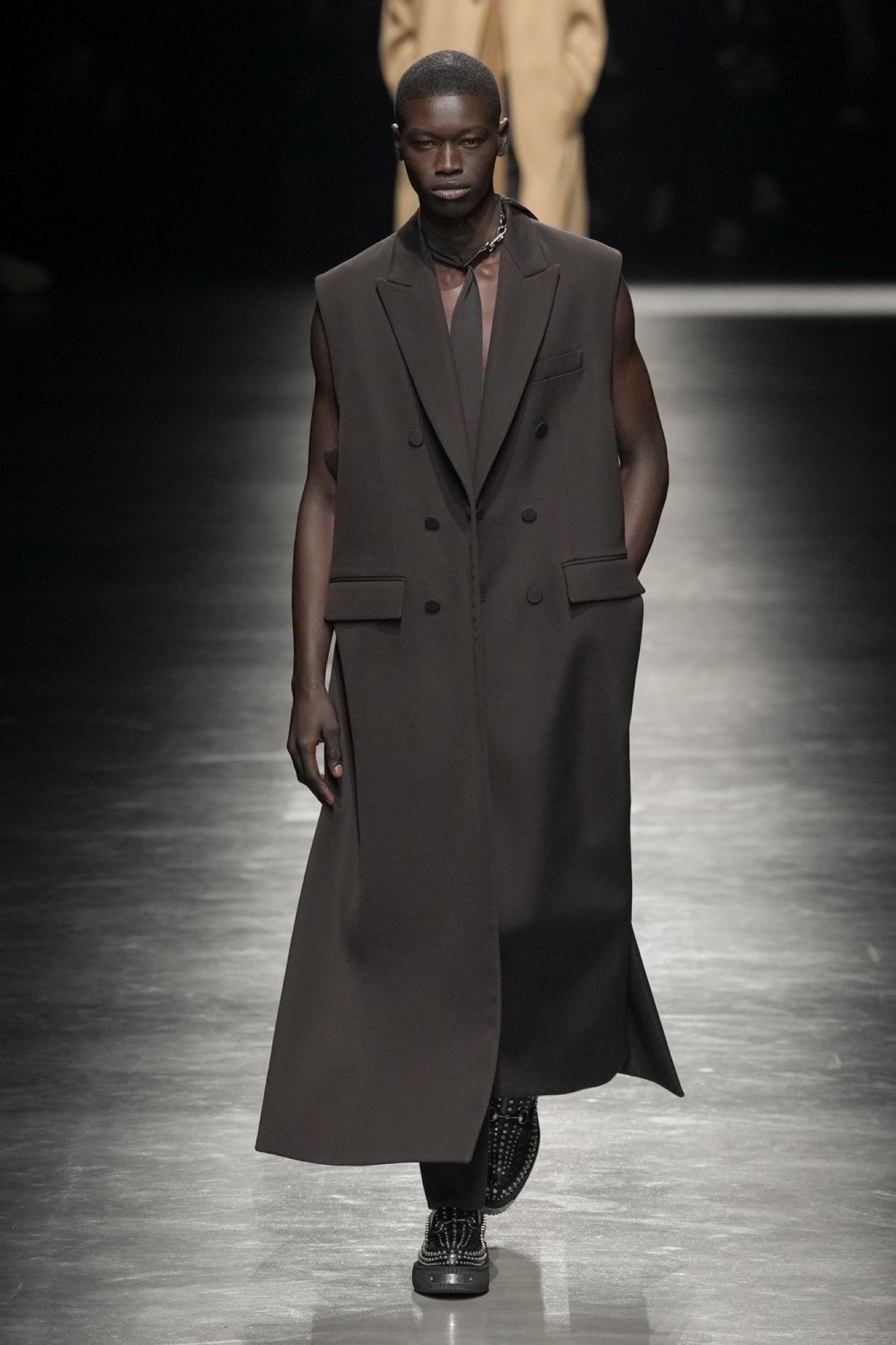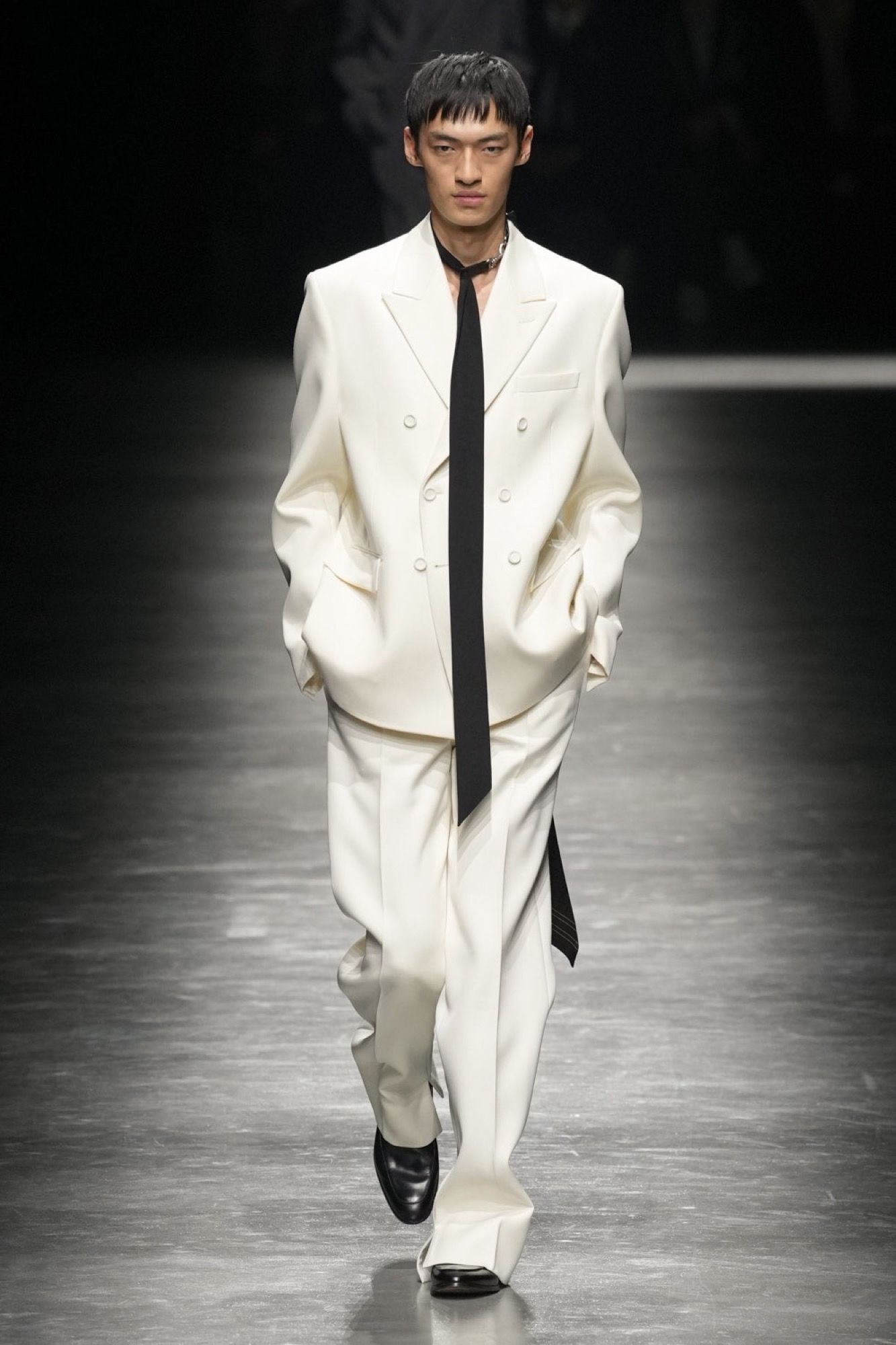 Un dettaglio che si è fatto notare ma che normalmente sarebbe passato in sordina sono i pantaloni o, meglio, la loro vestibilità. Se alcuni modelli che abbiamo visto in passerella mantengono proporzioni morbide, ariose e drappeggiate, la maggioranza dei look presentavano vestibilità asciutte, non aderenti, ma sagomate con precisione sul corpo. Un altro cenno al senso di equilibrio e moderazione della sartoria di De Sarno che suggerisce anche il ritorno di pantaloni dalla misura più precisa e naturale oltre che sottilmente croppati sopra la caviglia.