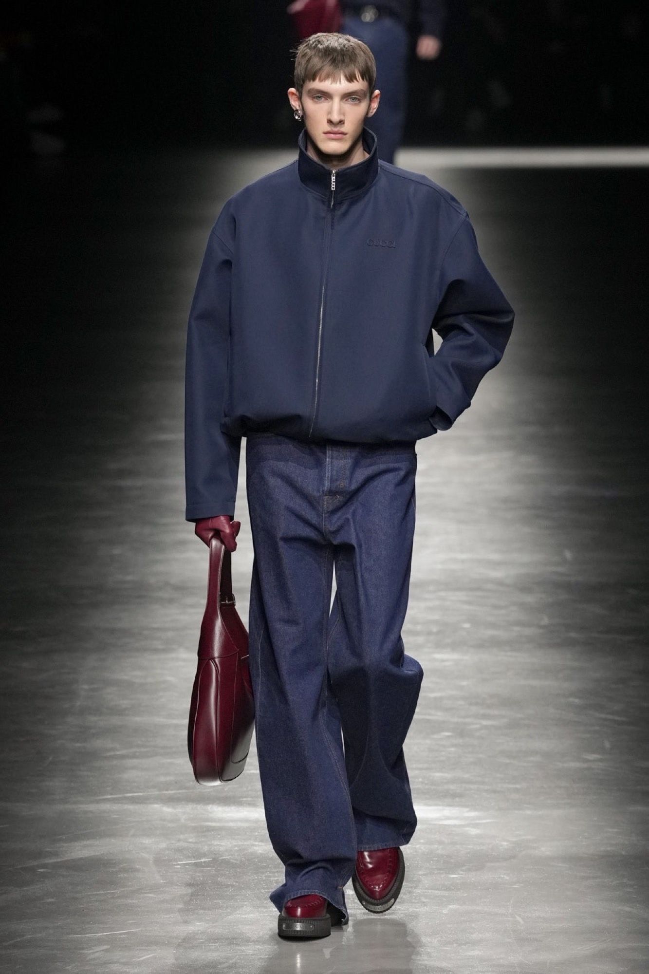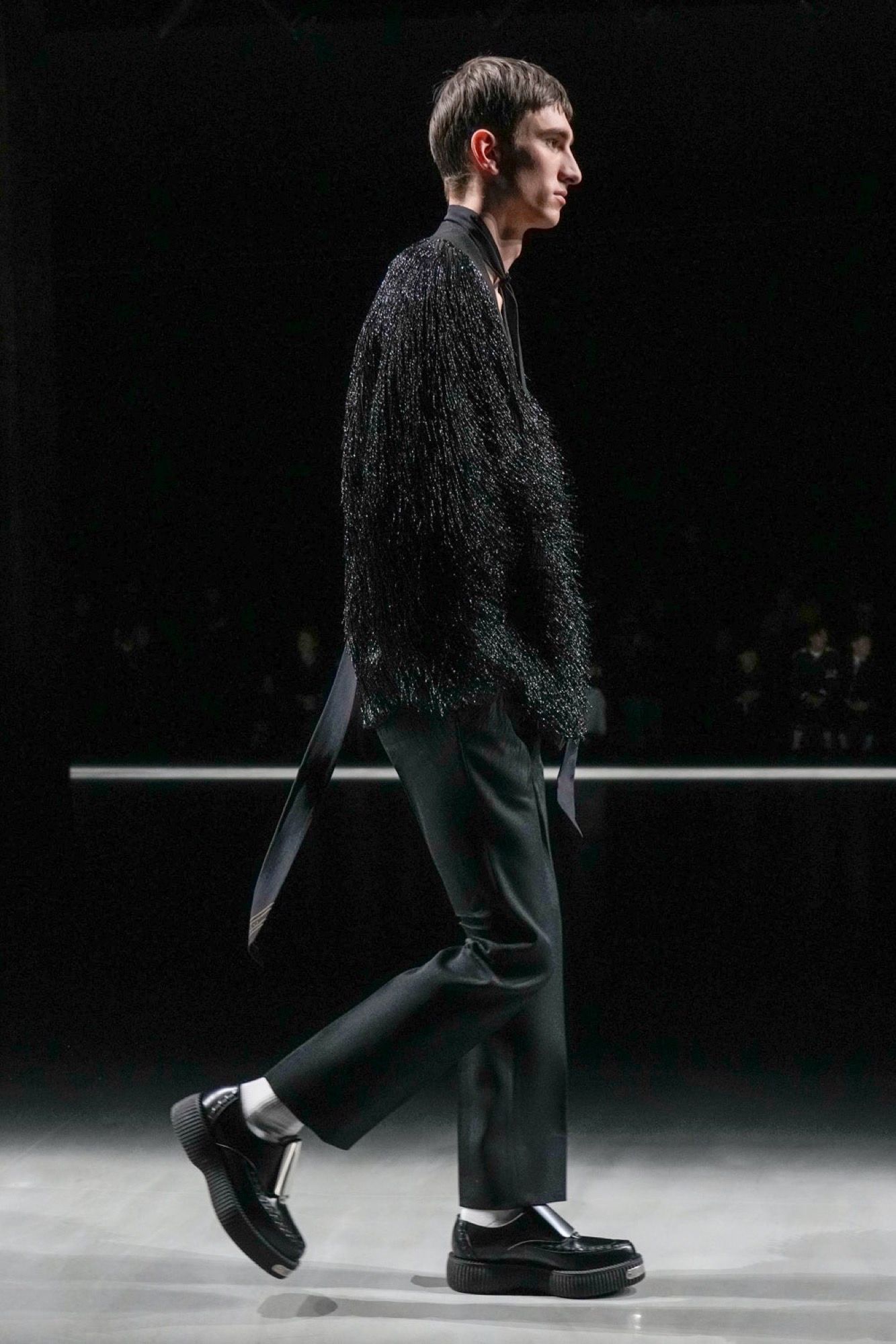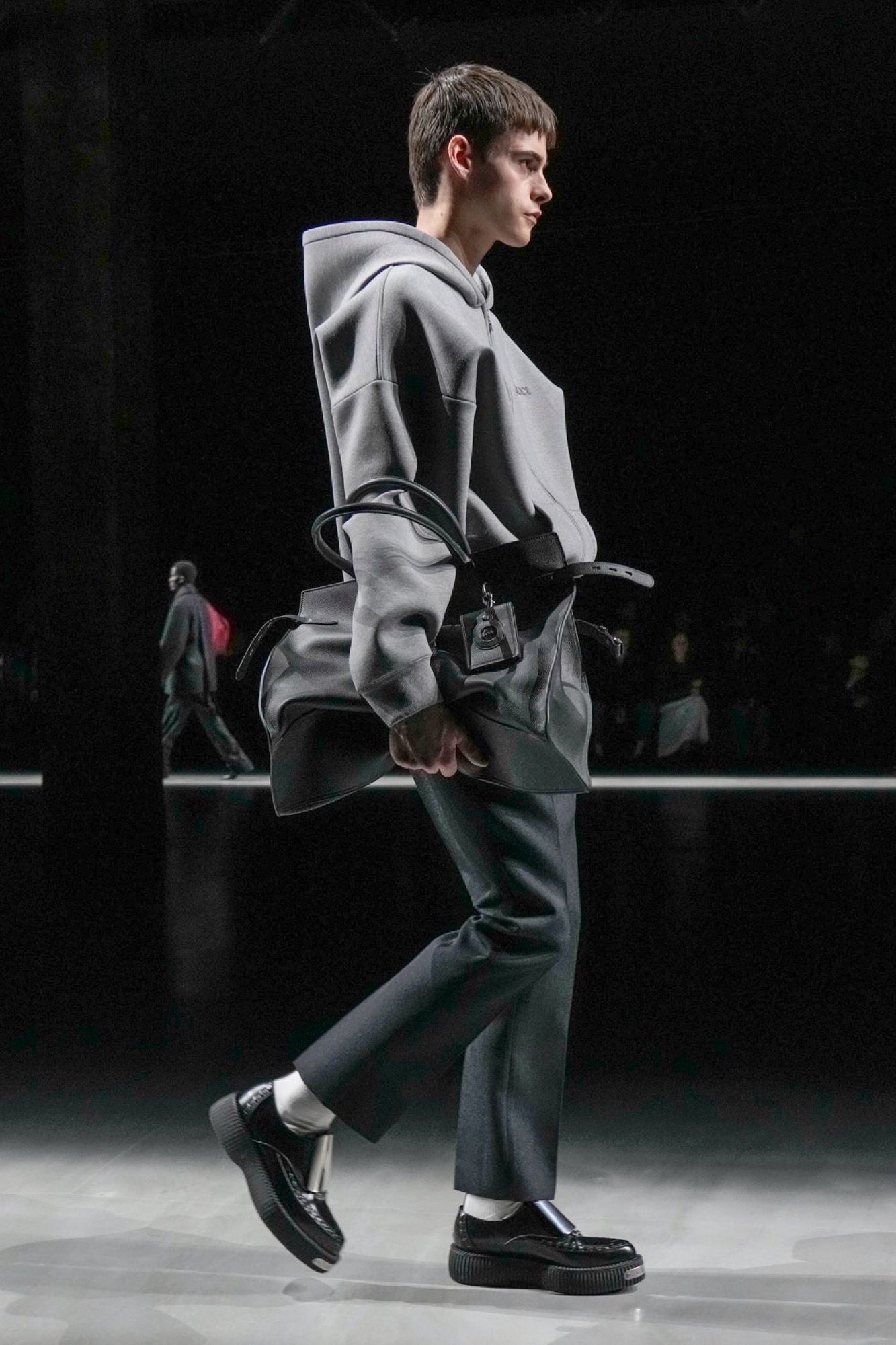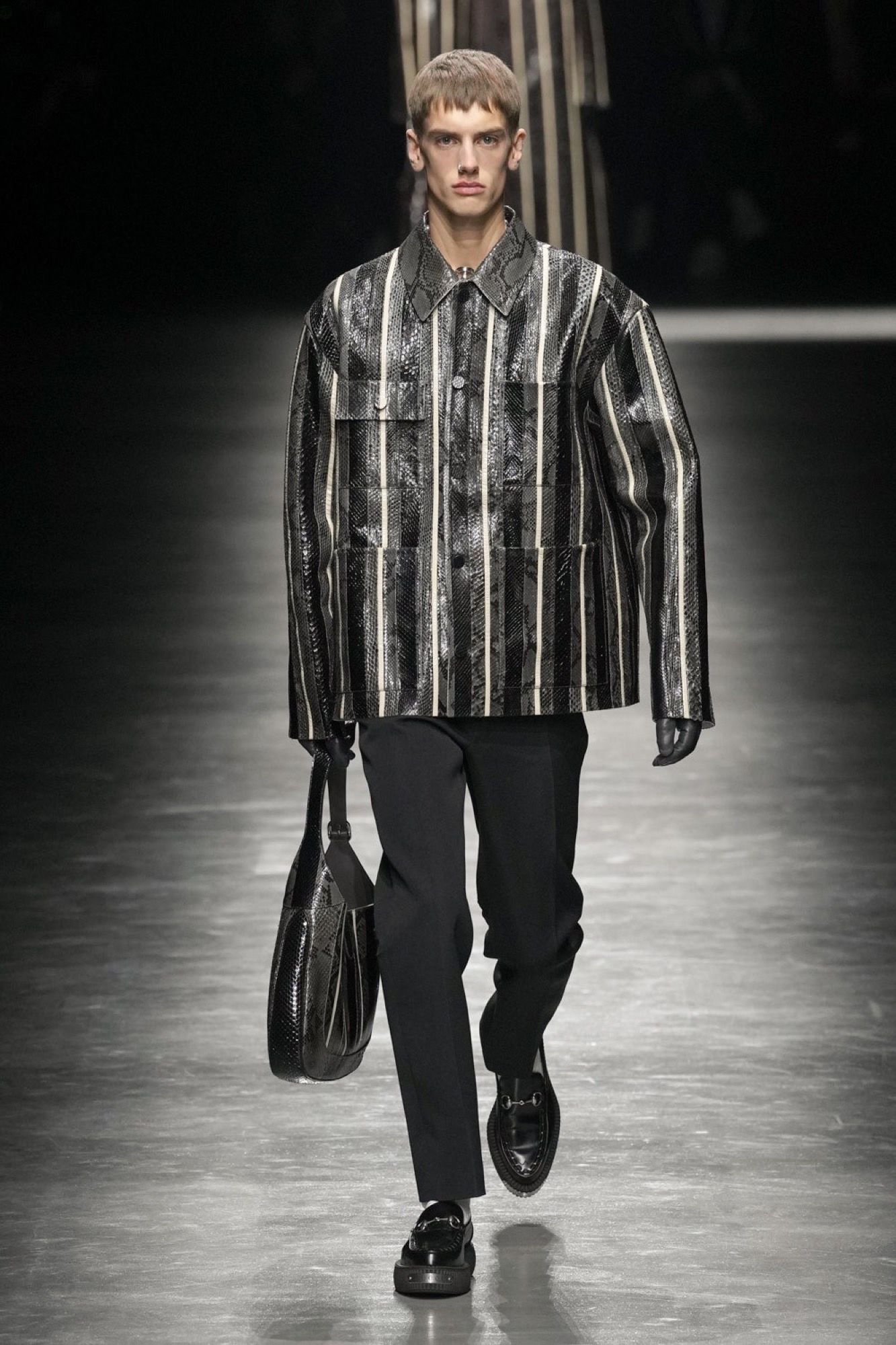 Gucci è sinonimo dei suoi mocassini – uno dei design originali del brand che non solo hanno fatto la storia ma sono anche celebrati nelle esposizioni del MoMa come uno dei capolavori assoluti del design. Se la scorsa sfilata femminile aveva arricchito il classico mocassino con un grande platform, in questa collezione abbiamo visto la versione maschile del mocassino Gucci assorbire il look delle classiche Creeper, quello stile di scarpe divenuto famoso nel corso della seconda guerra mondiale e che prevedeva l’abbinamento di una suola zigrinata o scanalata (oltre che abbastanza spessa) con una tomaia più formale. L’esempio è seguito anche per l’iconico mocassino, e variato attraverso una lunga serie di texture, dettagli, e proporzioni diverse.