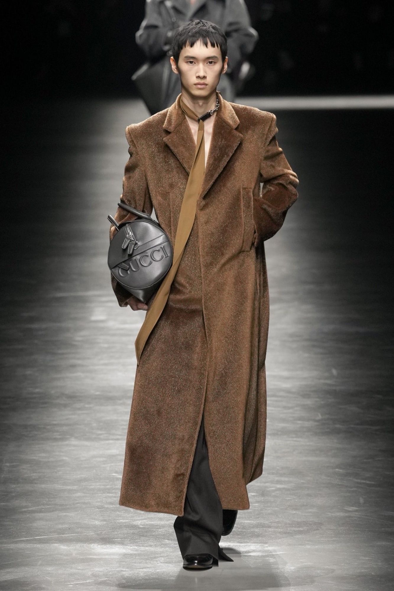 Protagonisti indiscussi di questa passerella sono stati i capispalla. Molto sartoriali, molto strutturati nelle spalle e nei baveri, opulenti nella ricchezza dei materiali ma soprattutto proposti attraverso diverse forme e lunghezze. Dalla versione del lungo cappotto doppiopetto privo di maniche, fino al rifacimento in pelle con, sotto, un altro cappotto più sottile e leggero. Grande highlight sono stati il cappotto imbottito di una lucida pelle scintillante color caramello e altri due modelli, uno corto e uno lungo, in un tessuto la cui texture sta a metà tra il velluto e la pelliccia rasata. A queste rigide linee sartoriali, si aggiungono accessori di seta, che ricordano il lungo heritage che Gucci possiede nella lavorazione di questo materiale.