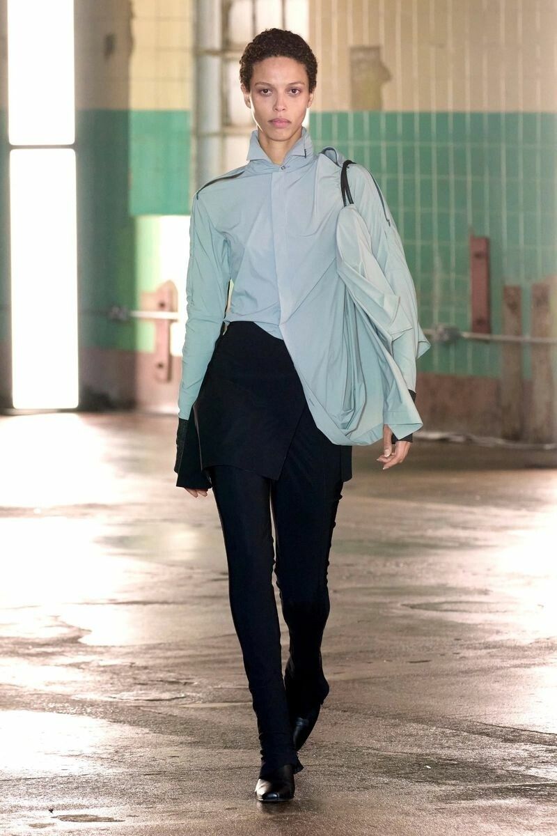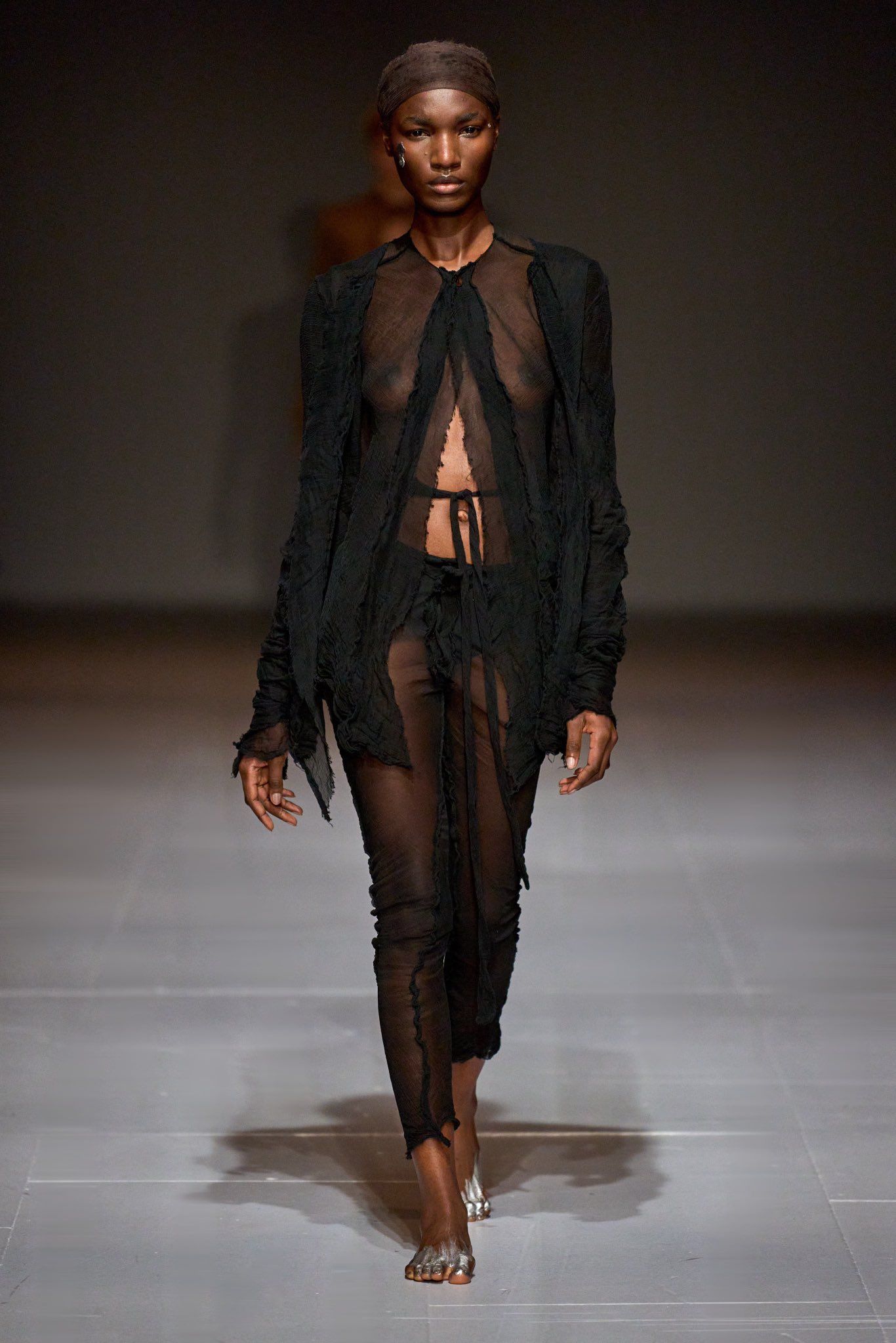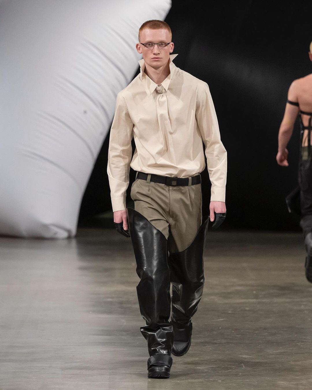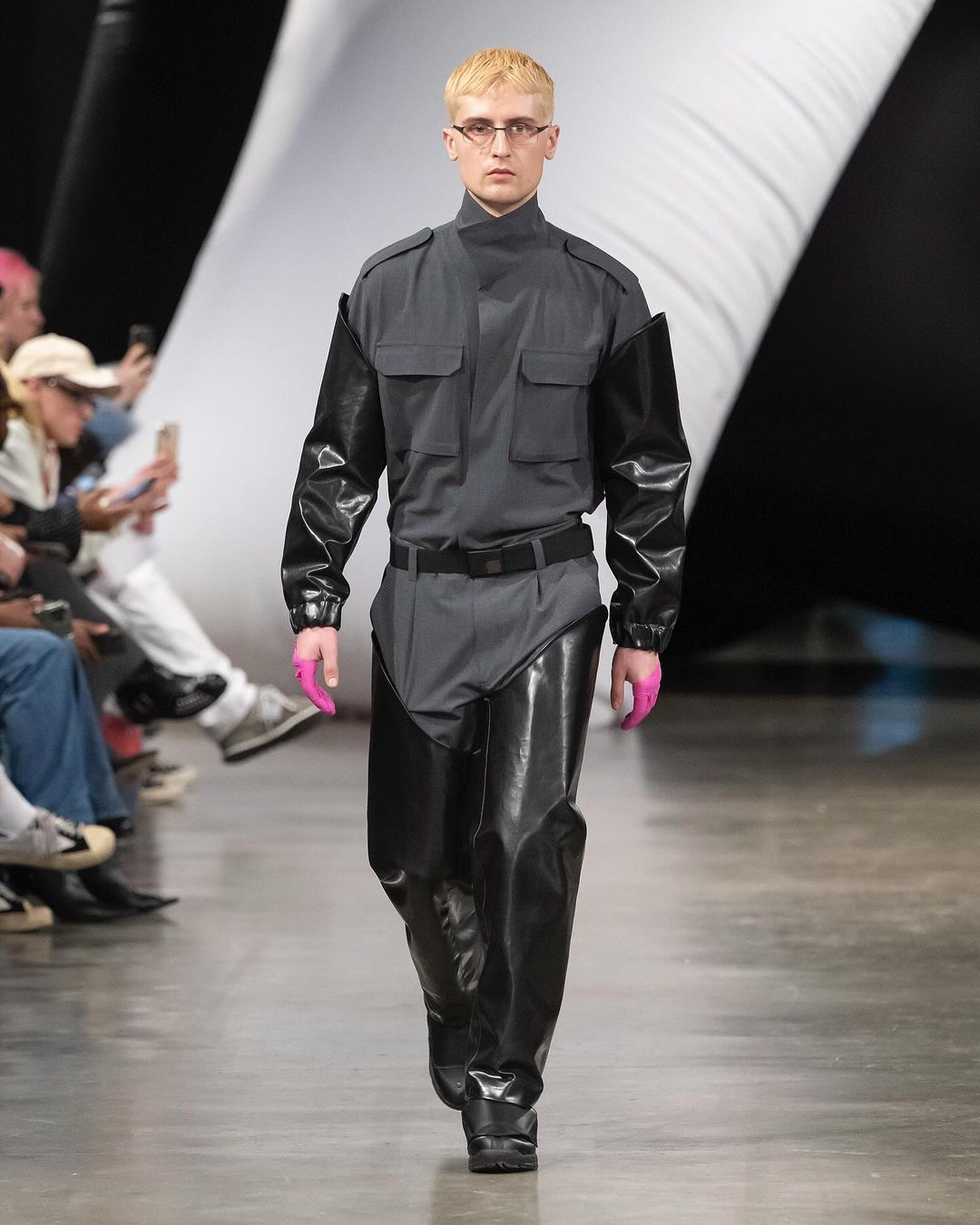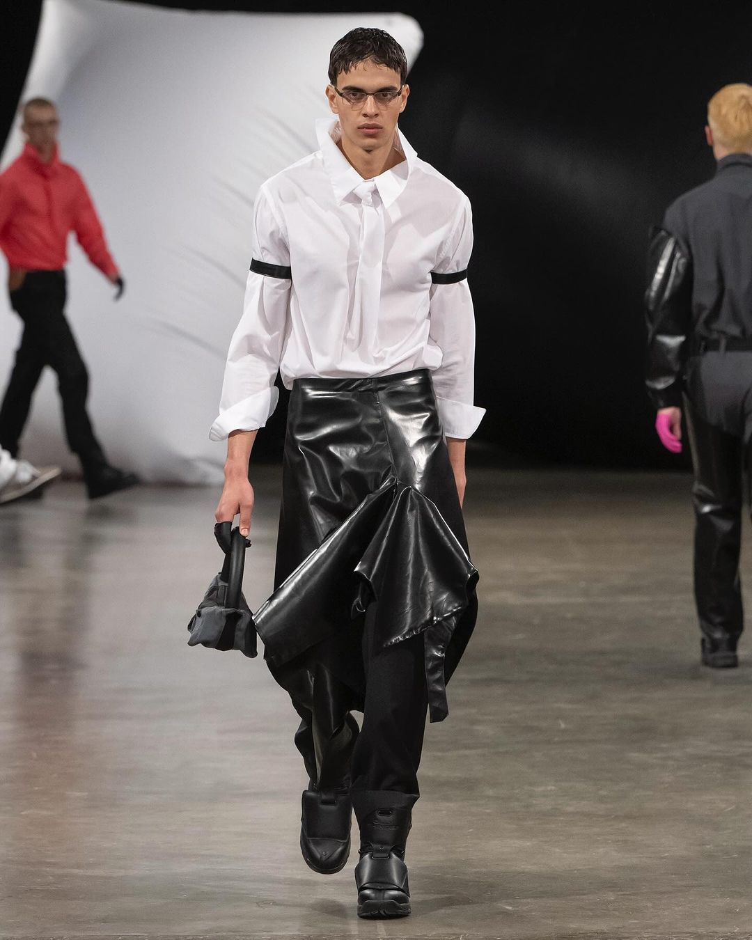 Fashion East è una rete di supporto non-profit fondata negli anni 2000 per sostenere i talenti emergenti della moda inglese. Negli anni ha aiutato creativi affermati, tra cui JW Anderson, Simone Rocha, Kim Jones e Martine Rosa, e ogni stagione offre a più designer la possibilità di utilizzare spazi appositi per presentare le proprie collezioni. Questa FW24, Johanna Parv e Olly Shinder hanno rubato la scena, entrambi con abiti che sfidavano il confine tra funzionalità e sex appeal. La line-up di Parv era contraddistinta da silhouette e tessuti tecnici che trasformano la gonna in un’arma affilata, mentre i design di Shinder hanno riscritto le regole del latex-wear. Grembiuli da laboratorio e stivali alti in pelle hanno sfilato su un cast muscolosissimo, dando vita ad un’estetica industrial-chic in cui l’aderenza è sovrana.