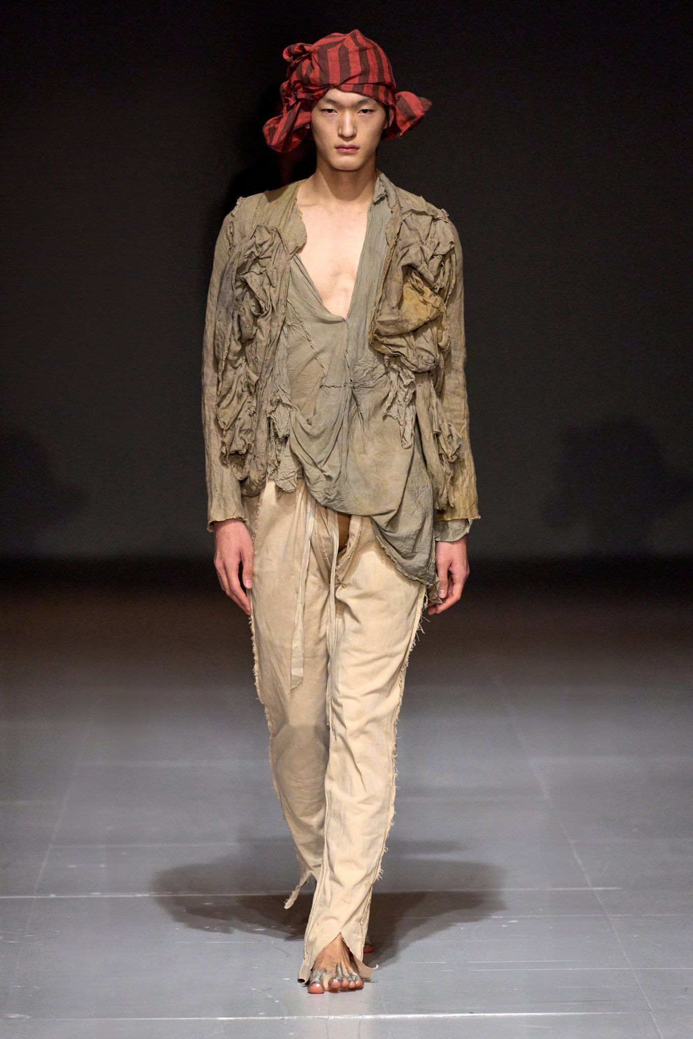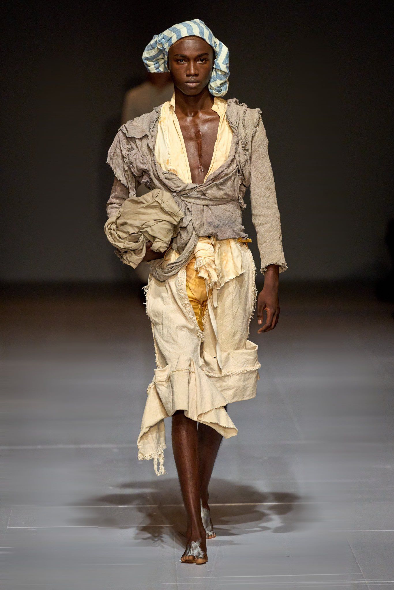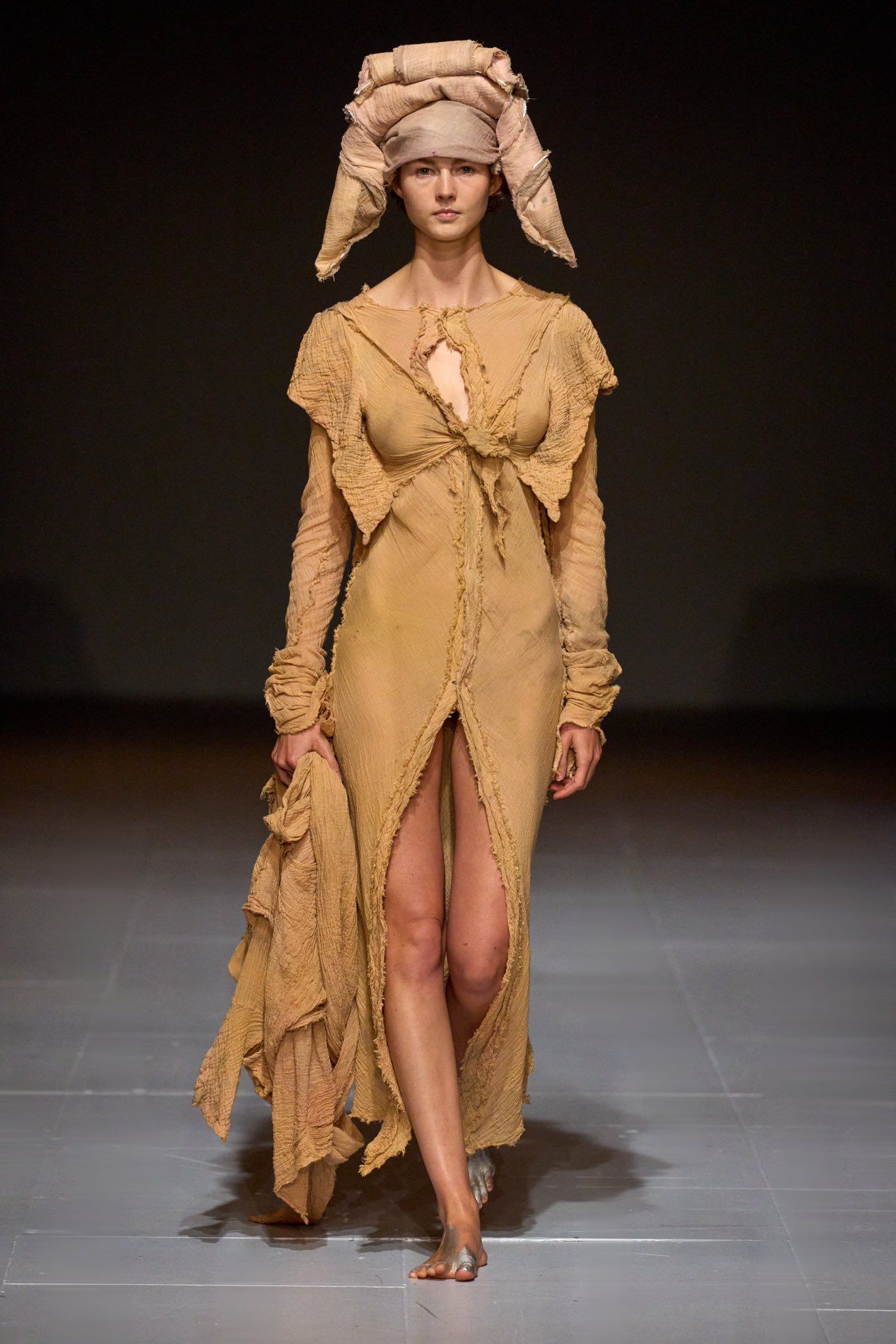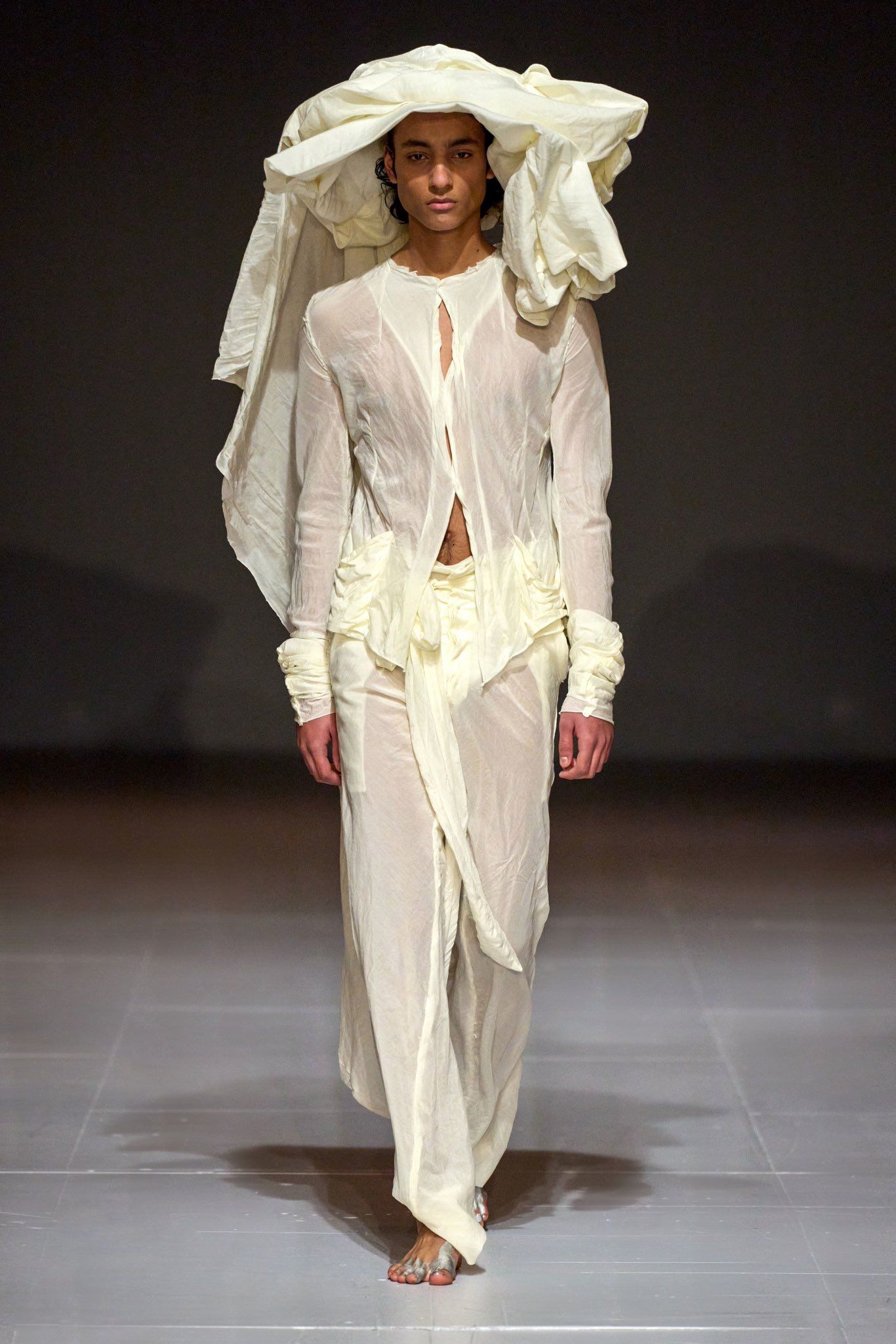 Il designer gallese Paolo Carzana presenzia alla London Fashion Week da appena due anni, ma il suo lavoro entra a pieno titolo nella lista di brand da tenere d’occhio durante la settimana della moda della capitale inglese. Anche in questa FW24, dal titolo Melanchronic Mountain, il focus principale è stato lo studio dei materiali organici per la produzione degli abiti, oltre che la scoperta di nuove forme e silhouette in un panorama artistico che spesso preferisce conformarsi. Presentando una collezione che riprende le palette dei pittori romantici, Carzana ha lavorato con materiali vegetali, riciclati, organici e tinture naturali portando infine in passerella trasparenze e ombre, stratificazioni e arricciature. Il verde militare e il kaki hanno lasciato traspirare un’estetica degna di Dune, mentre una scala di grigi ha evocato sia la texture che l’imperfezione della roccia.