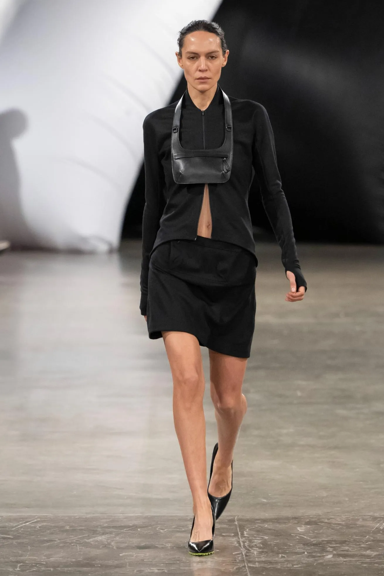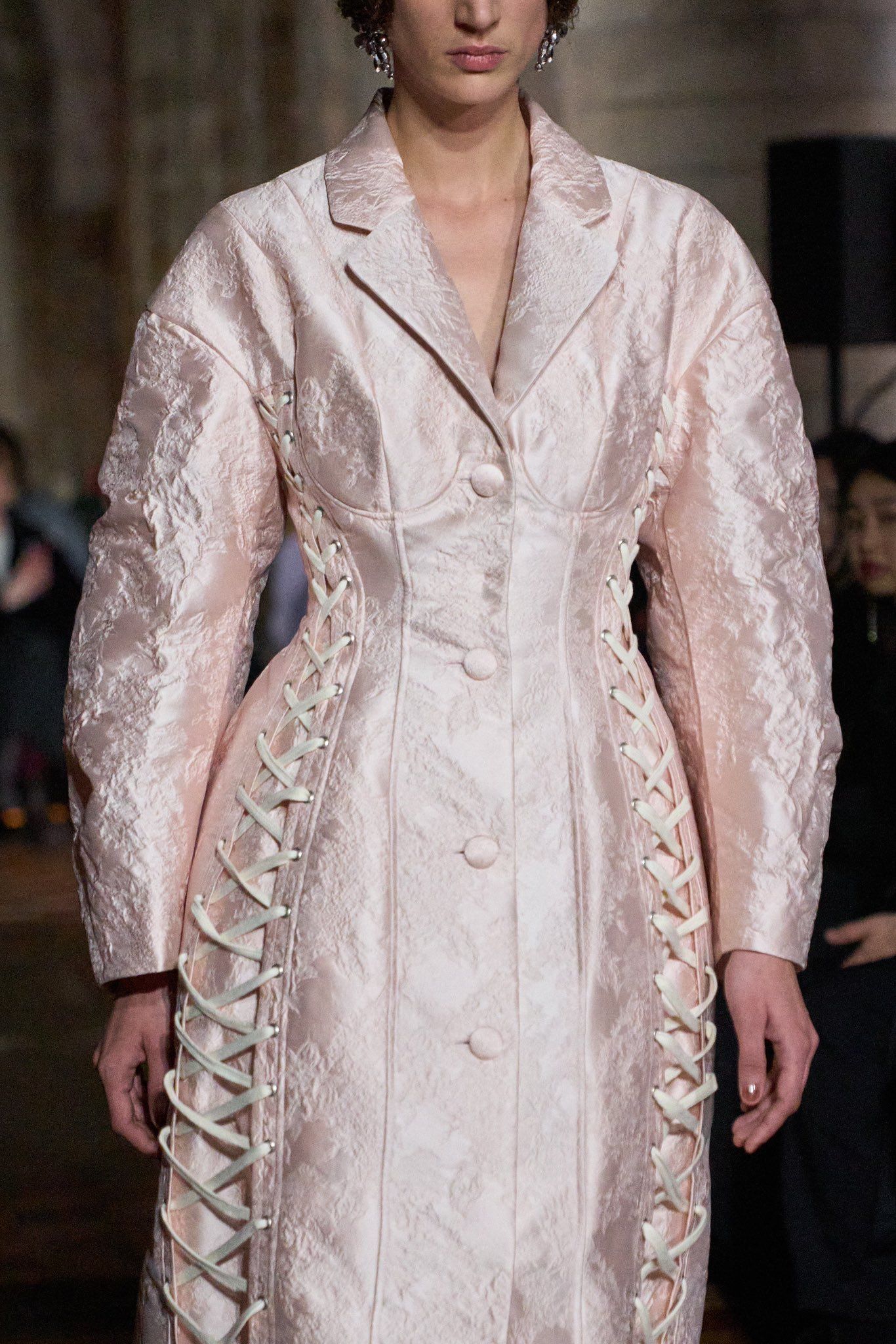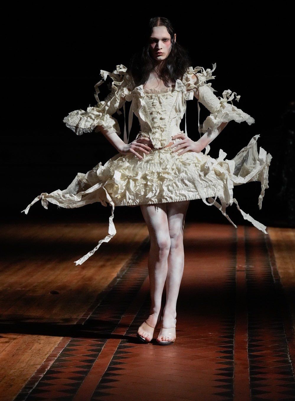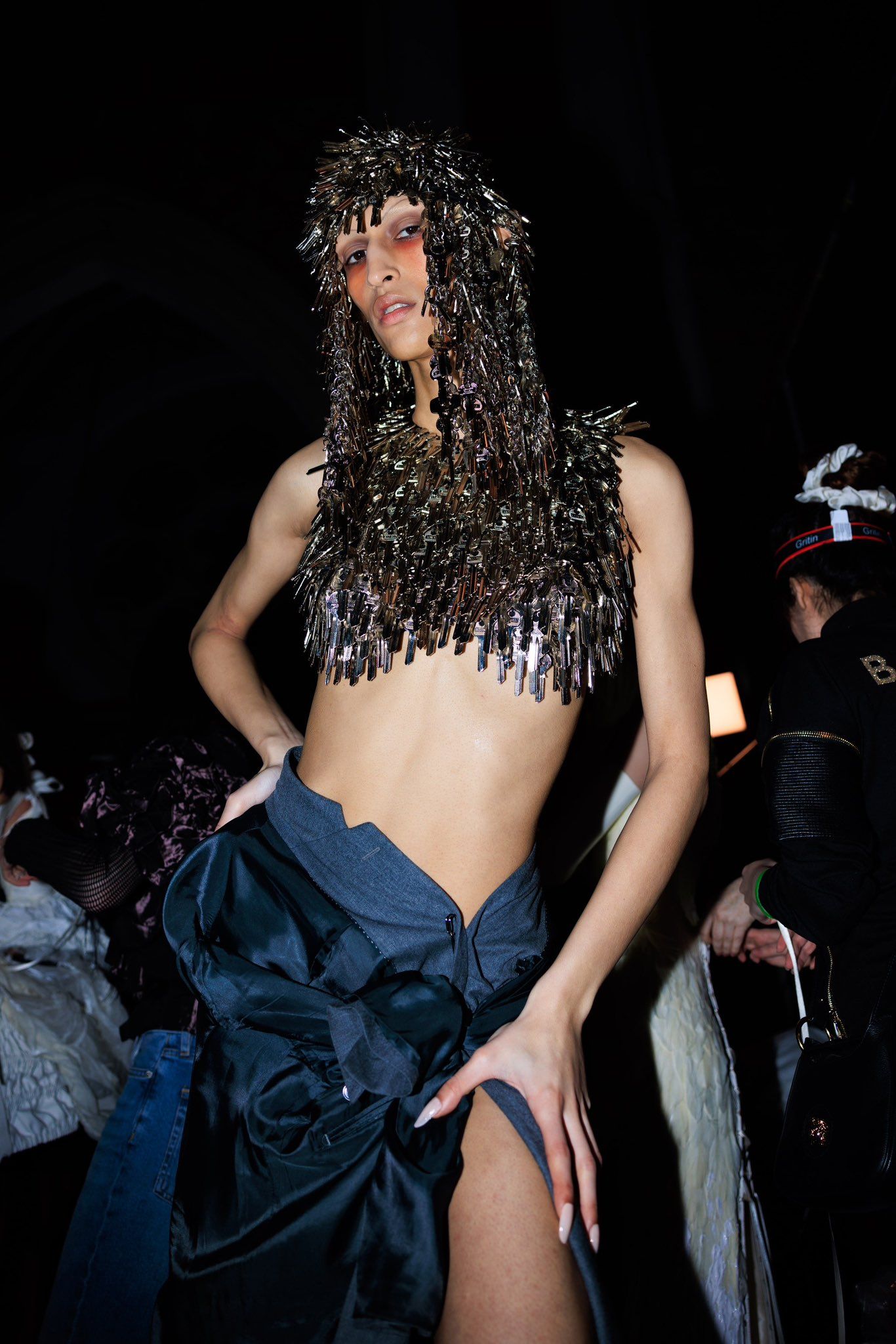 Usare femme fatale per descrivere la donna Dilara Findikoglu è diminutivo, ma è il primo termine che salta alla mente quando si osserva uno dei suoi show. Questo febbraio, la FW24 è stata presentata su uno sfondo buio, un setting che ha permesso ai dettagli in rilievo sugli abiti di farsi notare ancora di più. Come ha raccontato la stilista dopo lo show, la presentazione voleva mettere in scena un rituale per terminare la mascolinità tossica e andare oltre, creando un mondo lontano dalle norme politiche e dalla realtà. Ogni look esplorava un lato della mondanità, riscrivendone le regole: i completi da ufficio sono stati destrutturati e trasformati in abiti vittoriani, i corsetti e i guanti sono stati indossati come armatura, più che come accessorio sontuoso. Ai tropi del guardaroba maschile, dalle maglie da calcio alle sciarpe, sono stati aggiunti cinture, reggiseni a cono e corpetti. Il finale ha introdotto invece abiti creati con materiale appositamente irrigidito, a formare silhouette cristallizzate in aria, voluminose e fluide. Anche negli episodi di nudità, la collezione trasmetteva potenza e dominio, un senso di ferocia femminile che ha raggiunto il suo apice nei look che includevano corazze di piume argento e blu elettriche.