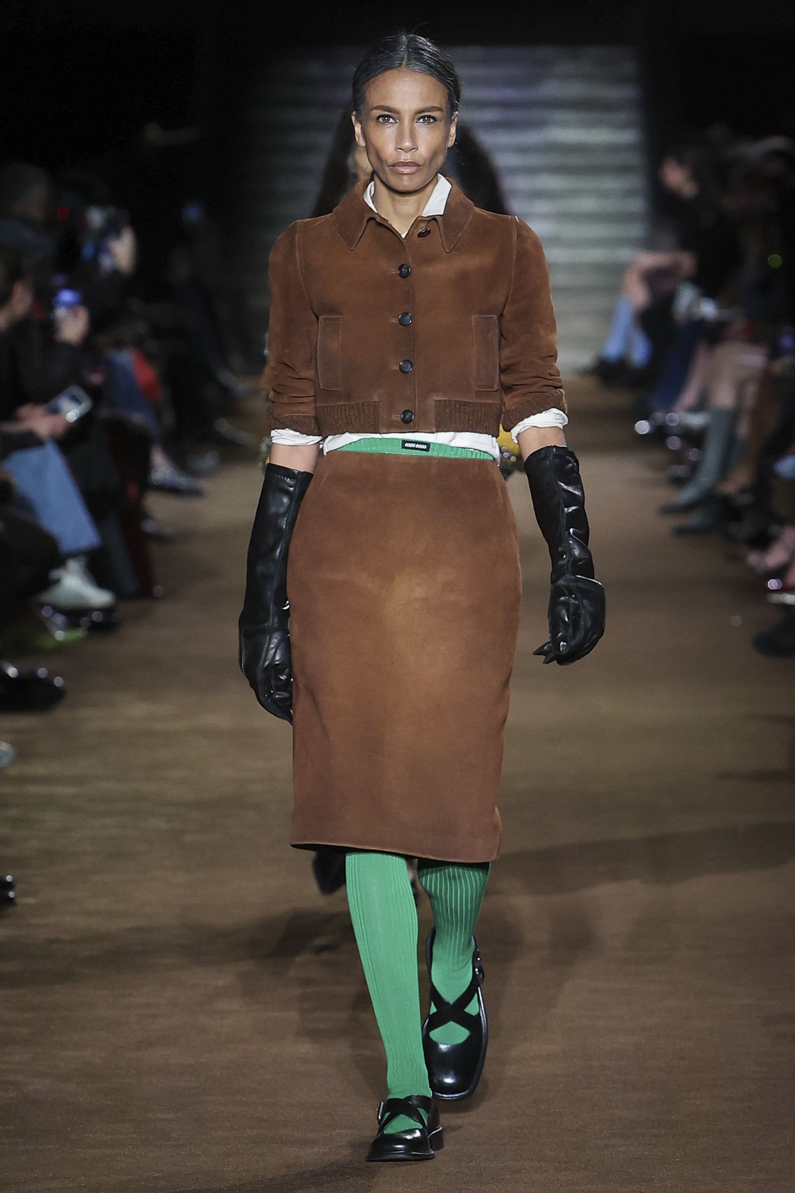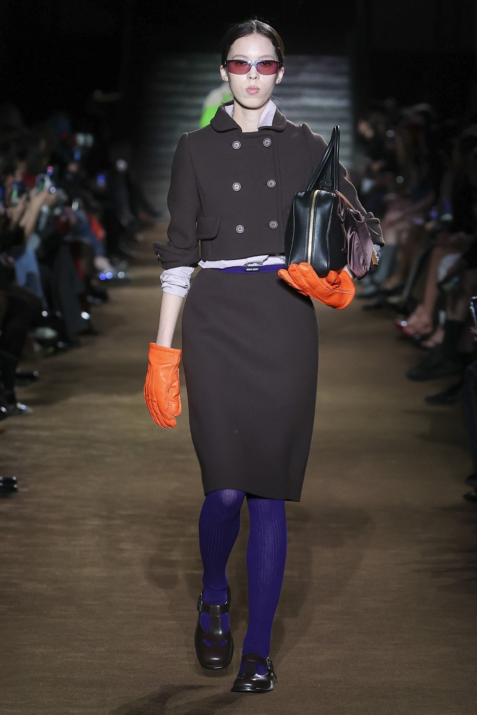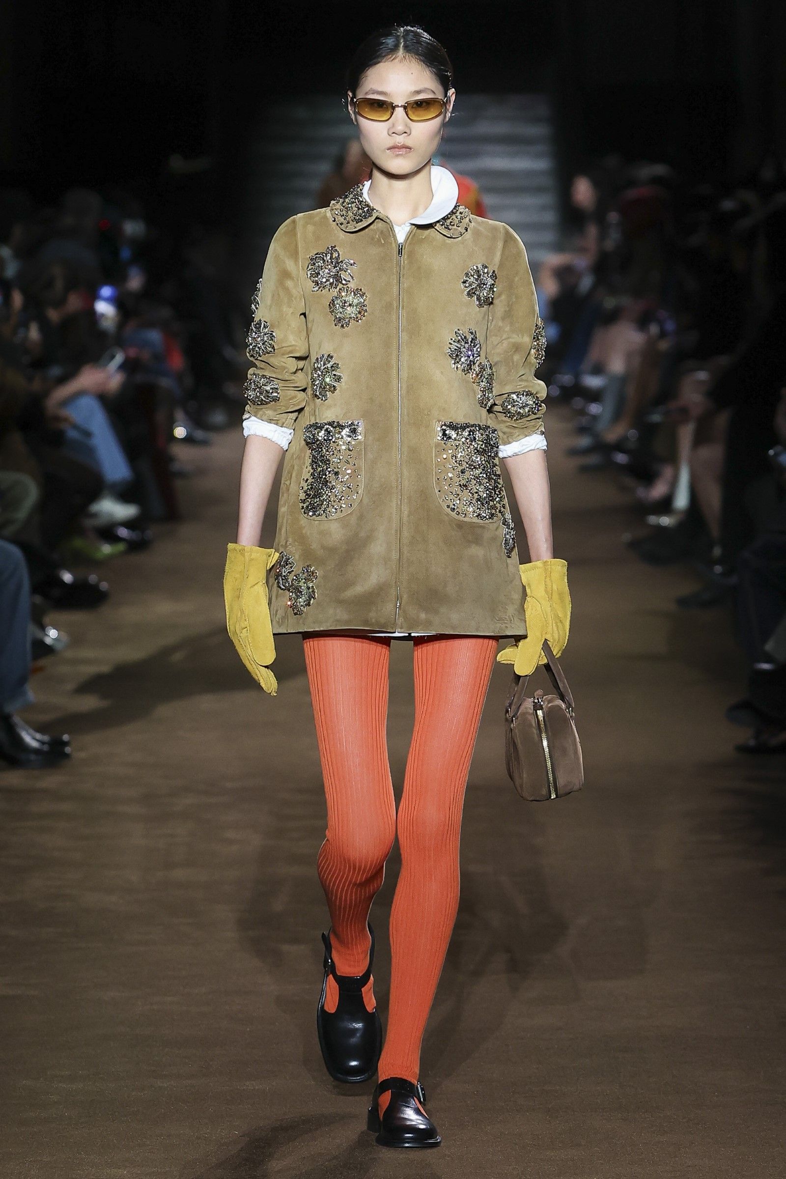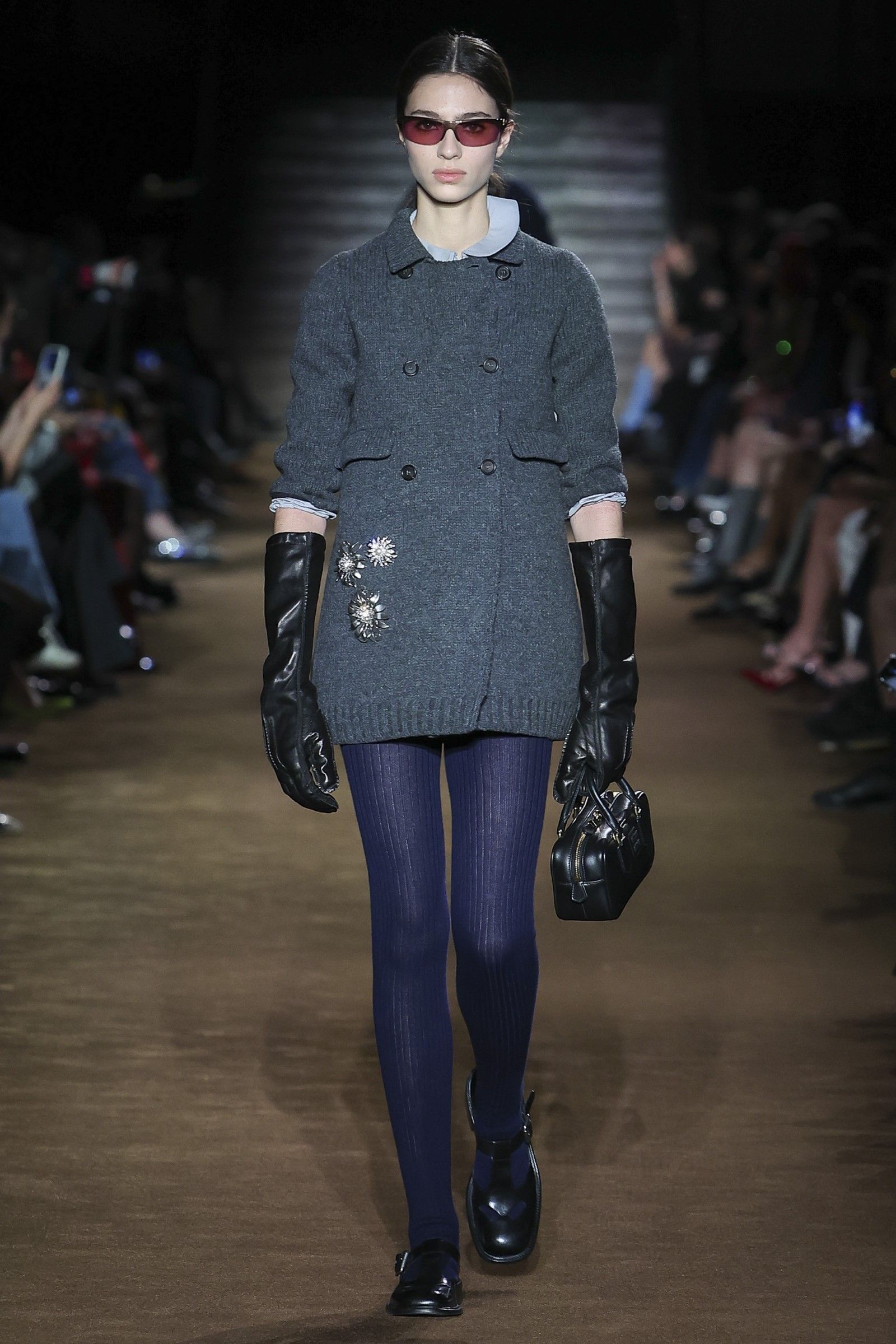 Quelli di Miu Miu sono dei Sixties alquanto post-moderni, dunque, ripensati e disciplinati nelle forme e i colori e soprattutto privati della loro originaria ingenuità per assumere un atteggiamento più deliberato. Un punto di vista che fa riconoscere, tra i diversi look, anche una forte vena anni ’90 che si materializza nella controllata palette di colori, nel piglio severo di giacche e camicie e nei nerissimi occhiali da sole. La giustapposizione di abiti di epoche e destinazioni diverse vuole rappresentare la tensione tra il passato e il presente che esiste nel ricordo di tutti: ci vestiamo da adulti con i gusti acquisiti da bambini. La donna Miu Miu (di “ragazza” e basta non si può parlare, tanto più che la passerella è stata graziata dalla mitica Kristin Scott-Thomas quest’anno oltre che Angela Molina e altre modelle più mature) è ribelle ma con comodo: se anche il suo outfit riposa sui classici tropi borghesi del vestire, c’è sempre un elemento che rompe e anima l’ordine, come in questo caso gli stivaloni e guantoni da portiere indossati con gonnelle e tailleur oppure il colletto scombinato della camicia che sbuca fuori dal cappotto in uno sversamento di perle; ma si presenta il caso contrario in cui, cioè, un outfit più sportivo o dimesso trova il proprio guizzo in un elemento più signorile come la pelliccia.