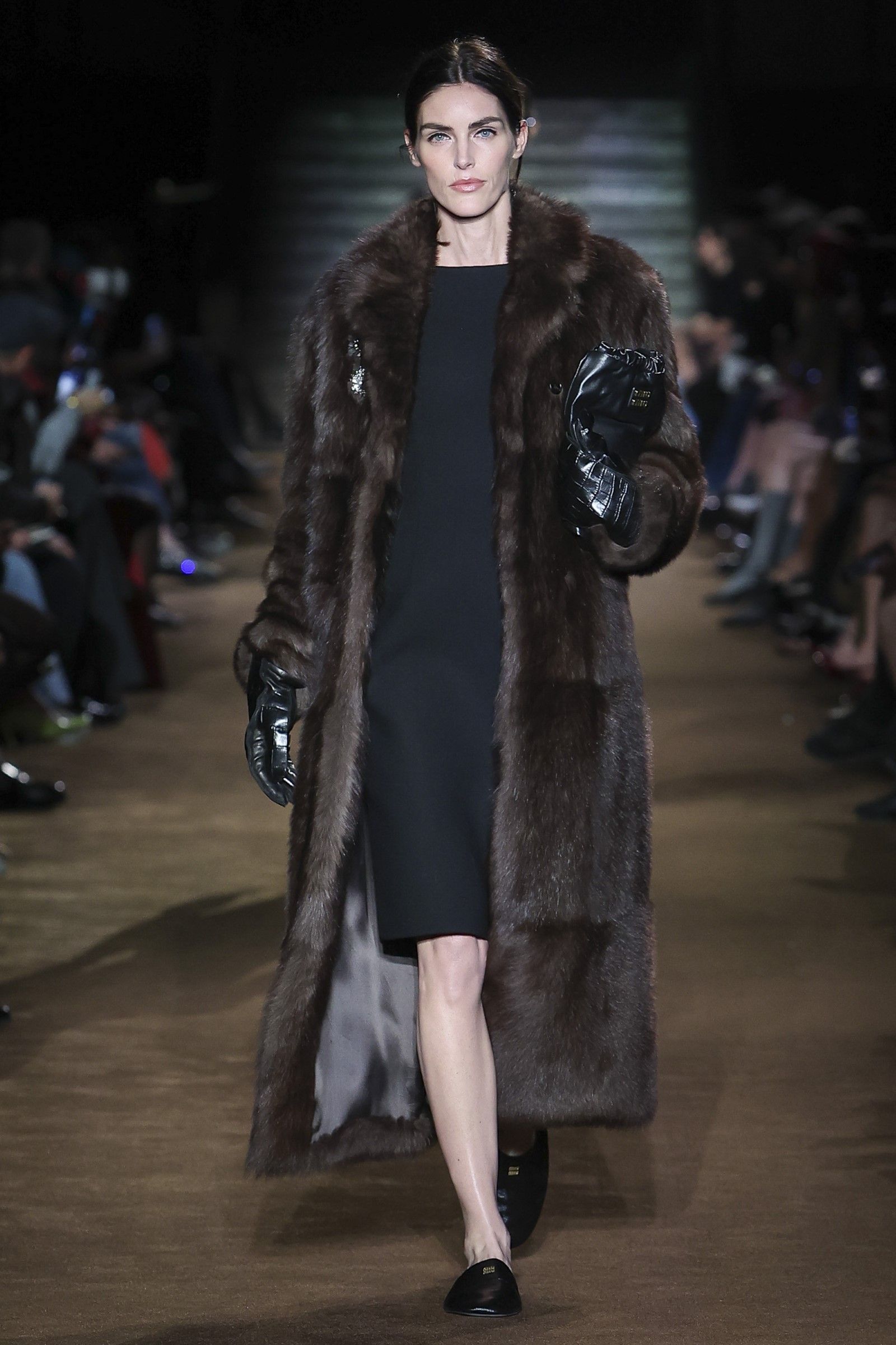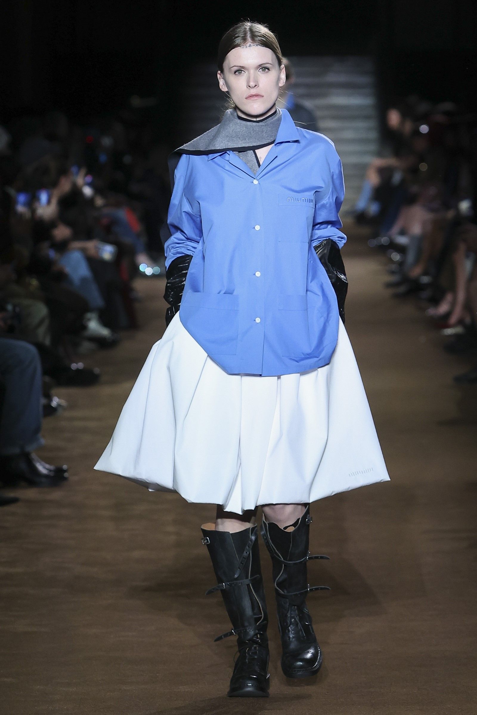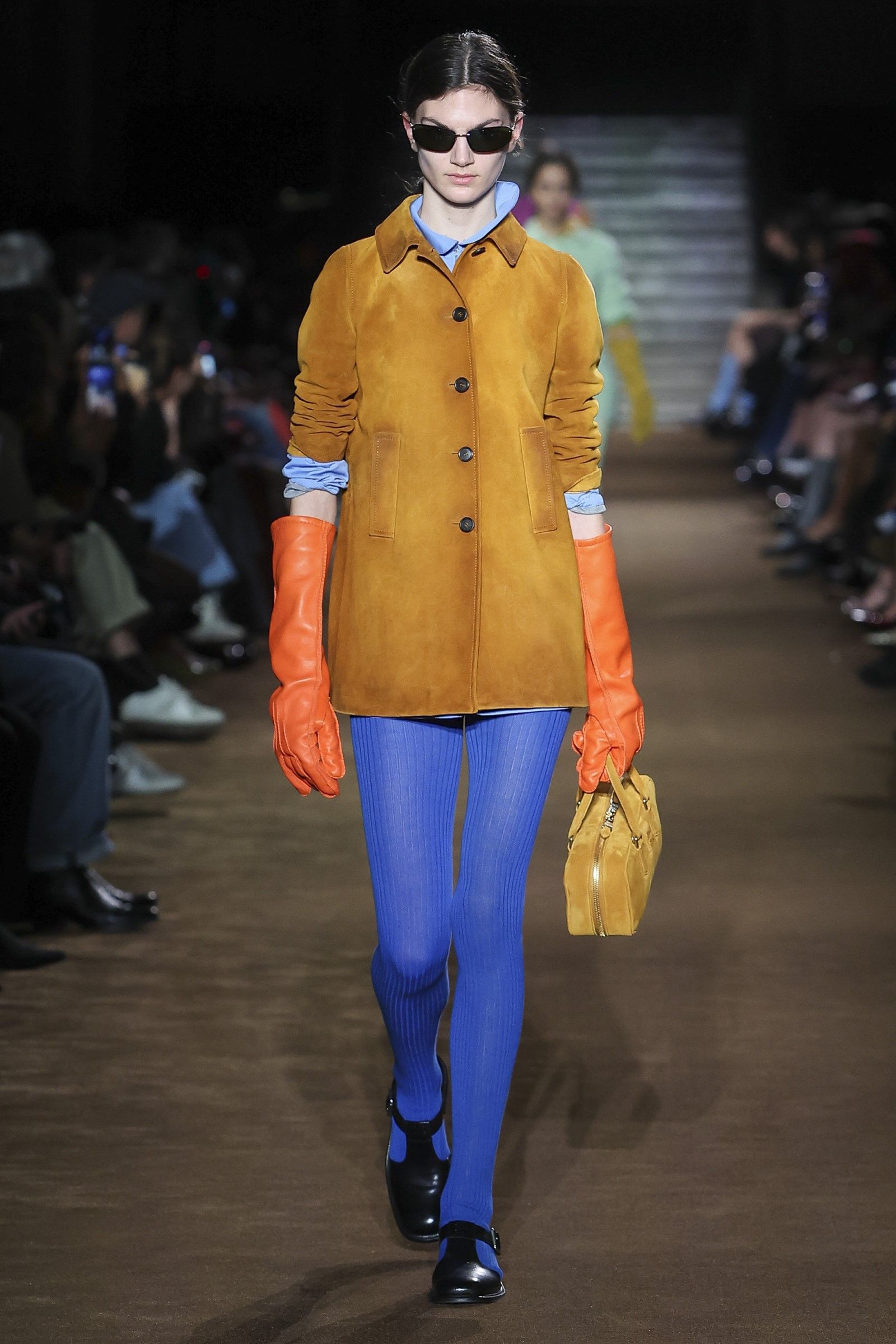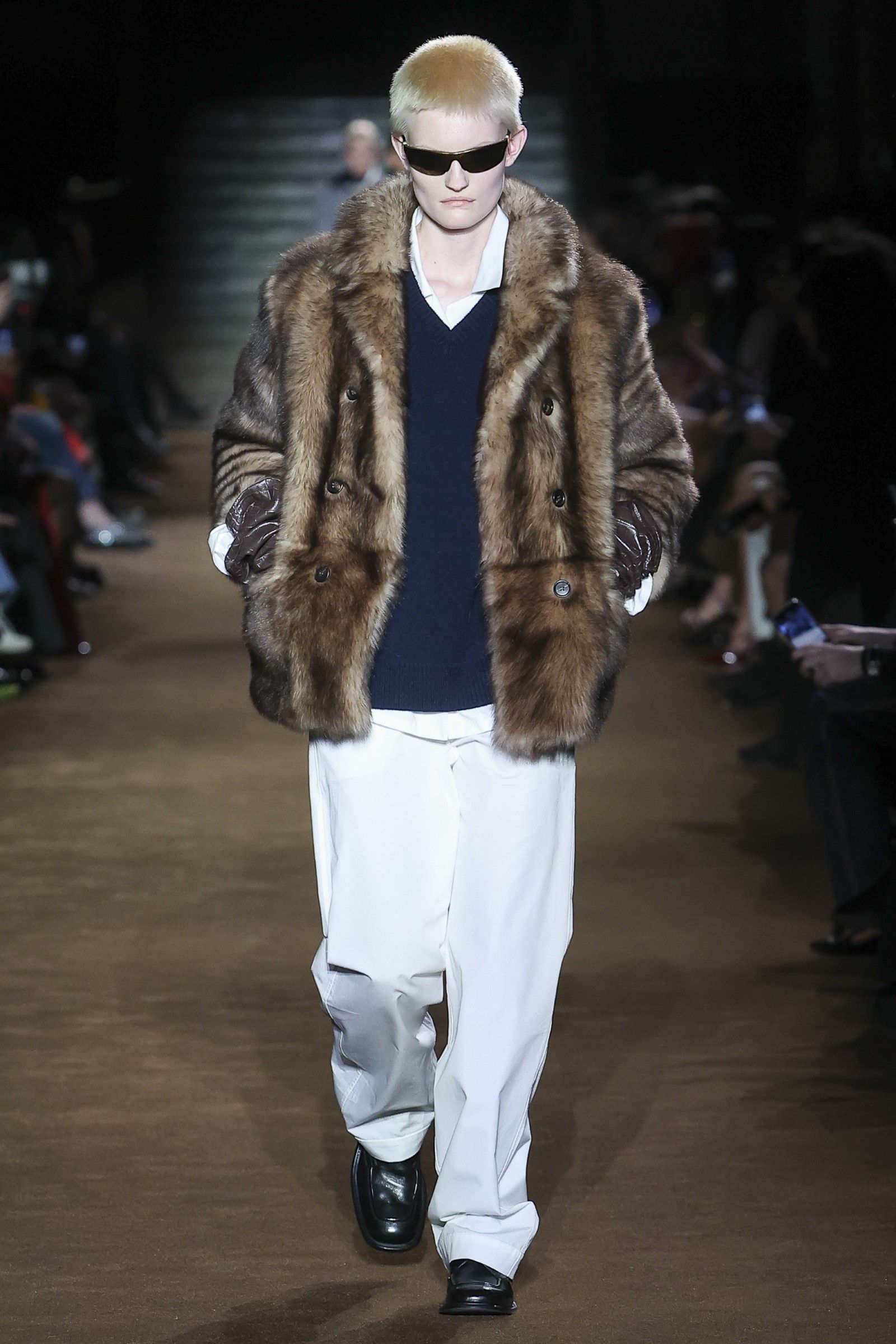 Quelli di Miu Miu sono dei Sixties alquanto post-moderni, dunque, ripensati e disciplinati nelle forme e i colori e soprattutto privati della loro originaria ingenuità per assumere un atteggiamento più deliberato. Un punto di vista che fa riconoscere, tra i diversi look, anche una forte vena anni ’90 che si materializza nella controllata palette di colori, nel piglio severo di giacche e camicie e nei nerissimi occhiali da sole. La giustapposizione di abiti di epoche e destinazioni diverse vuole rappresentare la tensione tra il passato e il presente che esiste nel ricordo di tutti: ci vestiamo da adulti con i gusti acquisiti da bambini. La donna Miu Miu (di “ragazza” e basta non si può parlare, tanto più che la passerella è stata graziata dalla mitica Kristin Scott-Thomas quest’anno oltre che Angela Molina e altre modelle più mature) è ribelle ma con comodo: se anche il suo outfit riposa sui classici tropi borghesi del vestire, c’è sempre un elemento che rompe e anima l’ordine, come in questo caso gli stivaloni e guantoni da portiere indossati con gonnelle e tailleur oppure il colletto scombinato della camicia che sbuca fuori dal cappotto in uno sversamento di perle; ma si presenta il caso contrario in cui, cioè, un outfit più sportivo o dimesso trova il proprio guizzo in un elemento più signorile come la pelliccia.