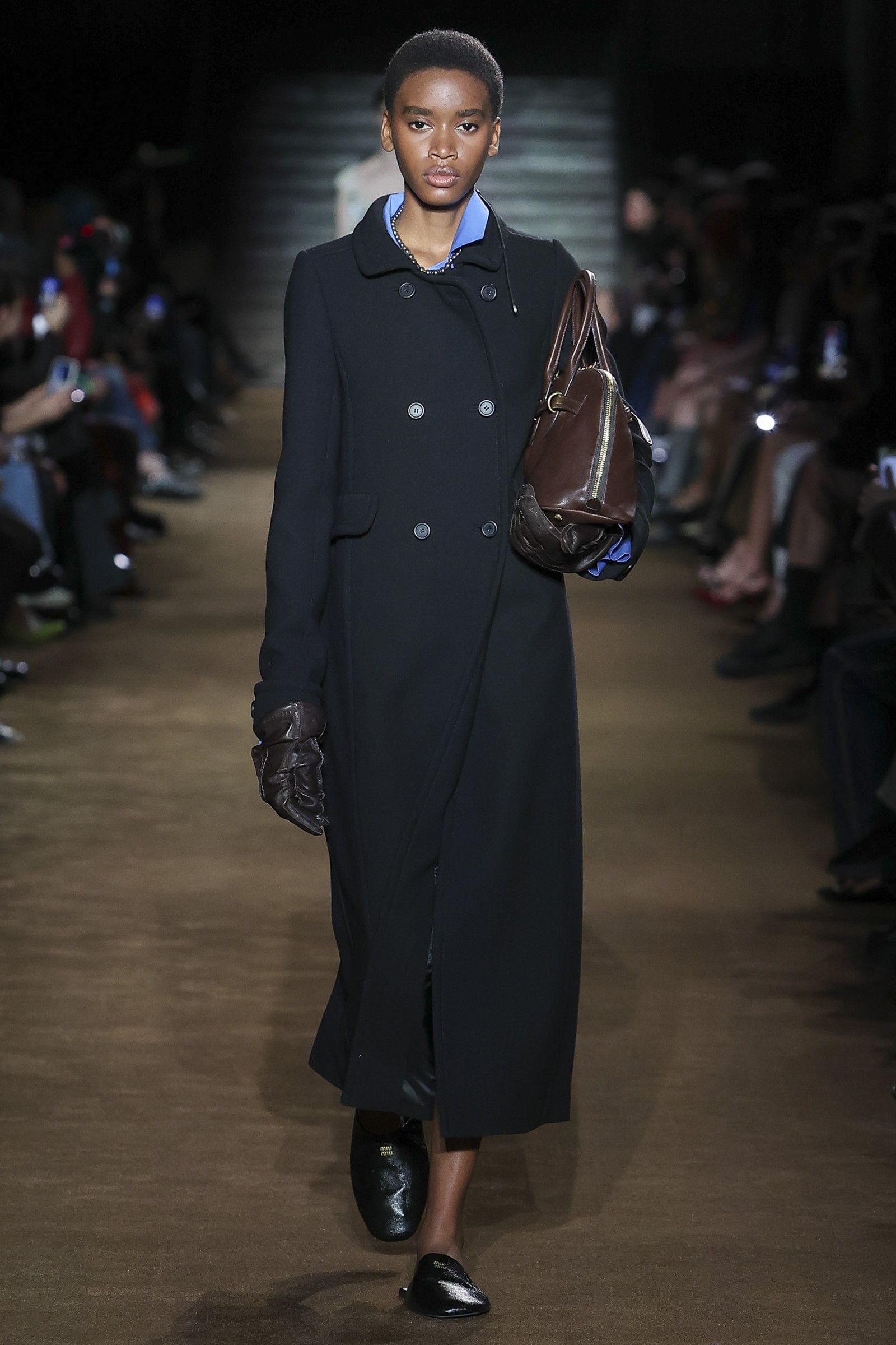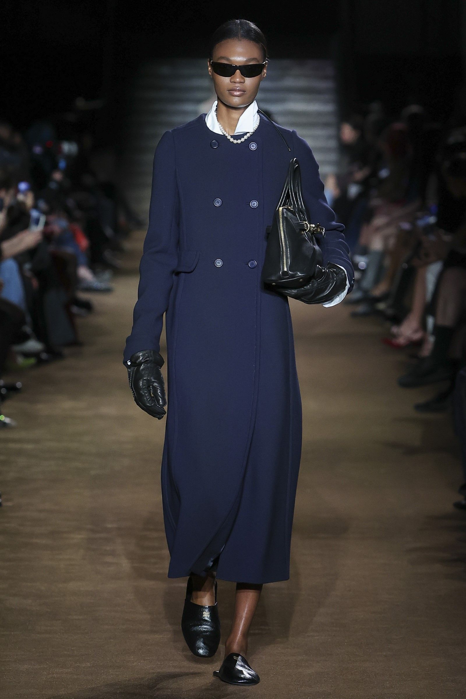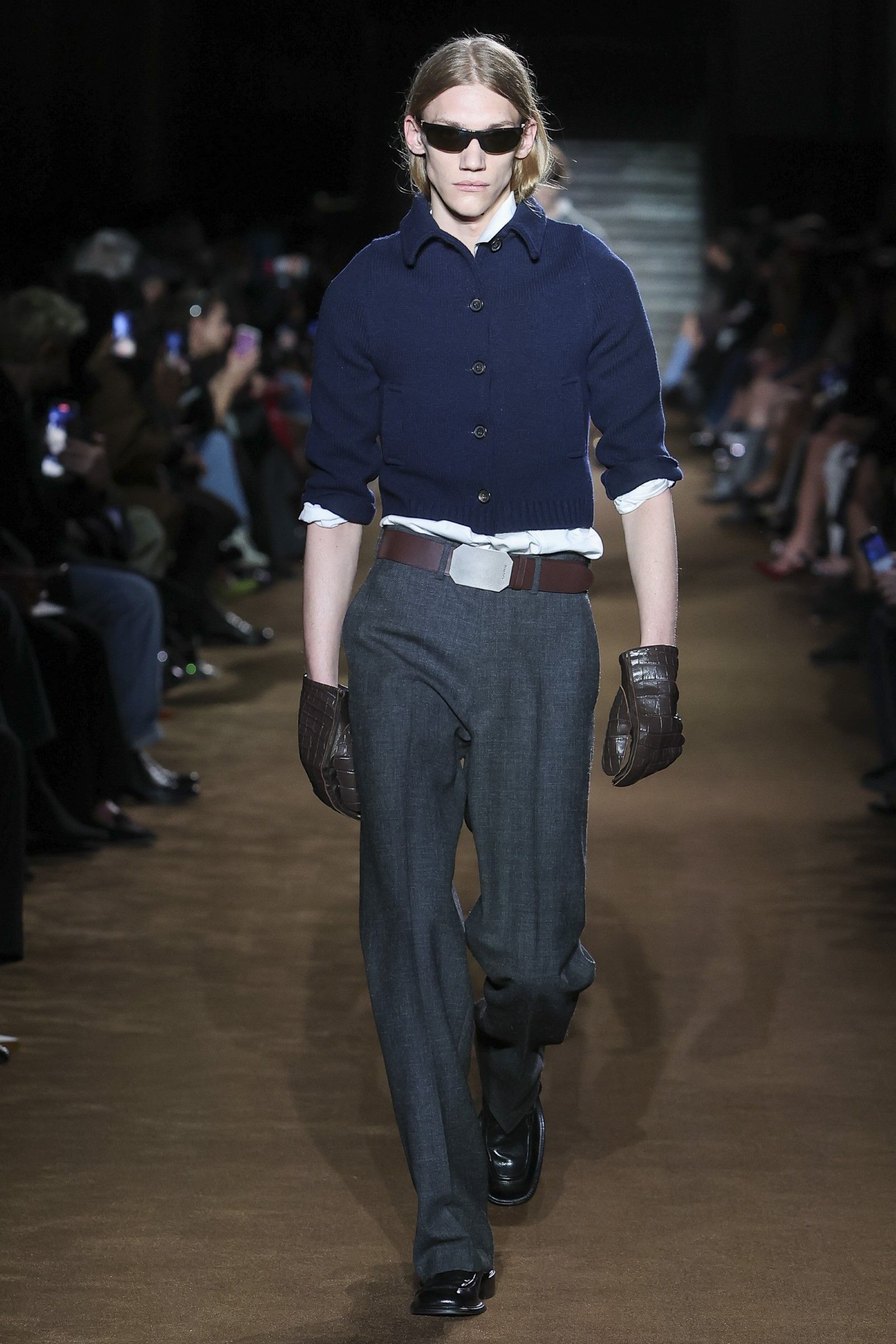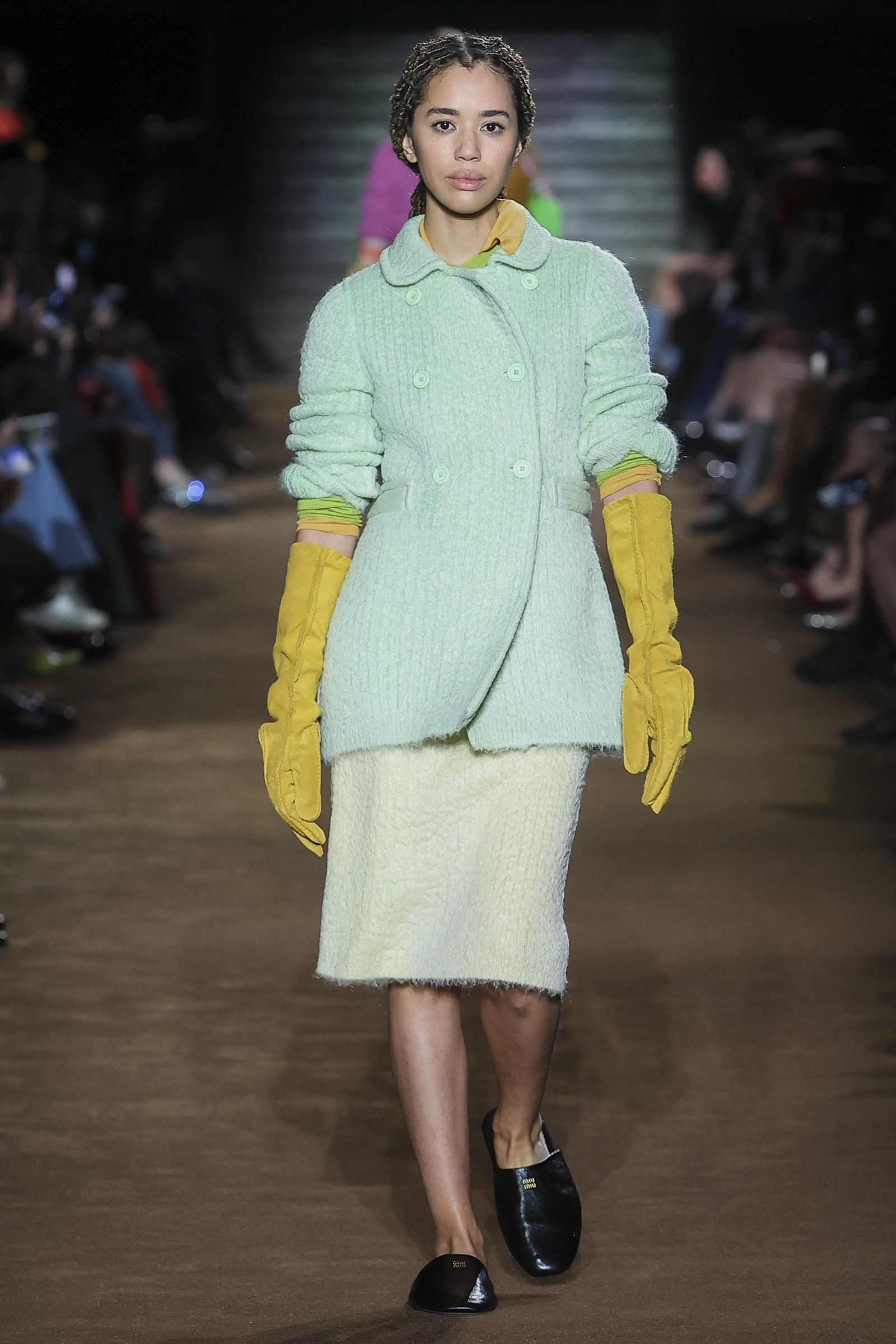 Quelli di Miu Miu sono dei Sixties alquanto post-moderni, dunque, ripensati e disciplinati nelle forme e i colori e soprattutto privati della loro originaria ingenuità per assumere un atteggiamento più deliberato. Un punto di vista che fa riconoscere, tra i diversi look, anche una forte vena anni ’90 che si materializza nella controllata palette di colori, nel piglio severo di giacche e camicie e nei nerissimi occhiali da sole. La giustapposizione di abiti di epoche e destinazioni diverse vuole rappresentare la tensione tra il passato e il presente che esiste nel ricordo di tutti: ci vestiamo da adulti con i gusti acquisiti da bambini. La donna Miu Miu (di “ragazza” e basta non si può parlare, tanto più che la passerella è stata graziata dalla mitica Kristin Scott-Thomas quest’anno oltre che Angela Molina e altre modelle più mature) è ribelle ma con comodo: se anche il suo outfit riposa sui classici tropi borghesi del vestire, c’è sempre un elemento che rompe e anima l’ordine, come in questo caso gli stivaloni e guantoni da portiere indossati con gonnelle e tailleur oppure il colletto scombinato della camicia che sbuca fuori dal cappotto in uno sversamento di perle; ma si presenta il caso contrario in cui, cioè, un outfit più sportivo o dimesso trova il proprio guizzo in un elemento più signorile come la pelliccia.