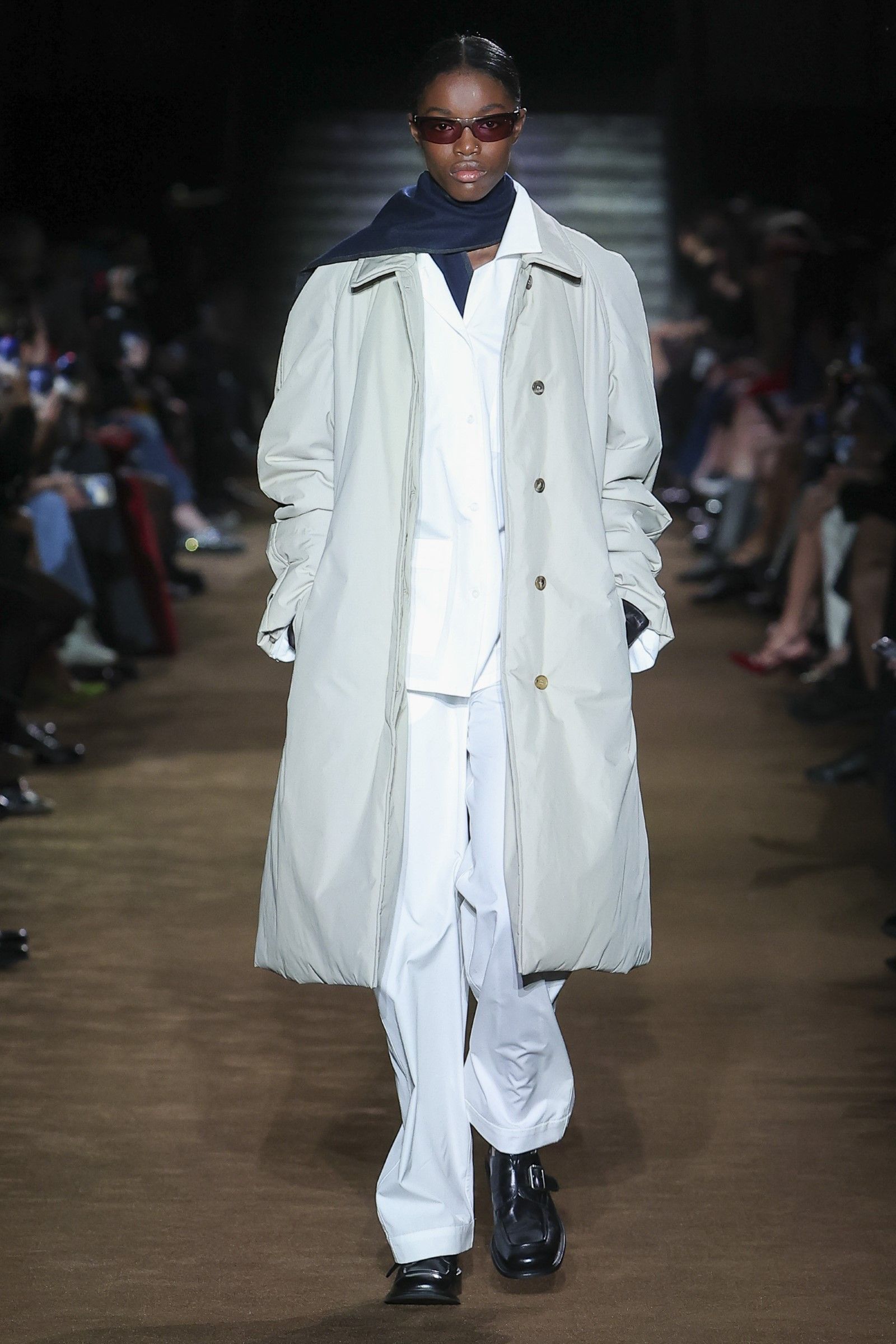 Altrove, la partita si gioca sulla lunghezza delle giacche: quelle cortissime sono elemento decorativo per l’alternanza di colori e texture che offrono insieme ai bottom e alle camicie sottostanti; quelle semi-lunghe diventano una specie di cocktail dress da cui spuntano gambe fasciate in collant colorati. Non mancano nemmeno dei tubini di raso color champagne deliziosamente stropicciato, la cui leggerezza contrasta con guanti, sciarpe e occhiali, che rappresentano quasi il tipo di forza che viene dalla protezione; e tocchi maliziosi tanto nei tubini neri, in cui un cut-out si apre appena sopra il fondoschiena, che nei pantaloni cuciti nella stessa popeline di cotone delle camicie diventando una specie di mistura di divisa o pigiama le cui generose proporzioni suggeriscono la praticità cool di chi sceglie un funzionale minimalismo per i propri outfit e lascia parlare di estro gli accessori. Tanti elementi che coesistono simultaneamente nella dimensione personale di ciascuno proprio come i ricordi d'infanzia e le consapevolezze dell'età adulta risuonano dentro ognuno di noi - a unirle tutte il fil rouge dell'identità.