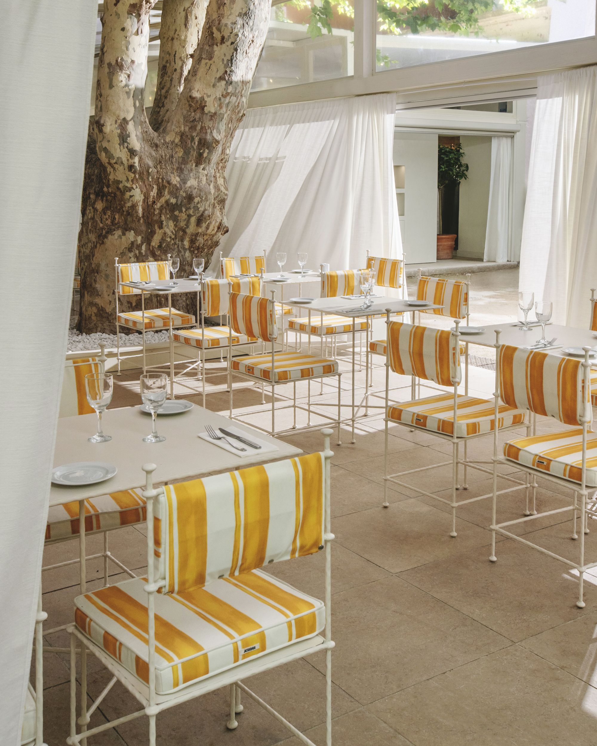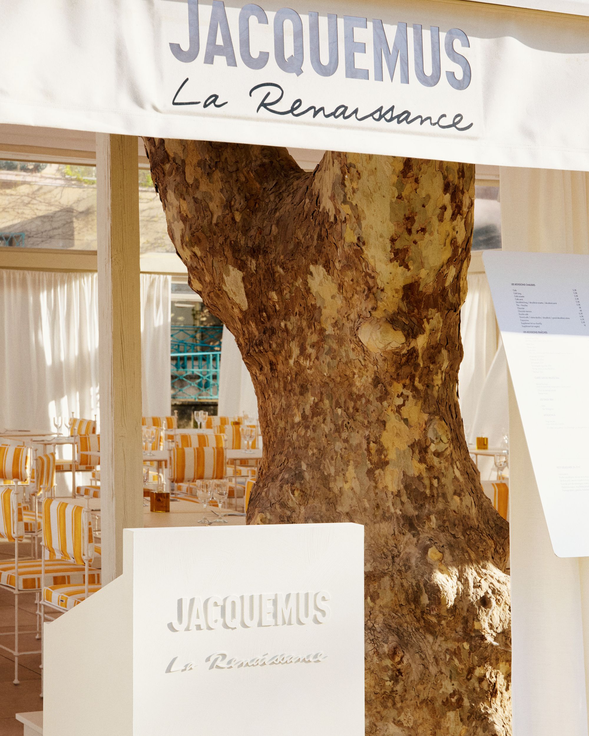 The historical café « la renaissance » , BRASSERIE and theater, located in the heart of Saint-Tropez, was redecorated by Jacquemus, with solar colors, minimal lines and its classic signature yellow stripes. Jacquemus proposed a design reshape of the space including a new food and beverage menu, refreshed weekly. The menu of the restaurant is signed by the Chef Ella Affalo and elaborated by the Chef Ana Maria Cadena EXCLUSIVELY FOR THE CAFÉ. The chairs and tables are redesigned with the brand’s signature yellow stripes, with a playful window display with exclusive local merchandising including a petanque bowl set, beach rackets, dominos, game cards, travel mugs, magnets and postal cards, all designed by Jacquemus.