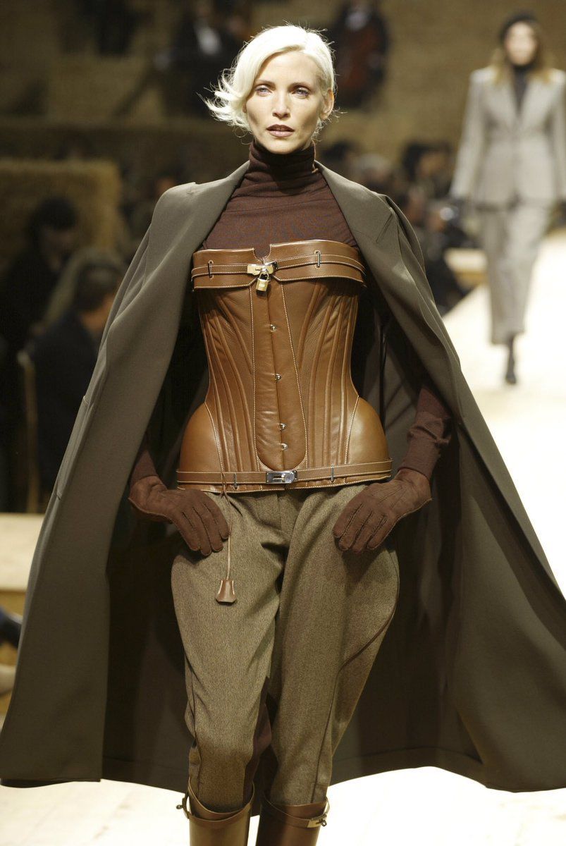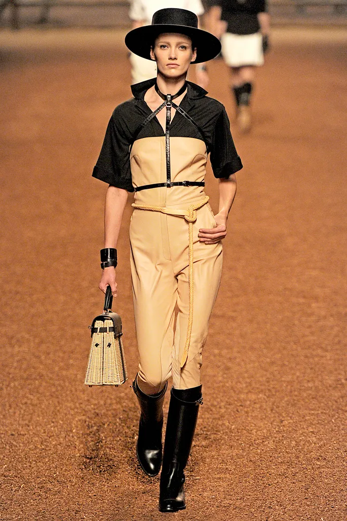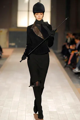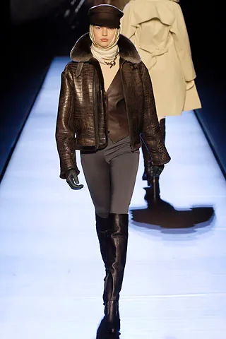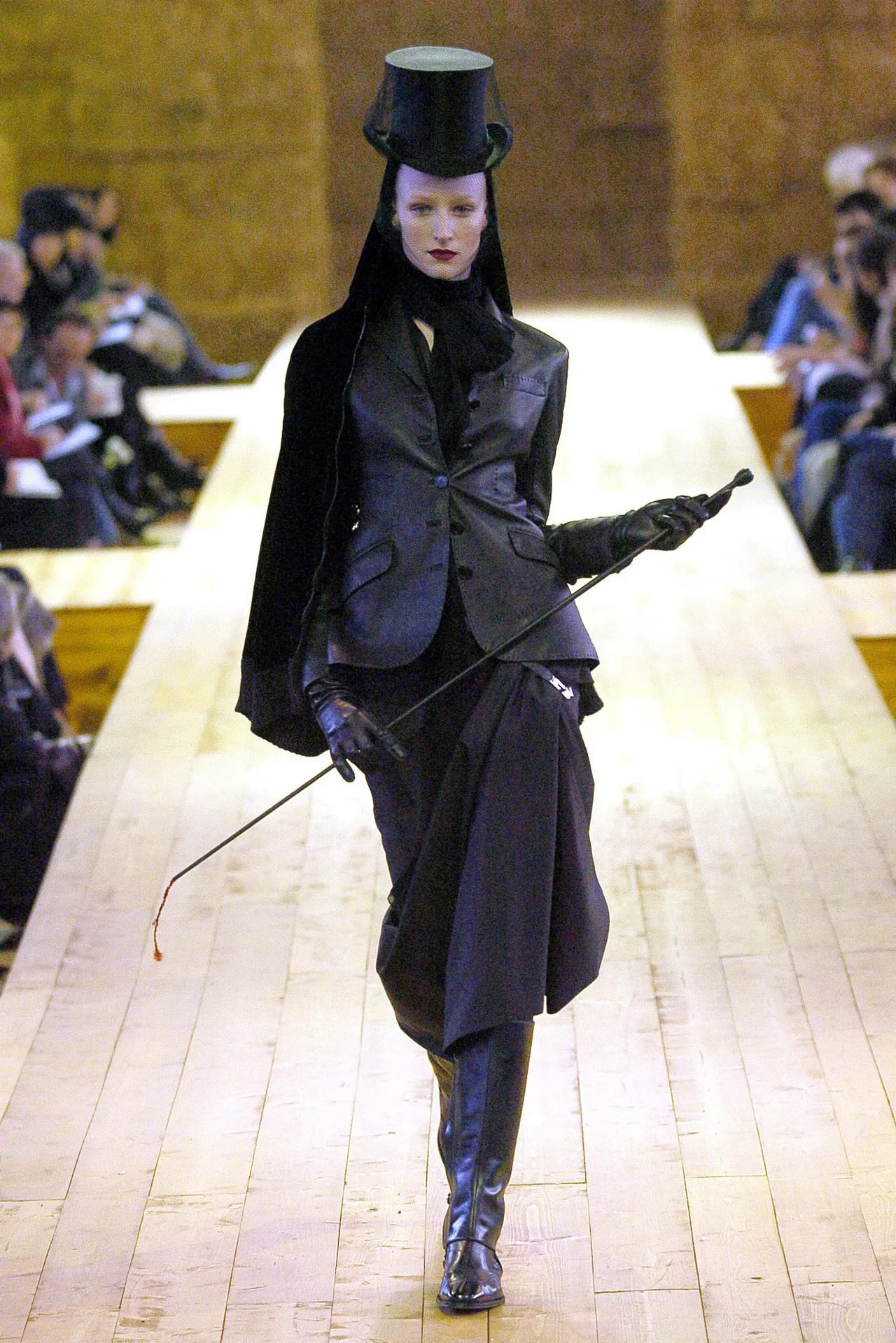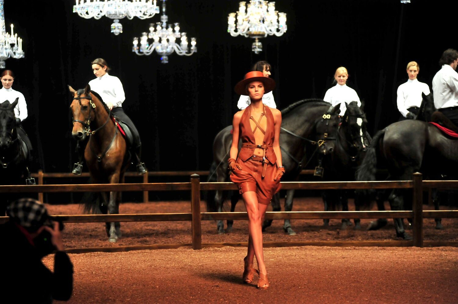 Lou Doillon con una giacca di pelle, abbigliamento da cavallerizza contornato da una chioma voluminosa portata al naturale e un frustino alla mano: la FW04 di Hermès fotografava l’indole caotica e indisciplinata di un creativo largamente acclamato dalla critica alle prese con la dimensione granitica del lusso di Hermès. Su balle di fieno disposte lungo il campo di addestramento equestre dell'Ècole Militaire il pubblico interagiva con cappelli a cilindro, frustini, tenute da cavallerizze, gonne in pelle scamosciate fino al ginocchio, cardigan con colletti di pelliccia rimovibili e sciarpe con frange così lunghe da diventare cappotti lussuosi. L’arancio, il colore distintivo del marchio, era stato sconsacrato su giacche sportive o outerwear più dismesso. Il match Gaultier-Hermés gioca su un precario equilibrio tra opposti che cerca un’area di convergenza tra la verve calda e massimalista del primo e la palette neutrale del secondo. Intersezione che, con la collezione FW07, raggiunge una piena maturità sotto forma di bomber e giacche nere in pelle di coccodrillo, gonne a matita con rouches, berretti da motociclista, completi in tweed marroni, abiti in maglia in tonalità autunnali e persino smoking da uomo prestati ad una dandy declinata al femminile - il tono più teatrale e drammatico di Gaultier convive con la meticolosità che richiede la confezione di un prodotto di lusso. L’immaginario di Hermès, già precedentemente segnato dalla visione e dai layering privi di logo di Martin Margiela, si carica di una sensualità e una velata dose di ironia estranea alla narrativa del brand che Gaultier porterà in passerella fino all’ultima collezione per Hermès, la SS11. «Gaultier saluta Hermès con la cavallerizza andalusa» titola uno degli articoli che il web restituisce cercando testimonianze sull’operato del designer nel territorio della maison del lusso per antonomasia. Tute di pelle nera, pantaloni stretti e avvitati, una parata di stivali da cavallo color burro e abiti in maglia stretti da bustini di lucertola verniciata portate in un vero maneggio: con veri cavalli e cavalieri da sfondo, lo show ha chiuso in pompa magna la saga di Gaultier da Hermès.