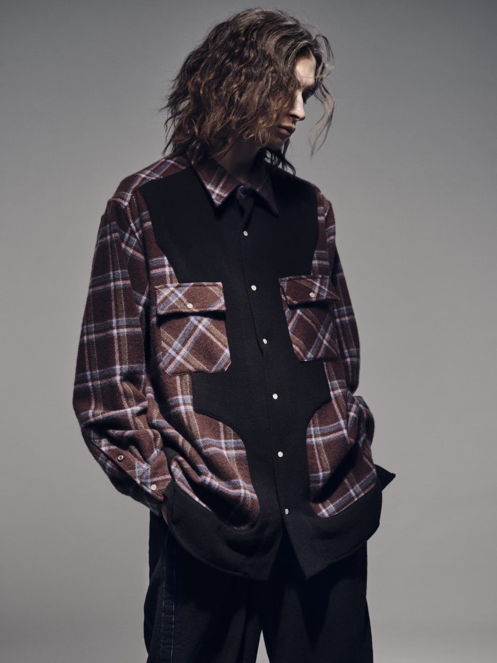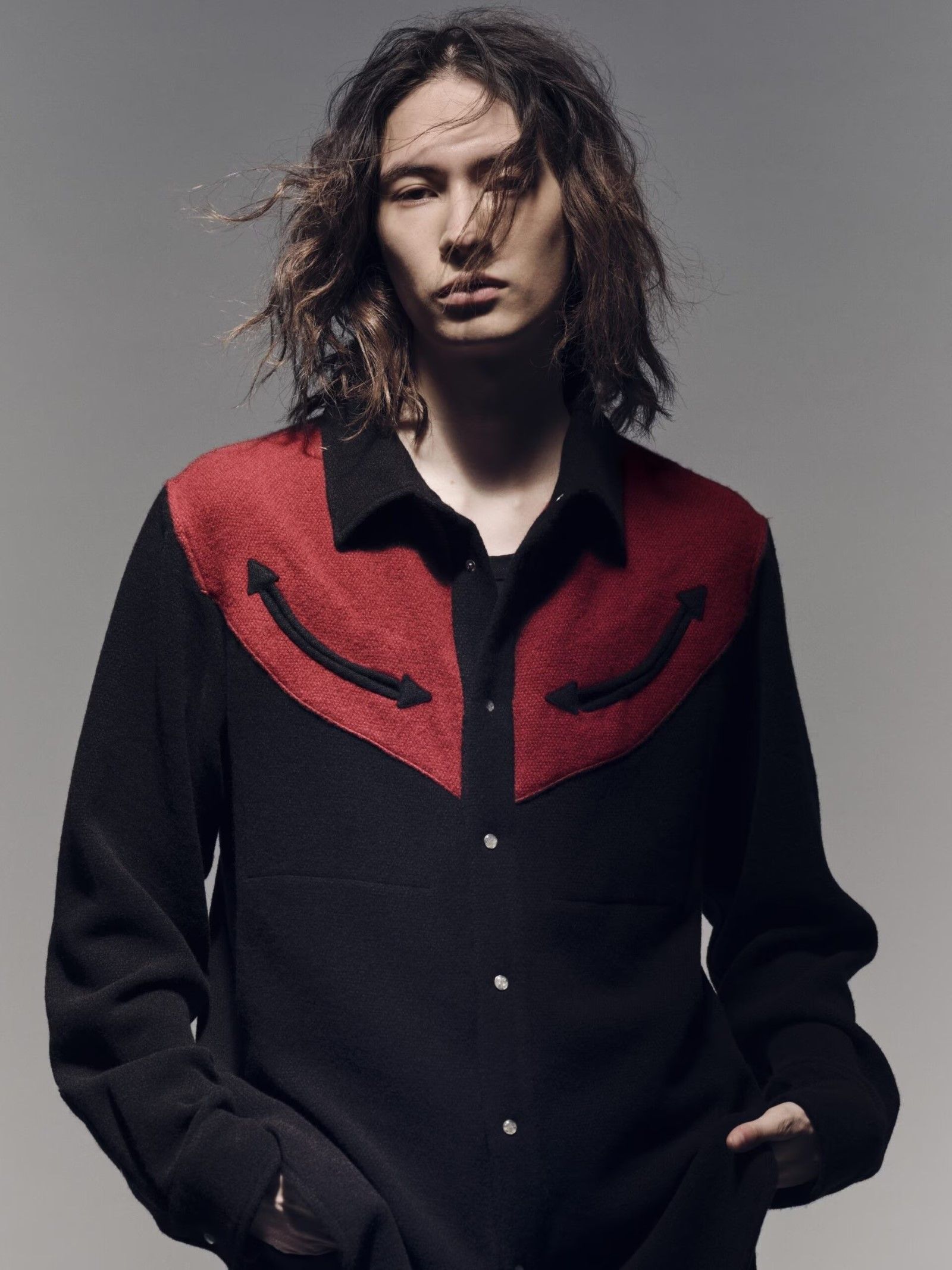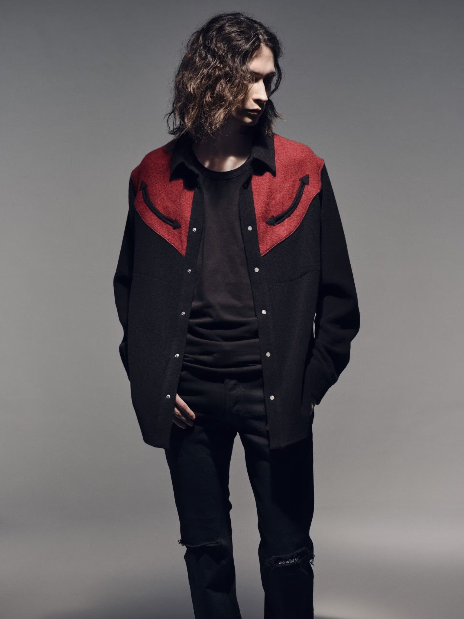 La prima camicia, più aderente, è una reinterpretazione dei pattern di God’s True Cashmere, e riproduce il design di una classica camicia da rodeo nei due colori borgogna e nero, adornata con 11 bottoni di pietre semipreziose (in questo caso pietra di sole o eliolite) posizionati strategicamente per allinearsi ai sette chakra del portatore – una delle firme di God’s True Cashmere, che adorna di bottoni-gioiello tutti quanti i propri prodotti. La seconda camicia, che invece ha un fit più ampio, è costruita con diversi pannelli neri oppure ricoperti da un pattern a quadri. Entrambe le camicie sono realizzate interamente in Italia e sono state prodotte in edizione limitata – il che giustifica anche il loro prezzo non bassissimo di 2800 dollari.