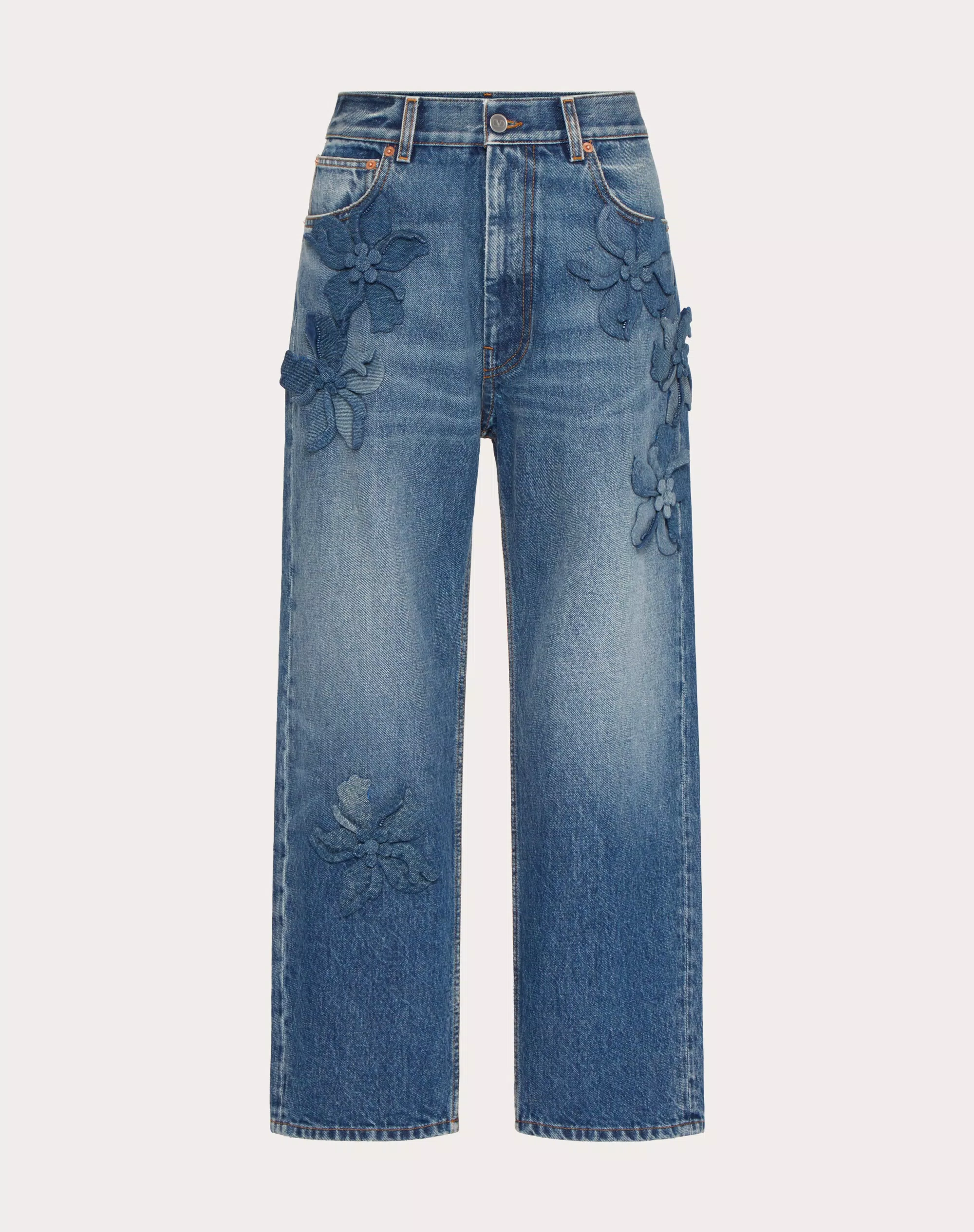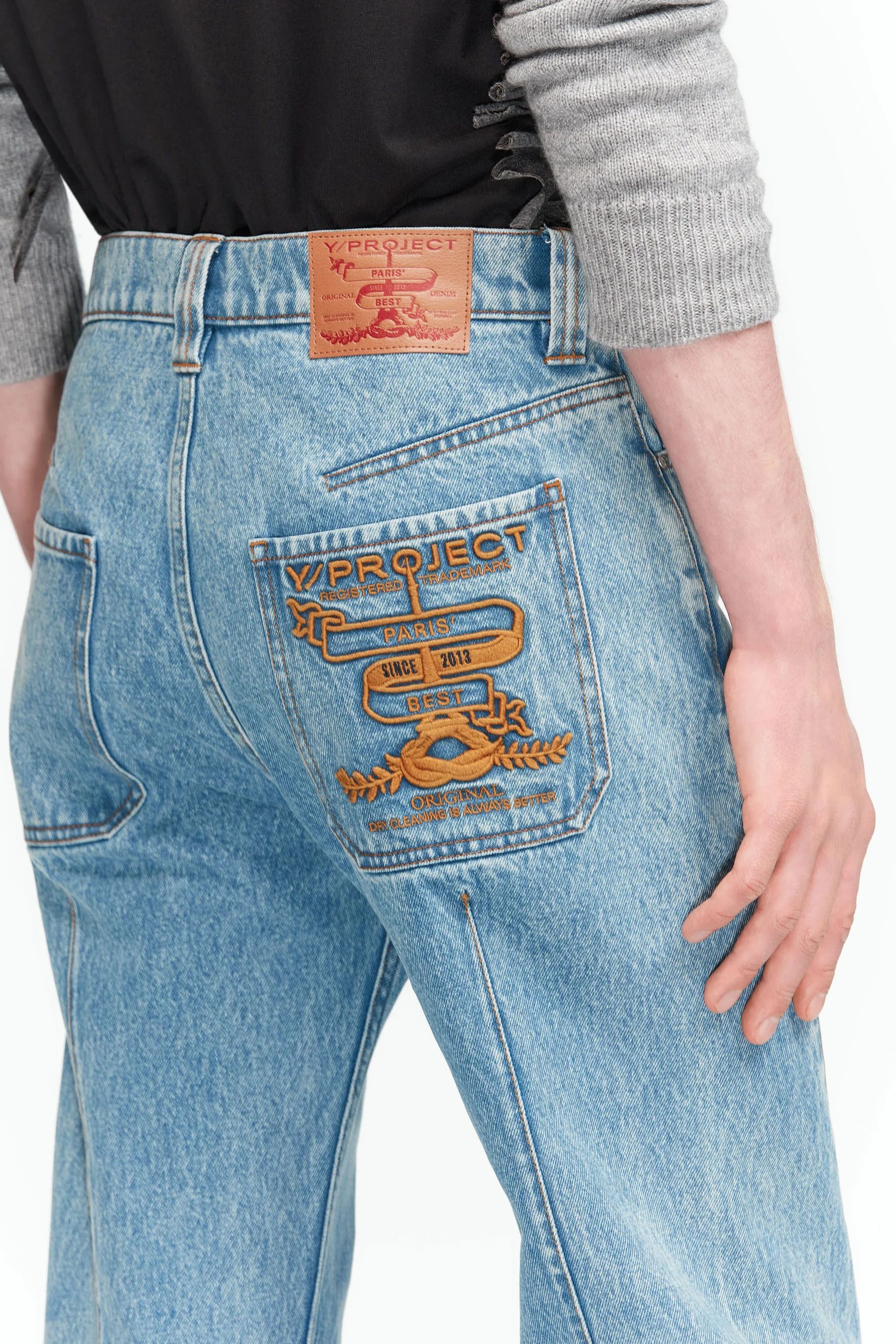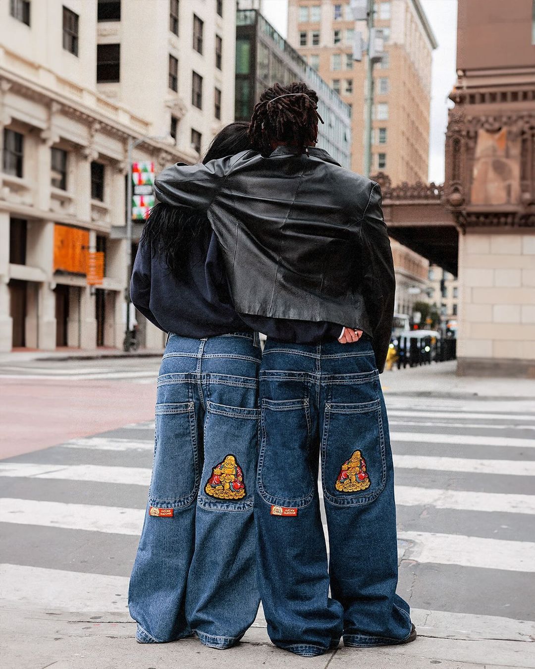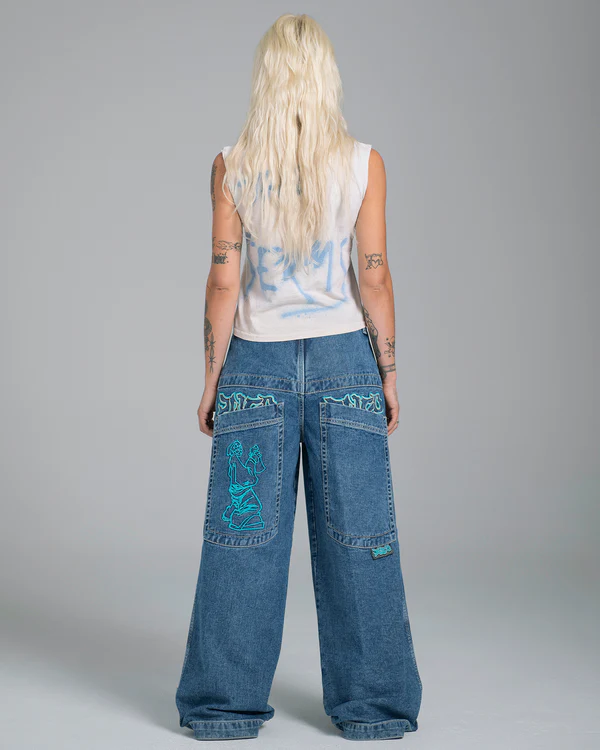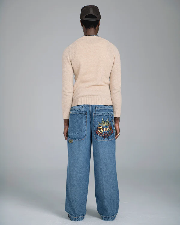 Quest’anno, Y/Project aggiunge il logo con la Torre Eiffel sulla tasca posteriore destra; Valentino riprende decorazioni floreali e pailettes nel denim da donna, insieme al tag VLTN in gomma; mentre AREA aggiunge la targhetta in metallo con il nome. Si uniscono anche brand minori come JNCO, che li introduce in edizione limitata sui modelli The Royal e The Artistical Uprising, entrambi con tasche oversize; Frame, che gioca con le toppe per una collezione limitata in collaborazione con Ritz; e infine il brand newyorchese Small Talk Studio, che realizza un denim bianco con grafiche in vendita esclusiva su ssense. Il graduale ritorno dei ricami sulle tasche posteriori dei jeans è segno dell'importanza che il branding continua ad avere, e forse anche l’ennesima prova che il pubblico è finalmente pronto a lasciarsi alle spalle l’era del quiet luxury.
