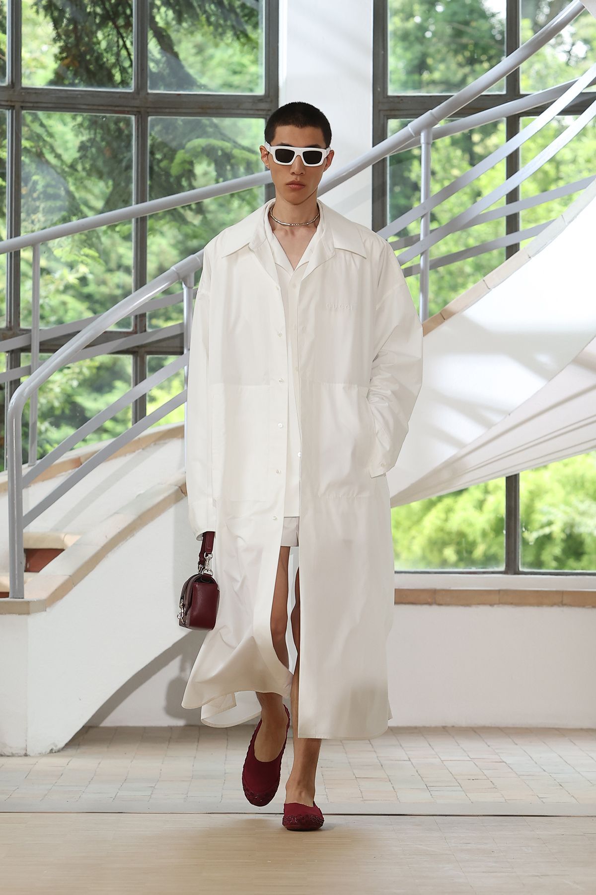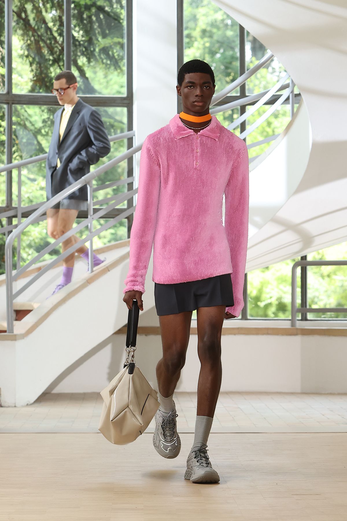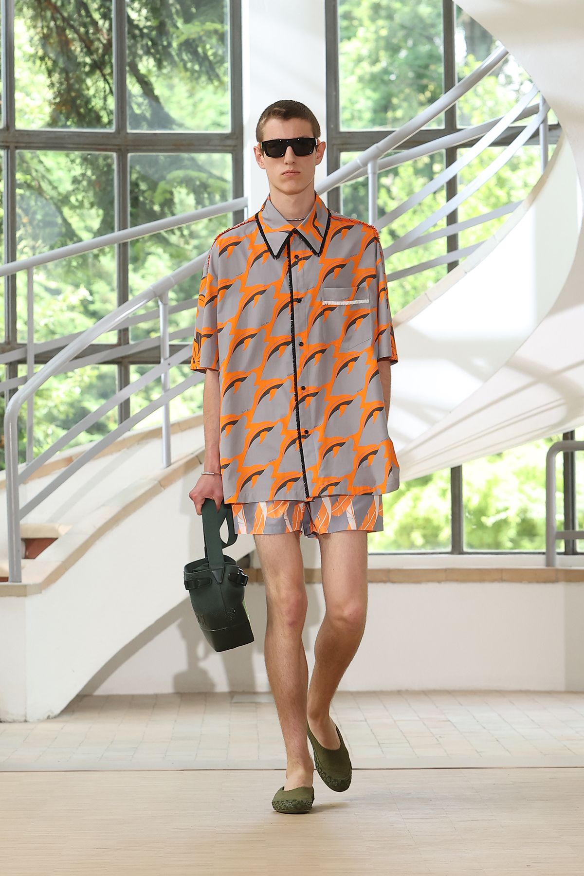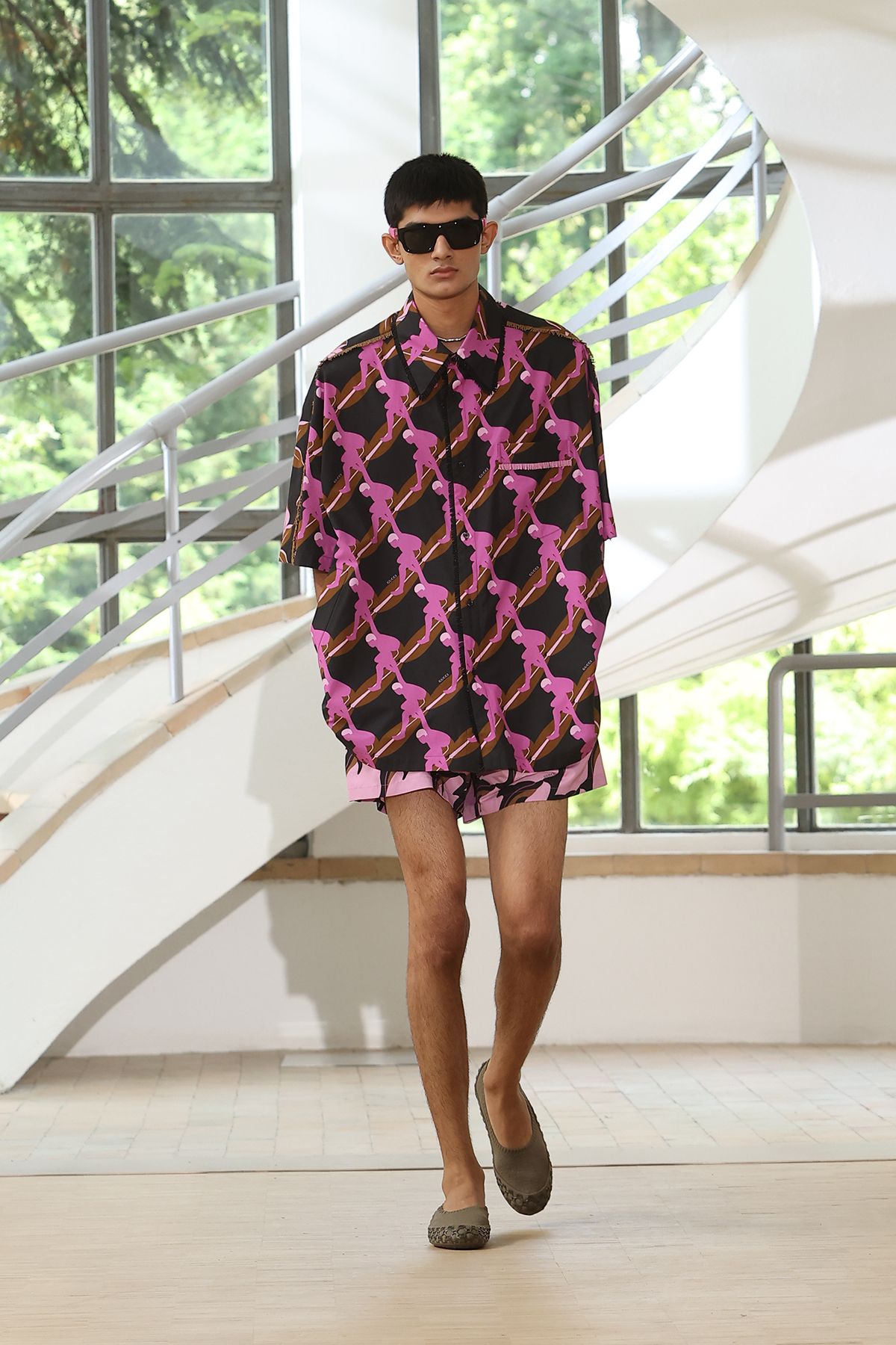 L'utilità e la praticità sono stati temi chiave in tutta la collezione. Giacche con zip e cappotti in pelle con aperture esagerate e texture uniche hanno aggiunto un tocco contemporaneo. Ogni capo sembrava progettato non solo per lo stile ma anche per la funzionalità, echeggiando lo stile di vita dinamico degli esploratori urbani e degli appassionati della spiaggia. Le influenze surfistiche, opportunamente sublimate e quasi astratte, hanno permeato gran parte della collezione, evidenti nei dettagli intricati delle camicie a stampata. Queste camicie presentavano frange ricamate con perline e fiori applicati, adornate da stampe di surfisti, delfini, fiori di ibisco e foglie di banana – ma la loro struttura rimaneva ispirata al mondo dell’utilitywear. Questa fusione di utilità ed estetica surf ha creato una tela vivida che parlava dello spirito di avventura e relax. Anche il ricamo ha giocato un ruolo significativo, aggiungendo un tocco di arte alla collezione. Le polo a maniche lunghe sono state lavorate a mano con intarsio di paillettes, mentre le giacche dai colori sorbetto brillavano con frange di perline che si muovevano come onde, omaggiando sia l'artigianato che la narrativa del designer.