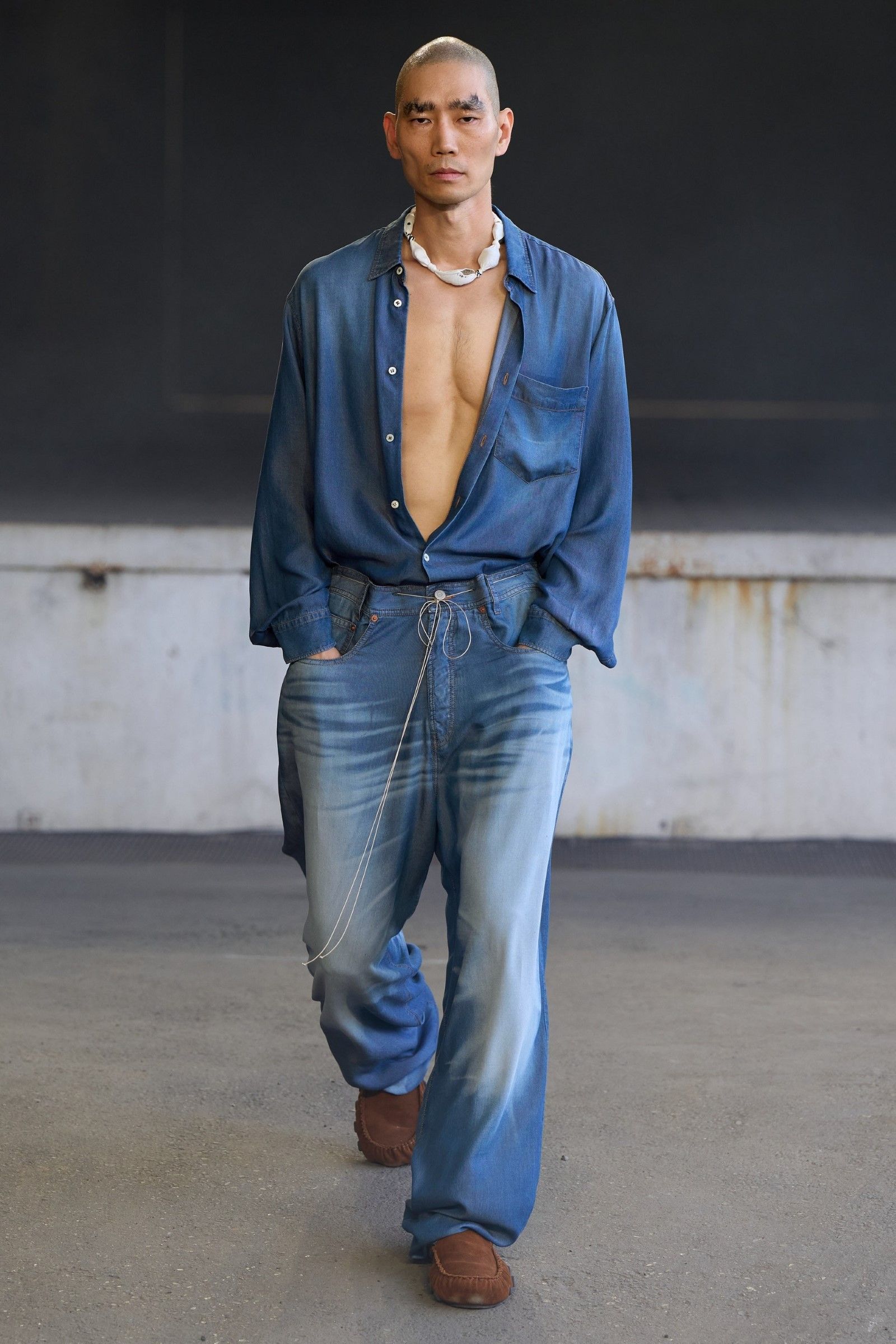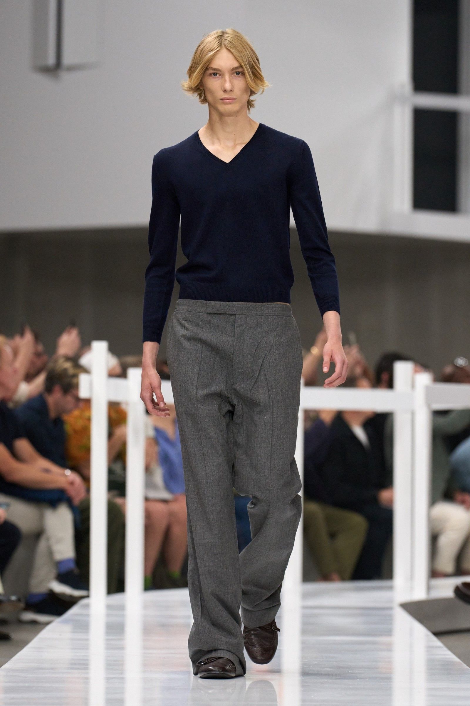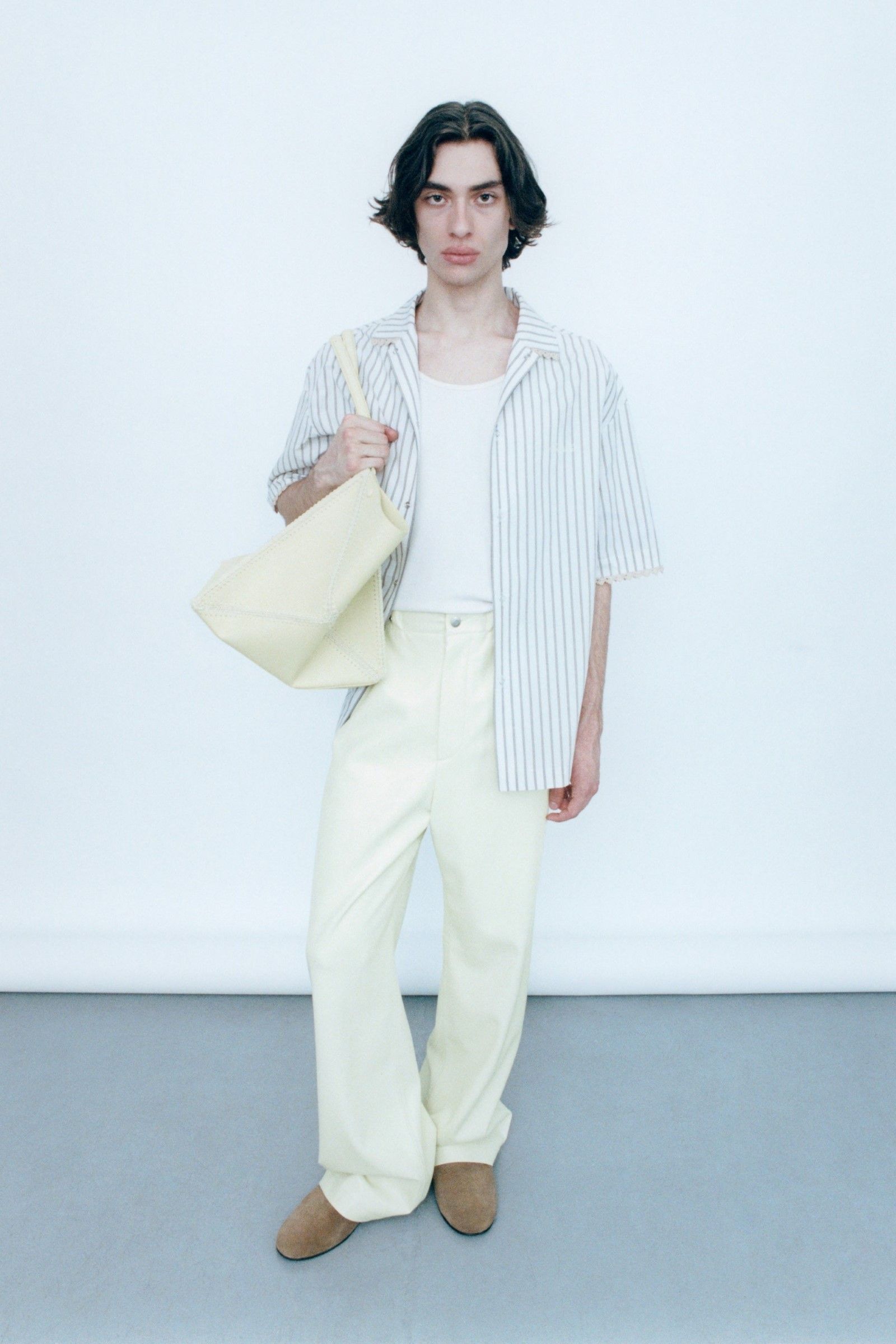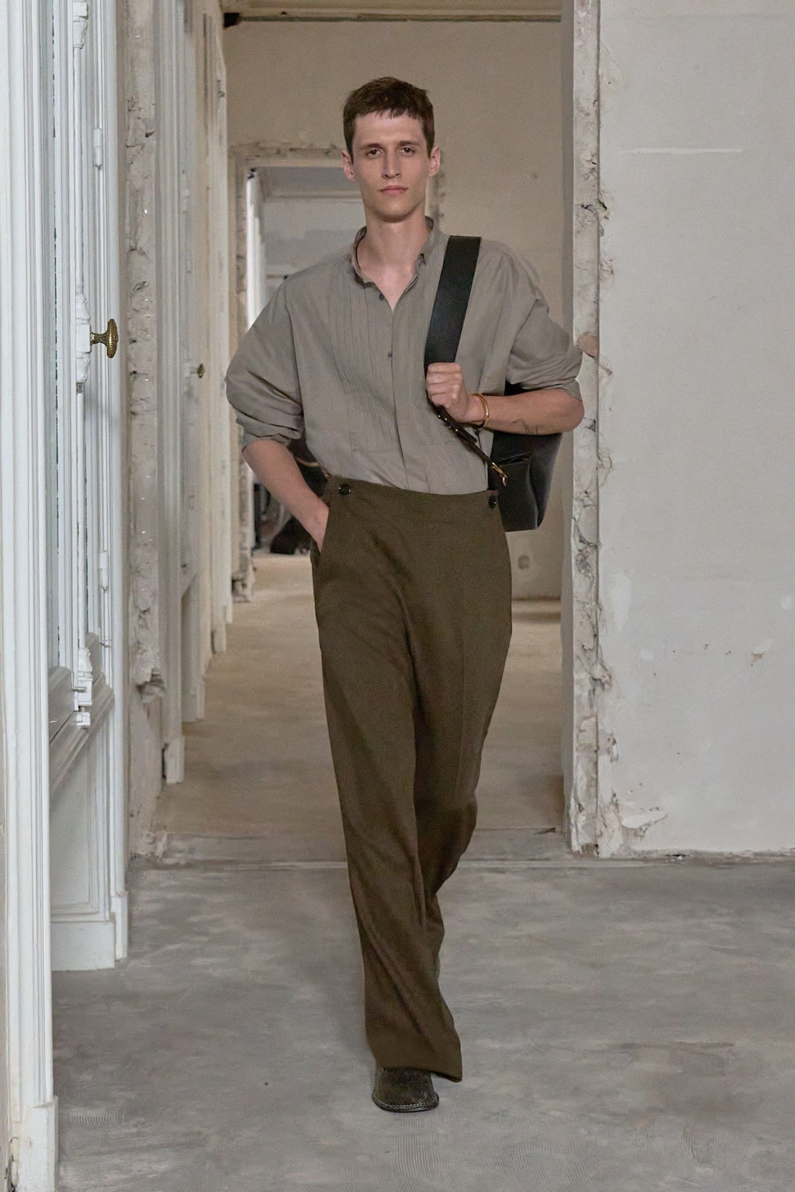 E il lookbook SS24 di The Row rappresenta forse la manifestazione più pulita del “plain boy”: pantaloni larghi, ensemble tonali o monocromatici, un’impronta di sartoria e la tendenza a creare look con blocchi di colore netti ed essenziali. Unica concessione all’estro sono le linee allungate, l’enfasi sui colletti, i volumi ampi e il drappeggio, l’occasionale strappo sul jeans. La semplicità stessa di questo insieme impone rendere interessanti le singole parti: ariosità, morbidezza e texture sono le tre parole d’ordine. E la tendenza si è manifestata con forza nella stagione SS25 maschile appena conclusasi in cui, secondo il report stagionale di Tagwalk, i colori neutri e il color blocking sono aumentati rispettivamente del 30% e del 25% mentre la popolarità della polo è raddoppiata. Si sono visti diversi esempi di questo “filone”: il più notevole è forse Prada, che ha simulato la semplicità, mescolando un maglioncino blu e pantaloni grigi come apertura del suo ultimo show; anche Gucci si è mosso, seppur con altre silhouette, verso territori riduzionistici mentre brand come Bianca Saunders e Craig Green hanno mantenuto questa semplicità animandola però attraverso le proporzioni e il layering rispettivamente – nessuna delle due collezioni potrebbe dirsi minimale, infatti, ma è degno di nota che il look plain abbia fatto la sua comparsa anche lì, anche se dissimulato dallo styling. Lo stesso si dica per l’ultima collezione di Our Legacy, non proprio minimalistica, ma nel cui lookbook ha trovato spazio una combo di jeans e t-shirt, mentre la Resort di 1017 Alyx 9SM, il soft comeback di Matthew Williams, si è mossa sulle linee di questa semplificazione della silhouette come ha fatto nel suo ultimo lookbook anche Stussy. Tanti altri, da Dolce&Gabbana a Hed Mayner, passando per Fendi, Doublet o Sacai hanno a modo loro reinterpretato il look dando nuove forme o drappeggi alle camicie, ma la loro semplicità resta.