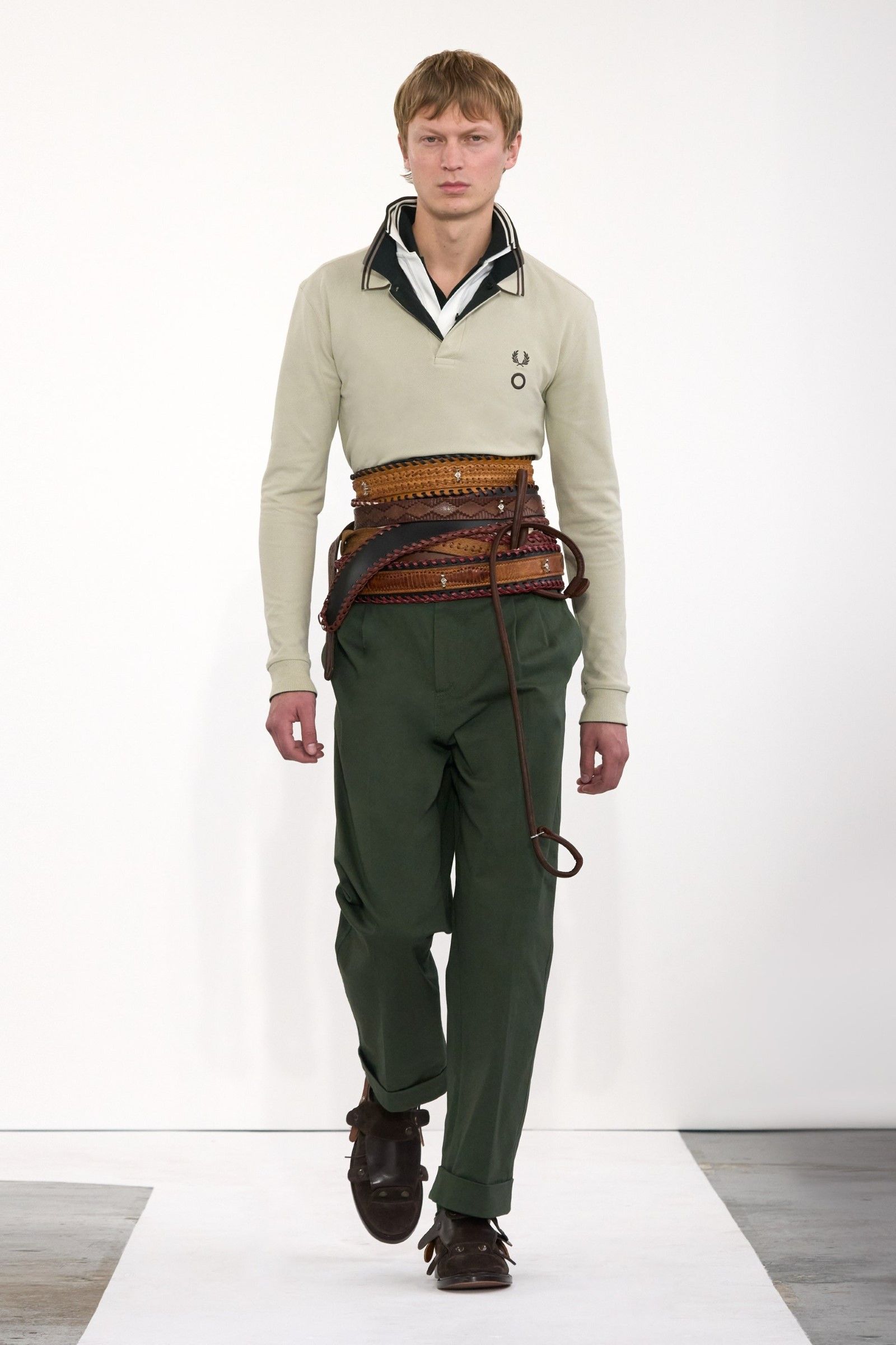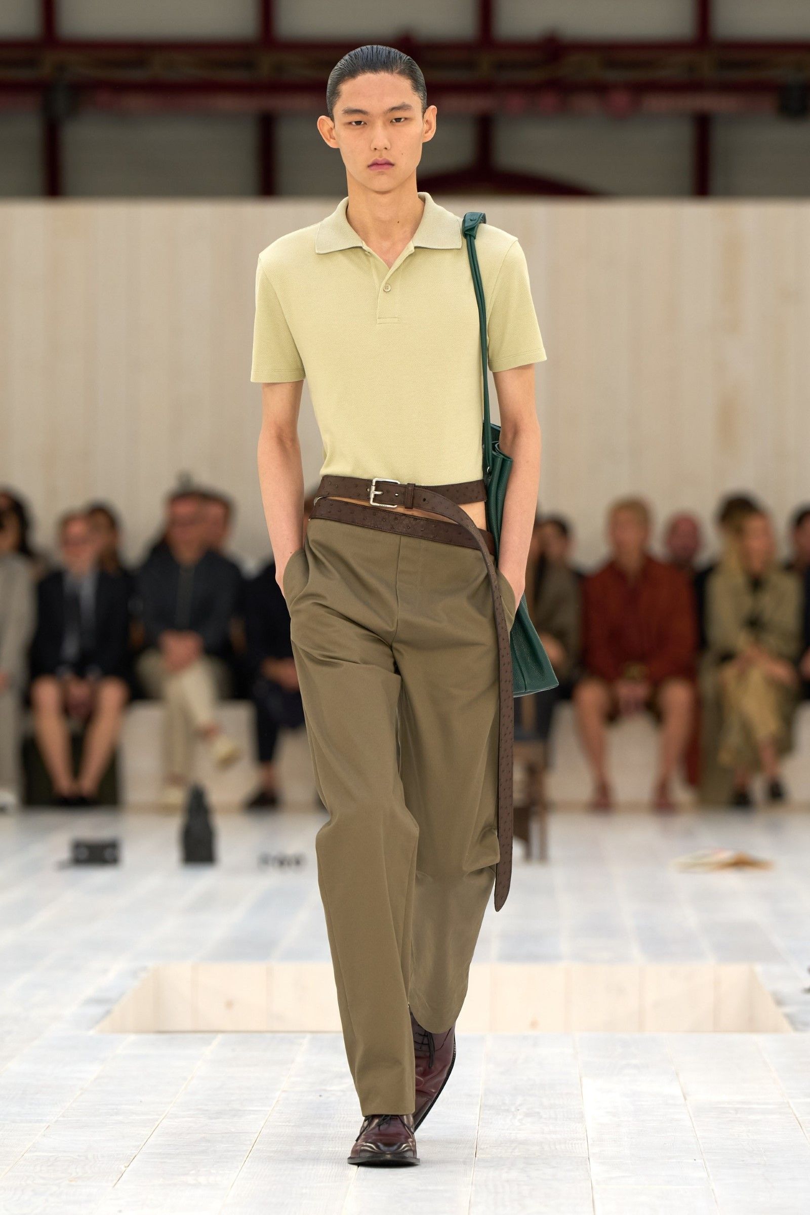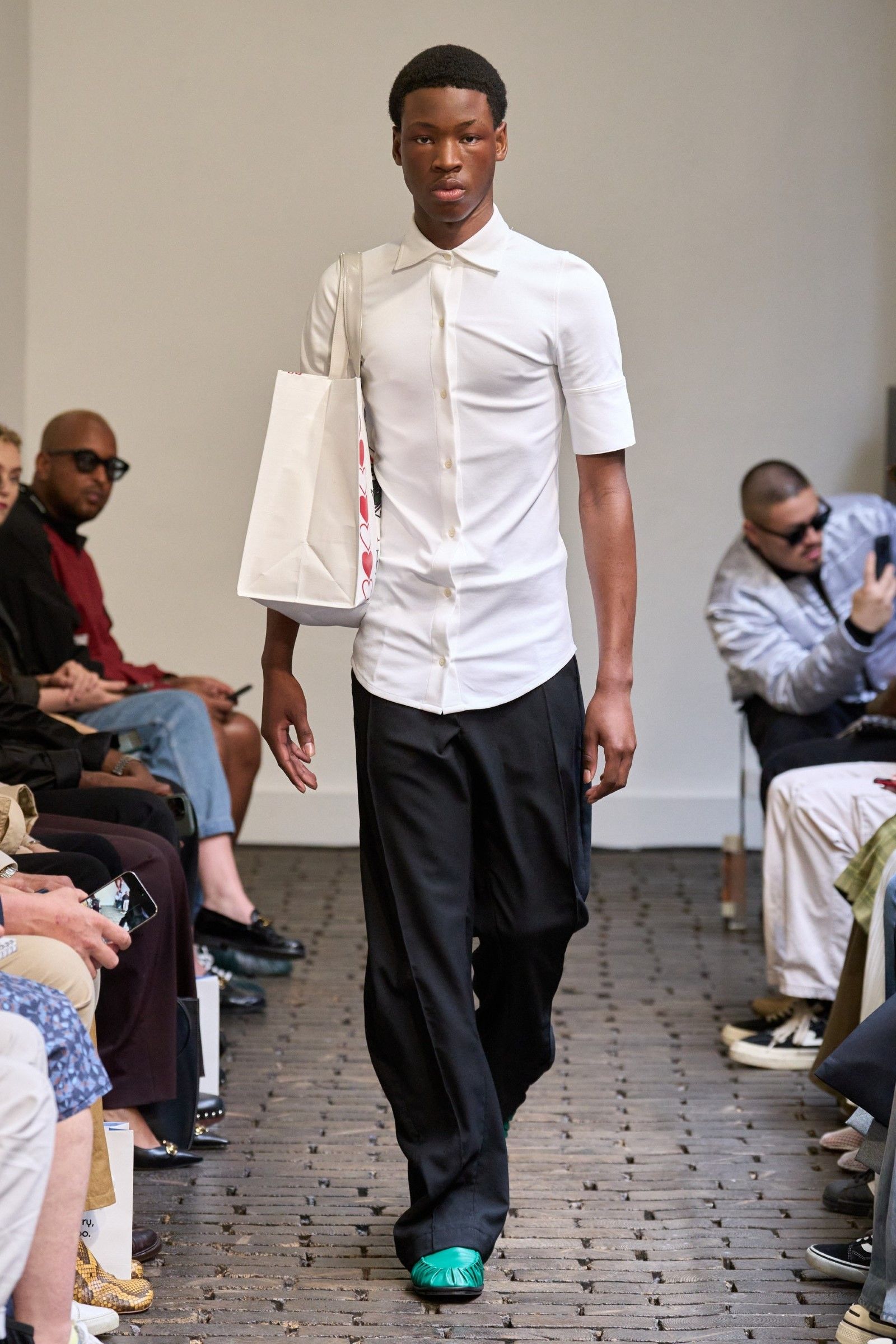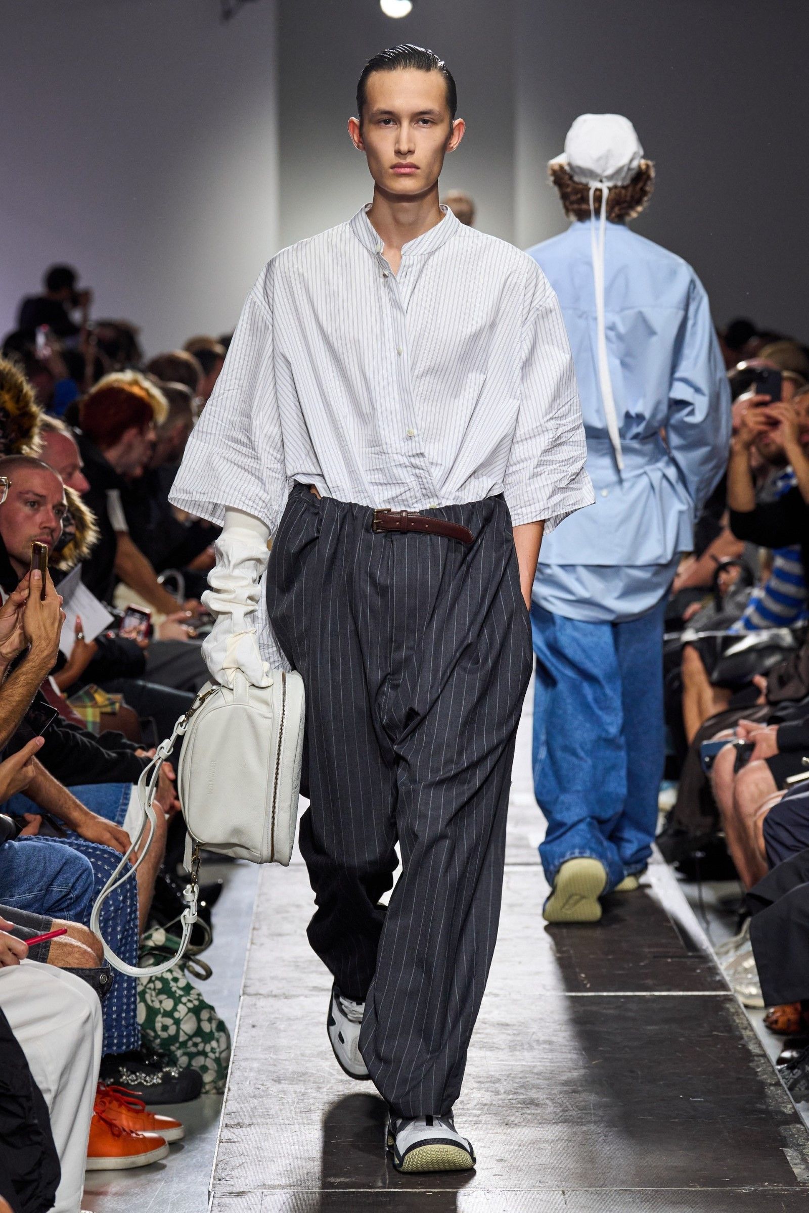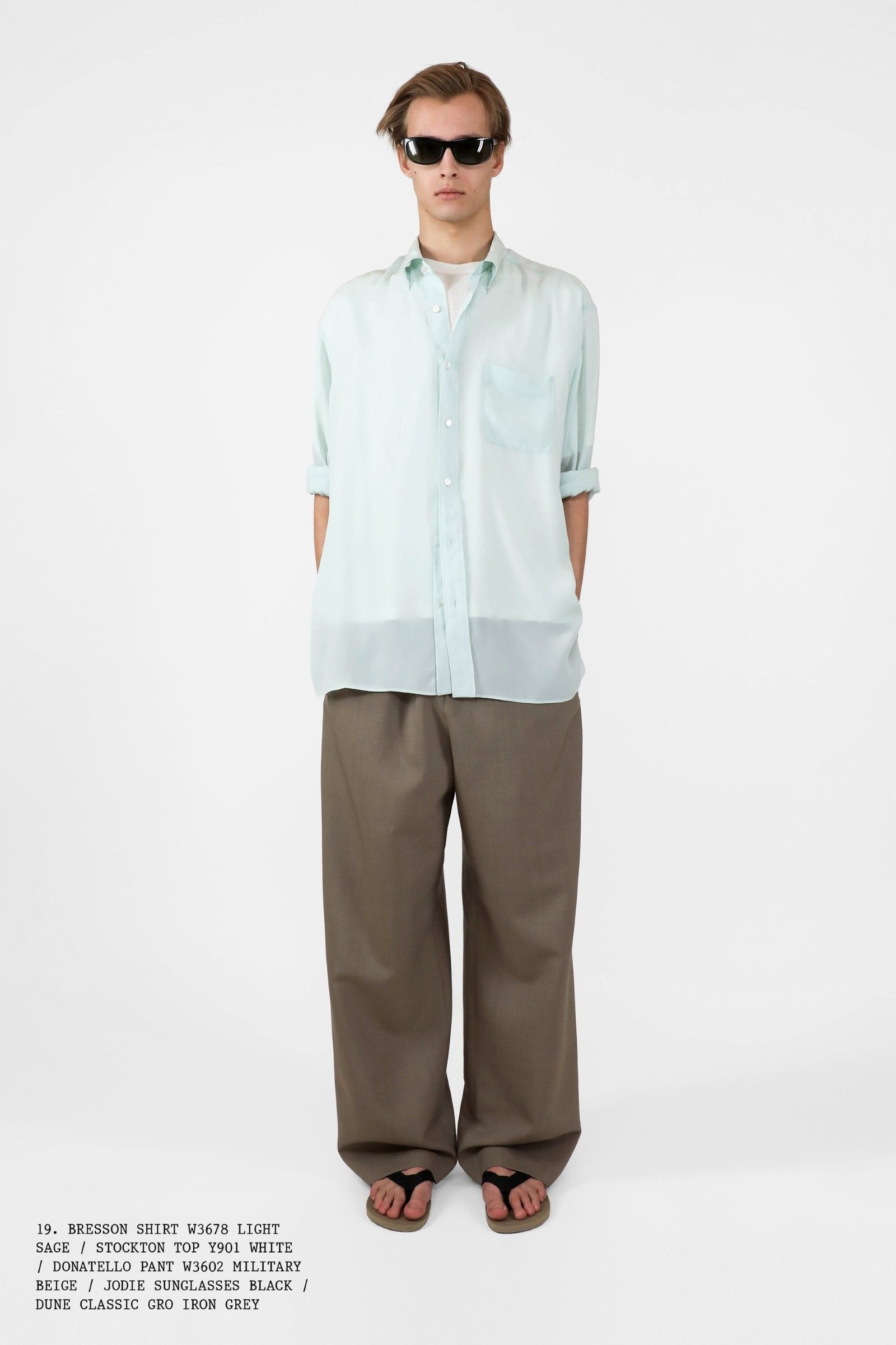E il lookbook SS24 di The Row rappresenta forse la manifestazione più pulita del “plain boy”: pantaloni larghi, ensemble tonali o monocromatici, un’impronta di sartoria e la tendenza a creare look con blocchi di colore netti ed essenziali. Unica concessione all’estro sono le linee allungate, l’enfasi sui colletti, i volumi ampi e il drappeggio, l’occasionale strappo sul jeans. La semplicità stessa di questo insieme impone rendere interessanti le singole parti: ariosità, morbidezza e texture sono le tre parole d’ordine. E la tendenza si è manifestata con forza nella stagione SS25 maschile appena conclusasi in cui, secondo il report stagionale di Tagwalk, i colori neutri e il color blocking sono aumentati rispettivamente del 30% e del 25% mentre la popolarità della polo è raddoppiata. Si sono visti diversi esempi di questo “filone”: il più notevole è forse Prada, che ha simulato la semplicità, mescolando un maglioncino blu e pantaloni grigi come apertura del suo ultimo show; anche Gucci si è mosso, seppur con altre silhouette, verso territori riduzionistici mentre brand come Bianca Saunders e Craig Green hanno mantenuto questa semplicità animandola però attraverso le proporzioni e il layering rispettivamente – nessuna delle due collezioni potrebbe dirsi minimale, infatti, ma è degno di nota che il look plain abbia fatto la sua comparsa anche lì, anche se dissimulato dallo styling. Lo stesso si dica per l’ultima collezione di Our Legacy, non proprio minimalistica, ma nel cui lookbook ha trovato spazio una combo di jeans e t-shirt, mentre la Resort di 1017 Alyx 9SM, il soft comeback di Matthew Williams, si è mossa sulle linee di questa semplificazione della silhouette come ha fatto nel suo ultimo lookbook anche Stussy. Tanti altri, da Dolce&Gabbana a Hed Mayner, passando per Fendi, Doublet o Sacai hanno a modo loro reinterpretato il look dando nuove forme o drappeggi alle camicie, ma la loro semplicità resta.