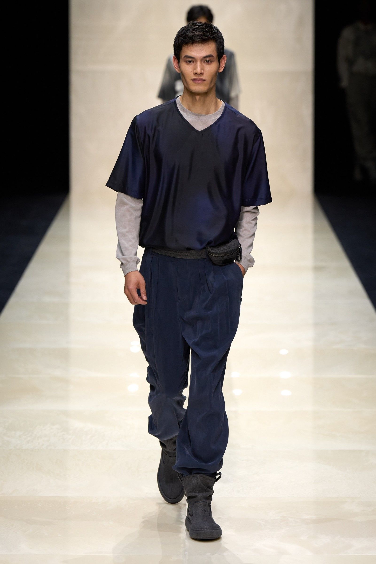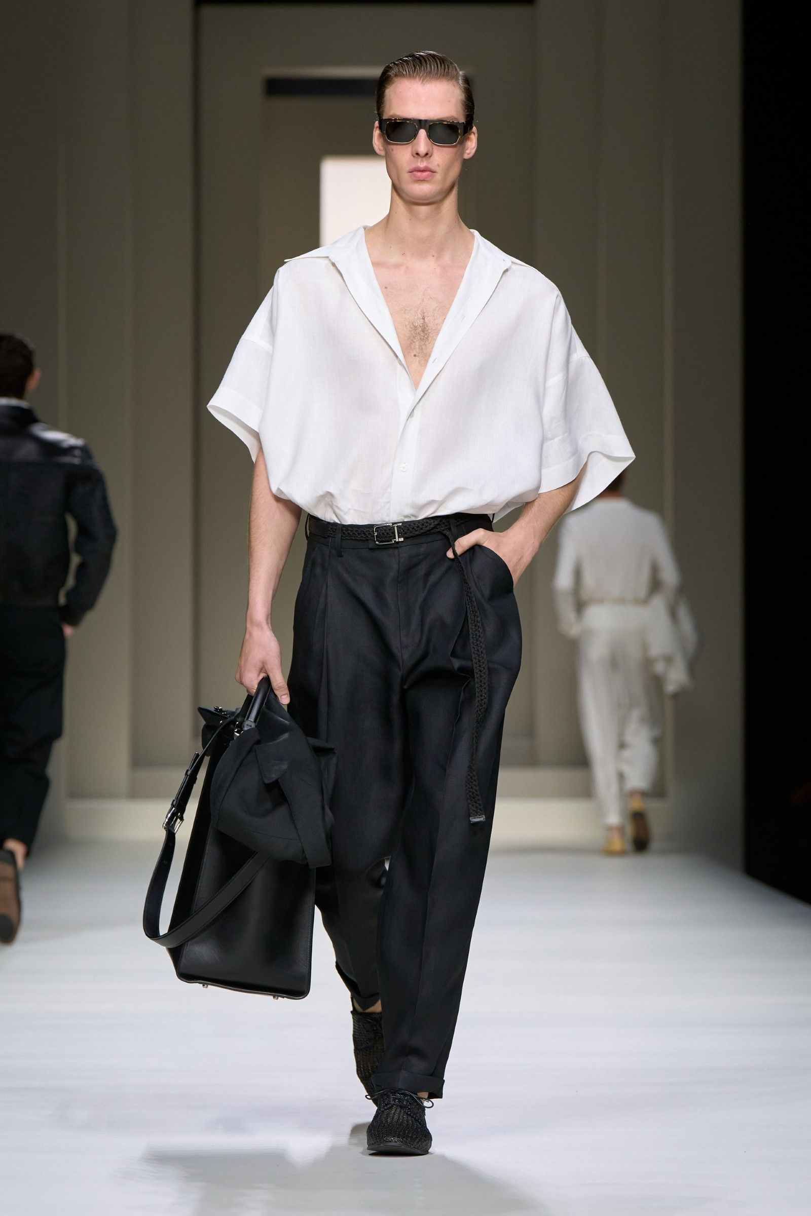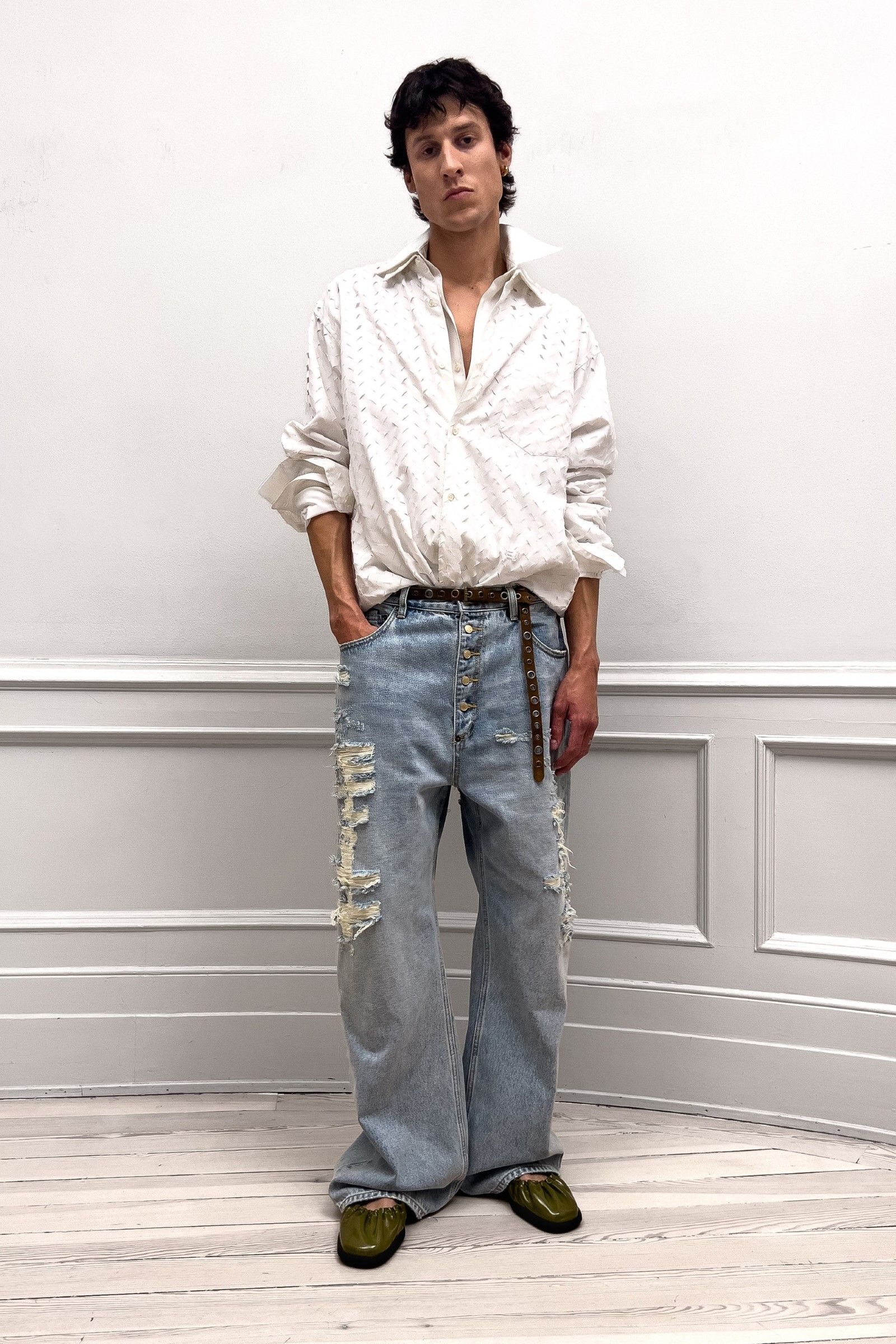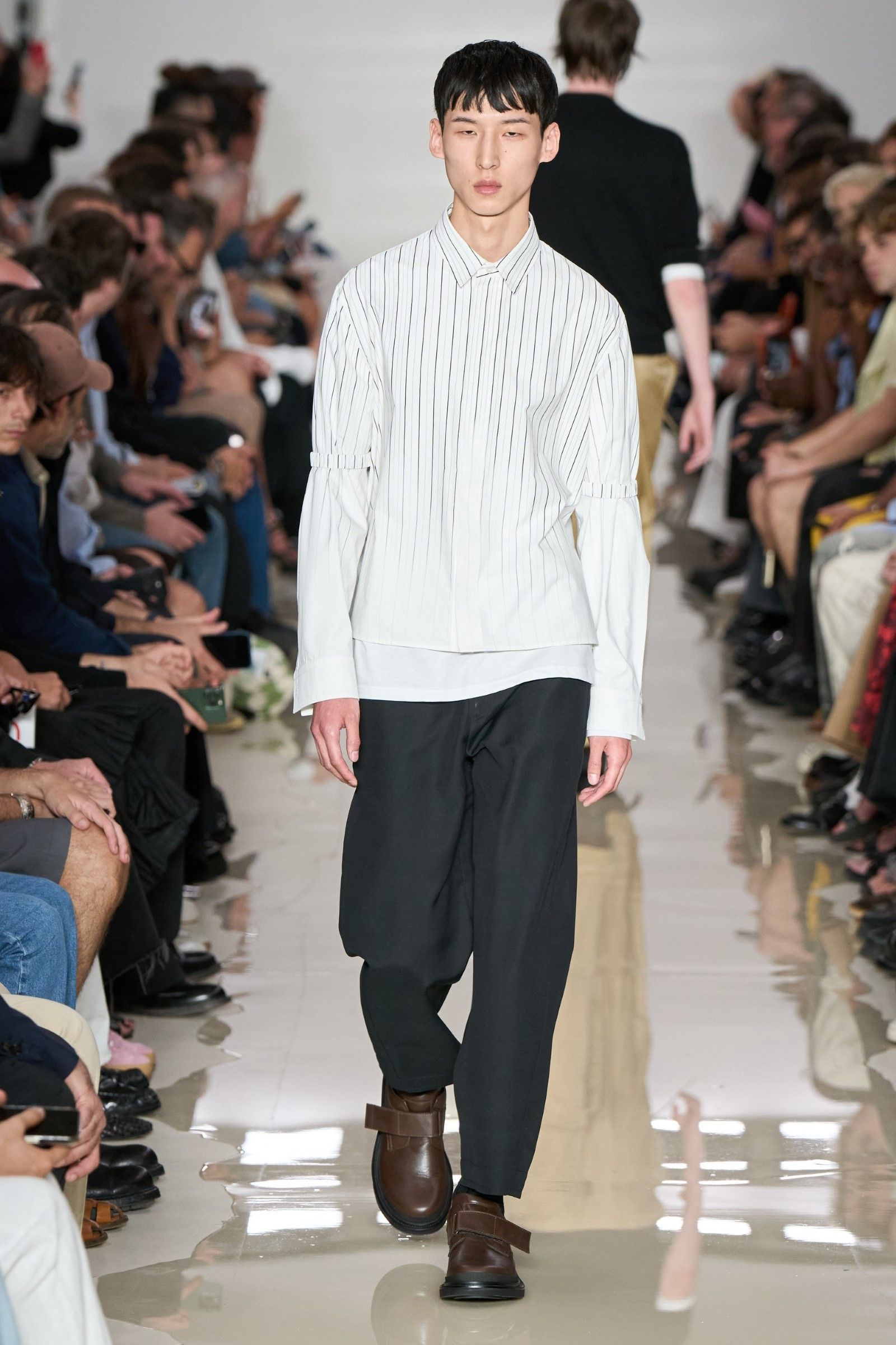 E il lookbook SS24 di The Row rappresenta forse la manifestazione più pulita del “plain boy”: pantaloni larghi, ensemble tonali o monocromatici, un’impronta di sartoria e la tendenza a creare look con blocchi di colore netti ed essenziali. Unica concessione all’estro sono le linee allungate, l’enfasi sui colletti, i volumi ampi e il drappeggio, l’occasionale strappo sul jeans. La semplicità stessa di questo insieme impone rendere interessanti le singole parti: ariosità, morbidezza e texture sono le tre parole d’ordine. E la tendenza si è manifestata con forza nella stagione SS25 maschile appena conclusasi in cui, secondo il report stagionale di Tagwalk, i colori neutri e il color blocking sono aumentati rispettivamente del 30% e del 25% mentre la popolarità della polo è raddoppiata. Si sono visti diversi esempi di questo “filone”: il più notevole è forse Prada, che ha simulato la semplicità, mescolando un maglioncino blu e pantaloni grigi come apertura del suo ultimo show; anche Gucci si è mosso, seppur con altre silhouette, verso territori riduzionistici mentre brand come Bianca Saunders e Craig Green hanno mantenuto questa semplicità animandola però attraverso le proporzioni e il layering rispettivamente – nessuna delle due collezioni potrebbe dirsi minimale, infatti, ma è degno di nota che il look plain abbia fatto la sua comparsa anche lì, anche se dissimulato dallo styling. Lo stesso si dica per l’ultima collezione di Our Legacy, non proprio minimalistica, ma nel cui lookbook ha trovato spazio una combo di jeans e t-shirt, mentre la Resort di 1017 Alyx 9SM, il soft comeback di Matthew Williams, si è mossa sulle linee di questa semplificazione della silhouette come ha fatto nel suo ultimo lookbook anche Stussy. Tanti altri, da Dolce&Gabbana a Hed Mayner, passando per Fendi, Doublet o Sacai hanno a modo loro reinterpretato il look dando nuove forme o drappeggi alle camicie, ma la loro semplicità resta.