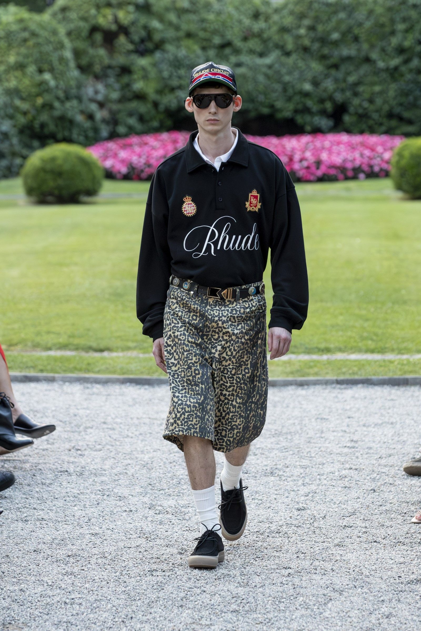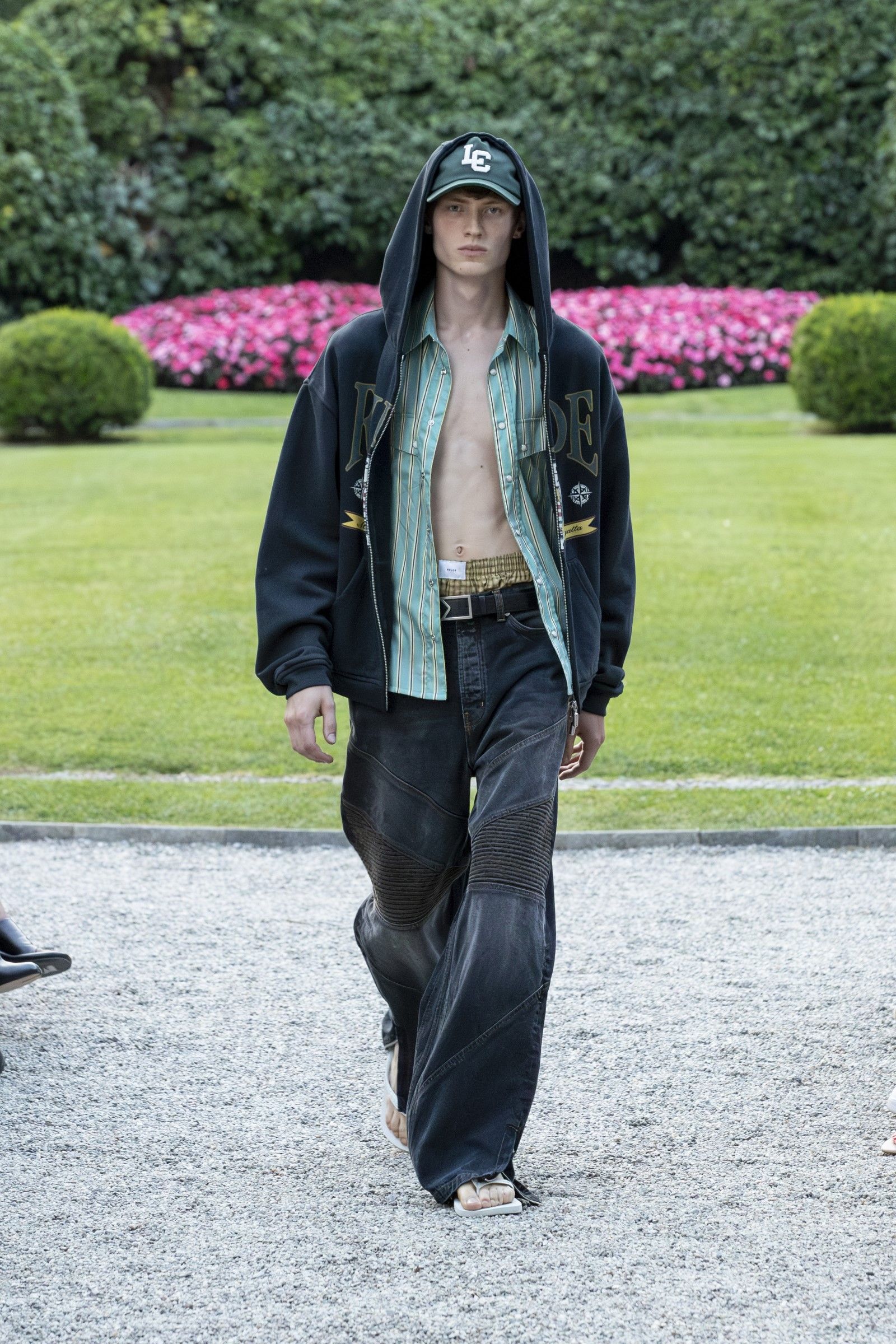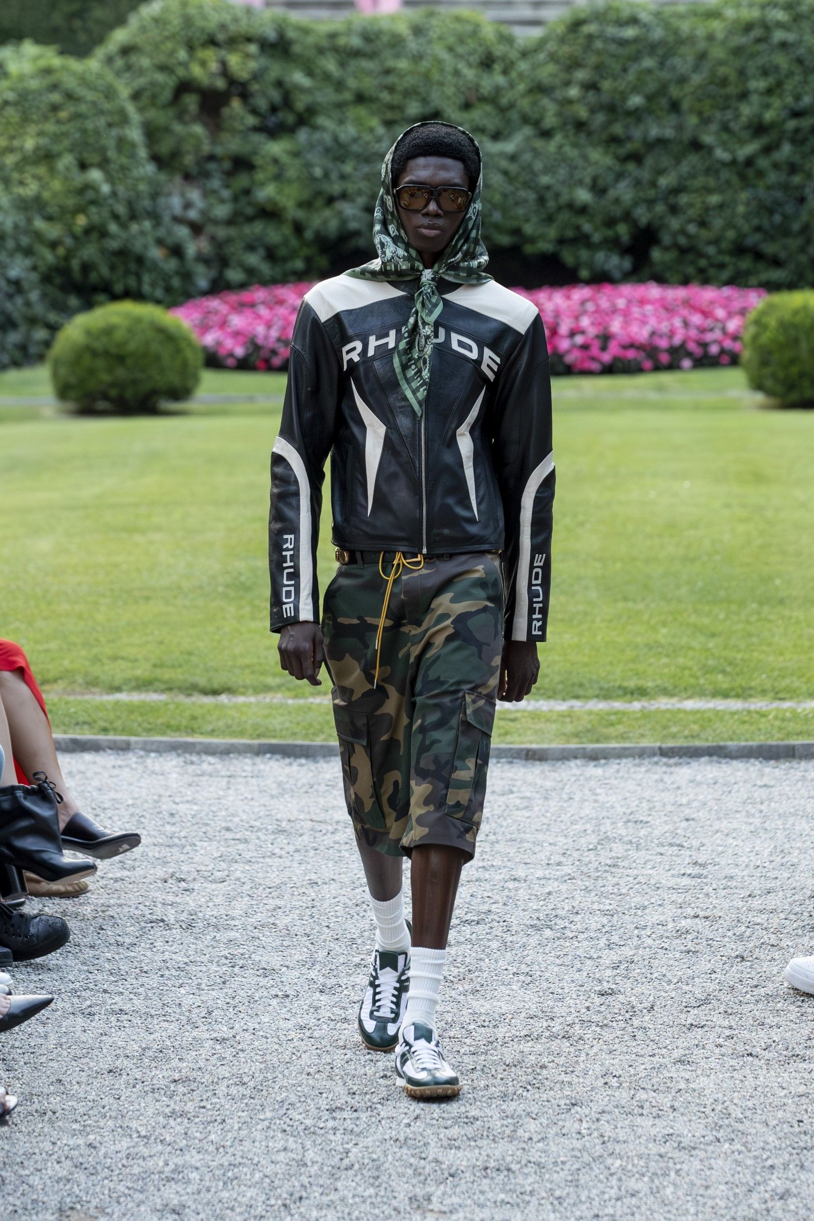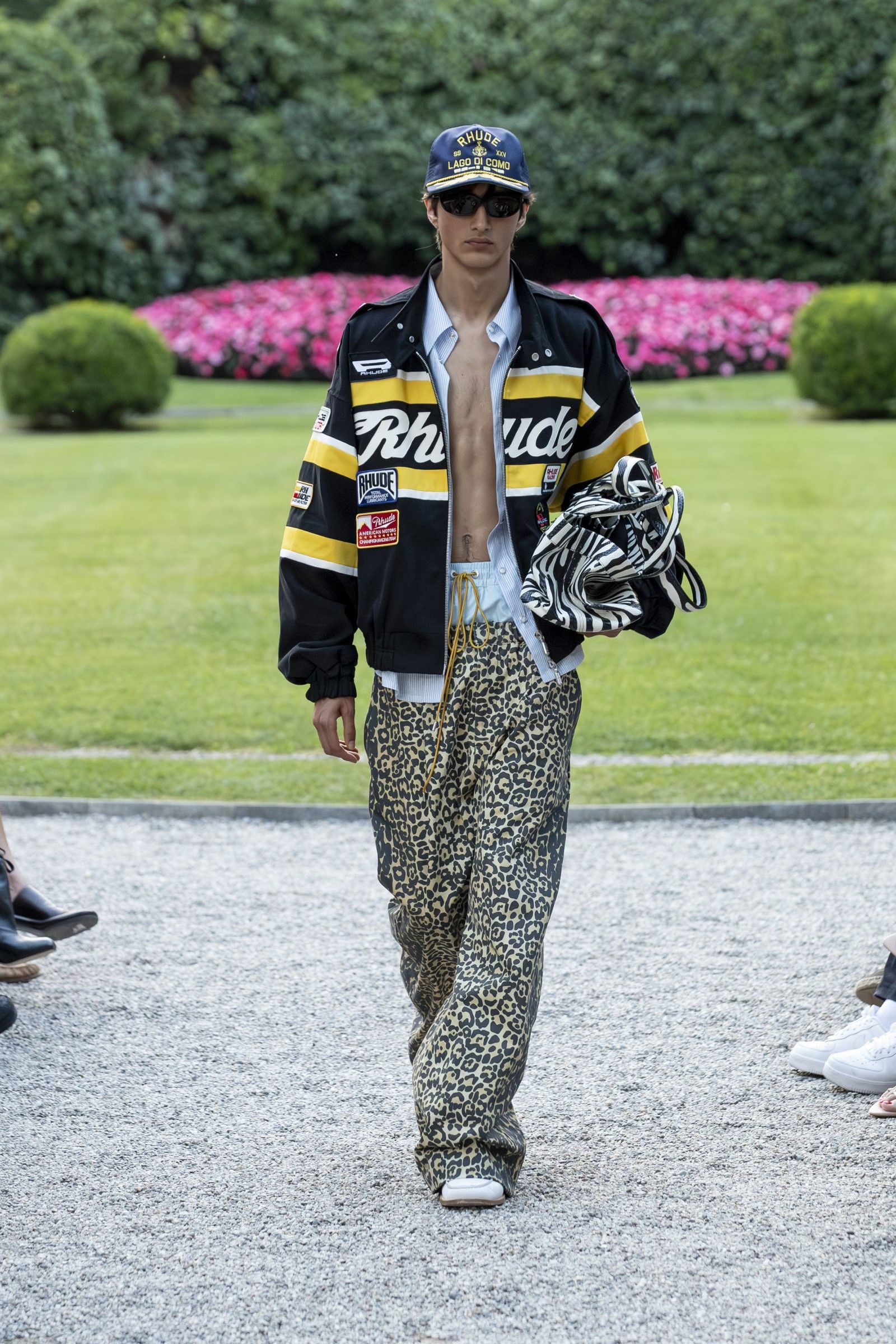 Ma non bisogna pensare che l’informale e il formale siano scollati tra loro: nella visione di Villaseñor, l'alterigia della sartoria viene smorzata, oltre che dai tagli fluenti, da tocchi di gaudente informalità come infradito e canotte sportive. Gli stessi baveri generosi delle giacche gessate, abbinate alle lenti arancio degli occhiali da sole, ricordavano più l’insouciance del consumato dandy che la serietà dell’uomo d’affari. Nel backstage, Villaseñor ha ricordato come, da bambino, guardasse i completi di Ralph Laurent e Armani, oggetti di curiosità e desiderio solo apparentemente lontani dalla sua portata. E in altri look diventava più evidente l’incastro delle diverse anime di Rhude: immaginate una camicia Oxford con cravatta club, indossata sopra una giacca da aviatore in pelle, con bermuda gessati, simil-Wallabee ai piedi, lenti a goccia e un cappello da baseball rosa; o ancora un abbinamento di boxer shorts, t-shirt stinta e una lunga vestaglia da casa. Quasi come se la curiosità di un giovane ragazzo, immediata e sportiva, infusa di influenze hip-hop fosse ricaduta guardaroba patrizio di un capitano d’industria. Che poi è la storia dello stesso Villaseñor che adesso gestisce un brand in piena espansione.
