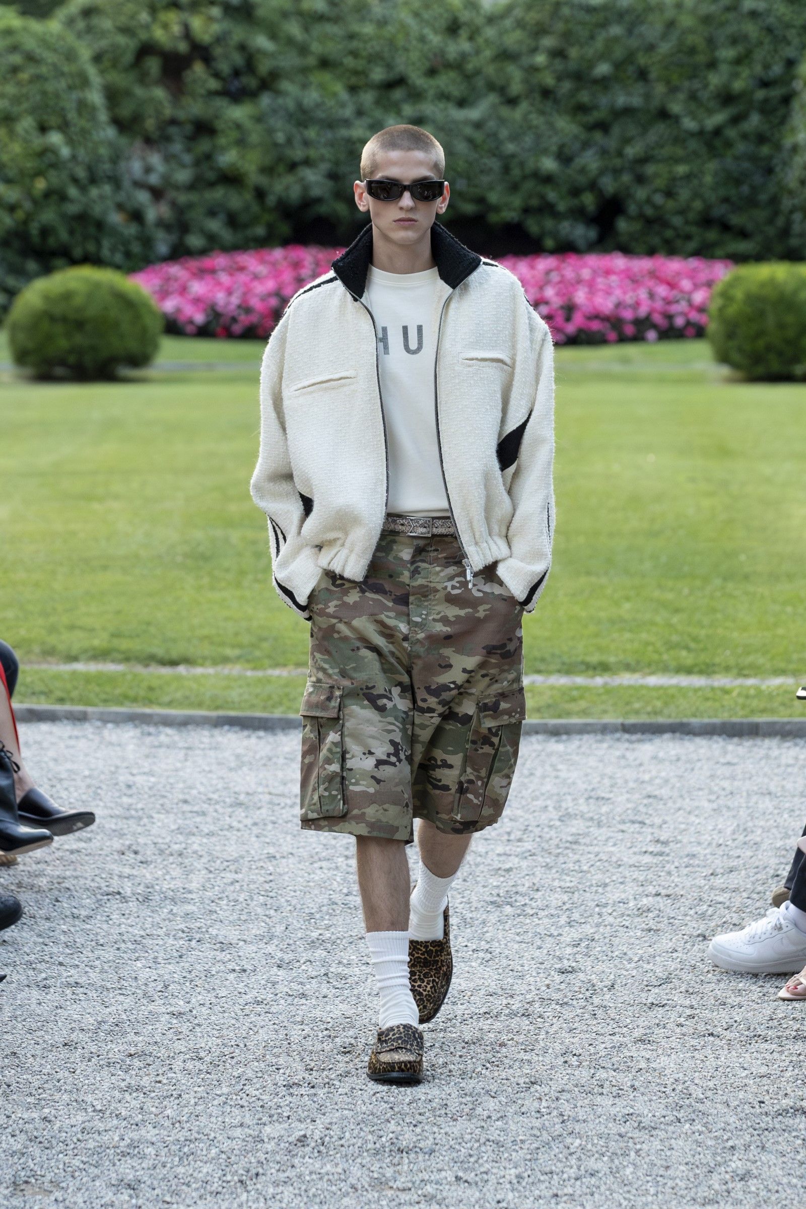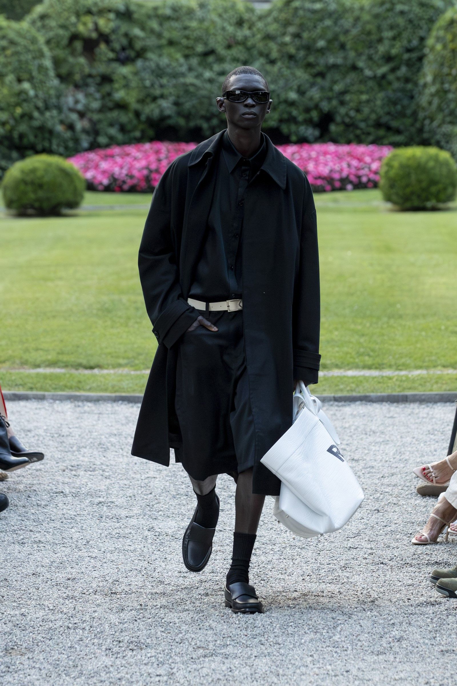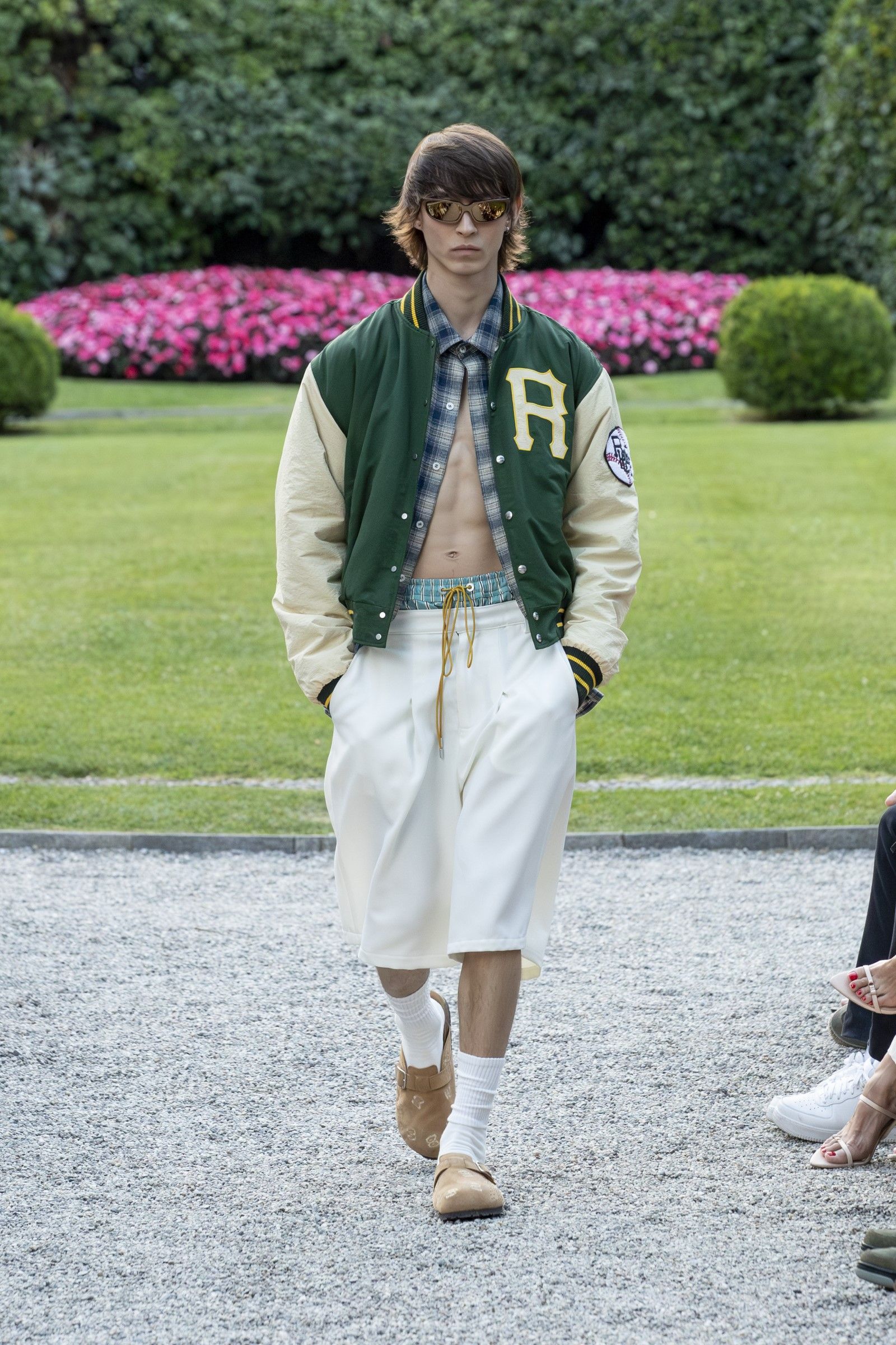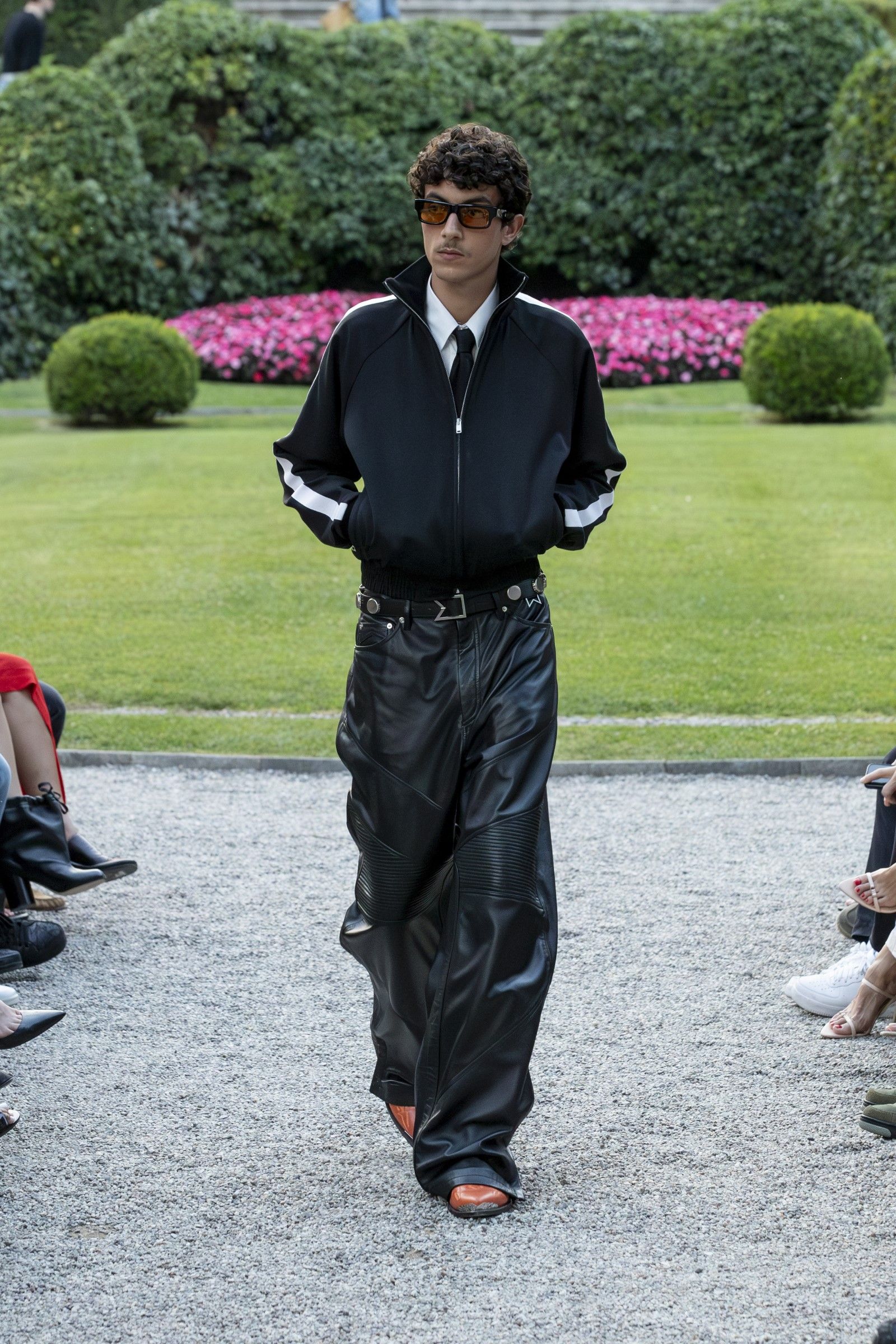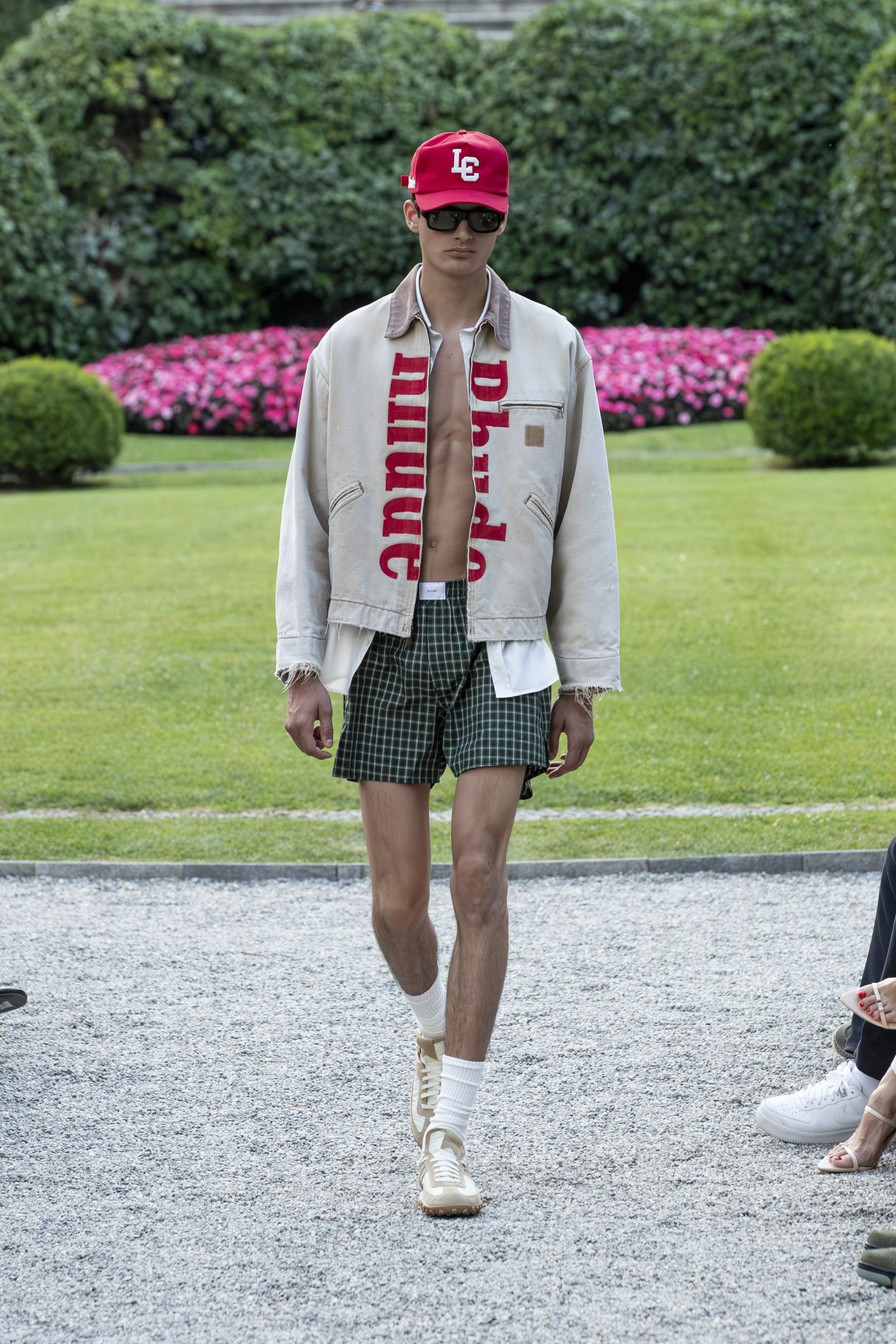 Ma non bisogna pensare che l’informale e il formale siano scollati tra loro: nella visione di Villaseñor, l'alterigia della sartoria viene smorzata, oltre che dai tagli fluenti, da tocchi di gaudente informalità come infradito e canotte sportive. Gli stessi baveri generosi delle giacche gessate, abbinate alle lenti arancio degli occhiali da sole, ricordavano più l’insouciance del consumato dandy che la serietà dell’uomo d’affari. Nel backstage, Villaseñor ha ricordato come, da bambino, guardasse i completi di Ralph Laurent e Armani, oggetti di curiosità e desiderio solo apparentemente lontani dalla sua portata. E in altri look diventava più evidente l’incastro delle diverse anime di Rhude: immaginate una camicia Oxford con cravatta club, indossata sopra una giacca da aviatore in pelle, con bermuda gessati, simil-Wallabee ai piedi, lenti a goccia e un cappello da baseball rosa; o ancora un abbinamento di boxer shorts, t-shirt stinta e una lunga vestaglia da casa. Quasi come se la curiosità di un giovane ragazzo, immediata e sportiva, infusa di influenze hip-hop fosse ricaduta guardaroba patrizio di un capitano d’industria. Che poi è la storia dello stesso Villaseñor che adesso gestisce un brand in piena espansione.