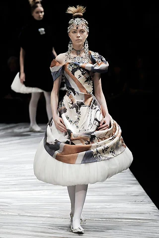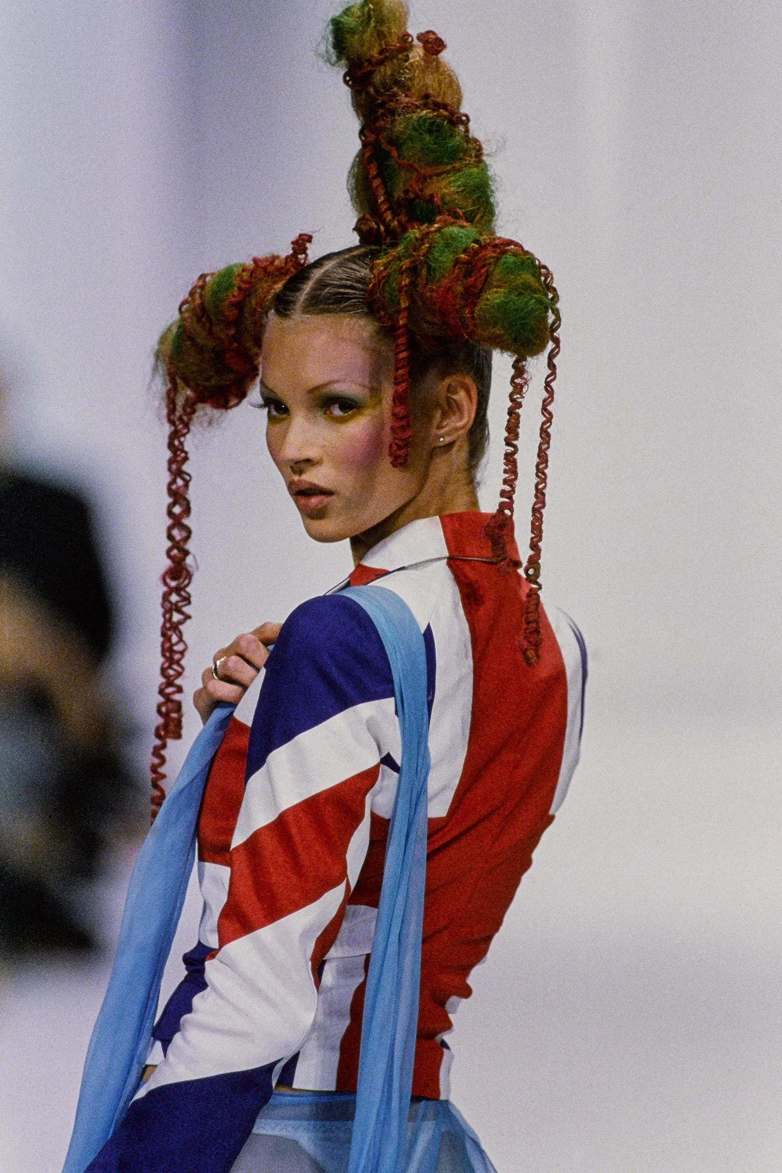 Persino le origini della bandiera inglese nella moda sono ribelli. Parte dalla strada e dai palcoscenici di band impavide come gli Who o i Rolling Stones, ma ancora di più dagli outfit dei punk, e il corrispondente gruppo dei Sex Pistols. Come c’era da aspettarselo, poiché lei stessa contributrice del movimento e del successo della band di Sid Vicious assieme al compagno Malcolm Mclaren, è stata Vivienne Westwood la prima designer a portare la Union Jack in passerella. Per un punk, indossare la bandiera inglese era il massimo della satira, uno scherzo anti-establishment che sfregia un immagine istituzionale con quel look DIY da spille da balia e magliette stracciate. Era un trend provocatorio fino a che Westwood non lo ha portato in Fashion Week sotto forma di reiterazione rococò, nonostante anche lei fosse parte della subcultura. Negli anni ’90, la Union Jack diventa uno status symbol per tutto il mondo: la indossa Ginger Spice ai Brit Awards del 1997 (un trucco che riprende Dua Lipa per la sua performance dell’edizione del 2021), la riportano sul palco band come gli Oasis, e poi ancora Kate Moss all'epoca dell’indie sleaze e Alexander McQueen, grande dissidente dell’alta moda, la stampa assieme al volto della Regina Elisabetta II su un abito della FW09 (ma prima, negli anni '90, su un cappotto per una performance di David Bowie). Tutt’ora, in passerella come per le strade di Londra, la Union Jack viene ripresa da stilisti, creativi e cantanti che lanciano messaggi di critica al governo. Negli anni in cui Boris Johnson era premier, era stato il rapper Stormzy a presentarsi sul palco di Glastonbury 2019 con un giubbotto antiproiettile decorato da una stampa bianca, rossa e blu, mentre nel settembre 2022, per lo show “No Borders”, la designer Dilara Findikoglu ha riportato gli stessi colori su un mini dress a corsetto, in pieno stile Westwood.