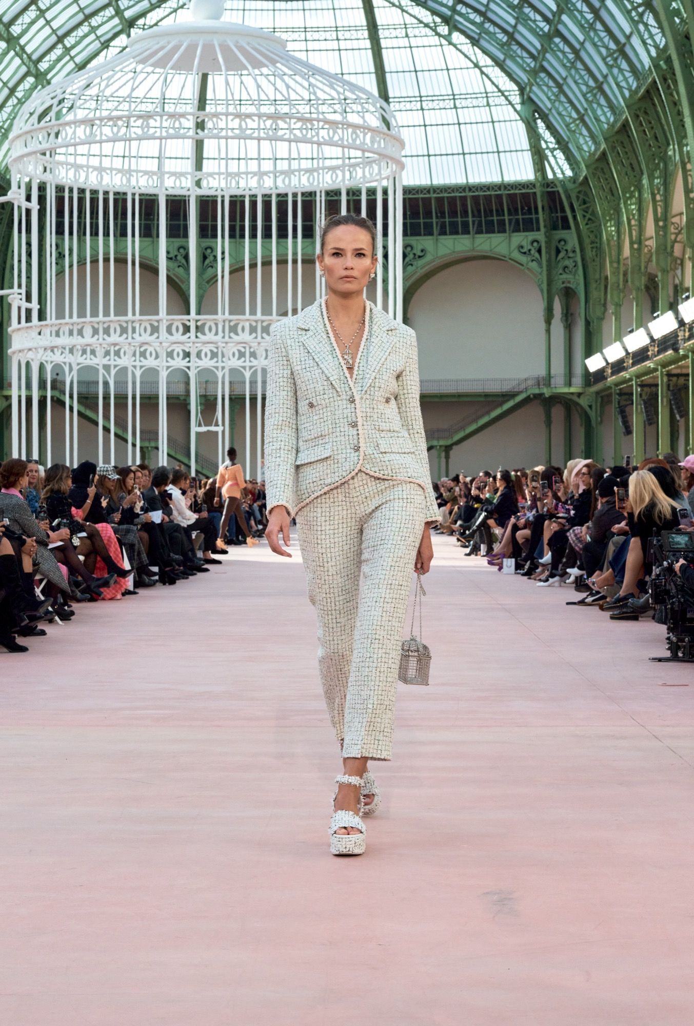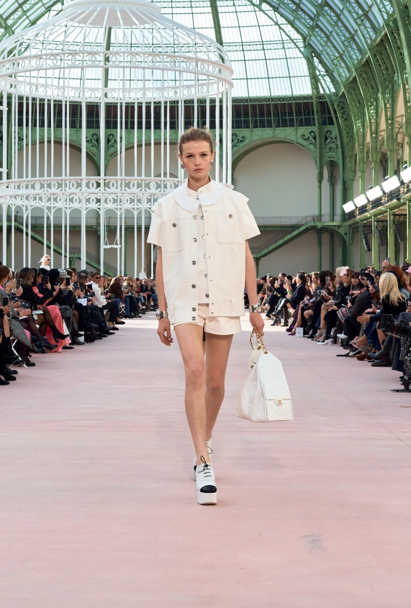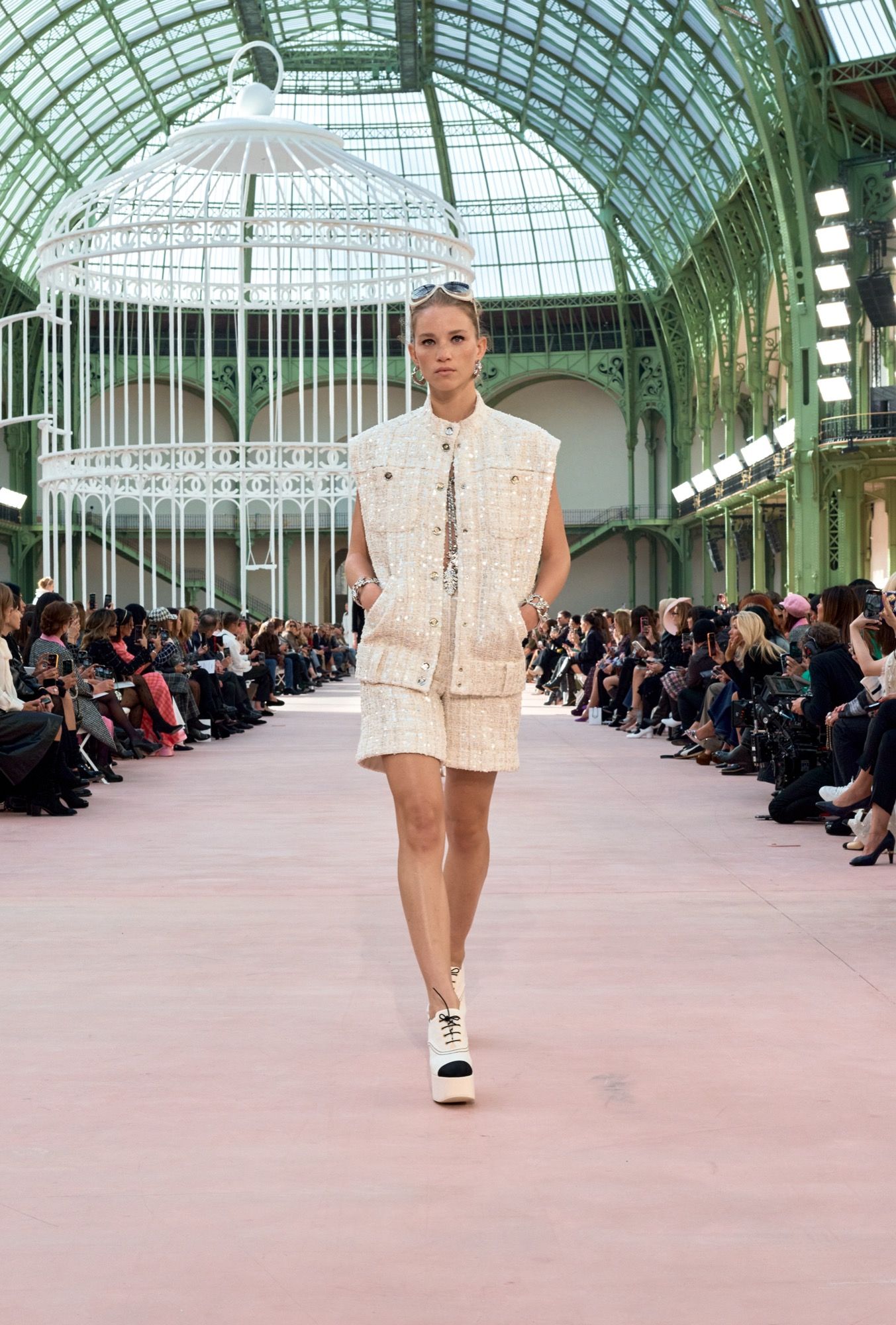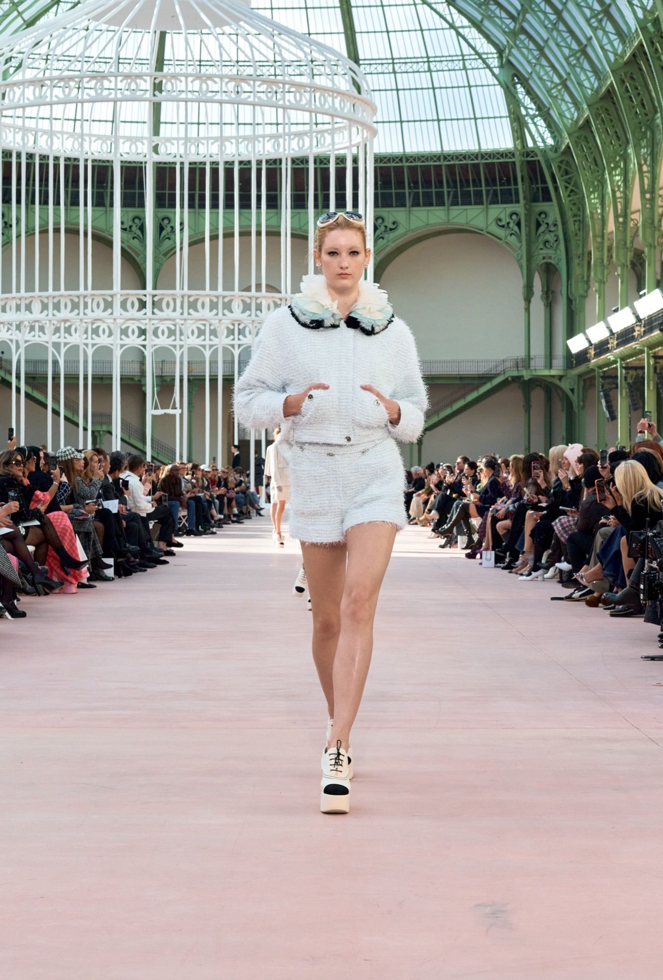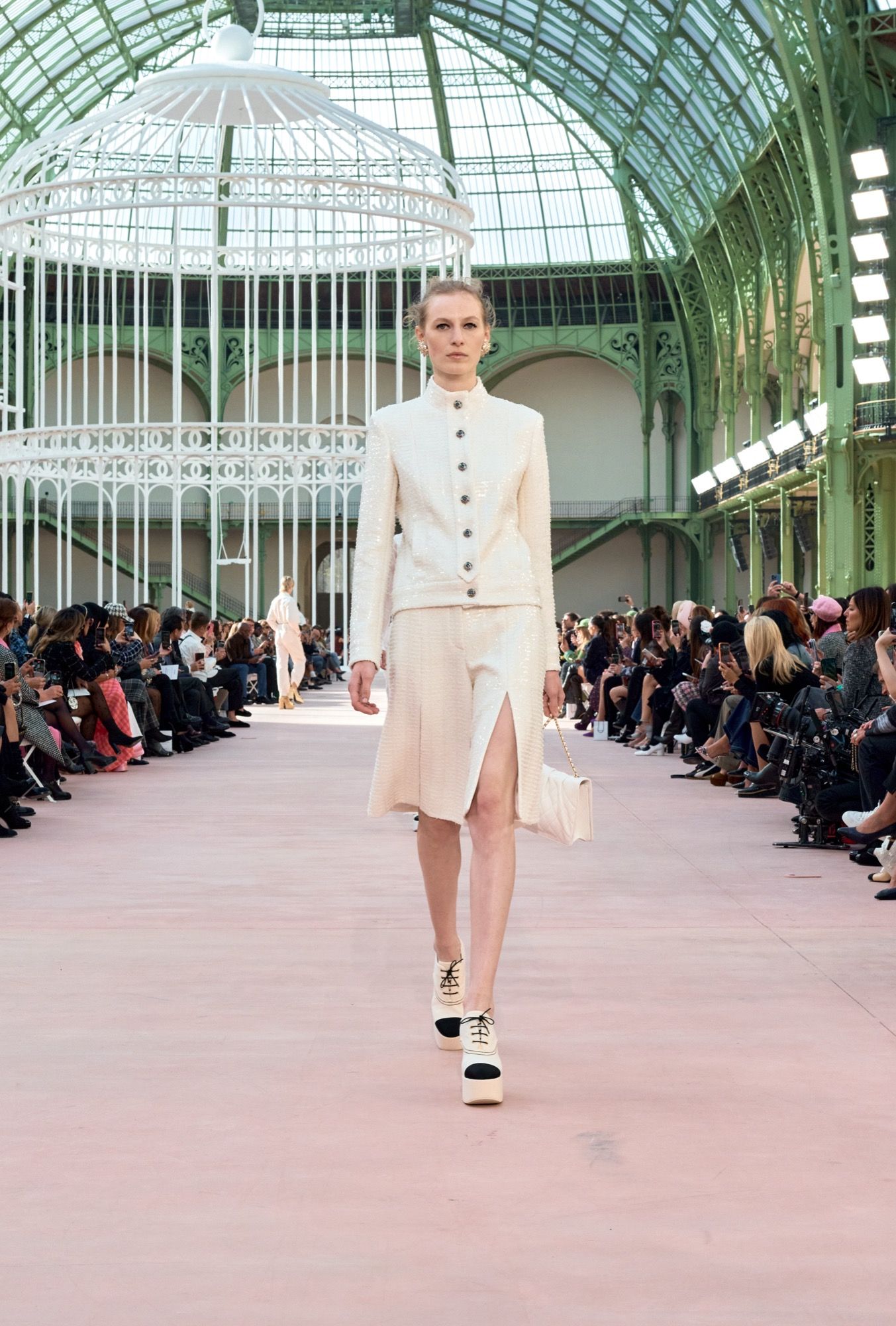 Con ben settantasette look che includevano modelle di età e di taglia differente (tra cui è tornata l’amata Jill Kortleve) la nuova collezione ha sfilato su un set privo di trucchi e smancerie, sebbene ambientato nel fantastico Grand Palais - sfondo, tra l’altro, delle ultime Olimpiadi. I primi outfit hanno dato un taglio netto al tradizionale tailleur Chanel, ringiovanito da spacchi e accorciamenti che hanno permesso alle cosce e alle pance di respirare, mentre hanno debuttato francesine platform in pieno stile anni ’30, ma rialzate da uno spesso pleateau bianco. Bomber in mohair color pastello hanno mostrato il lato più adorabile della maison, aggiungendo grandi colletti spumosi che evocavano l’immagine del fiore della camelia, storica icona del brand. Su tute workwear blu e color avorio sono stati accentuati i fianchi delle modelle con cinture di brillanti e poco dopo hanno fatto il loro ingresso un trench in pelle alquanto spigliato e un abito da sera nero glitterato.