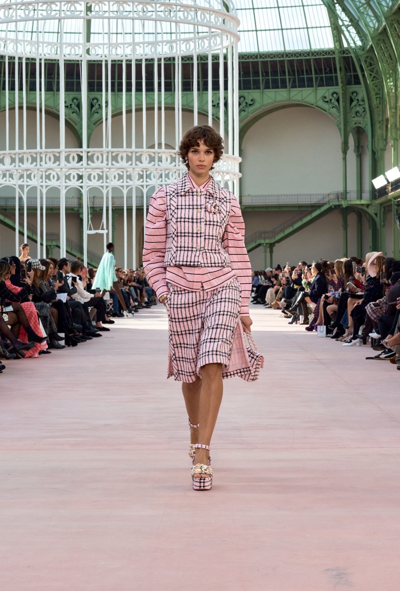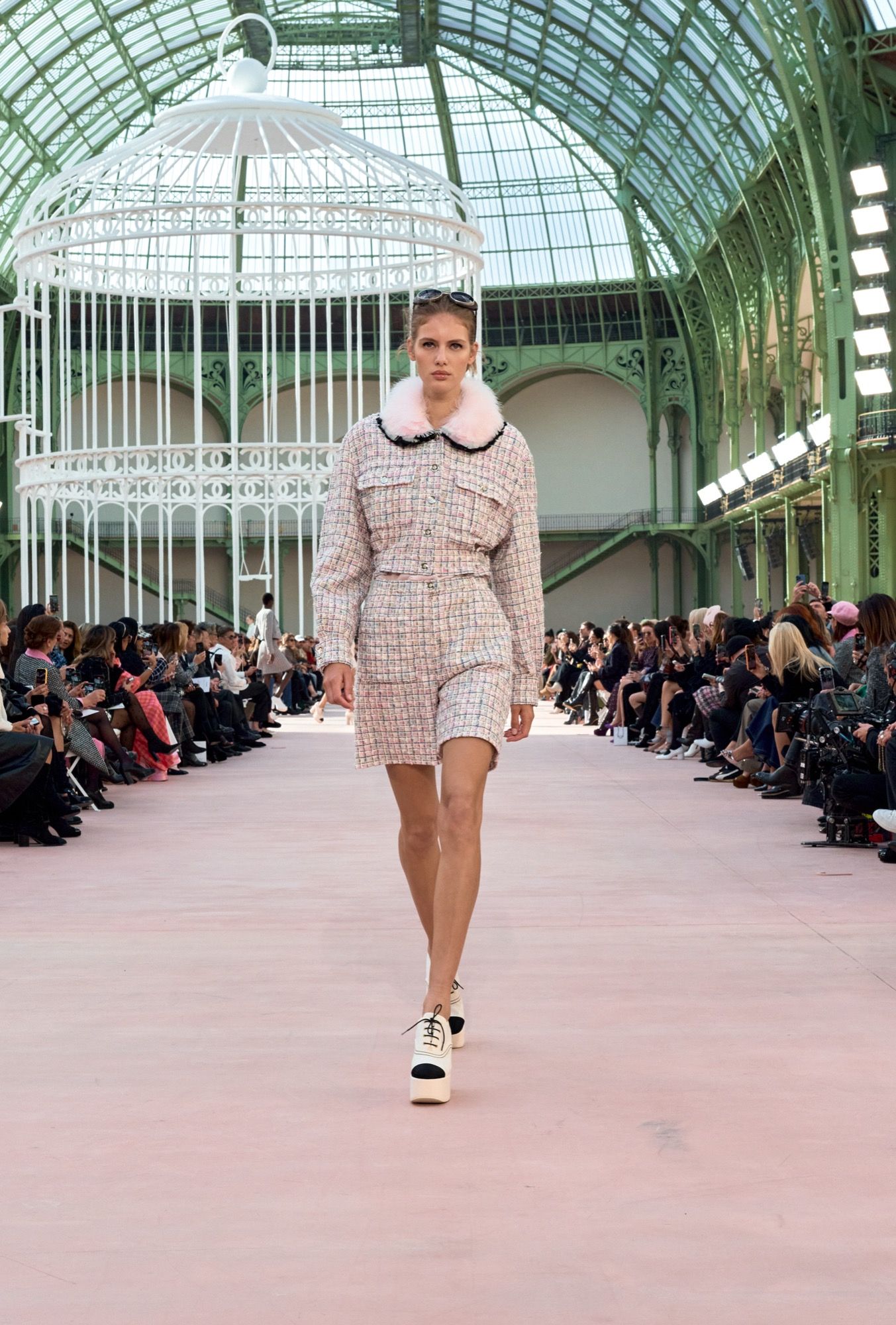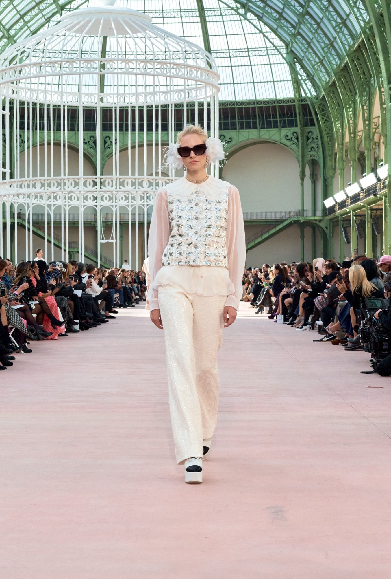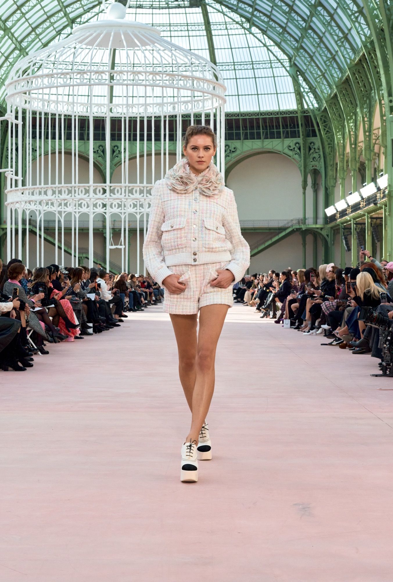 Con ben settantasette look che includevano modelle di età e di taglia differente (tra cui è tornata l’amata Jill Kortleve) la nuova collezione ha sfilato su un set privo di trucchi e smancerie, sebbene ambientato nel fantastico Grand Palais - sfondo, tra l’altro, delle ultime Olimpiadi. I primi outfit hanno dato un taglio netto al tradizionale tailleur Chanel, ringiovanito da spacchi e accorciamenti che hanno permesso alle cosce e alle pance di respirare, mentre hanno debuttato francesine platform in pieno stile anni ’30, ma rialzate da uno spesso pleateau bianco. Bomber in mohair color pastello hanno mostrato il lato più adorabile della maison, aggiungendo grandi colletti spumosi che evocavano l’immagine del fiore della camelia, storica icona del brand. Su tute workwear blu e color avorio sono stati accentuati i fianchi delle modelle con cinture di brillanti e poco dopo hanno fatto il loro ingresso un trench in pelle alquanto spigliato e un abito da sera nero glitterato.