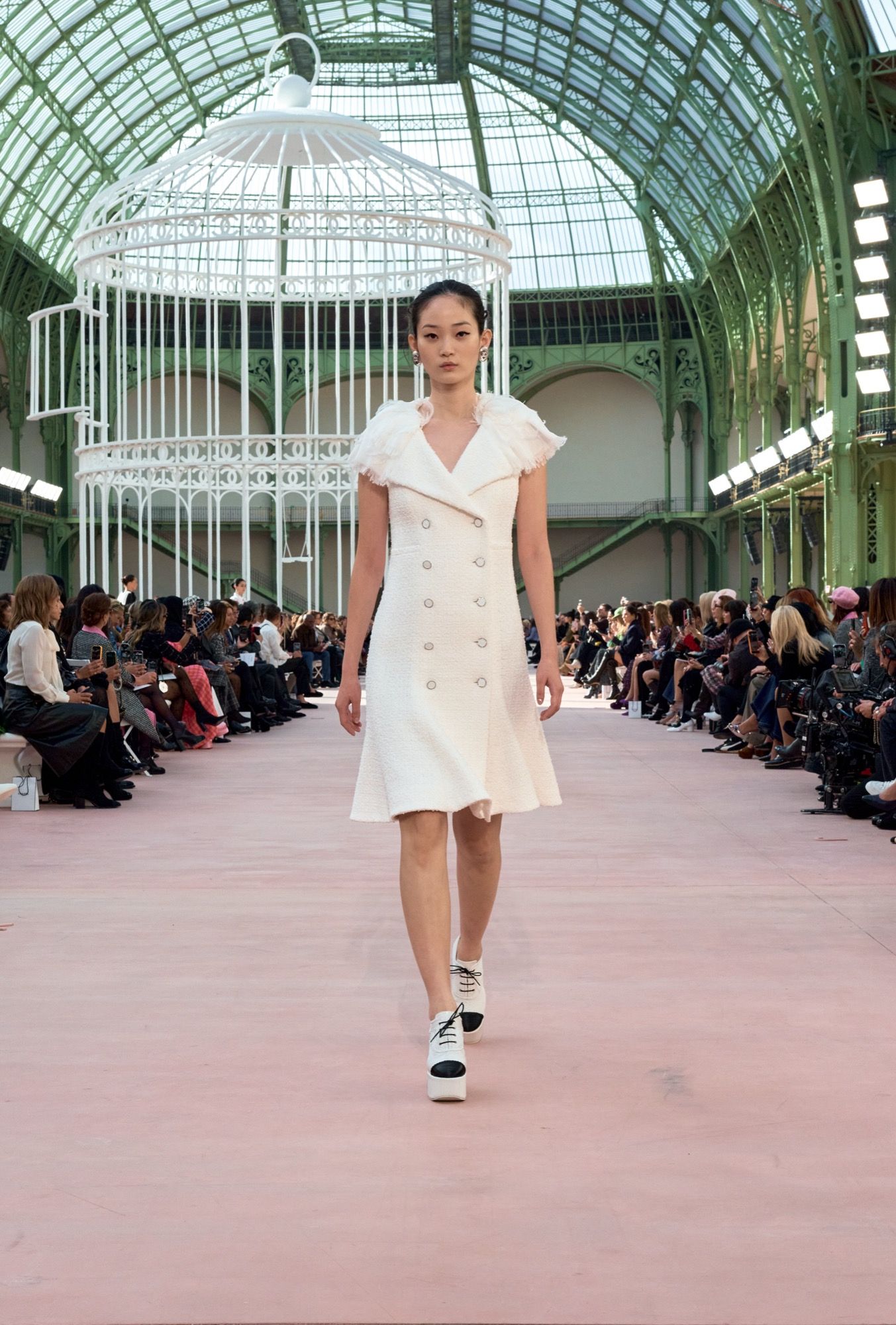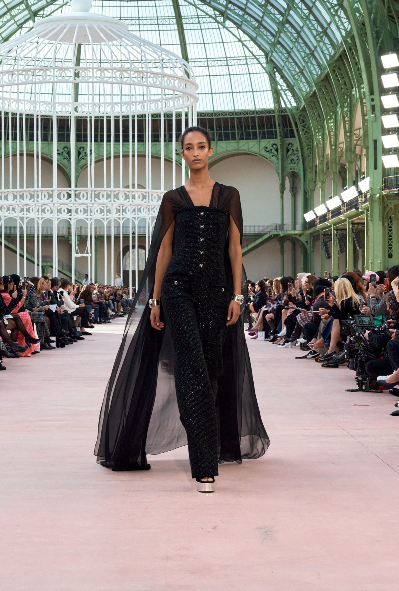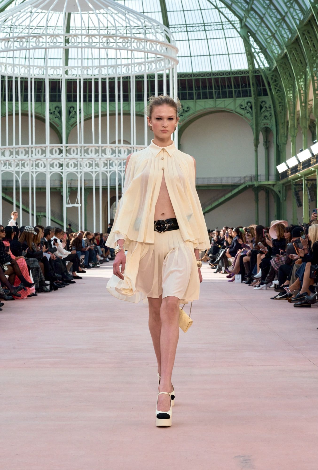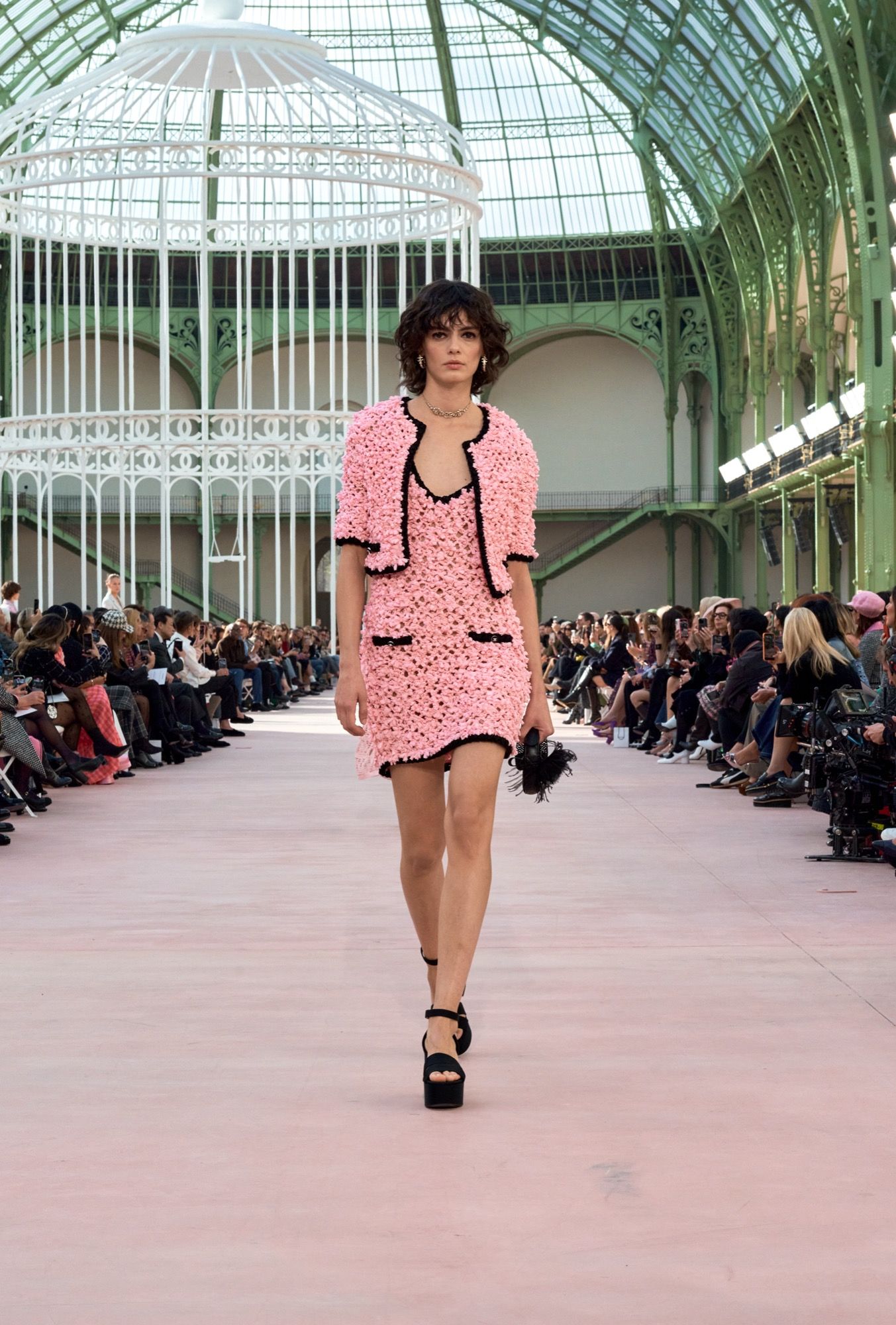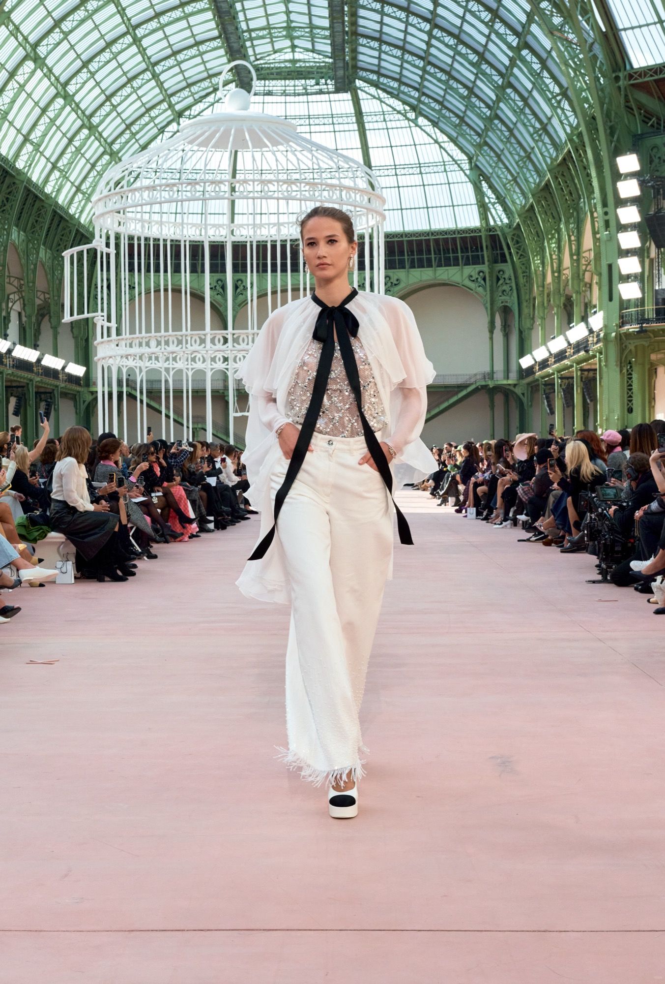Con ben settantasette look che includevano modelle di età e di taglia differente (tra cui è tornata l’amata Jill Kortleve) la nuova collezione ha sfilato su un set privo di trucchi e smancerie, sebbene ambientato nel fantastico Grand Palais - sfondo, tra l’altro, delle ultime Olimpiadi. I primi outfit hanno dato un taglio netto al tradizionale tailleur Chanel, ringiovanito da spacchi e accorciamenti che hanno permesso alle cosce e alle pance di respirare, mentre hanno debuttato francesine platform in pieno stile anni ’30, ma rialzate da uno spesso pleateau bianco. Bomber in mohair color pastello hanno mostrato il lato più adorabile della maison, aggiungendo grandi colletti spumosi che evocavano l’immagine del fiore della camelia, storica icona del brand. Su tute workwear blu e color avorio sono stati accentuati i fianchi delle modelle con cinture di brillanti e poco dopo hanno fatto il loro ingresso un trench in pelle alquanto spigliato e un abito da sera nero glitterato.
