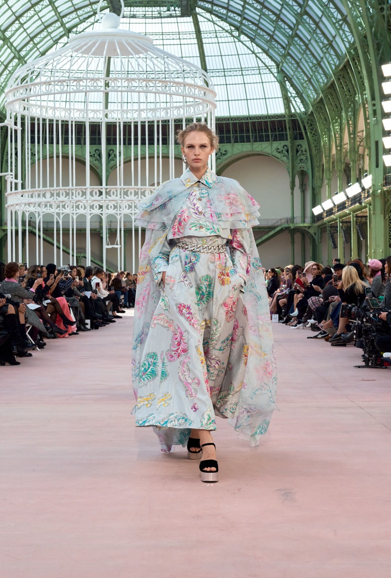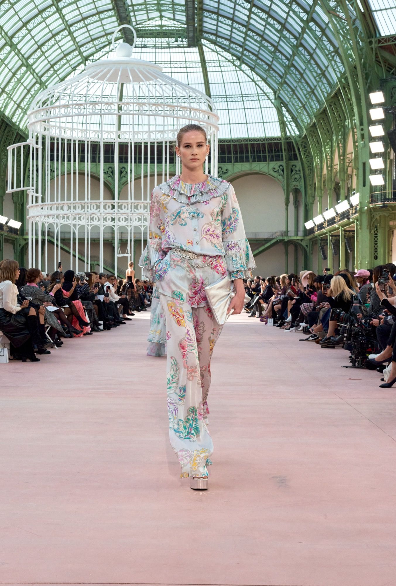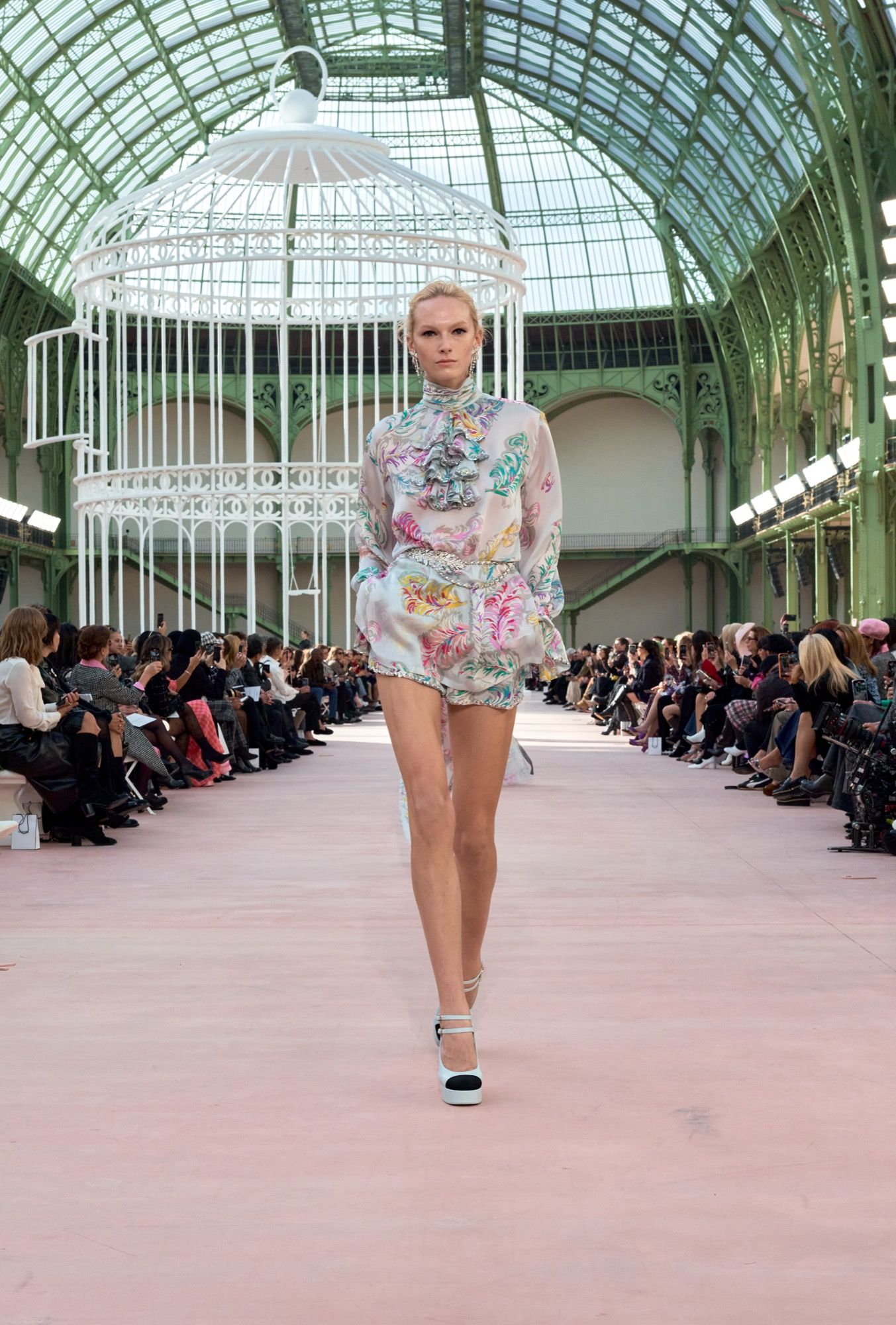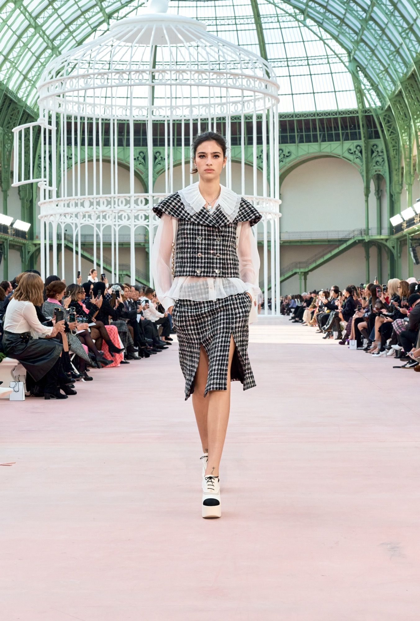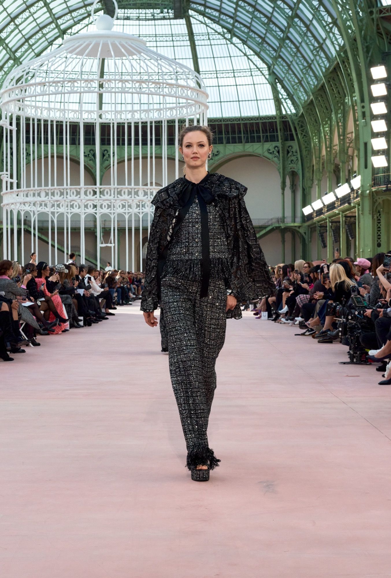 Con ben settantasette look che includevano modelle di età e di taglia differente (tra cui è tornata l’amata Jill Kortleve) la nuova collezione ha sfilato su un set privo di trucchi e smancerie, sebbene ambientato nel fantastico Grand Palais - sfondo, tra l’altro, delle ultime Olimpiadi. I primi outfit hanno dato un taglio netto al tradizionale tailleur Chanel, ringiovanito da spacchi e accorciamenti che hanno permesso alle cosce e alle pance di respirare, mentre hanno debuttato francesine platform in pieno stile anni ’30, ma rialzate da uno spesso pleateau bianco. Bomber in mohair color pastello hanno mostrato il lato più adorabile della maison, aggiungendo grandi colletti spumosi che evocavano l’immagine del fiore della camelia, storica icona del brand. Su tute workwear blu e color avorio sono stati accentuati i fianchi delle modelle con cinture di brillanti e poco dopo hanno fatto il loro ingresso un trench in pelle alquanto spigliato e un abito da sera nero glitterato.