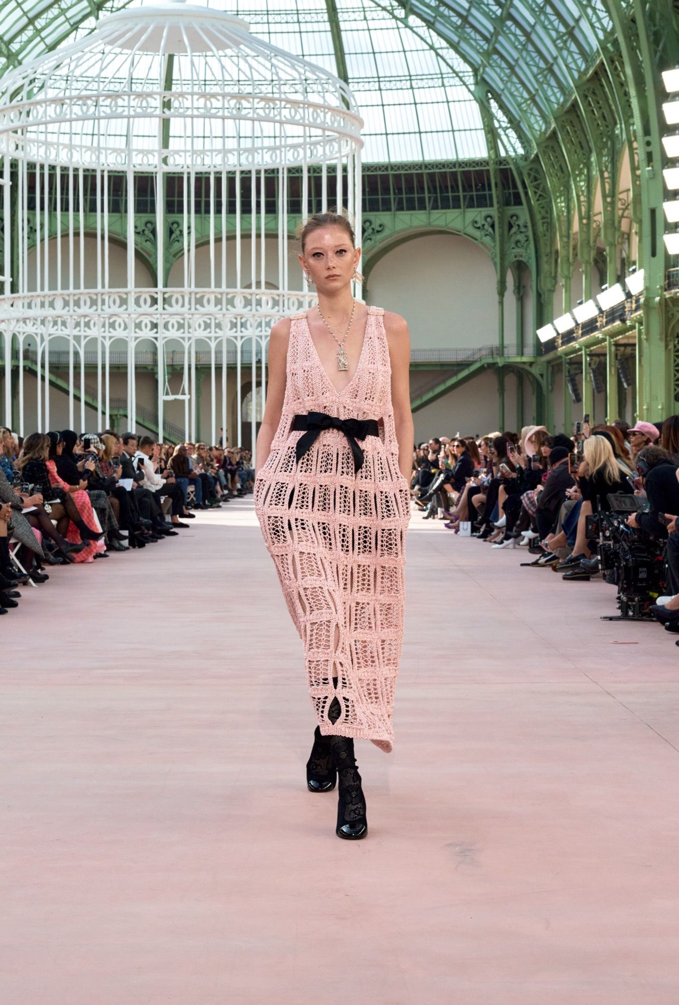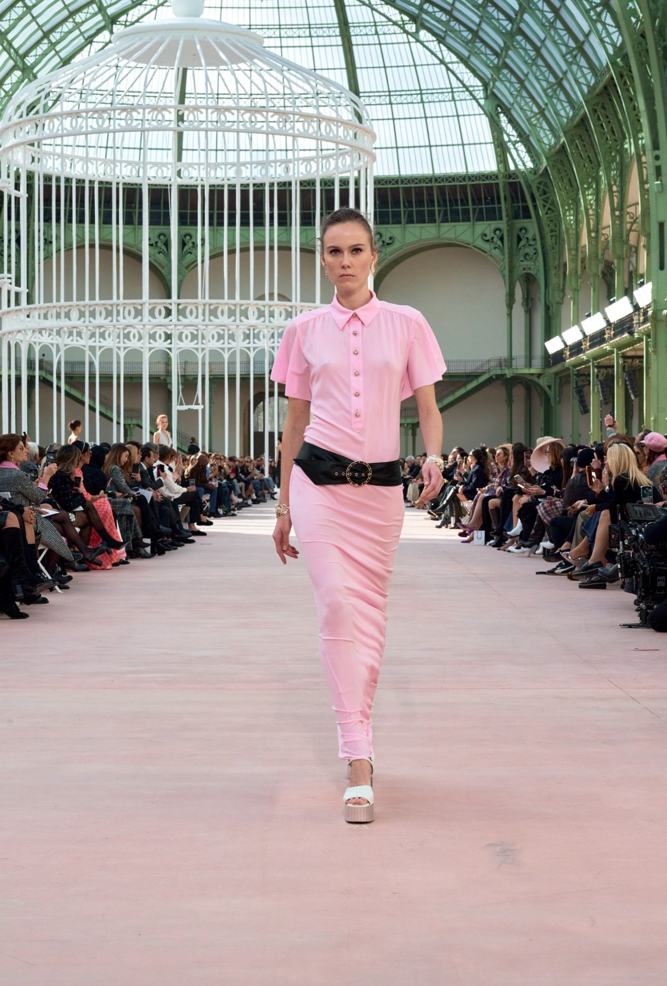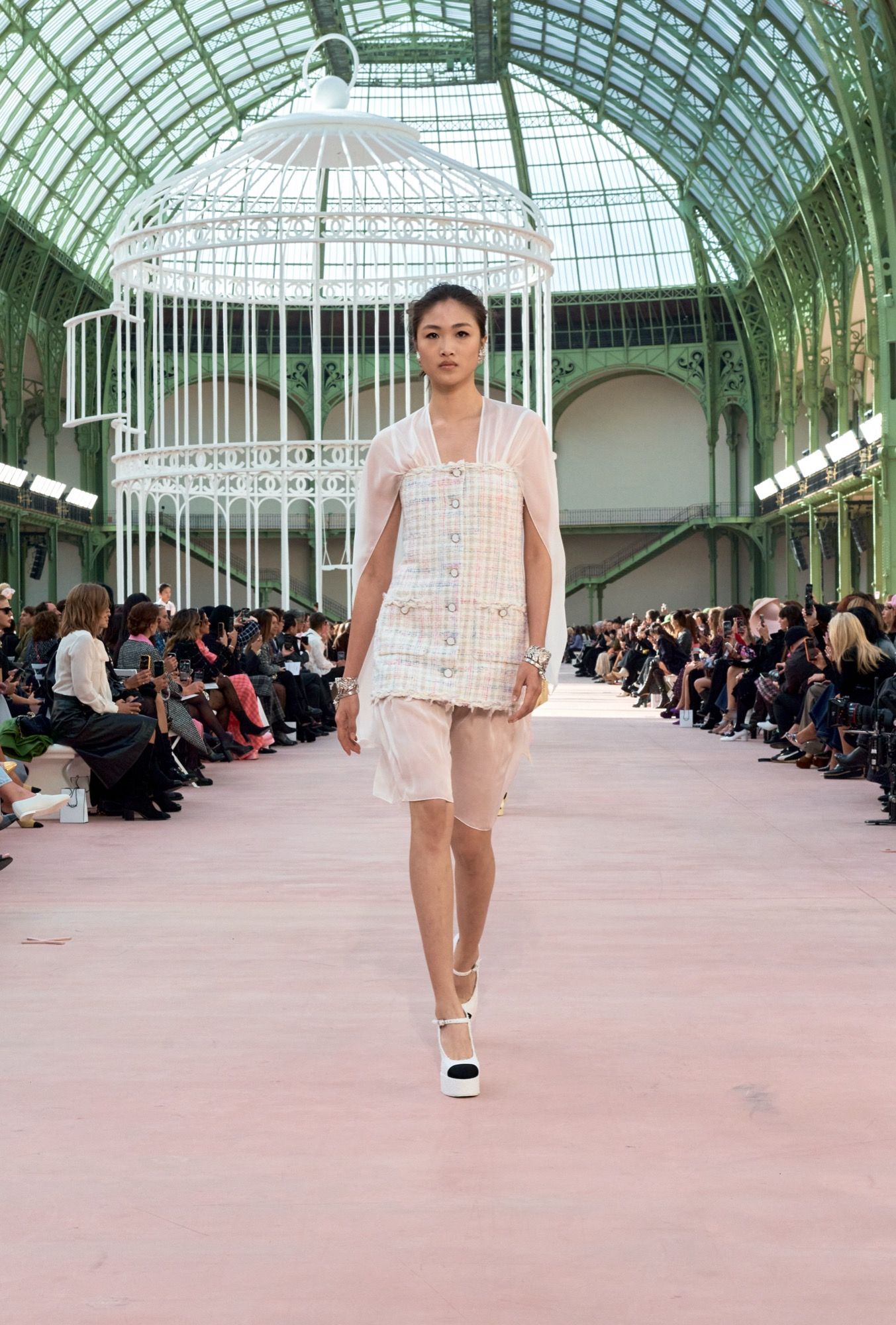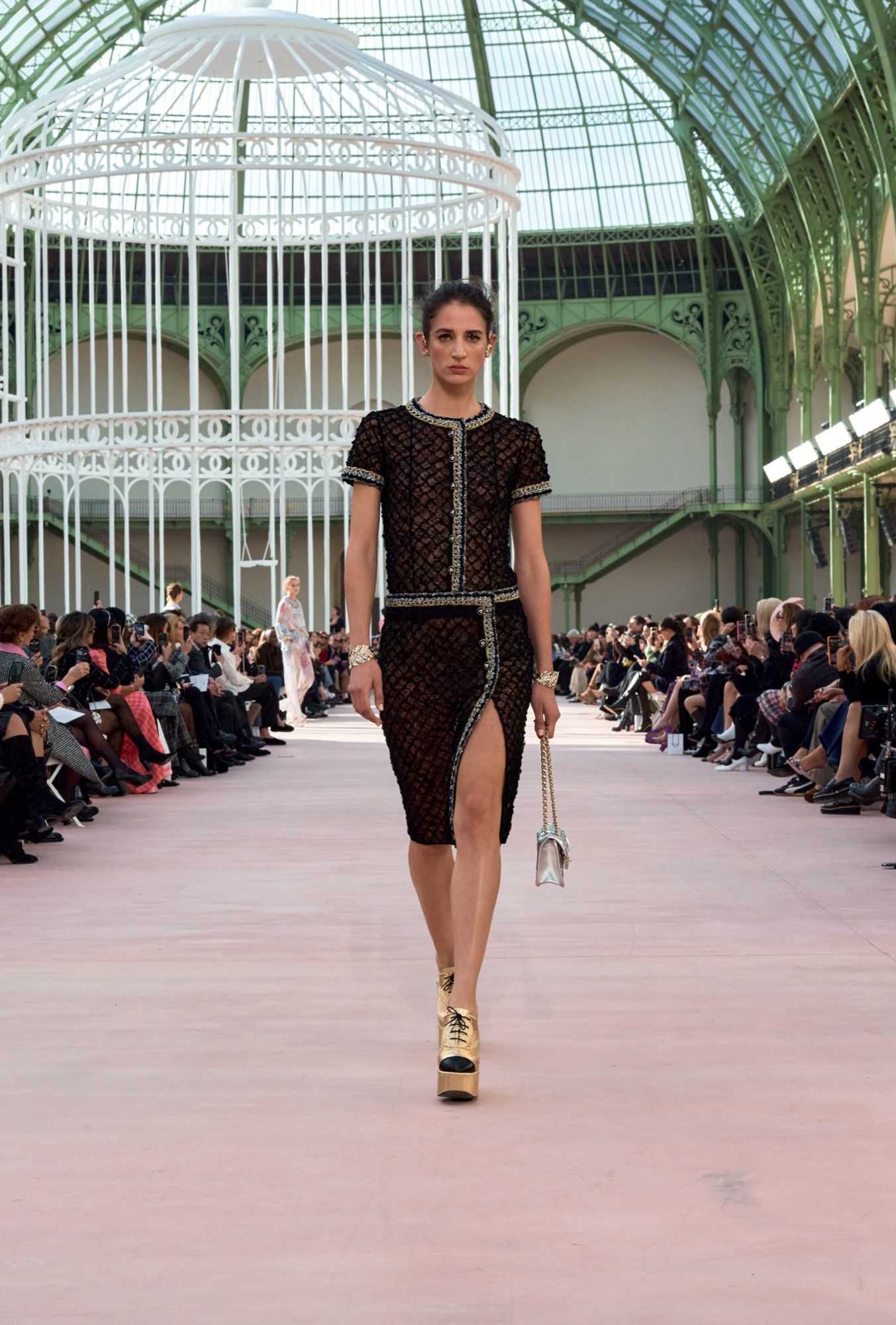 Con ben settantasette look che includevano modelle di età e di taglia differente (tra cui è tornata l’amata Jill Kortleve) la nuova collezione ha sfilato su un set privo di trucchi e smancerie, sebbene ambientato nel fantastico Grand Palais - sfondo, tra l’altro, delle ultime Olimpiadi. I primi outfit hanno dato un taglio netto al tradizionale tailleur Chanel, ringiovanito da spacchi e accorciamenti che hanno permesso alle cosce e alle pance di respirare, mentre hanno debuttato francesine platform in pieno stile anni ’30, ma rialzate da uno spesso pleateau bianco. Bomber in mohair color pastello hanno mostrato il lato più adorabile della maison, aggiungendo grandi colletti spumosi che evocavano l’immagine del fiore della camelia, storica icona del brand. Su tute workwear blu e color avorio sono stati accentuati i fianchi delle modelle con cinture di brillanti e poco dopo hanno fatto il loro ingresso un trench in pelle alquanto spigliato e un abito da sera nero glitterato.