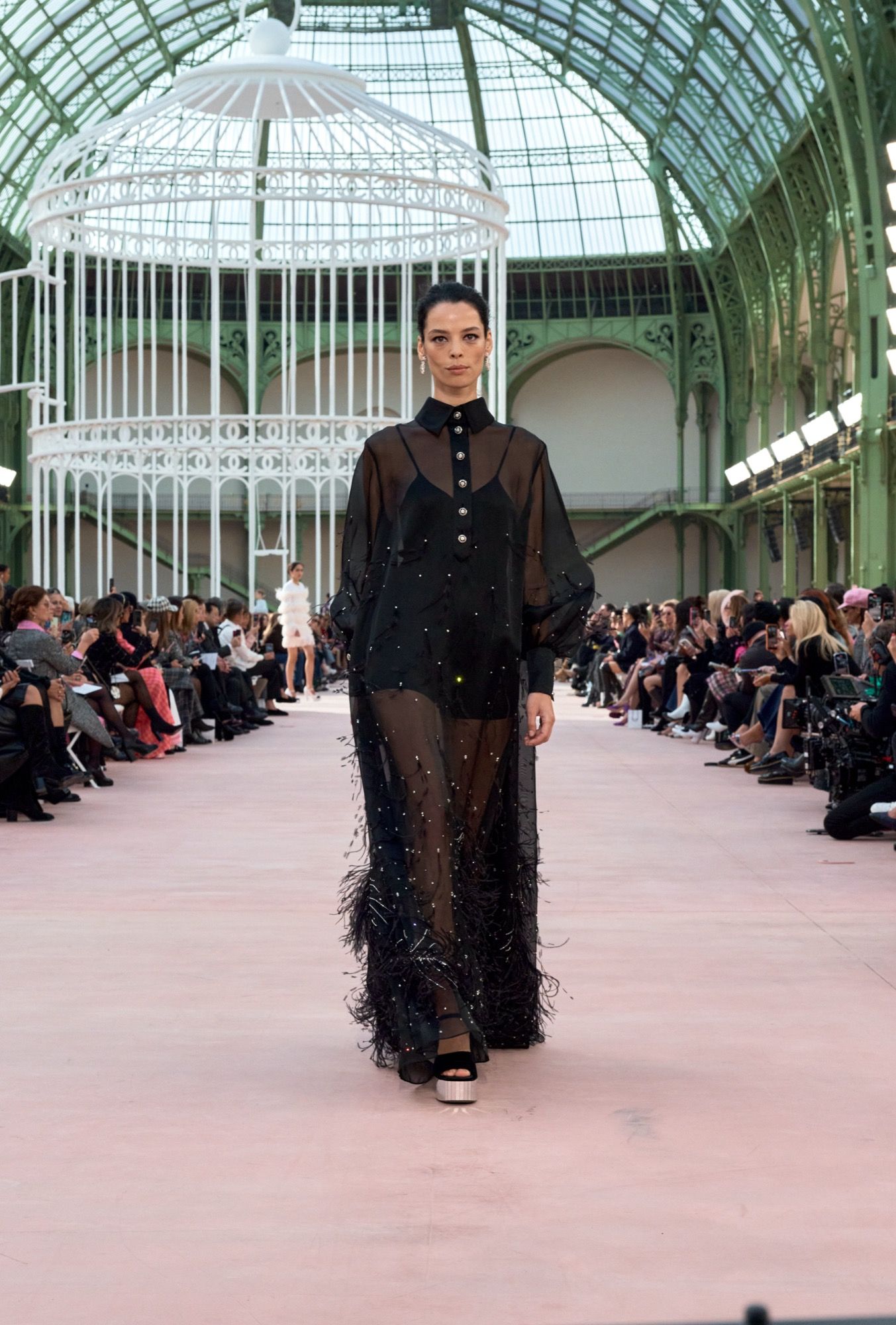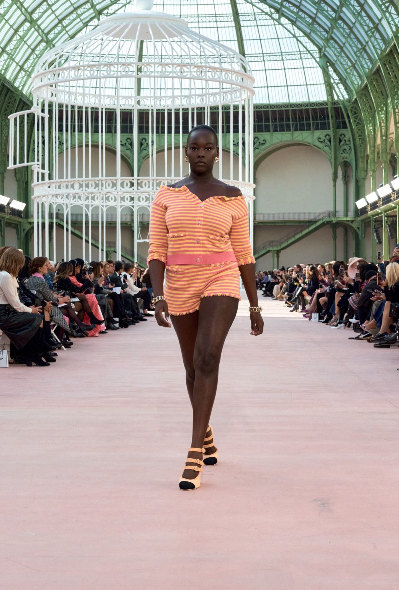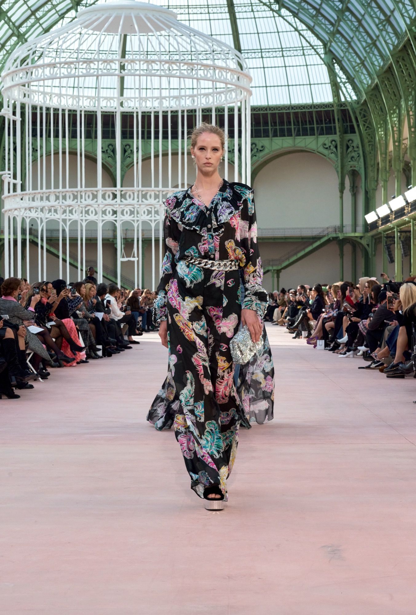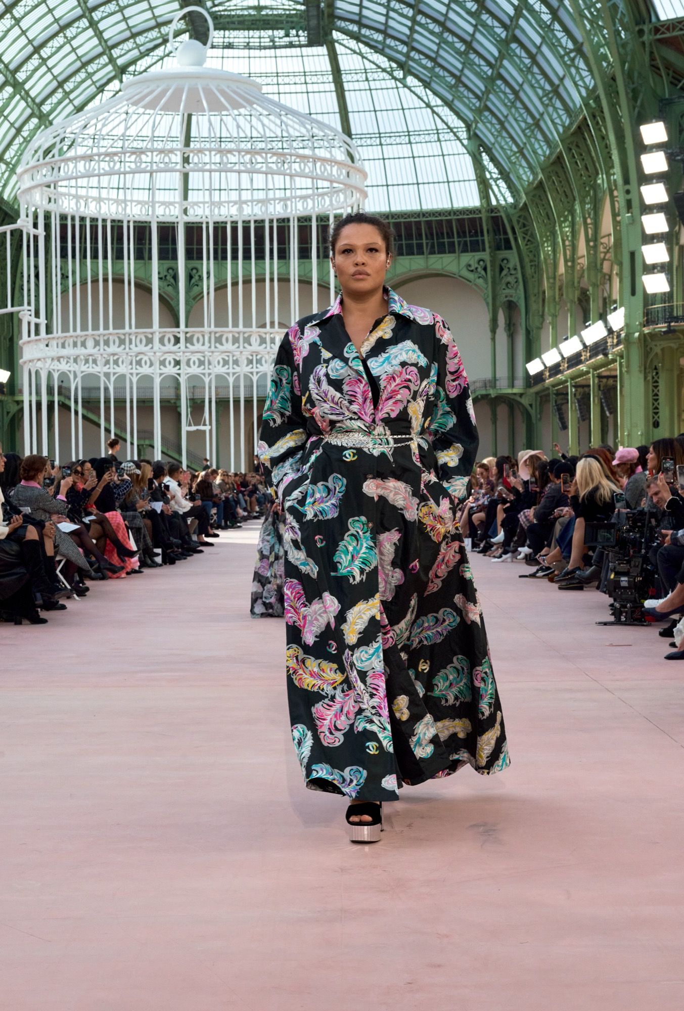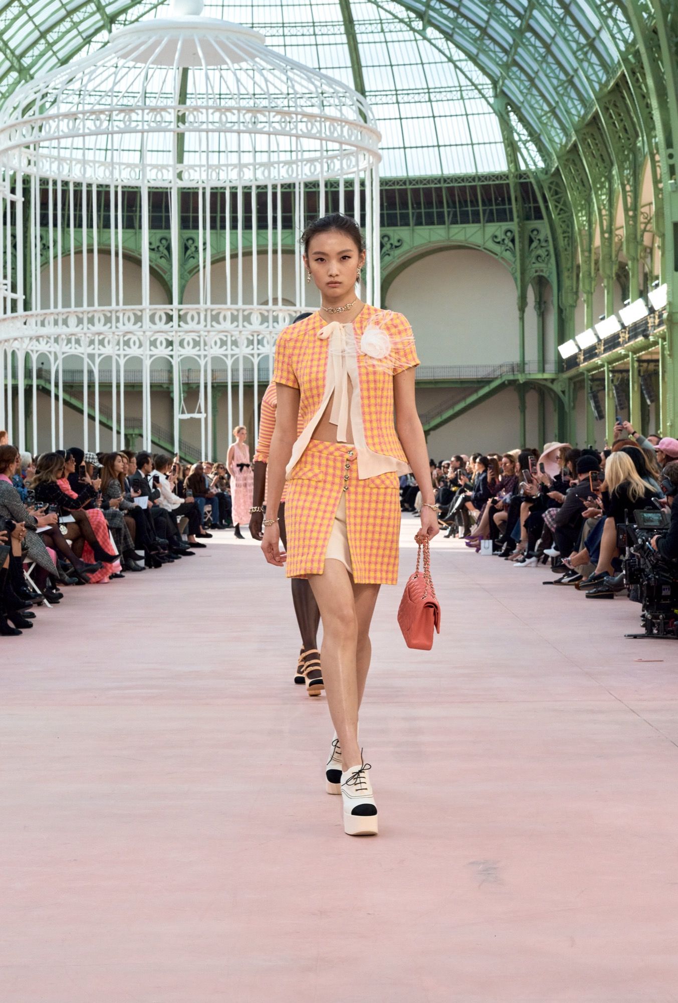 Con ben settantasette look che includevano modelle di età e di taglia differente (tra cui è tornata l’amata Jill Kortleve) la nuova collezione ha sfilato su un set privo di trucchi e smancerie, sebbene ambientato nel fantastico Grand Palais - sfondo, tra l’altro, delle ultime Olimpiadi. I primi outfit hanno dato un taglio netto al tradizionale tailleur Chanel, ringiovanito da spacchi e accorciamenti che hanno permesso alle cosce e alle pance di respirare, mentre hanno debuttato francesine platform in pieno stile anni ’30, ma rialzate da uno spesso pleateau bianco. Bomber in mohair color pastello hanno mostrato il lato più adorabile della maison, aggiungendo grandi colletti spumosi che evocavano l’immagine del fiore della camelia, storica icona del brand. Su tute workwear blu e color avorio sono stati accentuati i fianchi delle modelle con cinture di brillanti e poco dopo hanno fatto il loro ingresso un trench in pelle alquanto spigliato e un abito da sera nero glitterato.