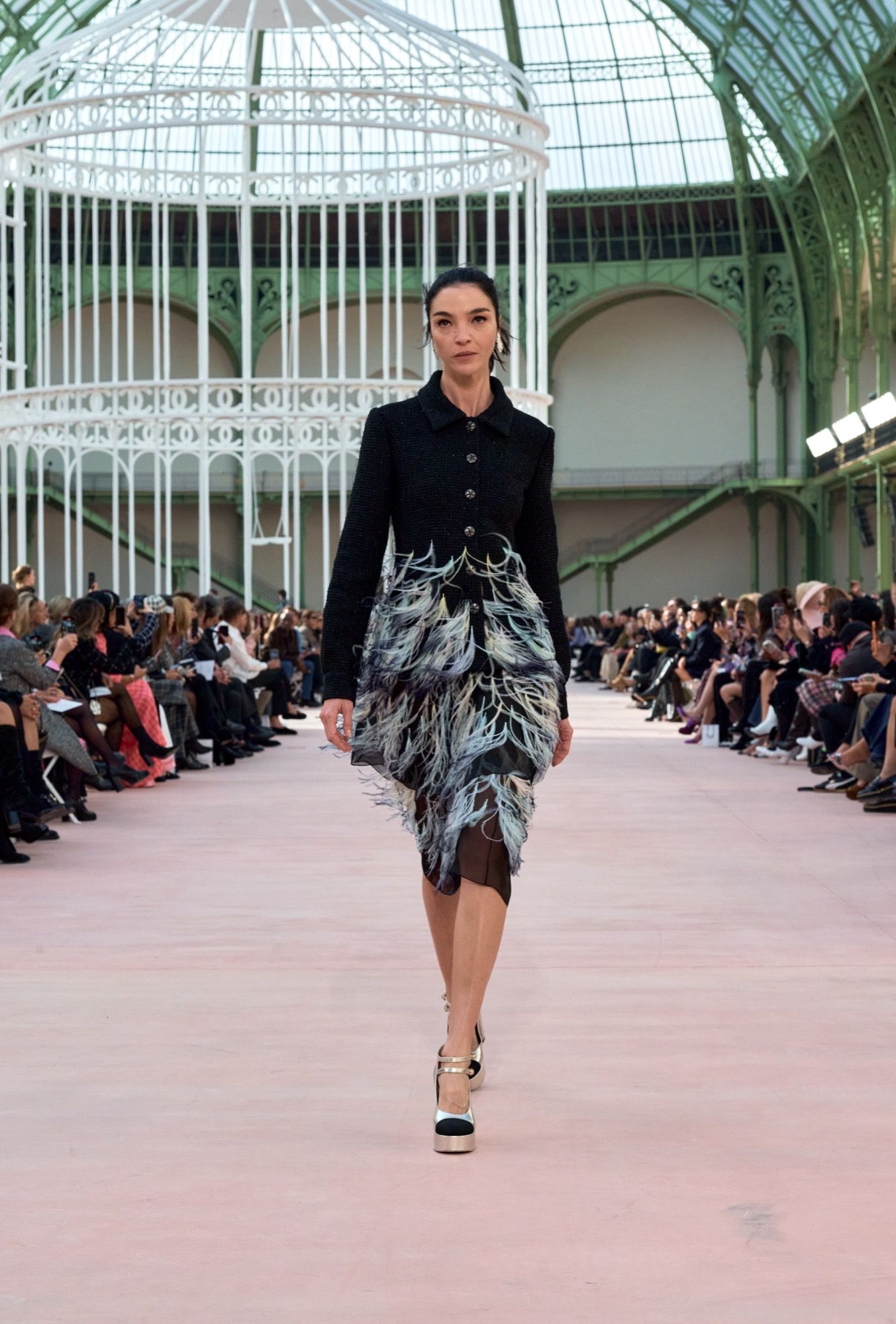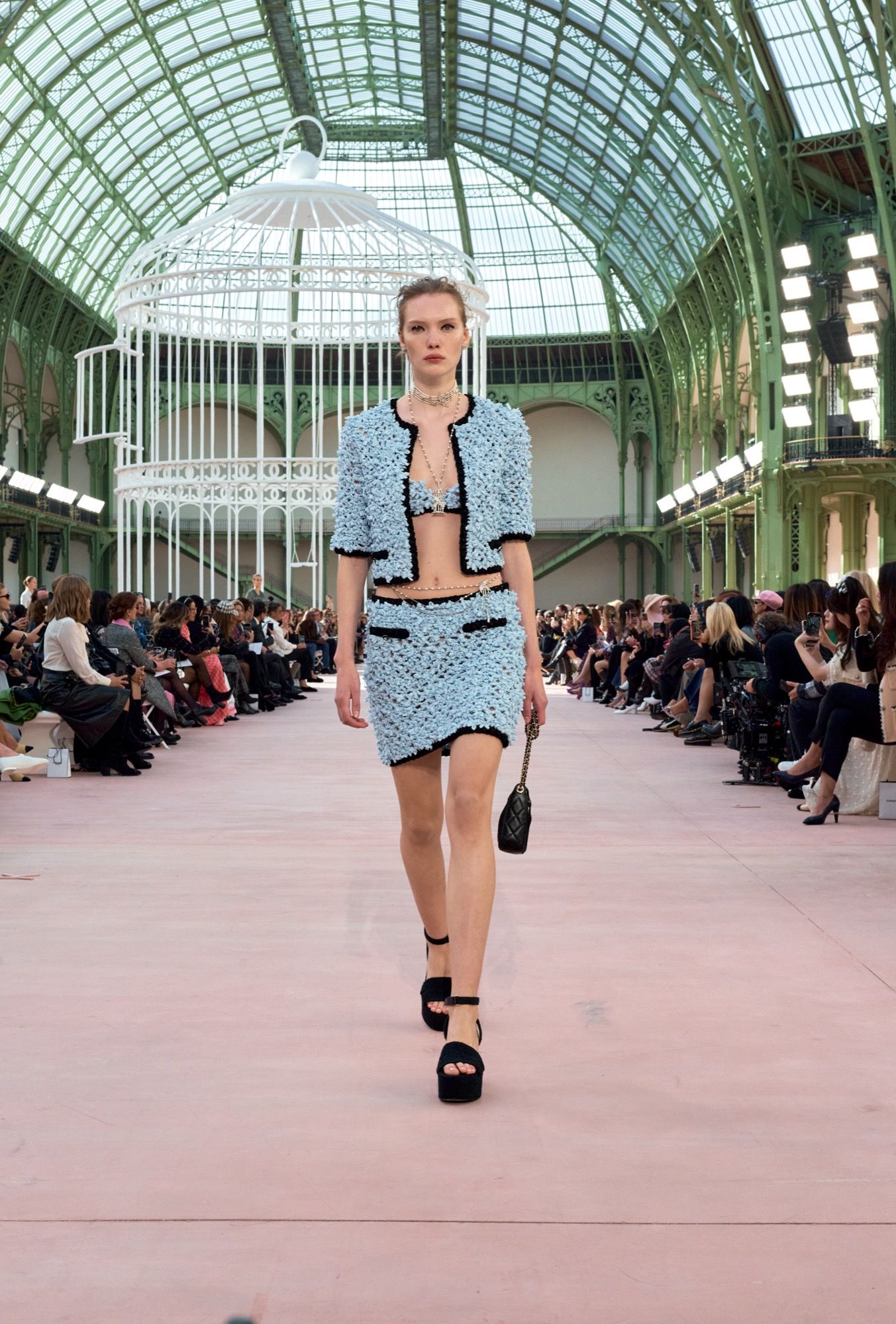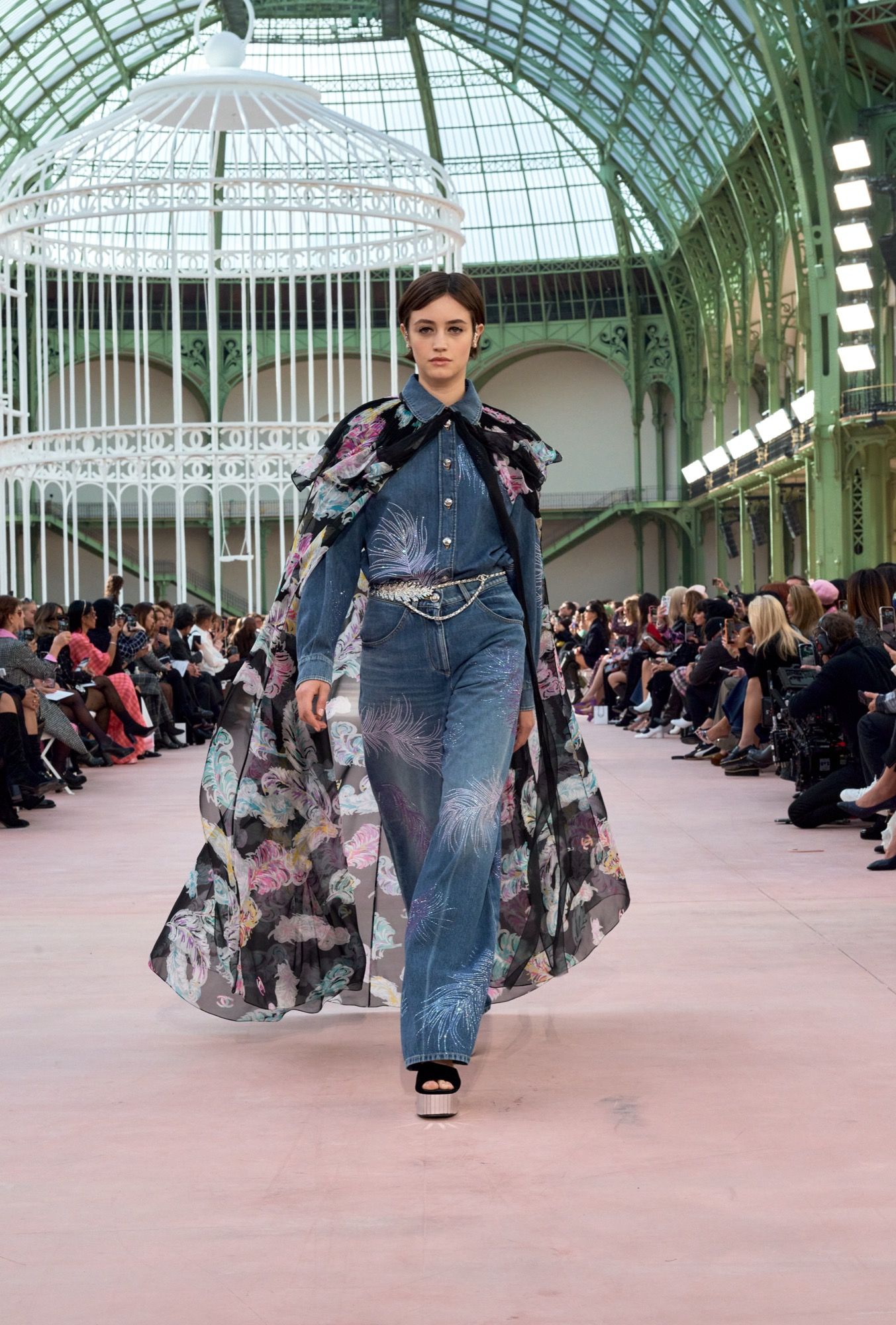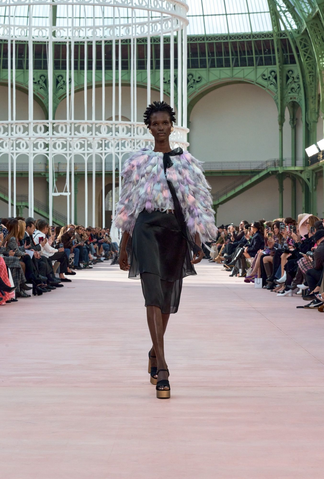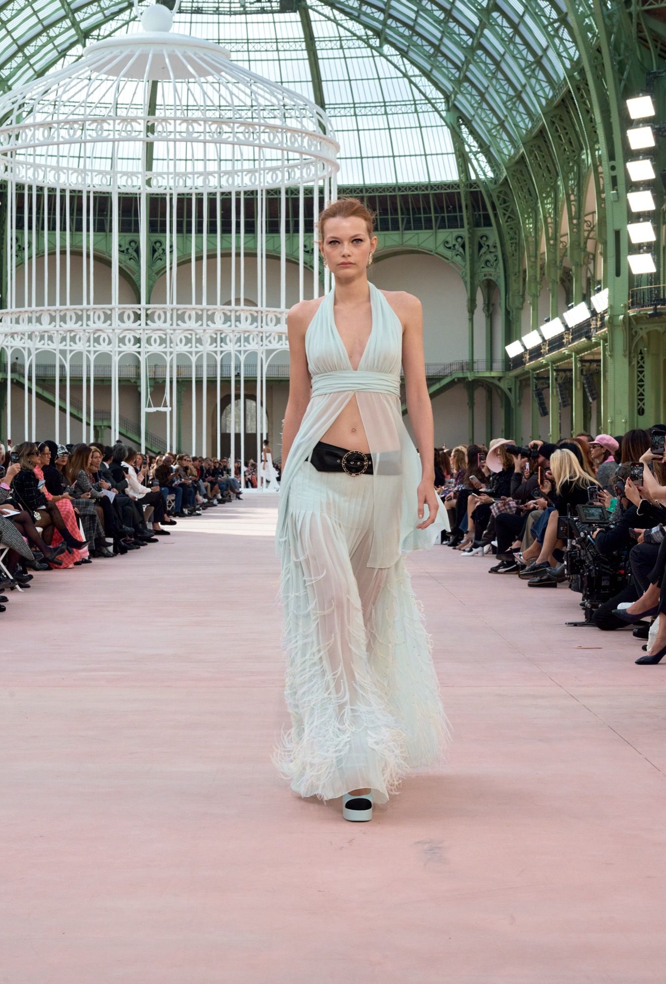 Lo show comincia a fare sul serio portando sotto i riflettori dolci completi in cotone a scacchi e a righe color sorbetto, reggiseni a vista in pendant con il set abbinato, che ricordavano lo Chanel anni ’90 di Lagerfeld, o ancora lunghi abiti in maglia larga vedo-non-vedo, anche loro con il punto vita messo in risalto da una cintura. Le proposte in pizzo nero hanno dimostrato nuovamente il lato più suntuoso della maison, con abiti a fiori che riprendevano simpaticamente lo stesso motivo riportato sui calzini. Diversi look riportano una stampa antica in azzurro gentile e piume colorate su mantelle, ampie gonne e camicioni, ma poi il denim ha rispolverato lo stile riportando lo stesso piumaggio sotto forma di strass in silhouette moderne. È sul finale che Chanel prende il volo, grazie ad abiti in piume che coprono gli orli delle giacche e dei vestiti, un’altra tuta, questa volta in seta, impreziosita da una pesante catena argentata sui fianchi, e un sovrabito trasparente che rivela un piccolo bodycon suit aderente. Un look verde acqua anni 2000 che include gonna plissettata a vita bassa, tank top trasparente e una spessa cintura in pelle nera sgancia definitivamente Chanel dalla visione agé che la fashion industry si era fatta del brand durante le precedenti stagioni: con uno show “di pancia”, l’ufficio stile della storica maison ha dimostrato di non aver paura di rinnovarsi. Per farlo al meglio, basterà l’aiuto di un designer geniale.