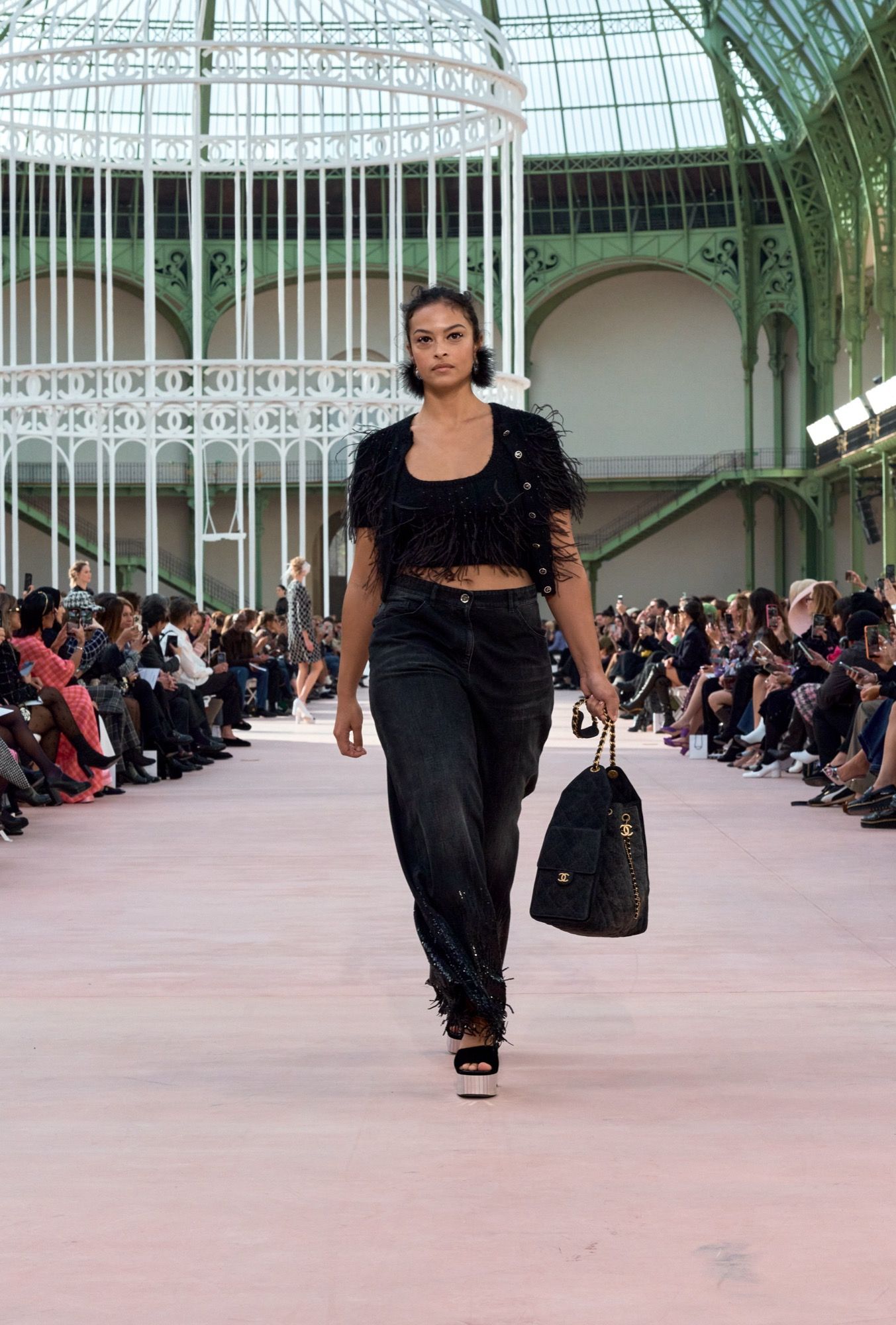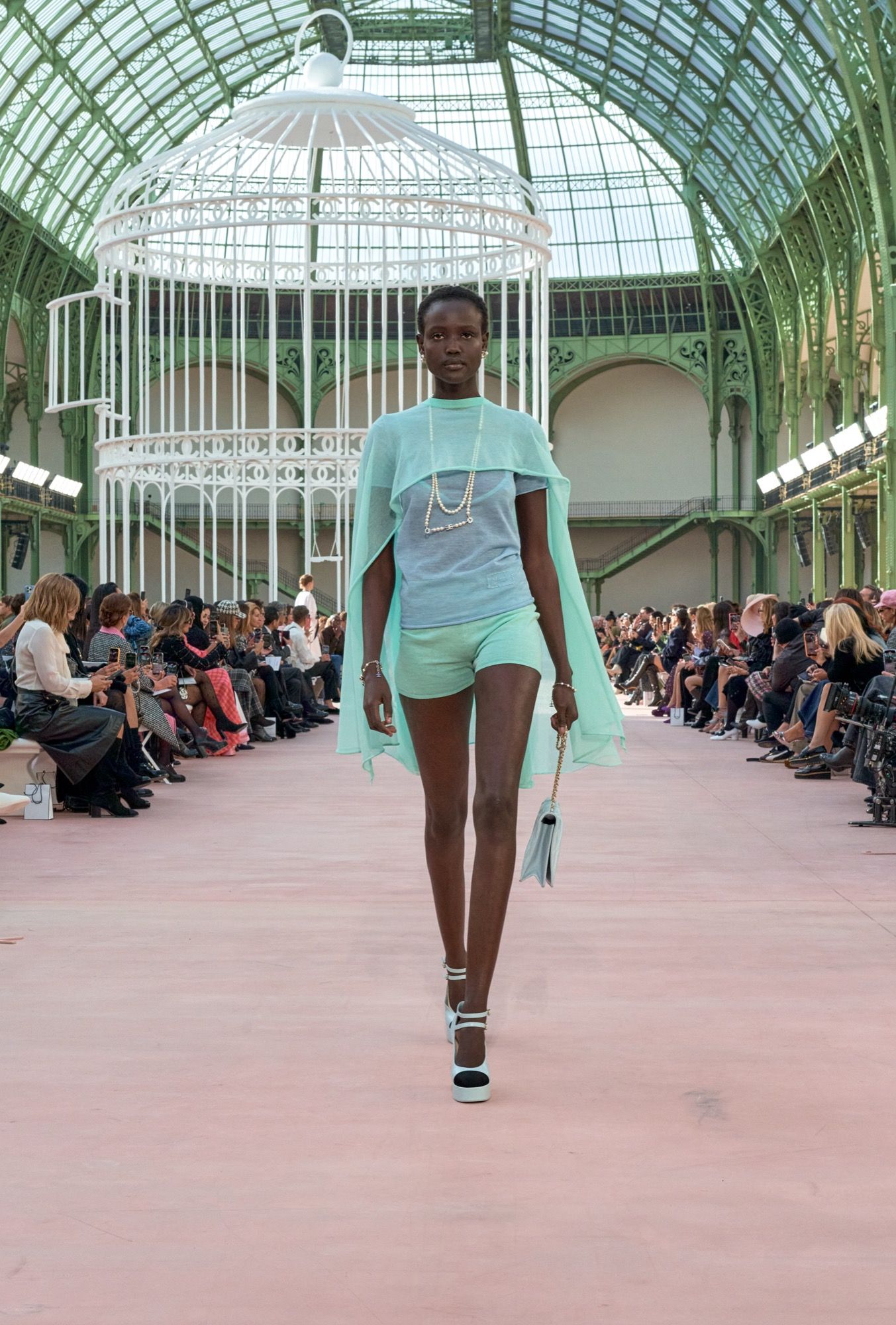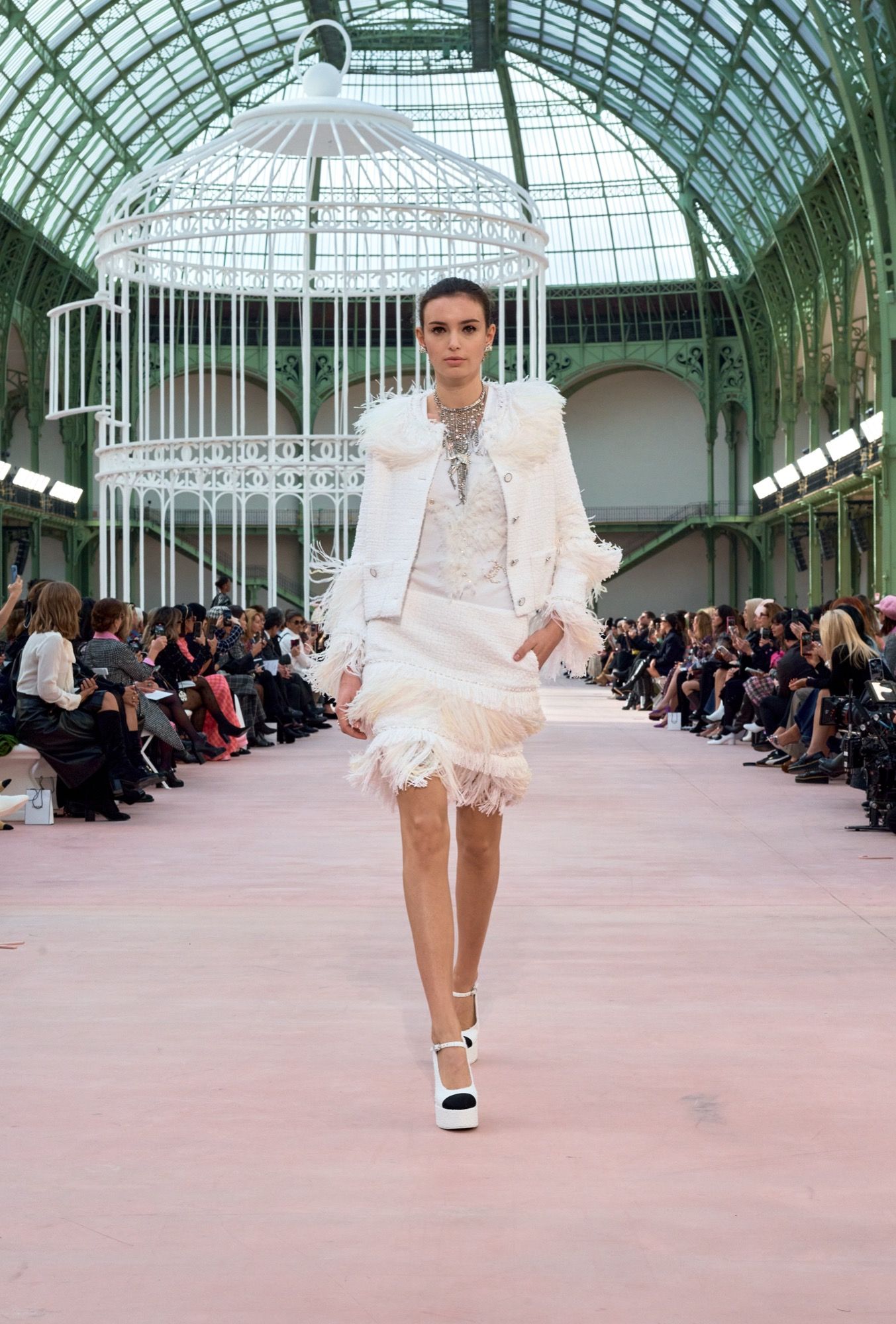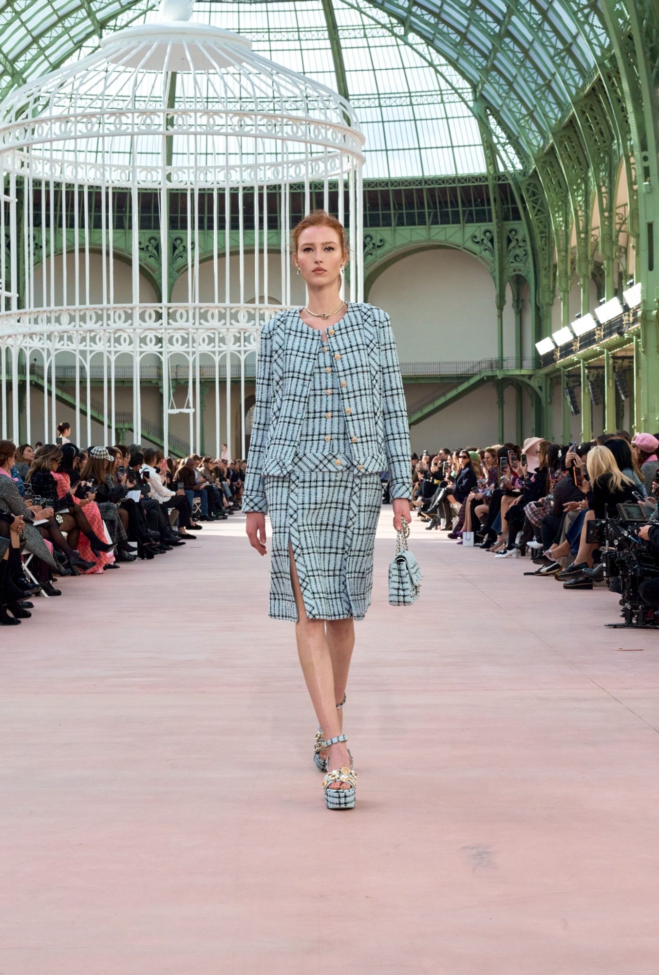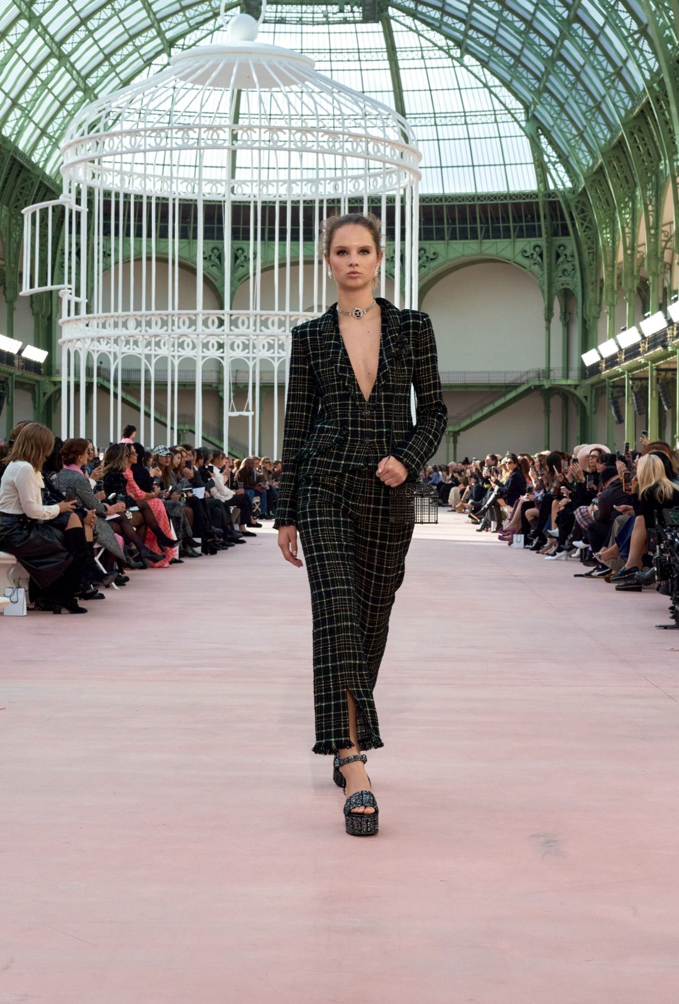 Lo show comincia a fare sul serio portando sotto i riflettori dolci completi in cotone a scacchi e a righe color sorbetto, reggiseni a vista in pendant con il set abbinato, che ricordavano lo Chanel anni ’90 di Lagerfeld, o ancora lunghi abiti in maglia larga vedo-non-vedo, anche loro con il punto vita messo in risalto da una cintura. Le proposte in pizzo nero hanno dimostrato nuovamente il lato più suntuoso della maison, con abiti a fiori che riprendevano simpaticamente lo stesso motivo riportato sui calzini. Diversi look riportano una stampa antica in azzurro gentile e piume colorate su mantelle, ampie gonne e camicioni, ma poi il denim ha rispolverato lo stile riportando lo stesso piumaggio sotto forma di strass in silhouette moderne. È sul finale che Chanel prende il volo, grazie ad abiti in piume che coprono gli orli delle giacche e dei vestiti, un’altra tuta, questa volta in seta, impreziosita da una pesante catena argentata sui fianchi, e un sovrabito trasparente che rivela un piccolo bodycon suit aderente. Un look verde acqua anni 2000 che include gonna plissettata a vita bassa, tank top trasparente e una spessa cintura in pelle nera sgancia definitivamente Chanel dalla visione agé che la fashion industry si era fatta del brand durante le precedenti stagioni: con uno show “di pancia”, l’ufficio stile della storica maison ha dimostrato di non aver paura di rinnovarsi. Per farlo al meglio, basterà l’aiuto di un designer geniale.