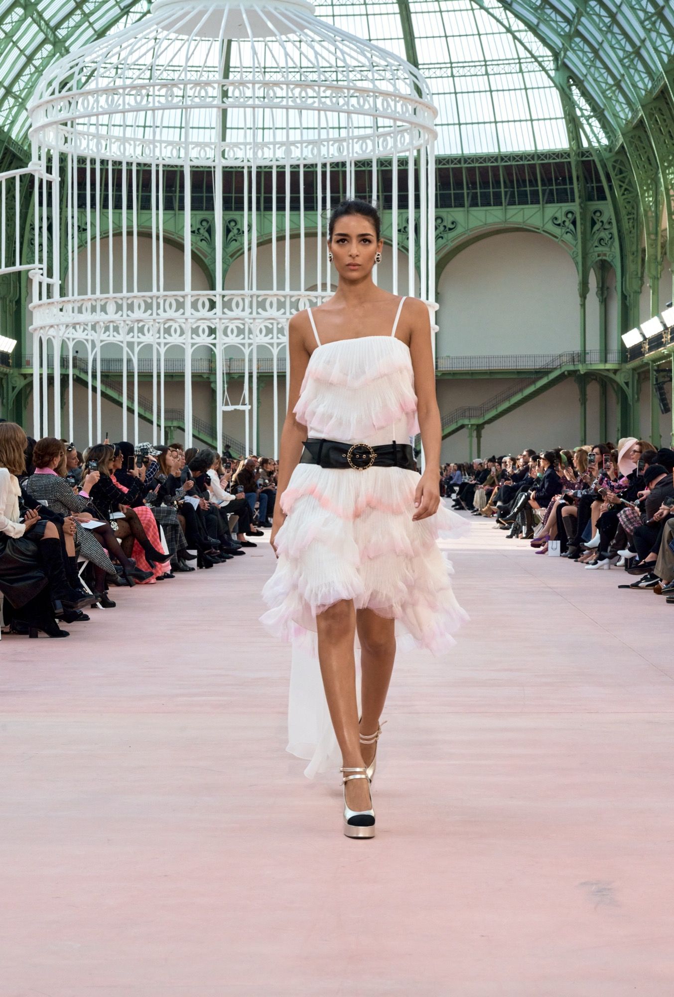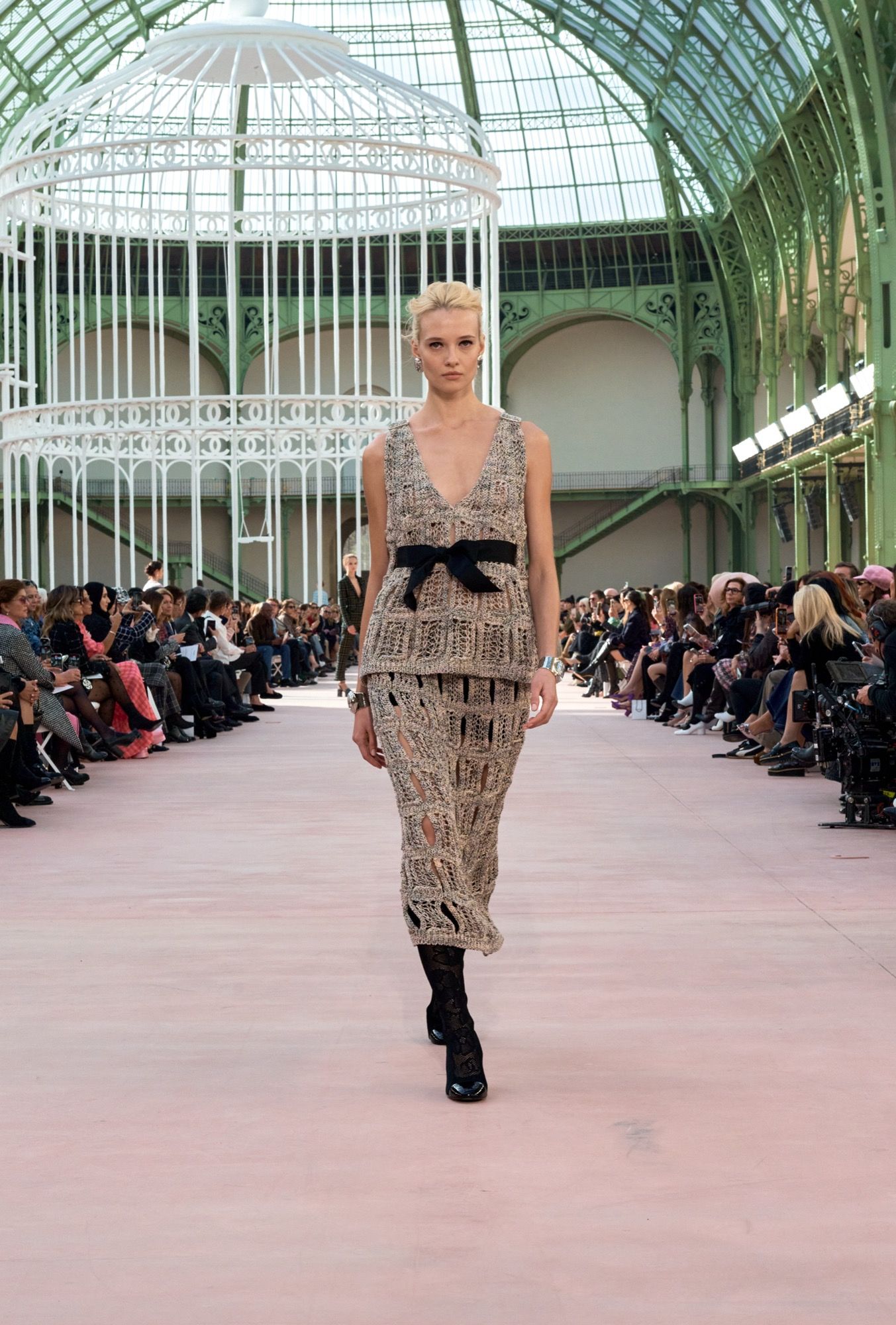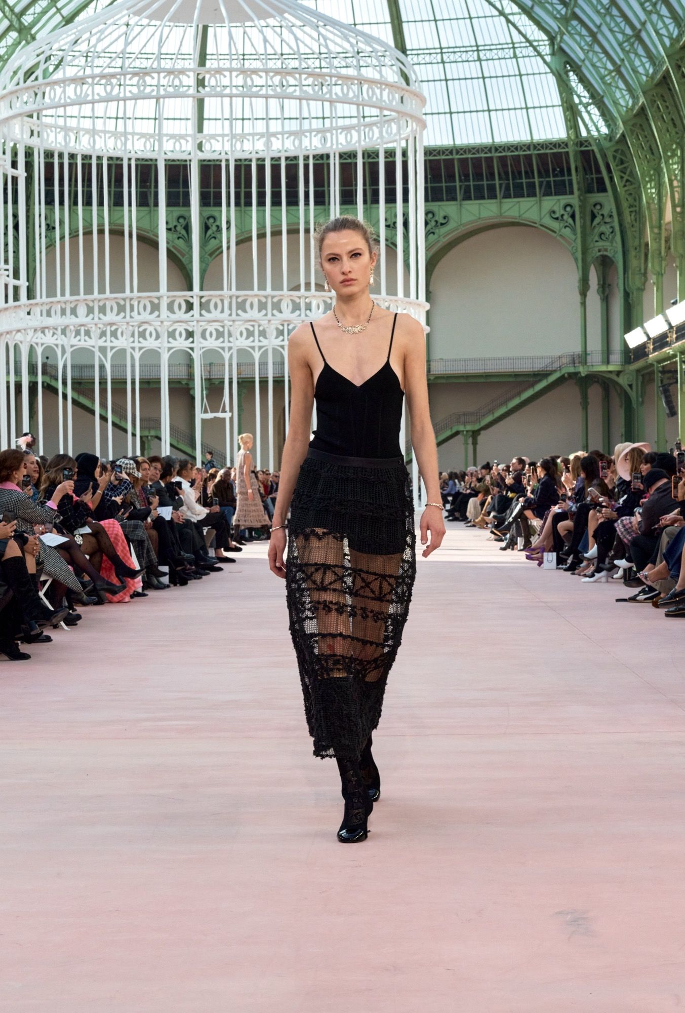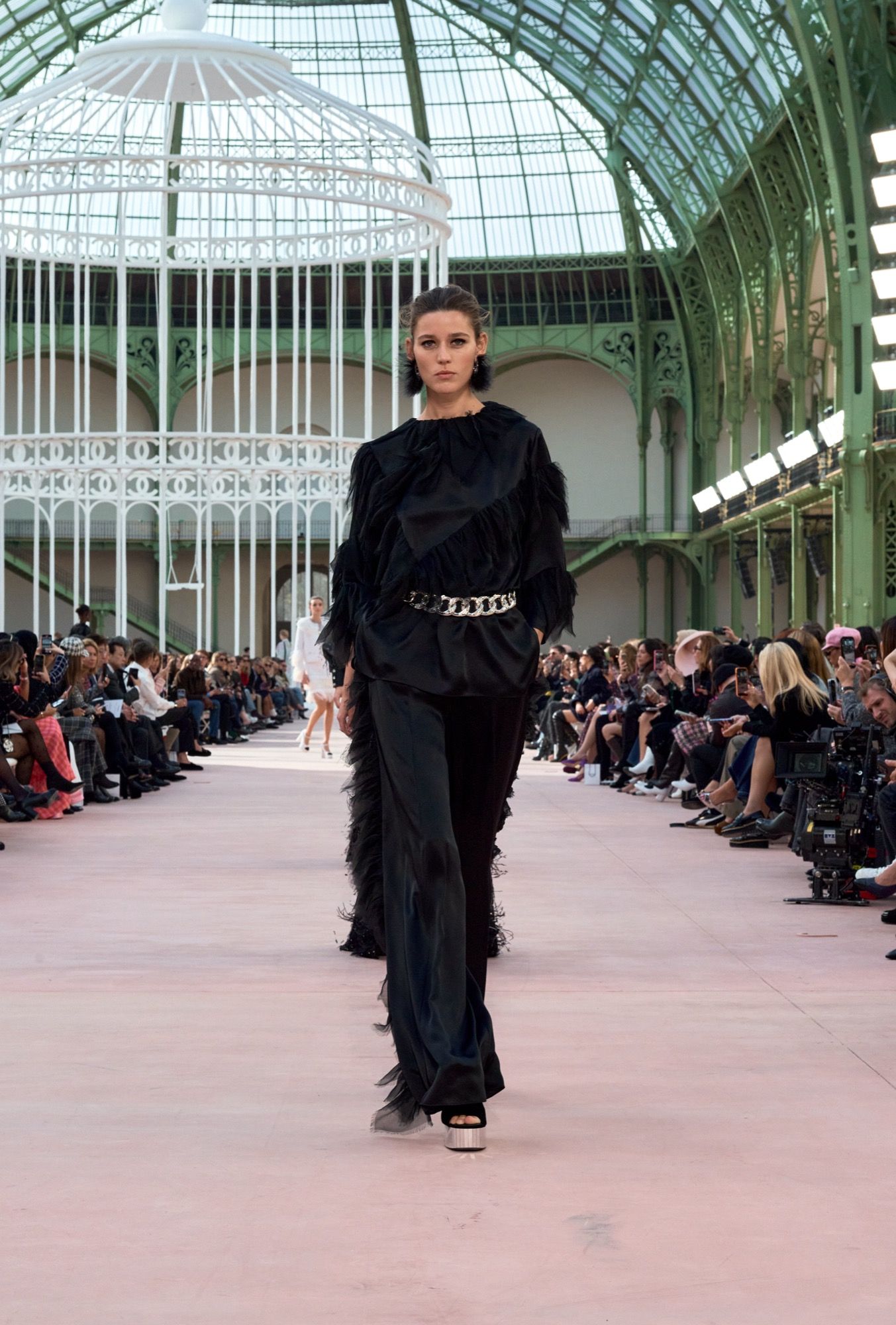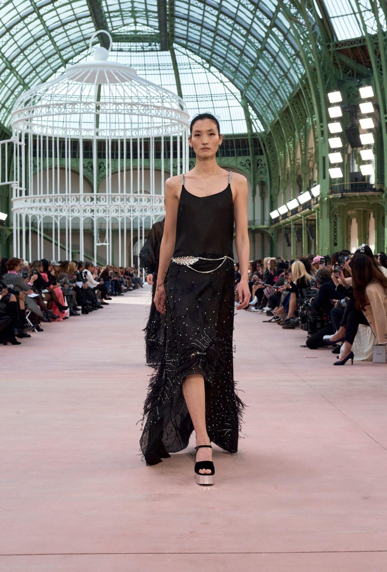 Lo show comincia a fare sul serio portando sotto i riflettori dolci completi in cotone a scacchi e a righe color sorbetto, reggiseni a vista in pendant con il set abbinato, che ricordavano lo Chanel anni ’90 di Lagerfeld, o ancora lunghi abiti in maglia larga vedo-non-vedo, anche loro con il punto vita messo in risalto da una cintura. Le proposte in pizzo nero hanno dimostrato nuovamente il lato più suntuoso della maison, con abiti a fiori che riprendevano simpaticamente lo stesso motivo riportato sui calzini. Diversi look riportano una stampa antica in azzurro gentile e piume colorate su mantelle, ampie gonne e camicioni, ma poi il denim ha rispolverato lo stile riportando lo stesso piumaggio sotto forma di strass in silhouette moderne. È sul finale che Chanel prende il volo, grazie ad abiti in piume che coprono gli orli delle giacche e dei vestiti, un’altra tuta, questa volta in seta, impreziosita da una pesante catena argentata sui fianchi, e un sovrabito trasparente che rivela un piccolo bodycon suit aderente. Un look verde acqua anni 2000 che include gonna plissettata a vita bassa, tank top trasparente e una spessa cintura in pelle nera sgancia definitivamente Chanel dalla visione agé che la fashion industry si era fatta del brand durante le precedenti stagioni: con uno show “di pancia”, l’ufficio stile della storica maison ha dimostrato di non aver paura di rinnovarsi. Per farlo al meglio, basterà l’aiuto di un designer geniale.