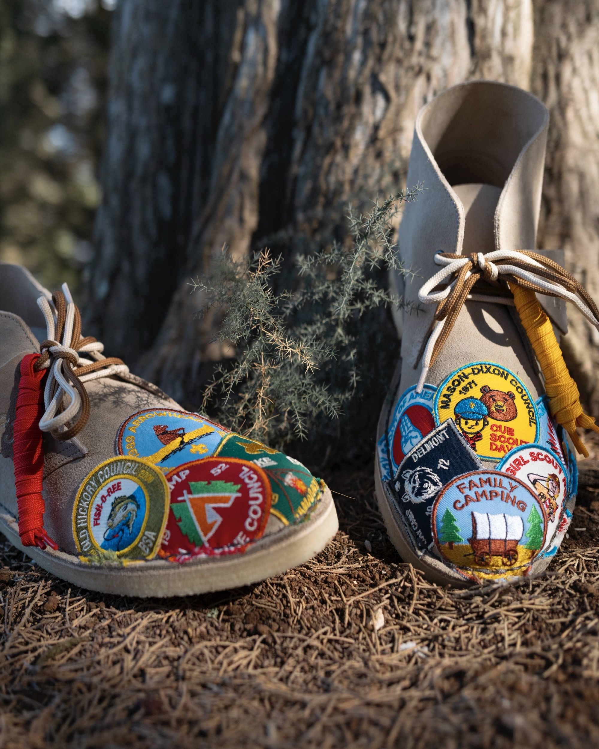 Ispirandosi alle iconiche uniformi dei Boy Scouts of America, LC23 ha reinterpretato la leggendaria Desert Boot™ di Clarks aggiungendo un tocco di vivacità e originalità. La scarpa presenta una decorazione unica con patch colorati, finemente ricamati a mano, che adornano la parte superiore, rendendo ogni paio un vero e proprio pezzo d’arte artigianale. Oltre a queste caratteristiche distintive, la calzatura si distingue per i lacci bicolore che aggiungono un ulteriore elemento di design, giocando con contrasti cromatici. Non solo, ogni paio viene fornito con un laccio aggiuntivo di un colore diverso, permettendo così a chi lo indossa di personalizzare ulteriormente il proprio stile, mixando e abbinando i lacci a piacimento. Questa rivisitazione, frutto di una collaborazione esclusiva, fonde tradizione e innovazione, trasformando un classico senza tempo in una nuova espressione di creatività contemporanea.