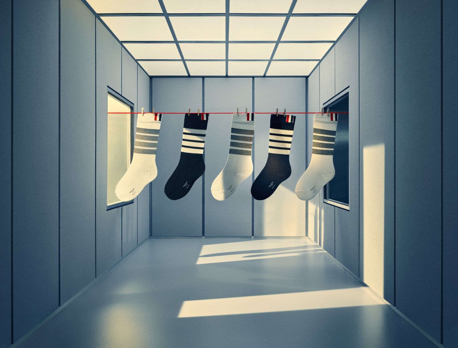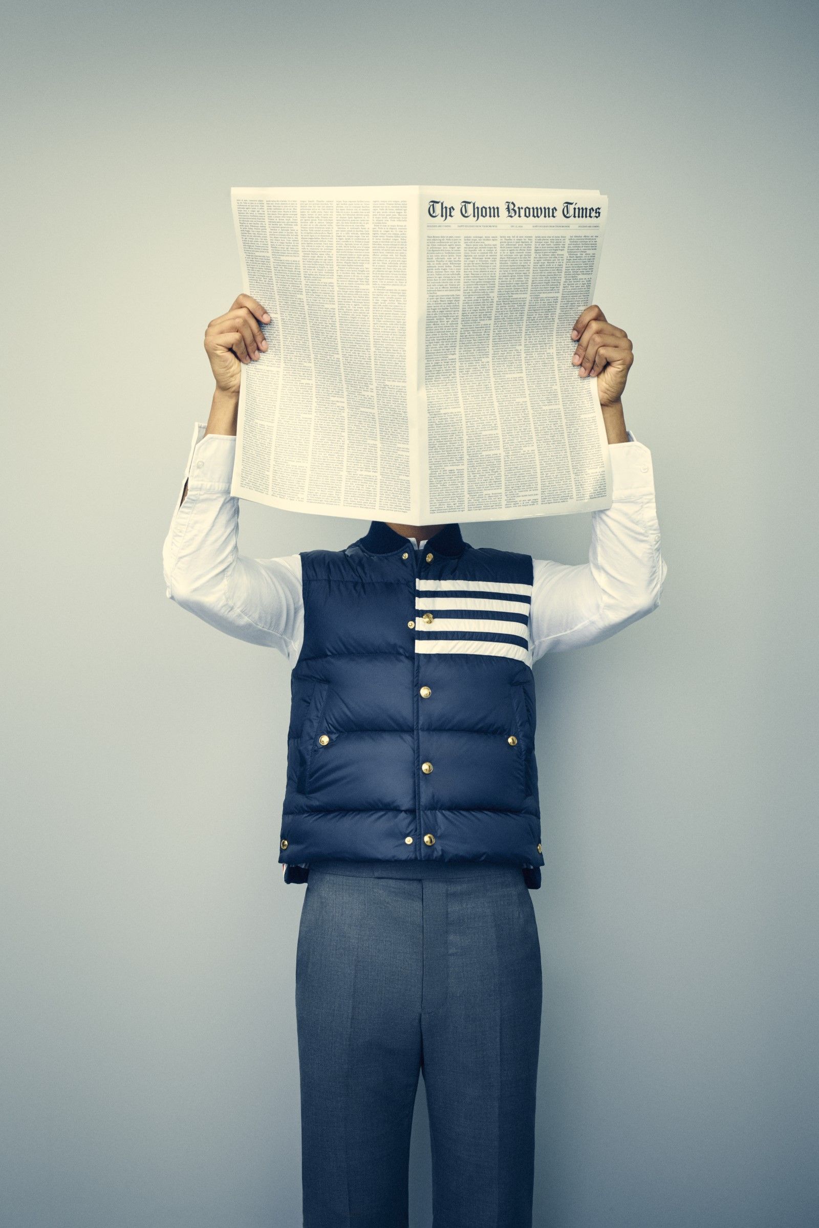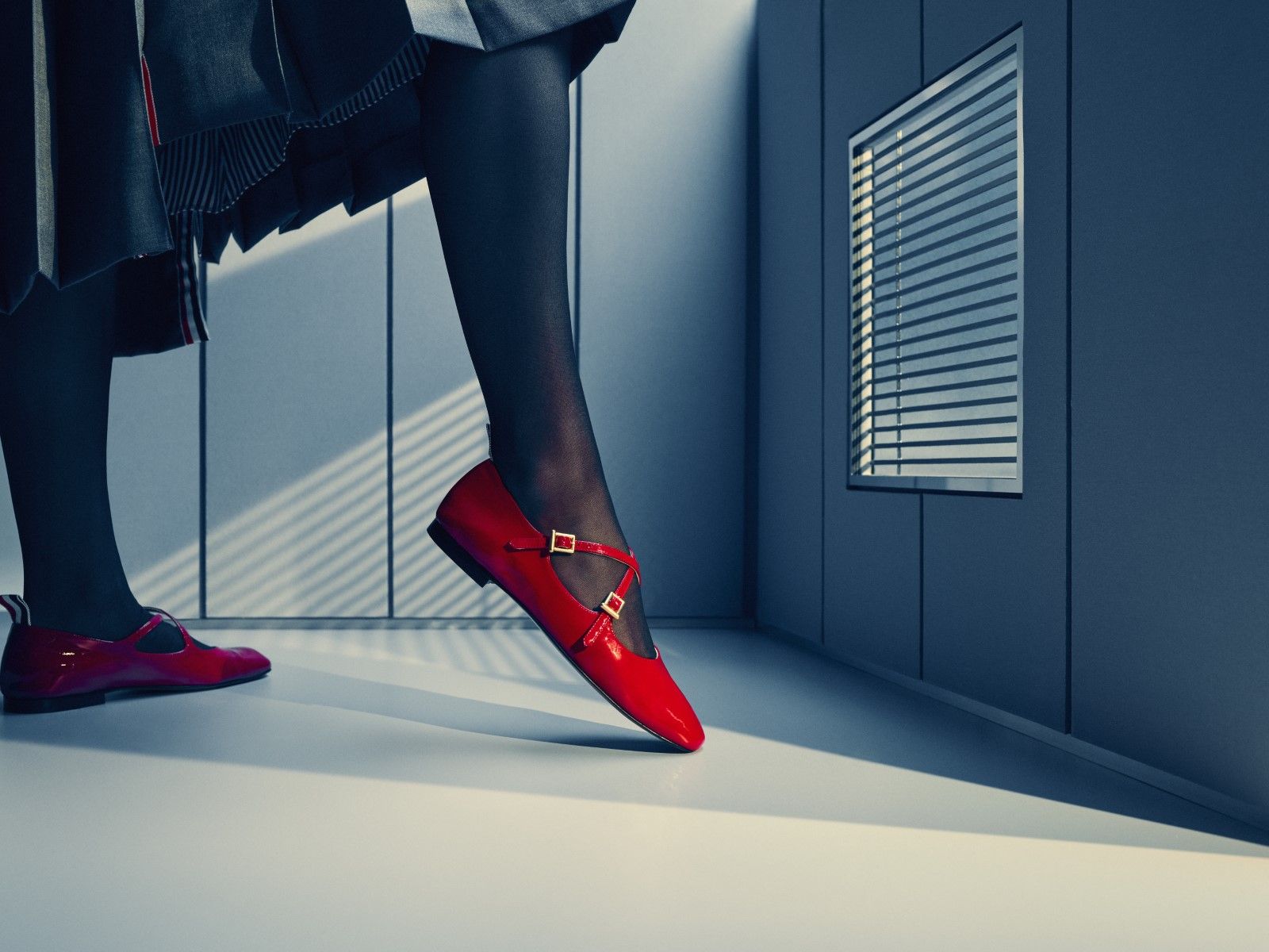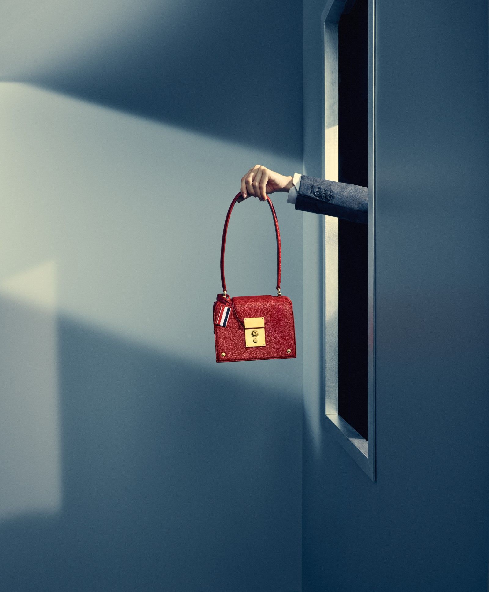 La collezione è completata dal celebre gilet imbottito Four-Bar e accessori come fermacravatte a forma di animali in argento sterling, caratterizzati dalle iconiche strisce di Thom. A dominare la scena sono anche accessori femminili: la nuova Mrs. Thom Triangle Bag e le ballerine rosse “Thom John” pronte a danzare verso la festa. Ogni pezzo riflette il carattere unico e l’approccio rivoluzionario di Thom Browne, noto per aver modernizzato l’idea della “divisa” attraverso la precisione sartoriale e la qualità artigianale.