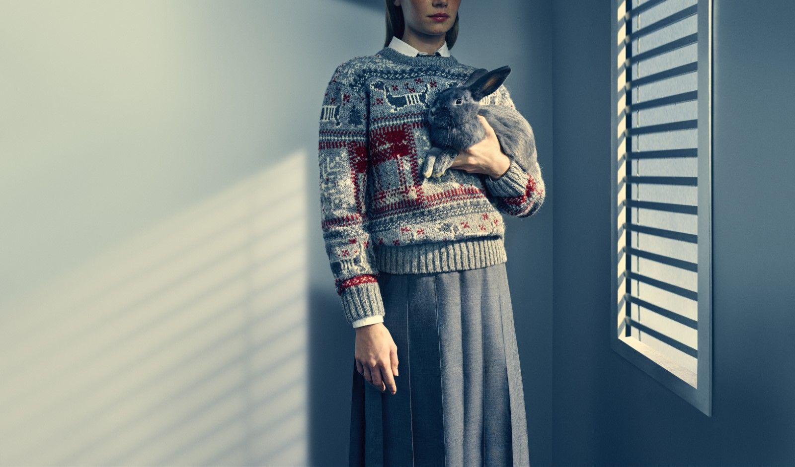 Per la stagione delle feste, Thom Browne ha firmato una campagna ambientata in un ascensore di nome “Elevator Express”, che si riempie di capi iconici e collaborazioni uniche, portando nel mondo di Thom Browne la magia delle feste. Tra i protagonisti della collezione troviamo maglioni festivi in intarsia e motivi Fair Isle in fit rilassati, ideali per aggiungere un tocco di calore sofisticato. Per un tocco giocoso, Browne presenta bag charms in pelle a forma di omini di pan di zenzero e il celebre bassotto Hector, oltre a guanti, sciarpe e cappelli in classico cashmere grigio a coste. Il mondo di Thom Browne prende vita con ogni dettaglio: un coniglio grigio si accompagna alla borsa Bunny Baguette, mentre un trench coat in cammello si prepara a scandire i minuti della mezzanotte. Non mancano pezzi statement come una giacca in shearling con maniche a campana e occhiali aviator fatti a mano in Giappone per affrontare l’inverno.
