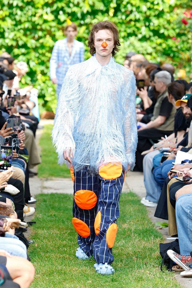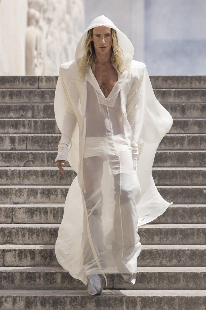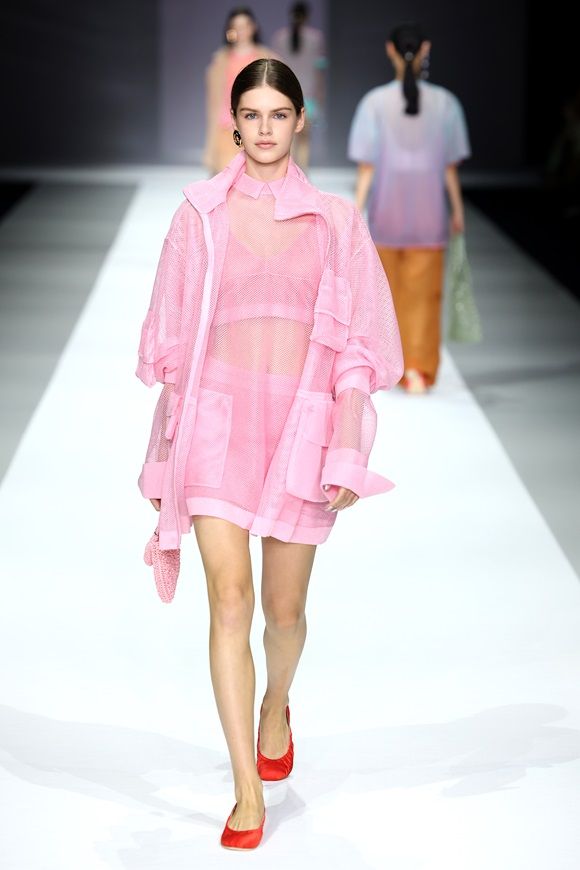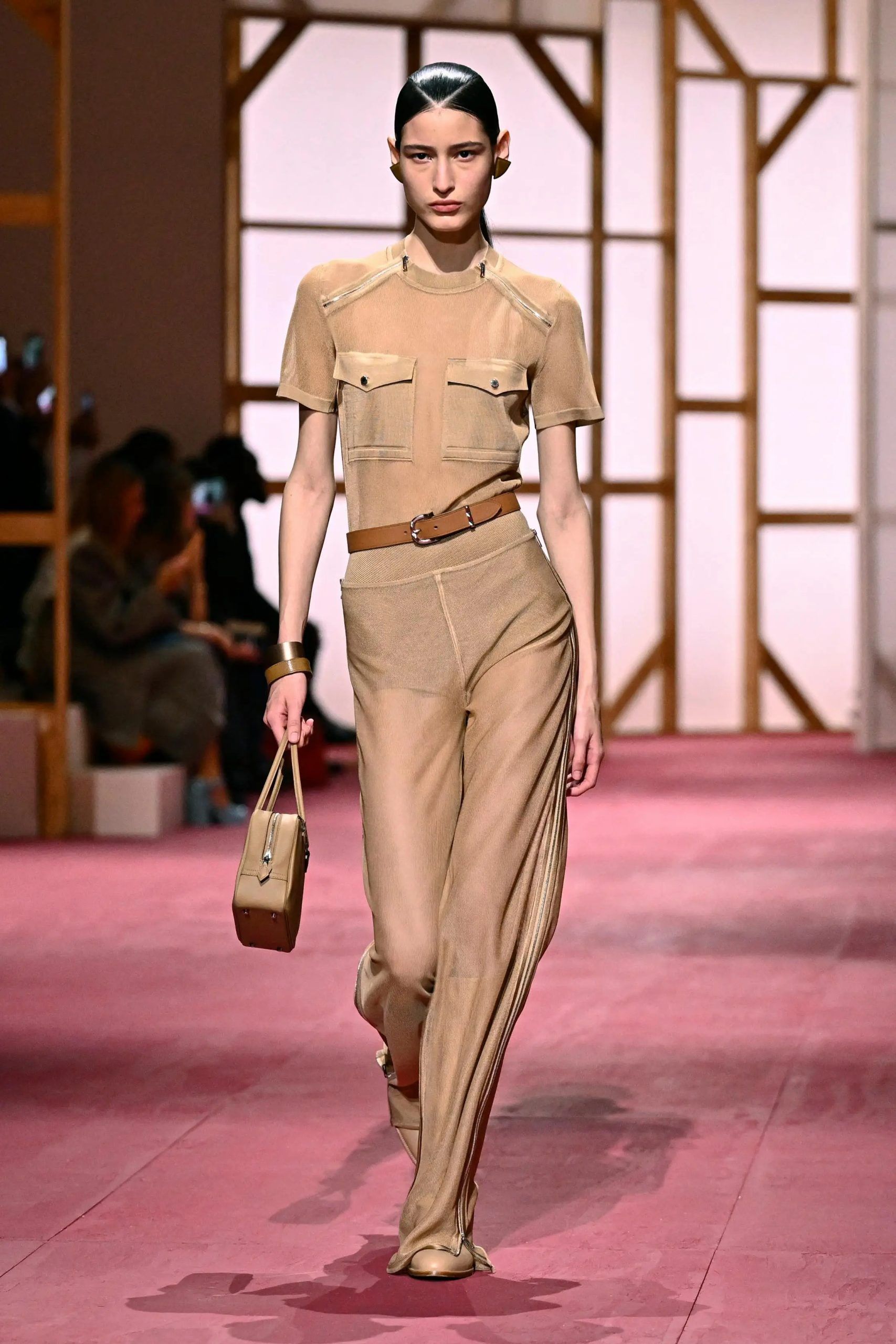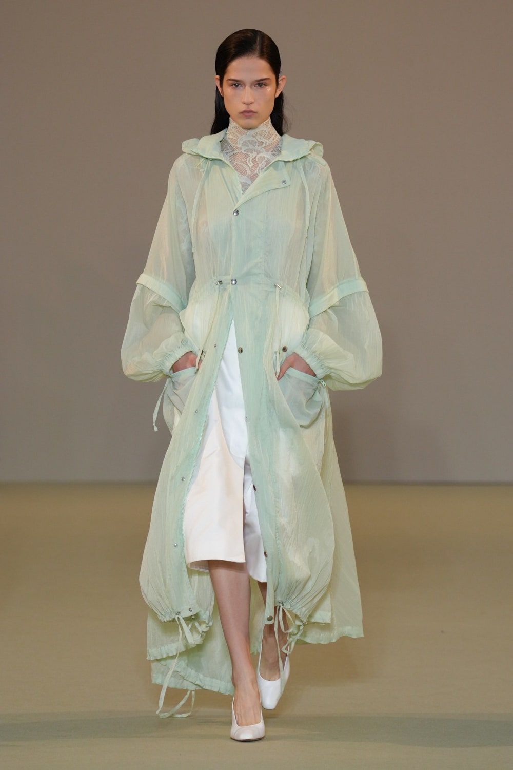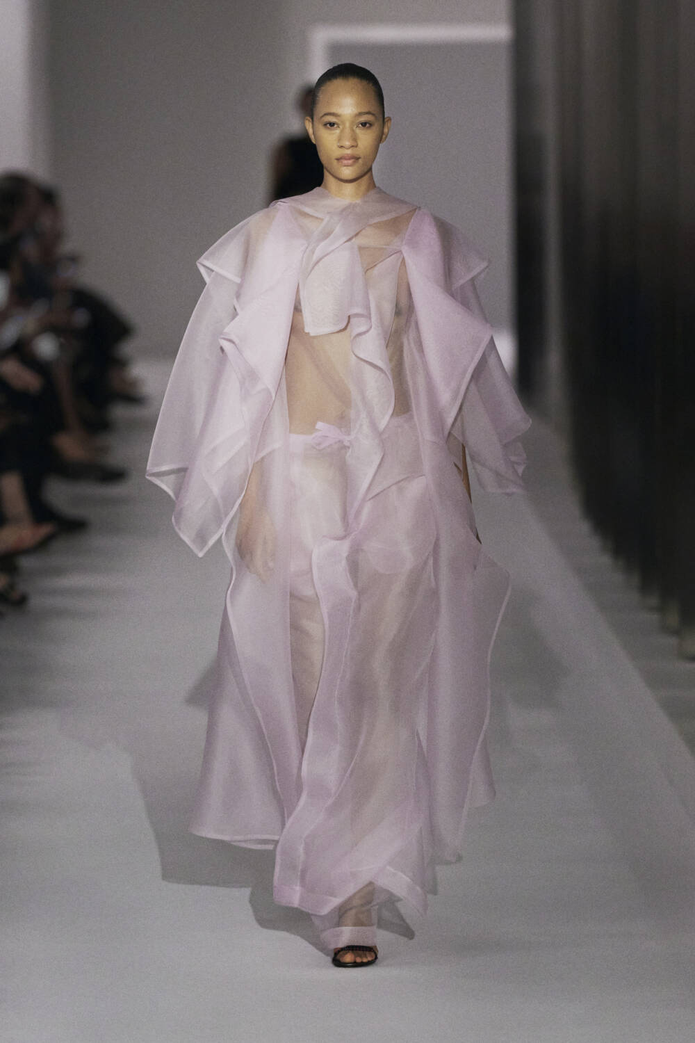 A Parigi, Dries Van Noten e Rick Owens hanno invece esplorato una dimensione più utilitaria della moda trasparente, con impermeabili da portare sopra a camicie colorate per proteggere dal maltempo oppure con strati sottili da sovrapporre ad altri tessuti semitrasparenti, per un outfit dall’aria spettrale. Capi see-through riappaiono in passerella da Anteprima, Del Core e Marie Adam-Leenaerdt, sotto forma di giacconi in veli rosa confetto, di camicioni verde acqua in pendant con i pantaloni oppure, nel caso della designer emergente belga, di trench aderentissimi color carne, a collo alto e lunghi fino alle caviglie. Come Khaite, anche Denzil Patrick ha scelto i colori pastello, con l’azzurro pastello che prende forma su cardigan, mentre Issey Miyake ha tirato fuori un vero e proprio asso nella manica in fatto di outerwear trasparente: un look beige creato con strati sottili che evocava la silhouette dell’abito di un apicoltore. Dettagli trasparenti sono persino atterrati in casa Hermés, con la maison che ha declinato lo stile in una tuta workwear bianco avorio per la Spring Summer 2025. Per il clubbing, invece, il brand New York-based Luar ha pensato a una giacca in taffetà vedo-non-vedo abbellita da una striscia di paillette nere attorno al collo e abbinata a stivali cuissard alti fino al ginocchio. Insomma, la prossima estate i brand ci vogliono vedere colorati, ma ricoperti da uno stratto sottile e trasparente in grado di riparare noi - e i nostri preziosi outfit - da qualsiasi intemperie.