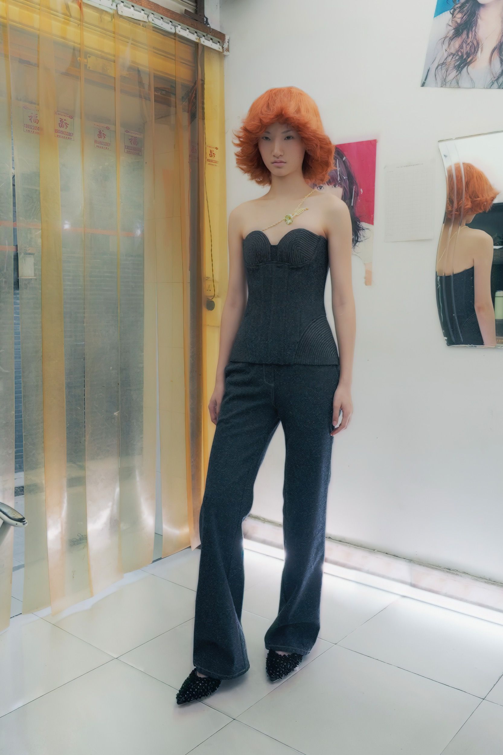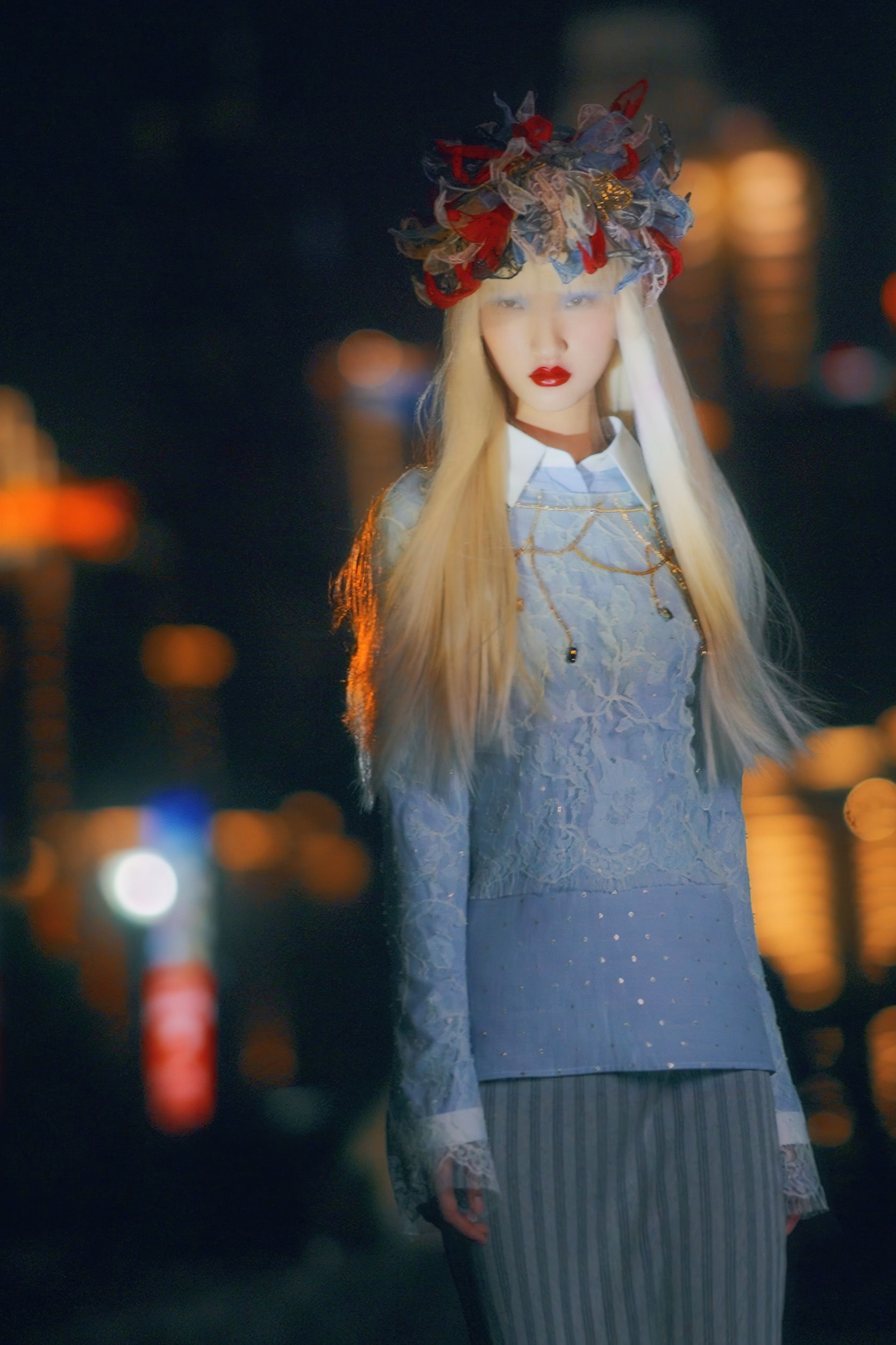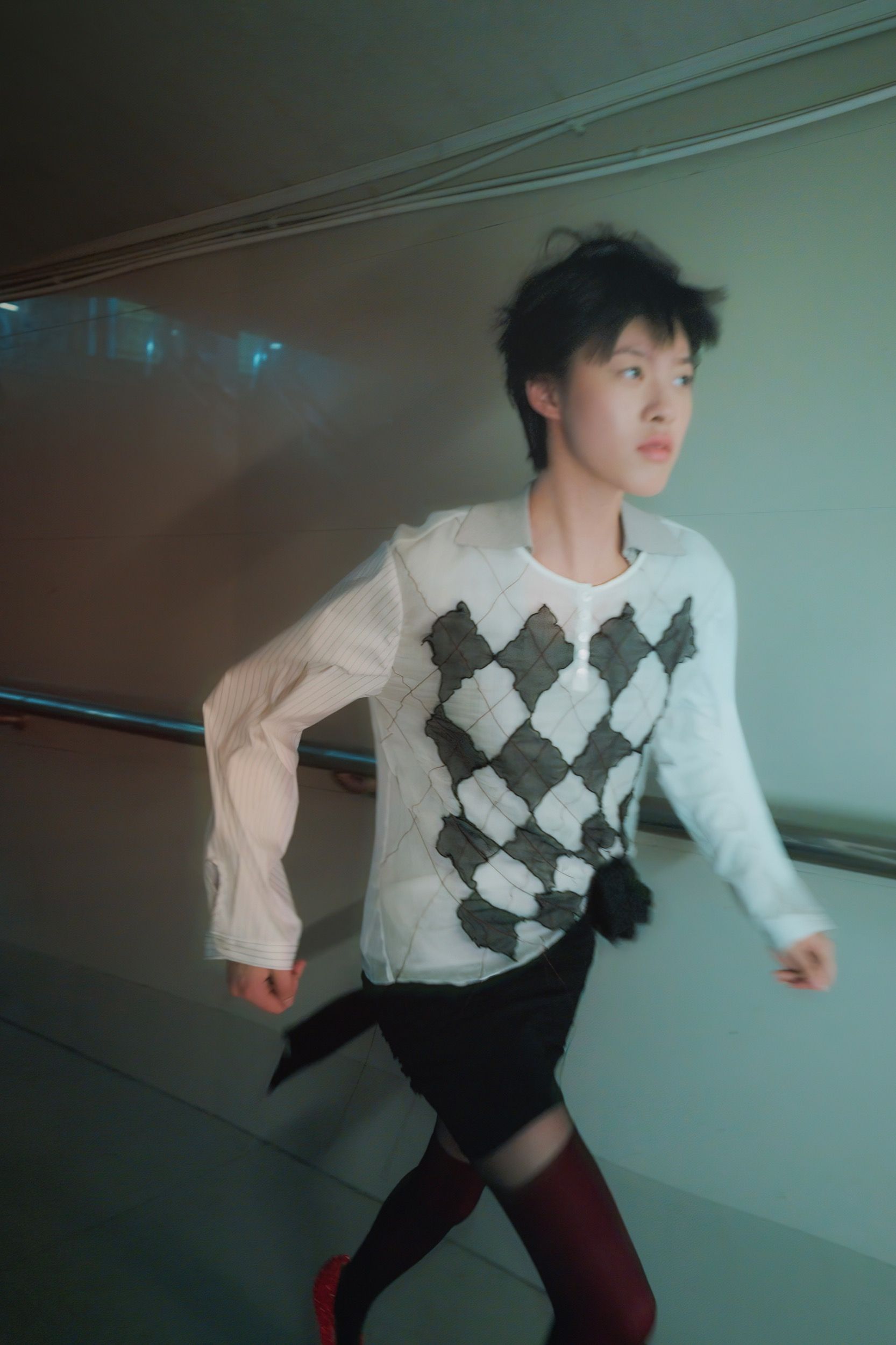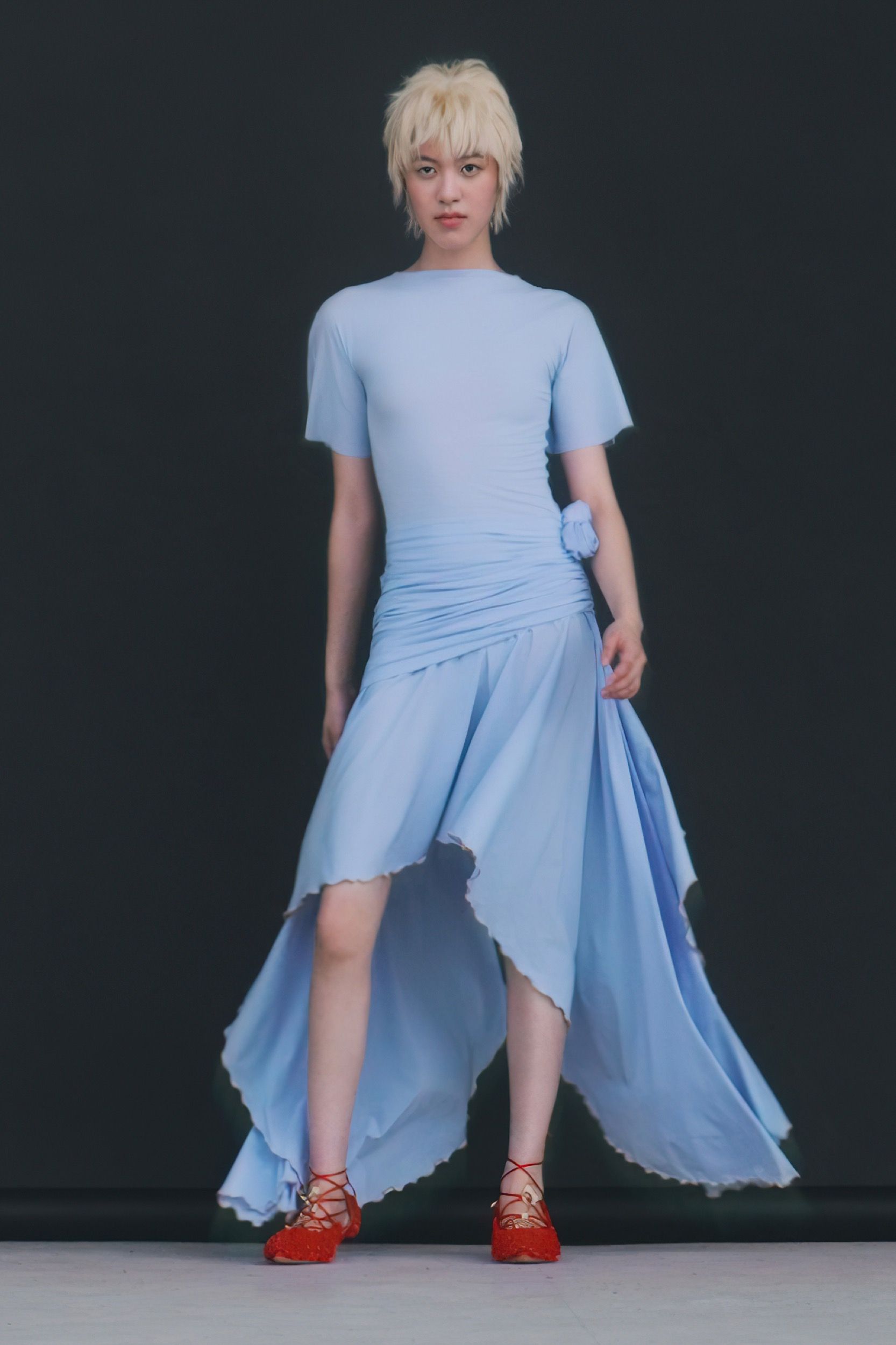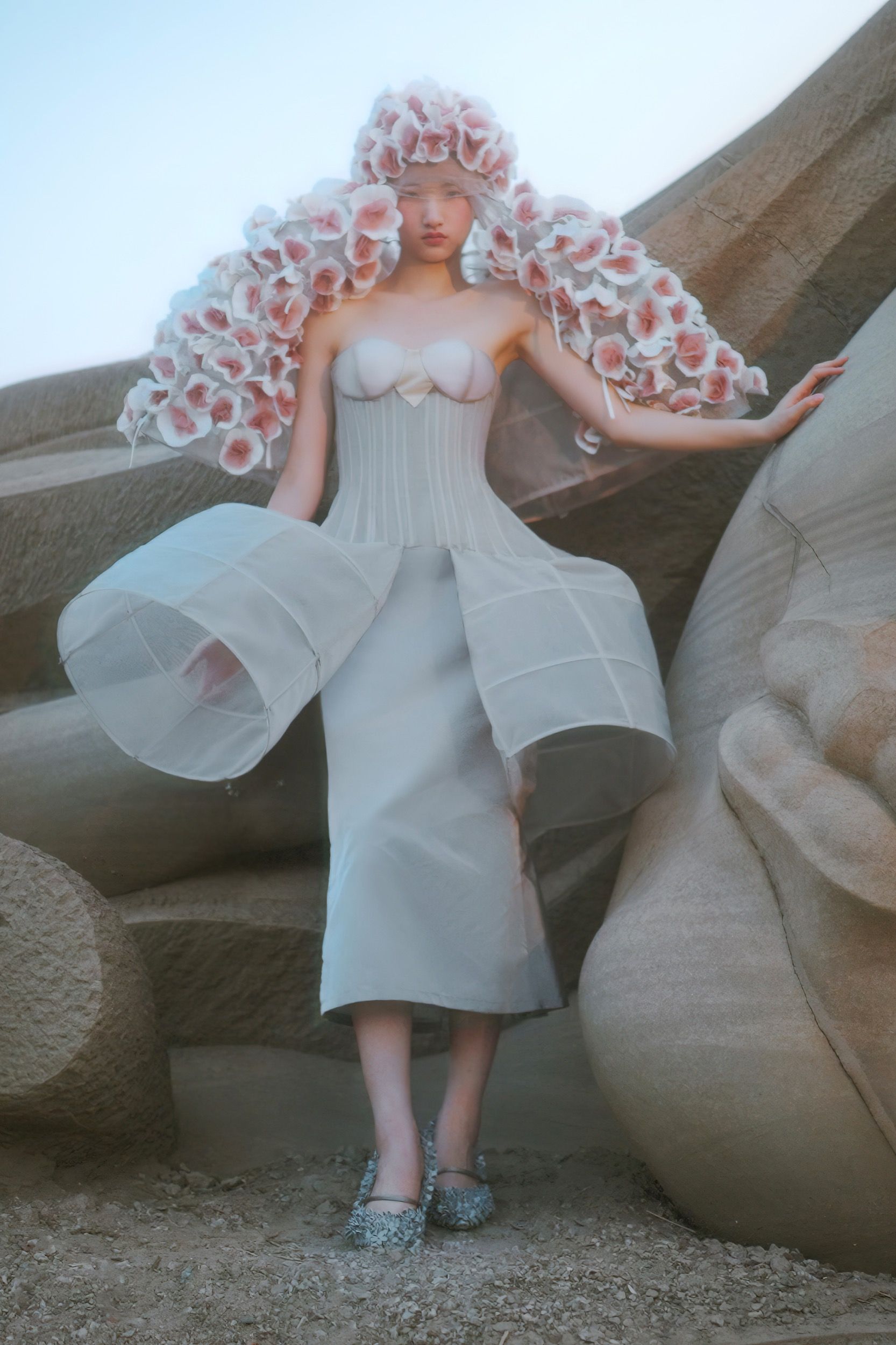 Nel panorama odierno dei reality show, come The Bachelor o Love Island, i fan attendono con impazienza i momenti in cui possono rivedere i loro protagonisti preferiti e rivivere i momenti salienti della stagione. Ma vi siete mai chiesti se le debuttanti di un tempo avrebbero potuto sfruttare questa tendenza? Entra in scena Louis Shengtao Chen, un fenomeno della moda che si presenta come una debuttante moderna. Il suo debutto avviene nel 2021 alla Shanghai Fashion Week, dove presenta la collezione intitolata The Debutante. Con un mix audace di eleganza sartoriale francese tradizionale e ispirazioni da ballo, Chen rompe gli schemi grazie all’uso di materiali non convenzionali come nastro adesivo, cravatte vintage e componenti meccaniche. La sua visione ridefinisce il concetto di debuttante nel XXI secolo: forte, sicura di sé e assolutamente moderna, quasi una "baddie" colta e sofisticata. Tre anni dopo, Chen continua a superare i confini della moda, spingendo la sua creatività verso nuove direzioni. Per la collezione Primavera/Estate 2025, presenta Echoes in the Fog, una rappresentazione poetica di una donna che affronta il paradosso tra bellezza e prigionia. Le sue creazioni raccontano questa dualità: silhouette morbide e fragili si contrappongono a vita drammaticamente strutturate e tessuti ricchi di texture. L’intera collezione è intrisa della sua cifra stilistica, che mescola ingenuità e maturità: pizzi che spuntano da gonne di jeans, abiti in organza che si sovrappongono a motivi argyle, e cappucci ispirati ai fiori che evocano un’aria di fantasia.