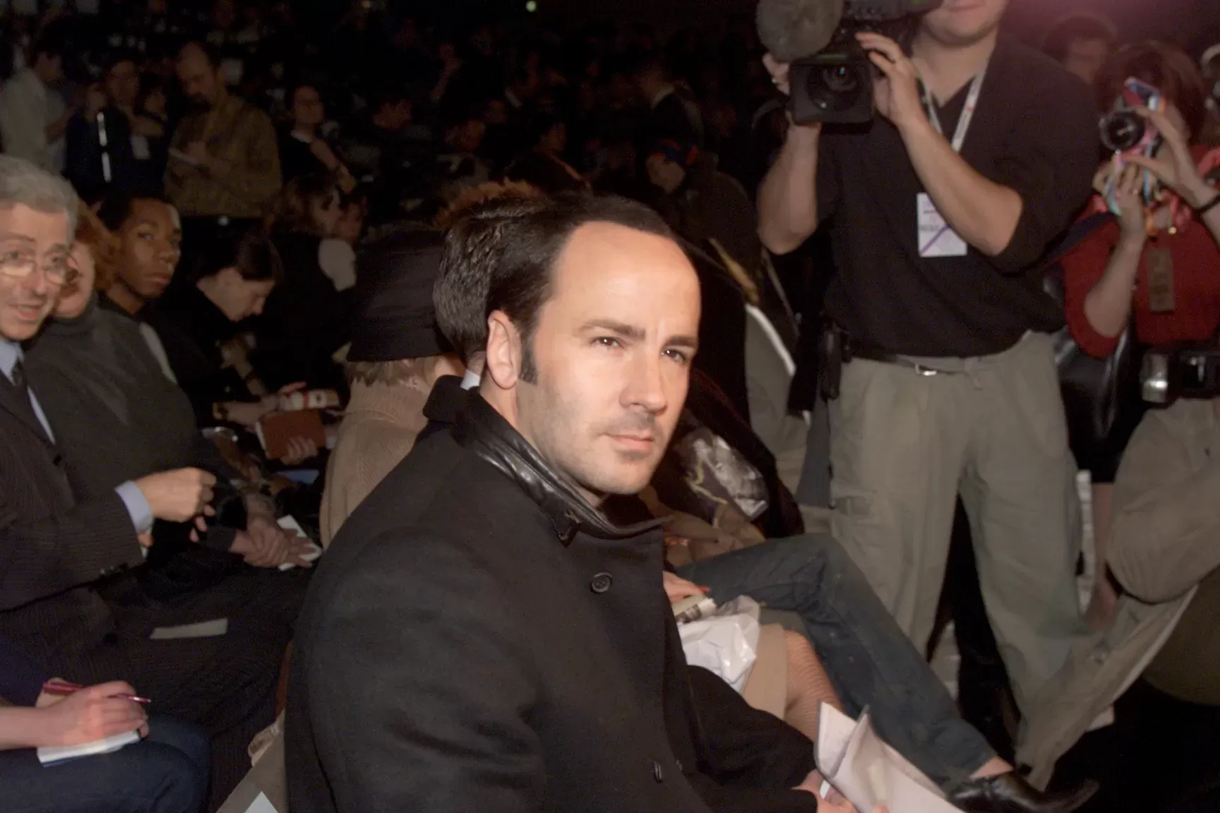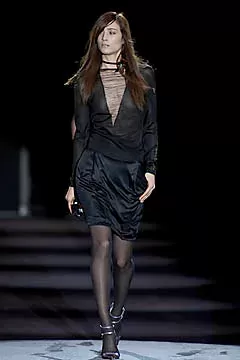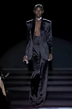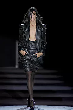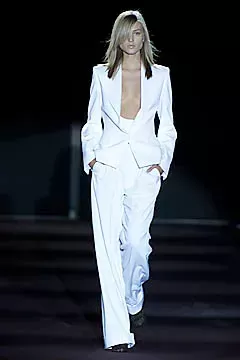 La sfida più grande per Ford era reinterpretare l’estetica di Saint Laurent senza tradirne l’essenza. La sua prima collezione, presentata nel 2000 al Museo Rodin di Parigi, era molto attesa: il debutto dell’anno. Saint Laurent, partito per Marrakech, era assente, mentre Bergé evitò dichiarazioni. La critica Cathy Horyn sul New York Times scrisse: «La collezione era buona, ma non eccezionale; ciò che conta di più è che Ford è riuscito a trovare un modo, attraverso il denso vocabolario di Saint Laurent, per esprimere la sua voce». In passerella, Ford evitò riferimenti evidenti, come le celebri camicette con fiocco, reinterpretando elementi classici con un tocco moderno. Le giacche avevano maniche ampie e fasce arricciate, evocando la Saint Laurent degli anni ’80, ma con un’energia più contemporanea. Il bianco e nero dominavano con pochi tocchi di colore, creando una tela neutra per nuove proporzioni. I commenti furono misti: «Non è la poesia di Yves», osservò Sonia Rykiel, «È molto più forte e diretto».