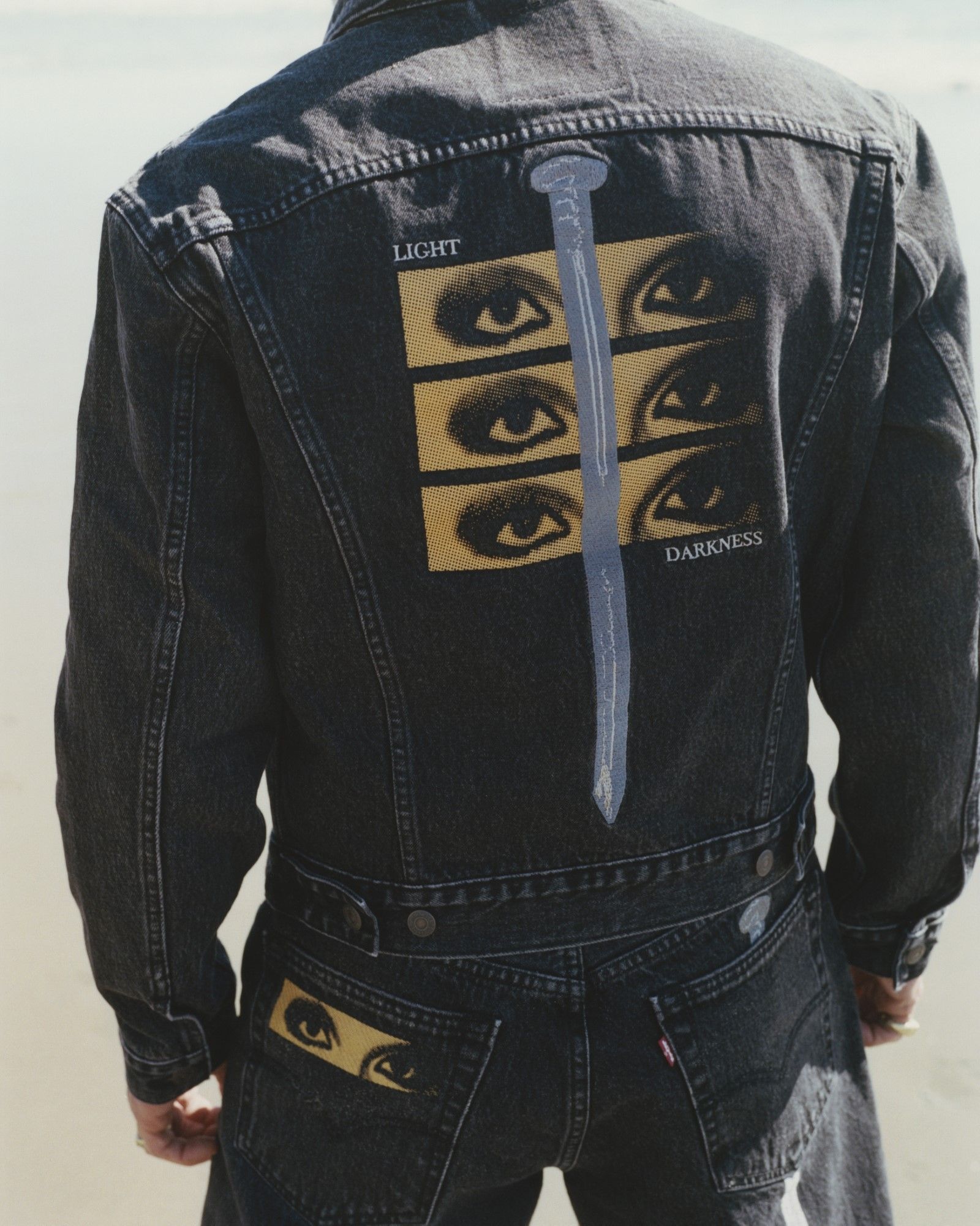 Un altro capo iconico è la Type I Trucker Jacket, realizzata in denim bianco e nero da 12 oz., arricchita da un motivo zigzag ricamato, ispirato alle grafiche del 2003 di UNDERCOVER. La Type III Trucker Jacket, invece, introduce un design basato sul concetto di yin-yang, con ricami che rappresentano la “luce” e l’“oscurità” sul davanti e un mix di grafiche serigrafate e ricamate sul retro. Oltre alle giacche, la collezione include due modelli di jeans: il classico 501® Jeans, arricchito da ricami a zigzag lungo le cuciture laterali e una toppa coordinata alla Type I, e il Baggy Jeans, caratterizzato da una vestibilità ampia e decorazioni grafiche che riprendono la Type III. A completare la proposta ci sono tre t-shirt in cotone, tra cui una a maniche lunghe con motivi zigzag sul collo e sulle maniche, e due a maniche corte disponibili in bianco e nero, con una combinazione di stampe e ricami. Ogni capo è pensato per riflettere l’attenzione ai dettagli e l’artigianalità che caratterizzano questa collaborazione.