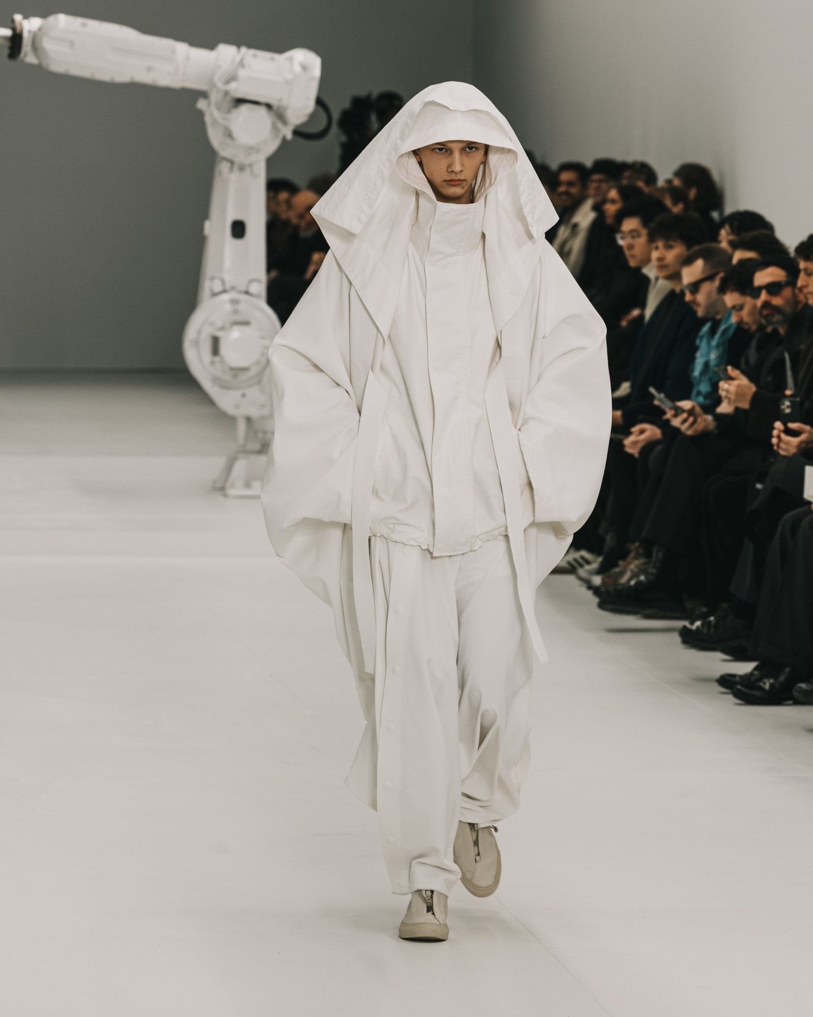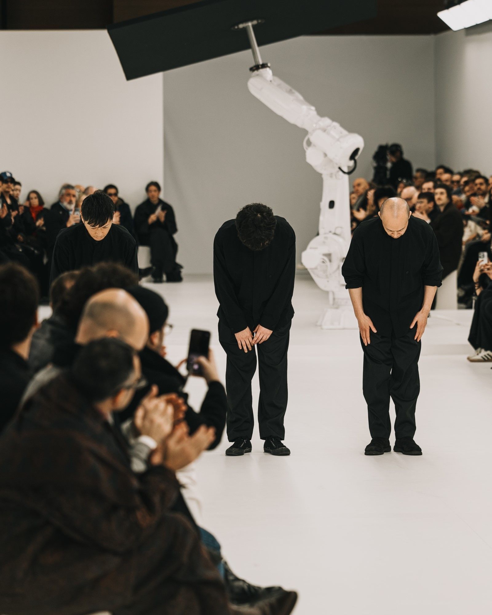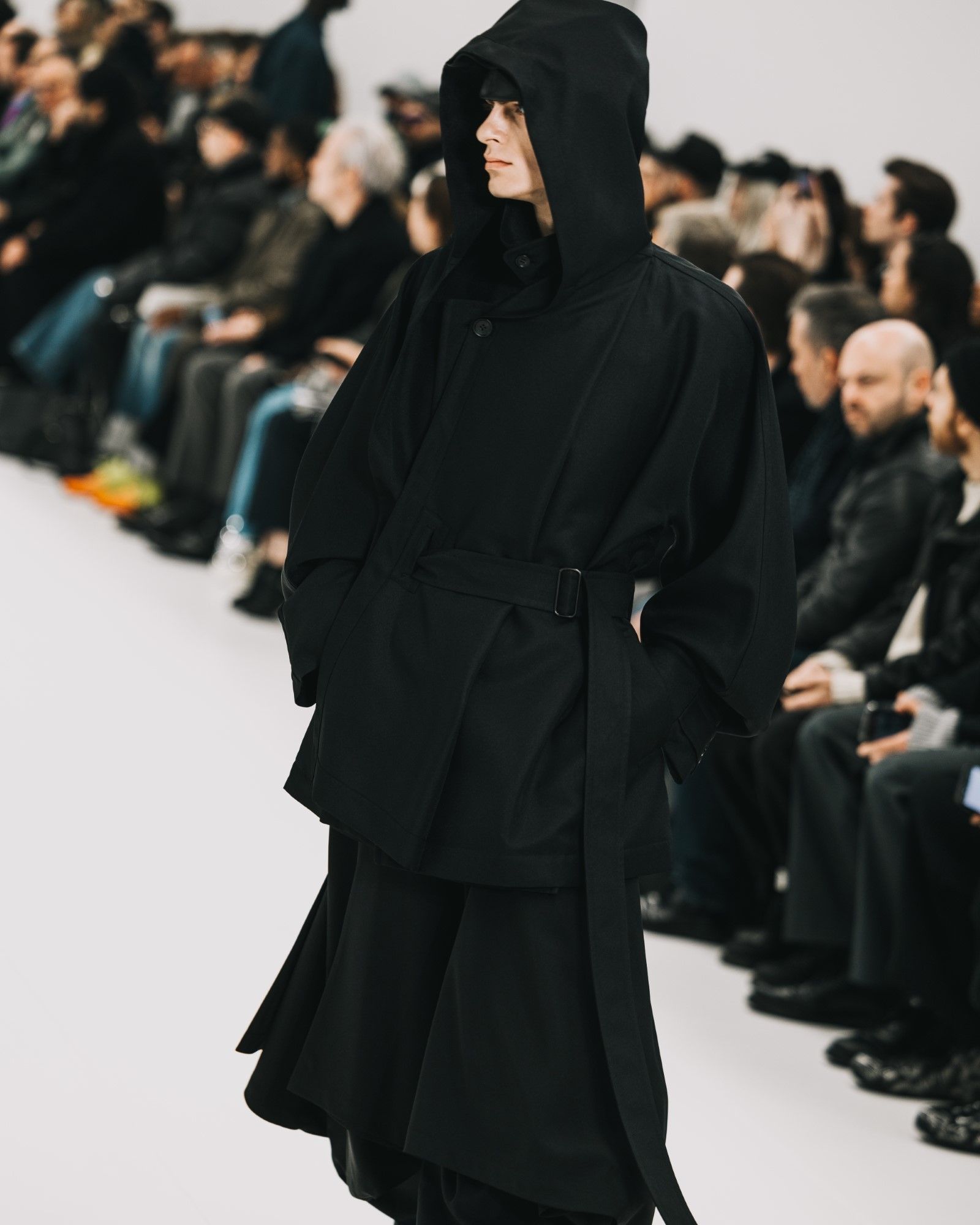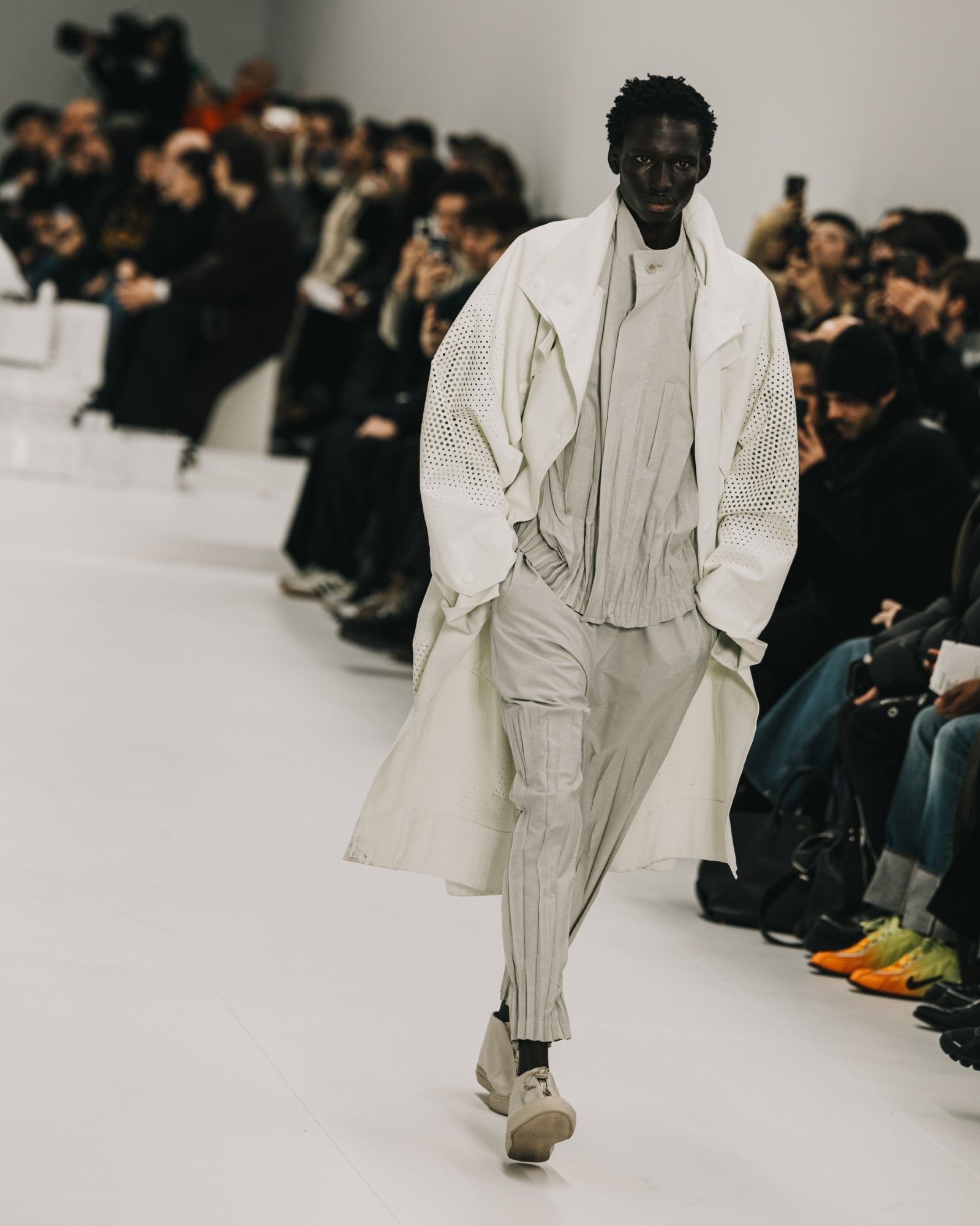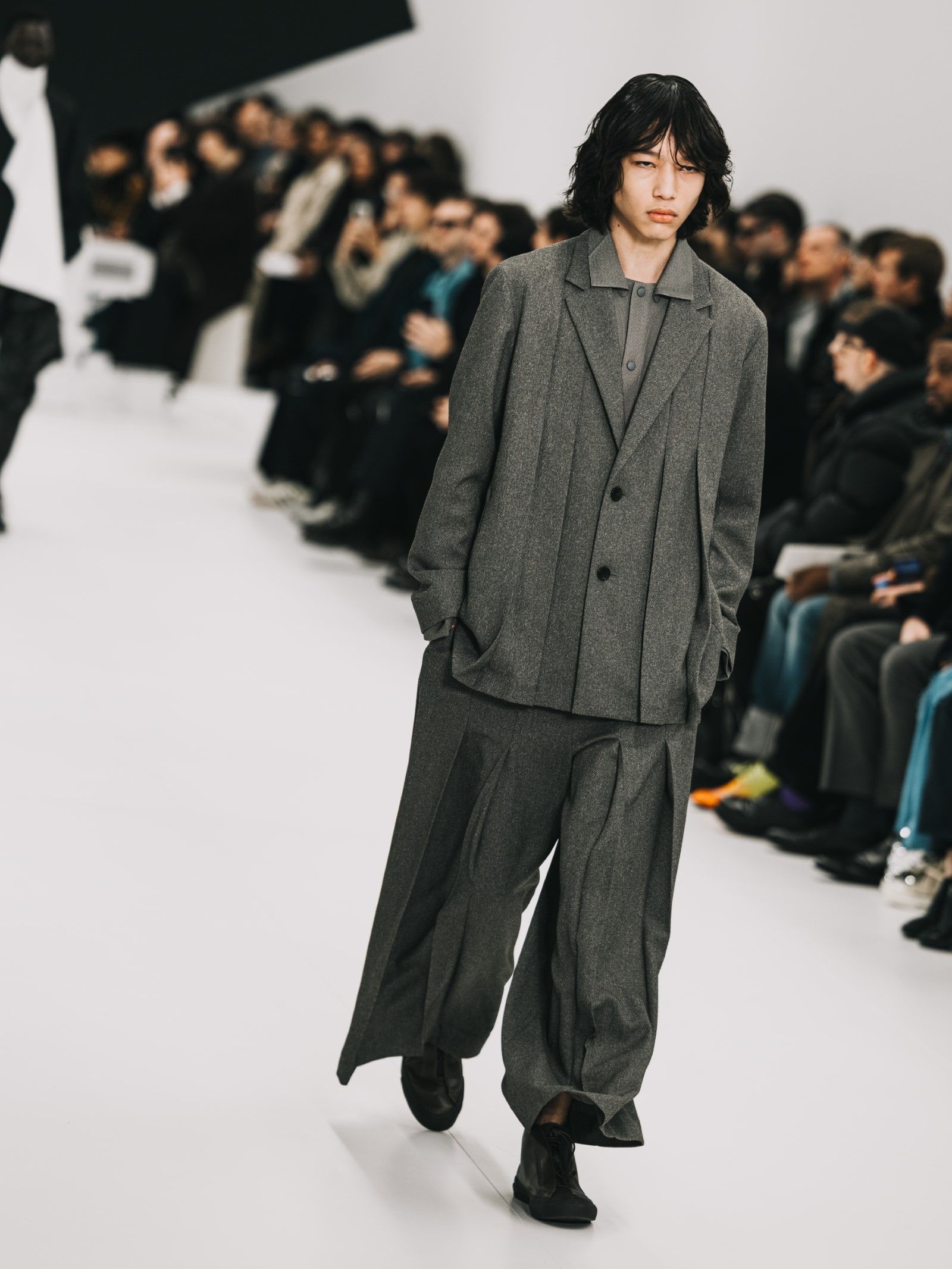 Ieri la collezione FW25 di IM MEN ha fatto il suo debutto ufficiale a Parigi, prendendo il posto che fu di Homme Plissé Issey Miyake sulle passerelle della moda – il che non significa che Homme Plissé Issey Miyake sia scomparso, semplicemente lo si troverà in presentazioni più intime mentre il posto sotto i riflettori sarà preso da questa linea dal sapore più avant-garde. Presentata nella suggestiva cornice del Réfectoire des Cordeliers, un ex monastero del XVI secolo, la sfilata ha segnato l’inizio di un nuovo capitolo per l'eredità del compianto maestro Issey Miyake che, possiamo dirlo, non potrebbe essere in mani migliori. IM MEN rappresenta l'ultima grande creazione del genio giapponese, avviata poco prima della sua scomparsa nel 2022. Il brand è nato dall’unione di tre designer: Sen Kawahara, Yuki Itakura e Nobutaka Kobayashi, che hanno collaborato con Miyake per sviluppare una nuova e più avanzata visione del menswear basata sul concetto cardine della sua filosofia: "A piece of cloth" che è la pietra angolare su cui il compianto designer, il suo vasto team e i suoi successori hanno costruito il complesso edificio di linee e proposte del brand e che spazia dalla moda fino al design d’interni. In questa collezione, il tessuto diventa il punto di partenza per una ridefinizione dell'abbigliamento, che unisce artigianalità, ingegneria e un senso di libertà creativa. Da sempre firma del brand, il libero movimento del corpo nei vestiti è stato protagonista anche della presentazione di ieri, che ha visto i modelli correre sulla passerella sciogliendo e riannodando i capi, mostrandone la leggera e ingengosa architettura. Sempre l’idea di movimento è stata esplorata dall’installazione del designer Tokujin Yoshioka, che ha decorato la venue con enormi braccia robotiche che sollevavano pannelli neri seguendo movimenti ipnotici.